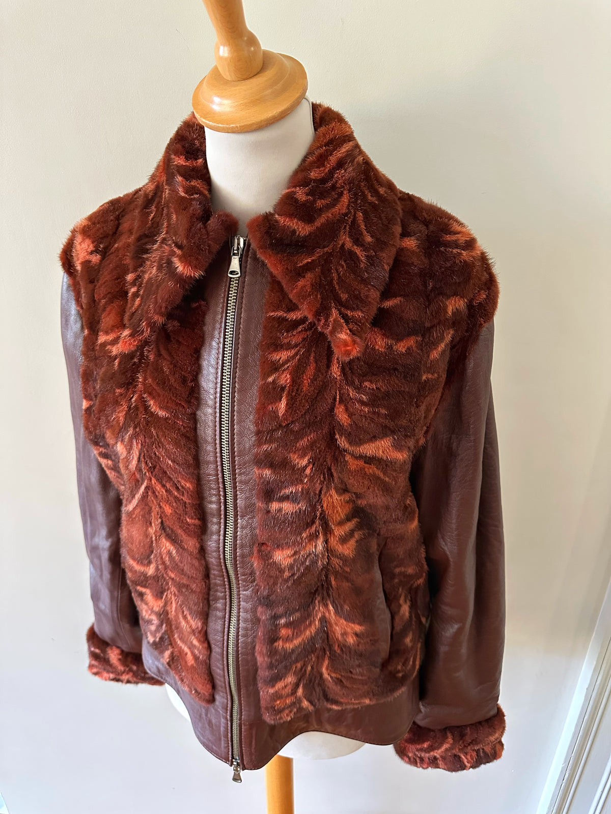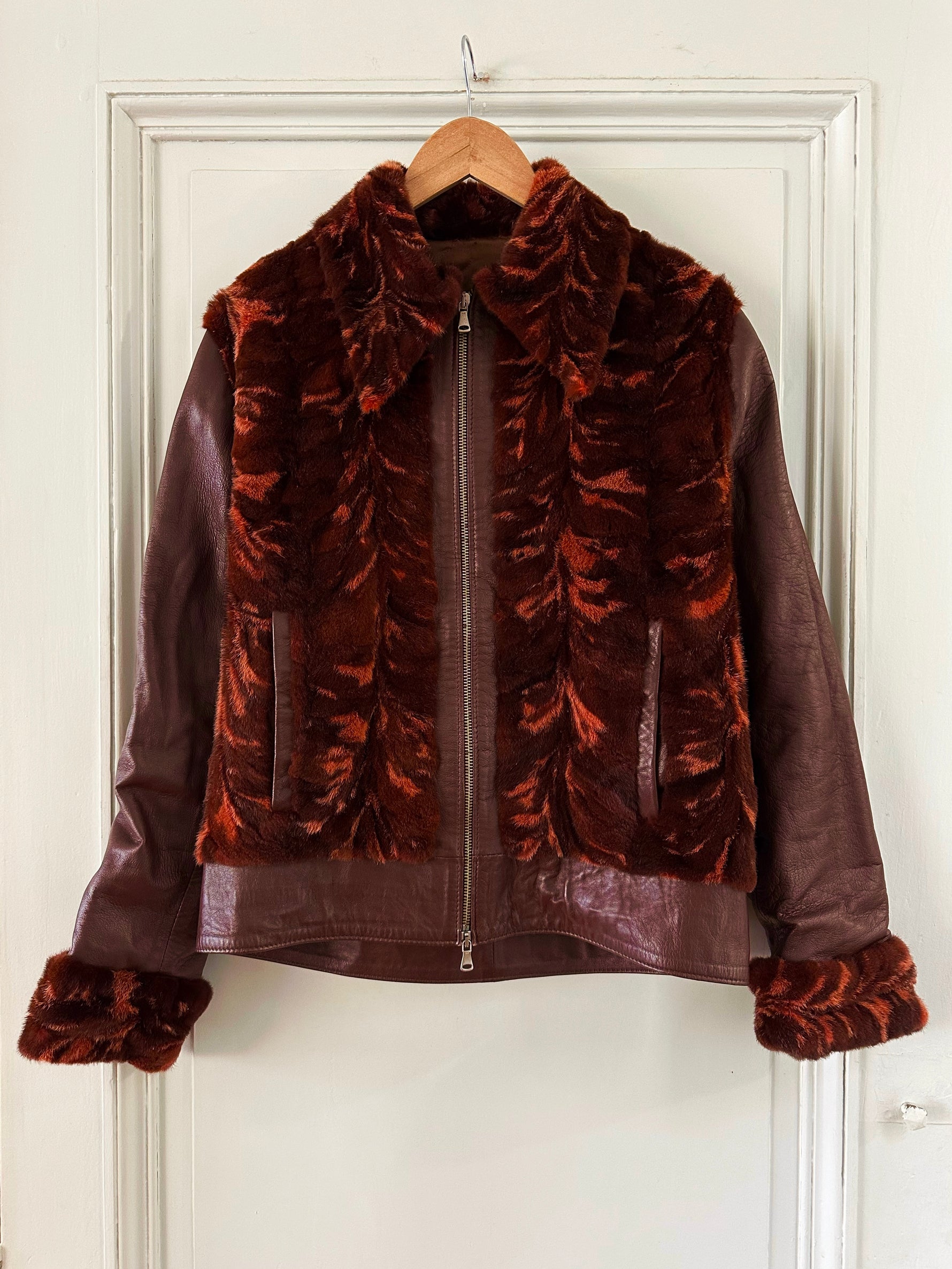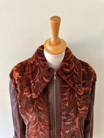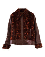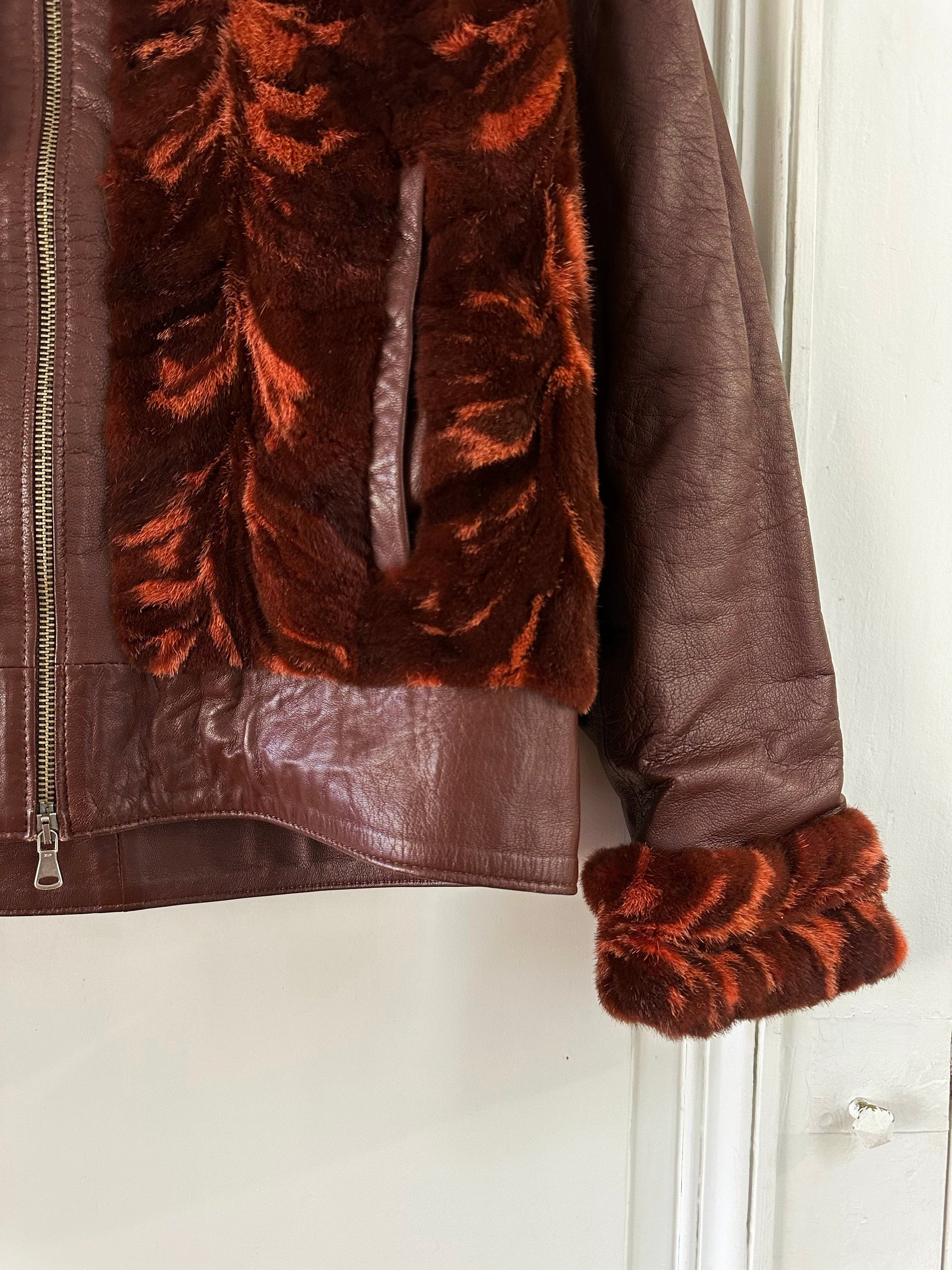 Prix unitaire parBlouson en cuir choco bordeaux et empiècements en fourrure de lapin dans les tons marbrés brun, bordeaux, et oranges. Fabriqué en Italie. Taille 38 porté ici sur un mannequin T36 et ouverte sur une personne T40. Longueur 62cm.