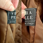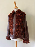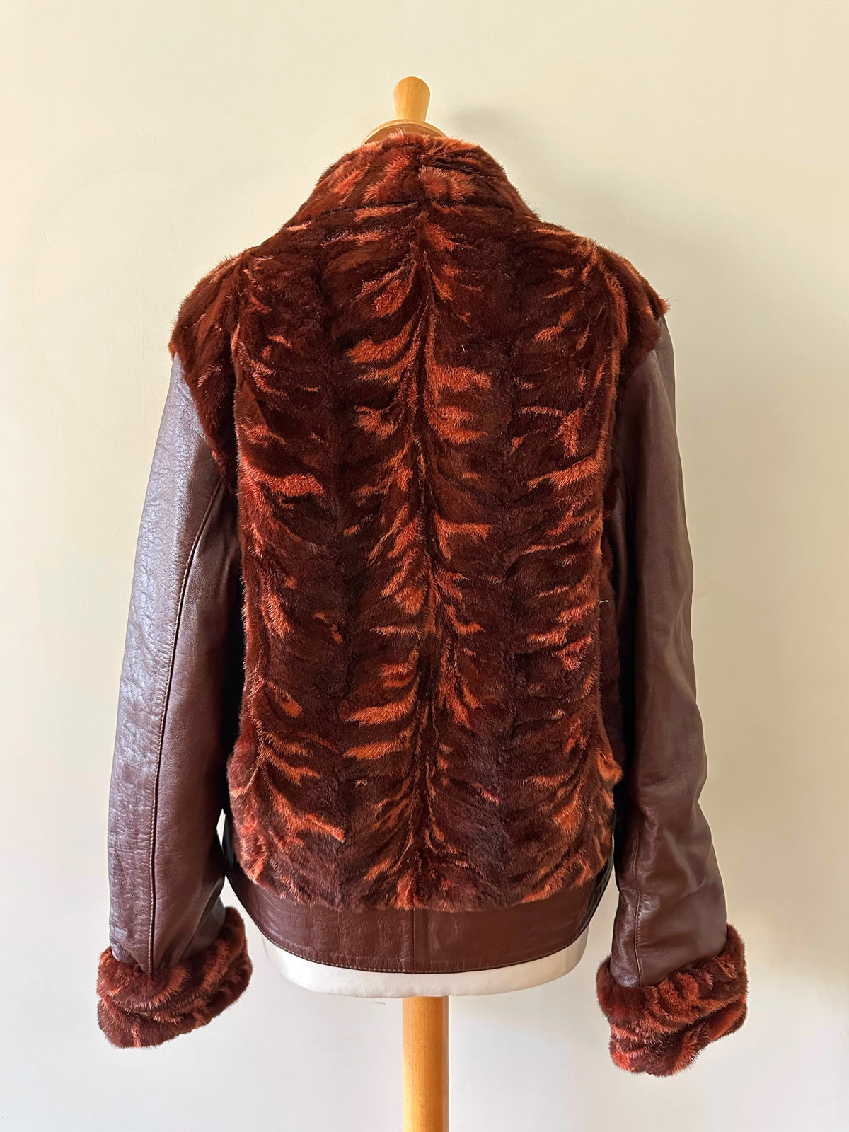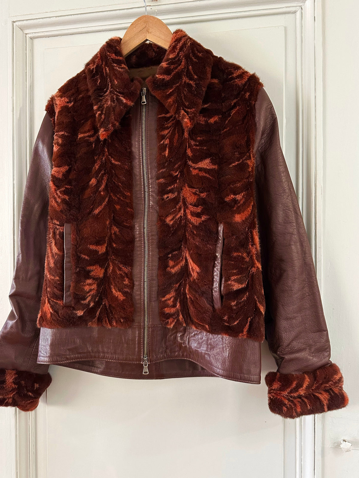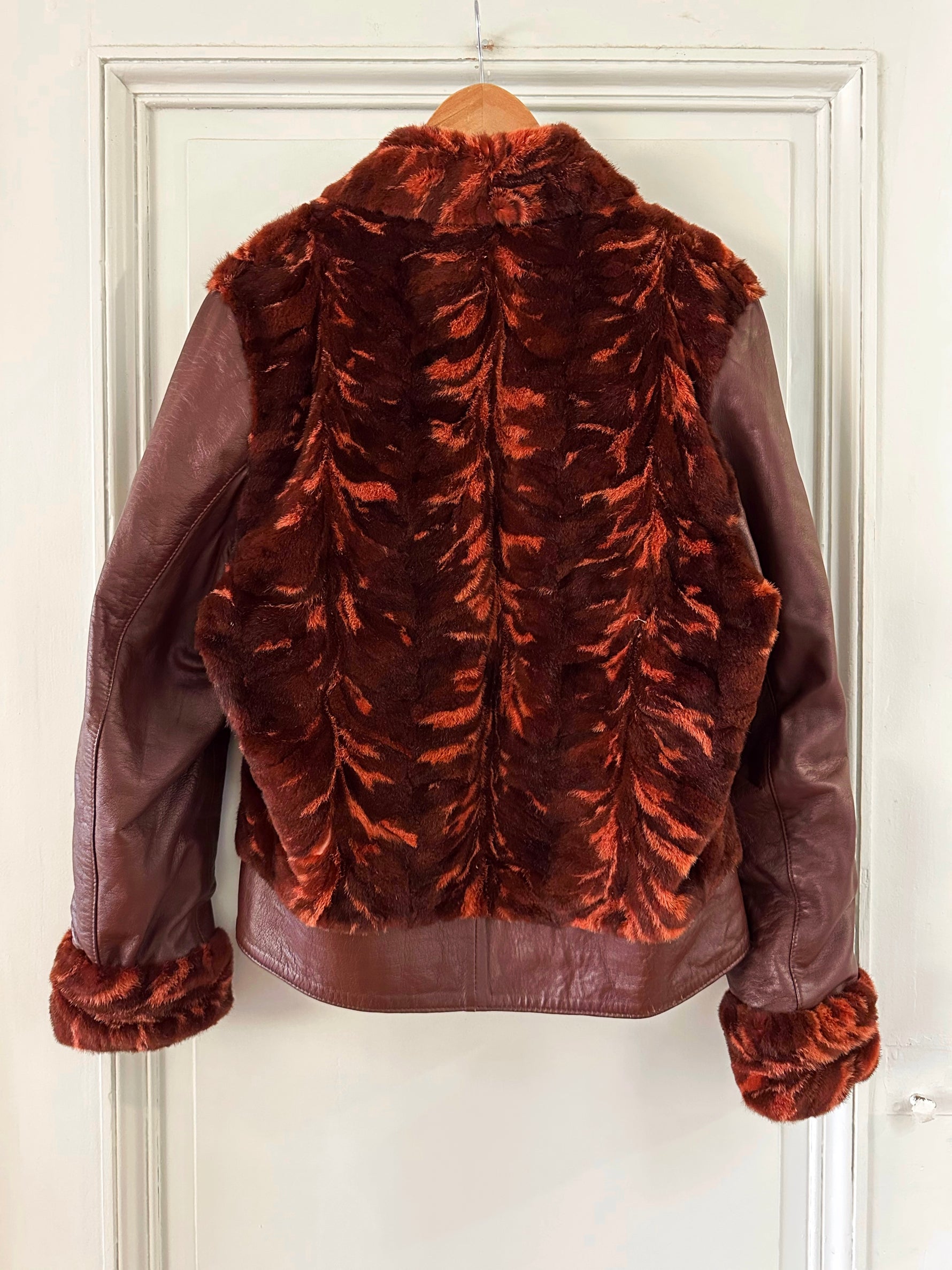 Prix unitaire parBlouson en cuir choco bordeaux et empiècements en fourrure de lapin dans les tons marbrés brun, bordeaux, et oranges. Fabriqué en Italie. Taille 38 porté ici sur un mannequin T36 et ouverte sur une personne T40. Longueur 62cm.