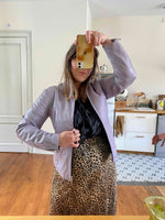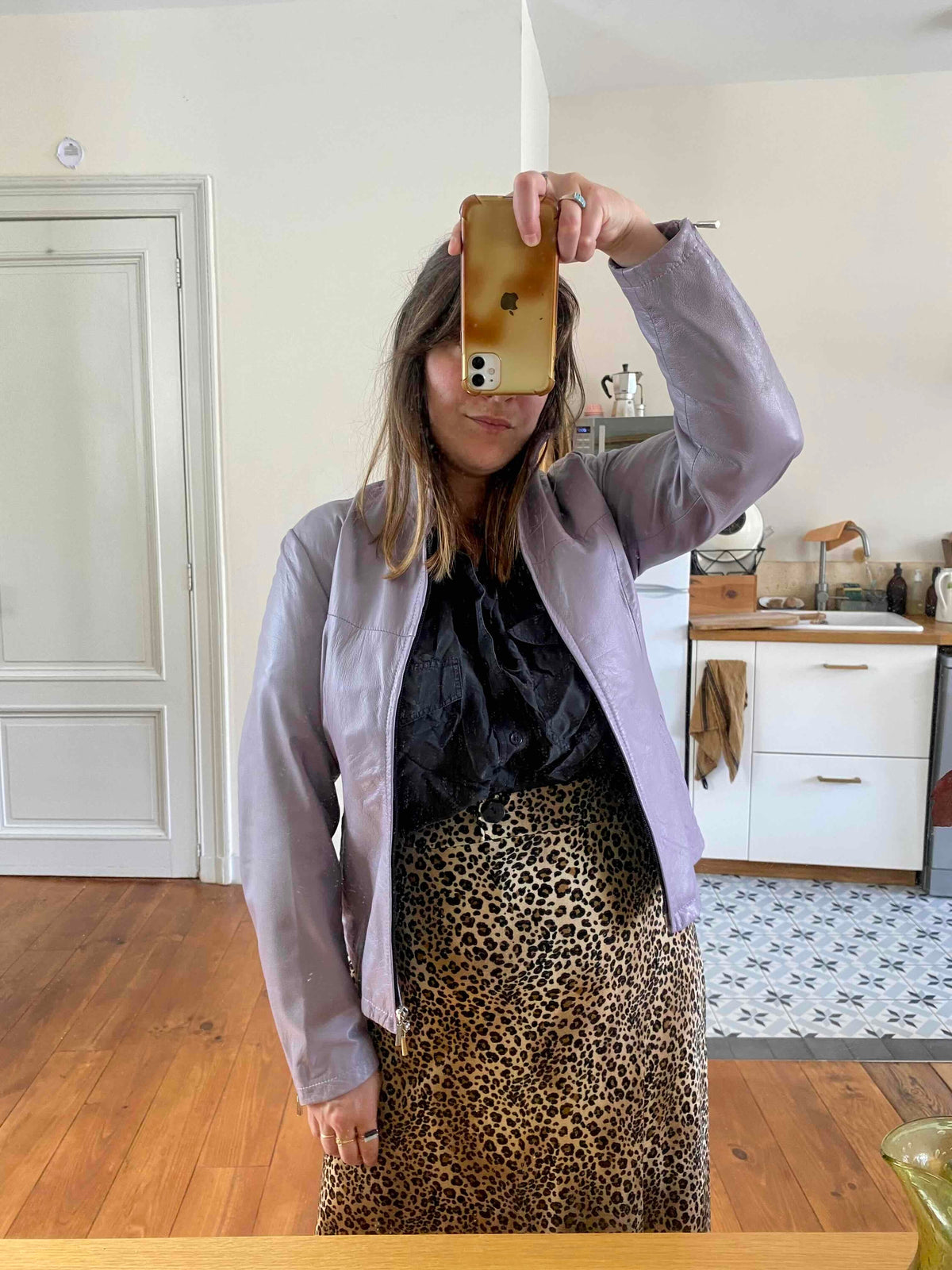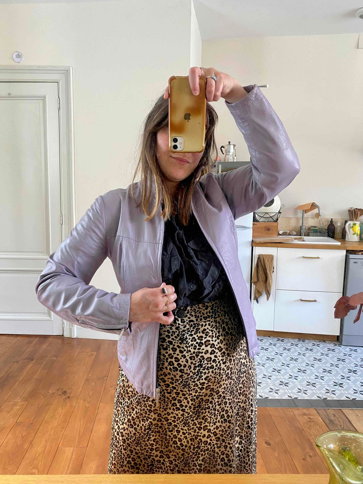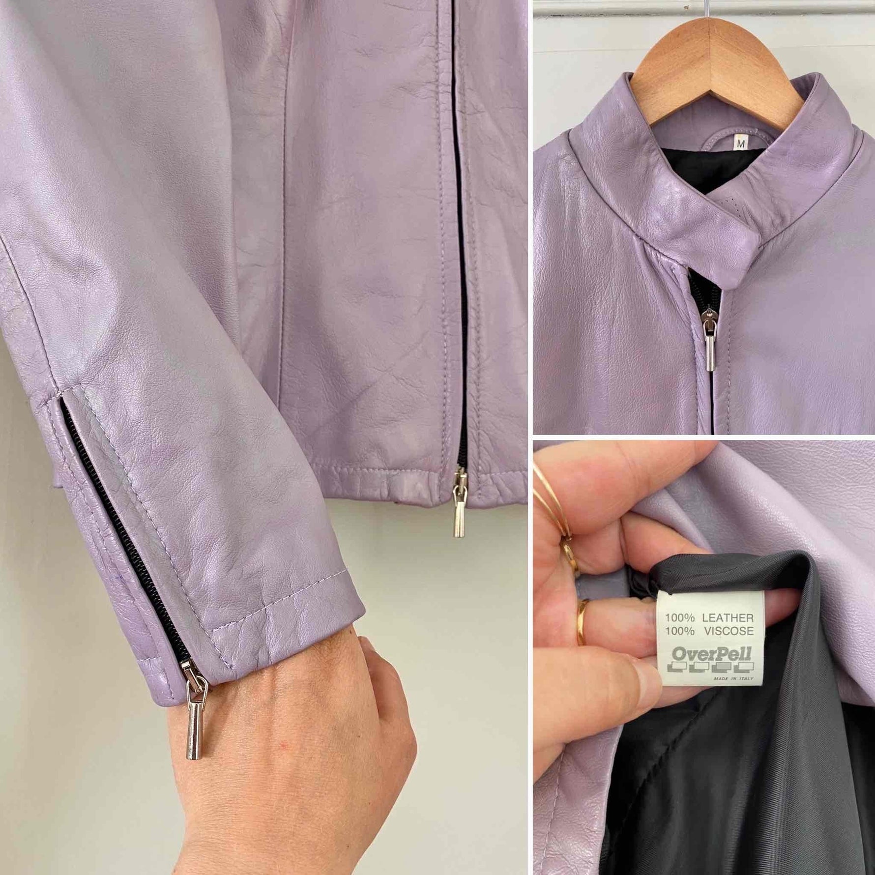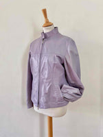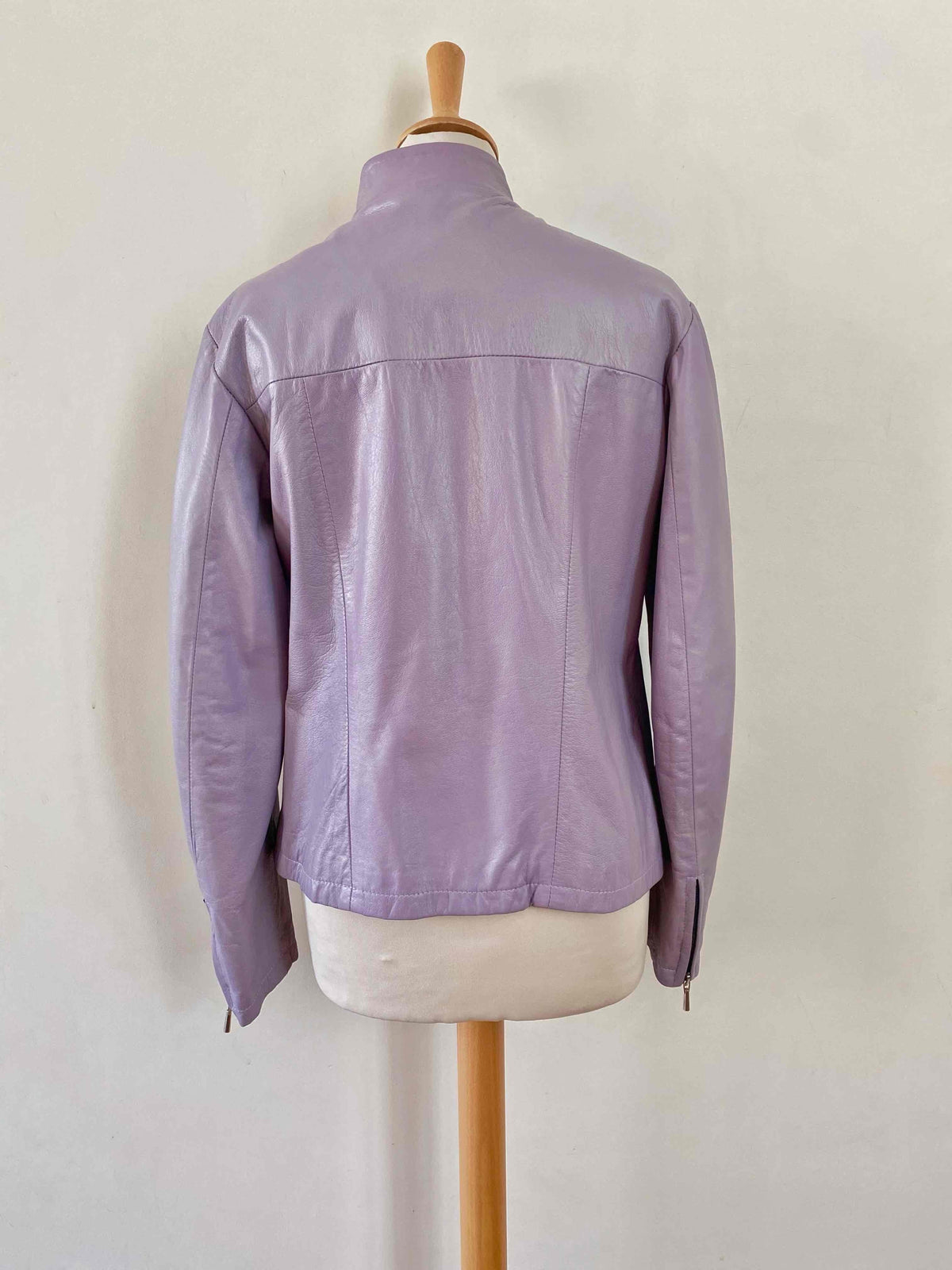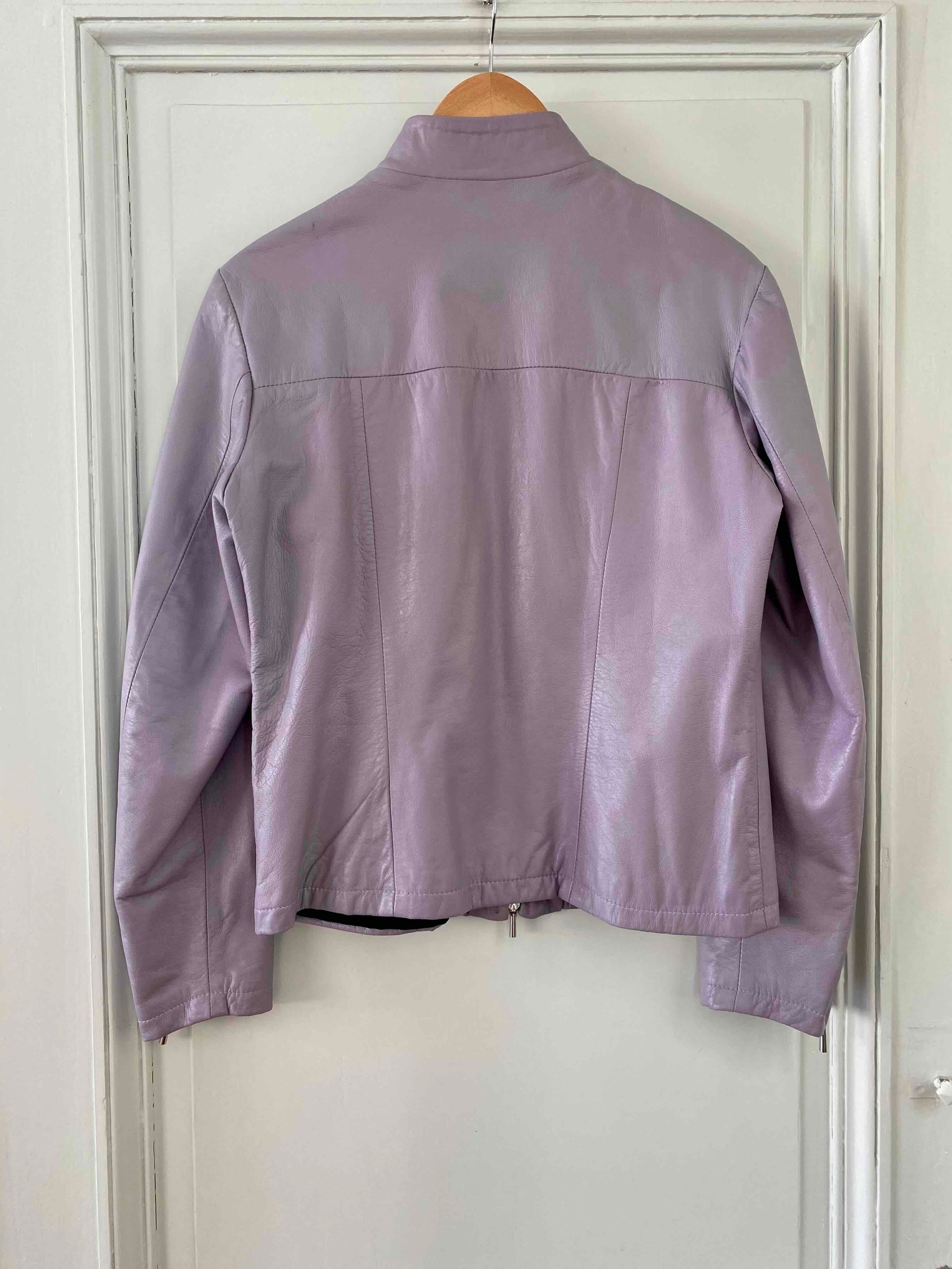 Prix unitaire parBlouson en cuir lilas, cuir d’agneau souple, fermeture éclaire double curseur et col montant, zip aux poignets, fabriqué en Italie, taille 36 et 38 porté ici sur un mannequin T36 et ouvert sur une personne T40.