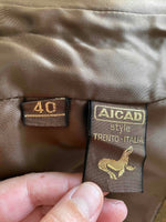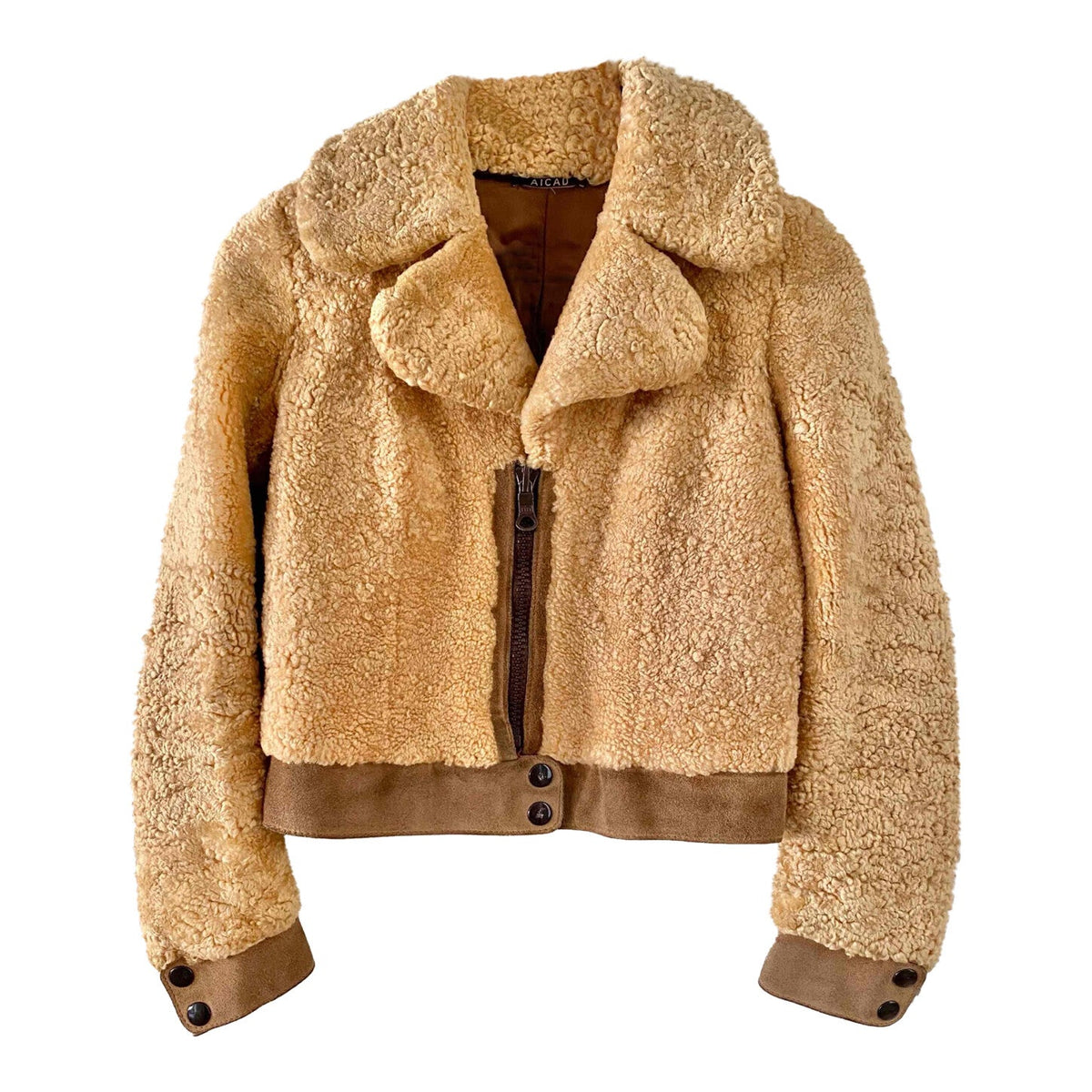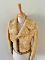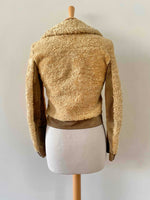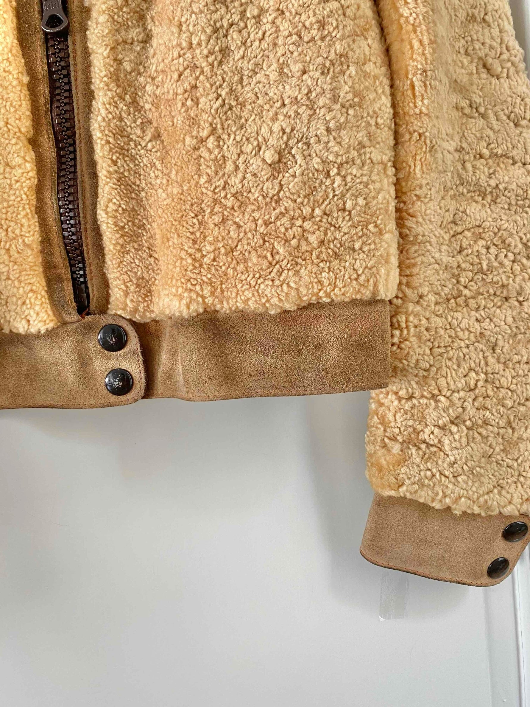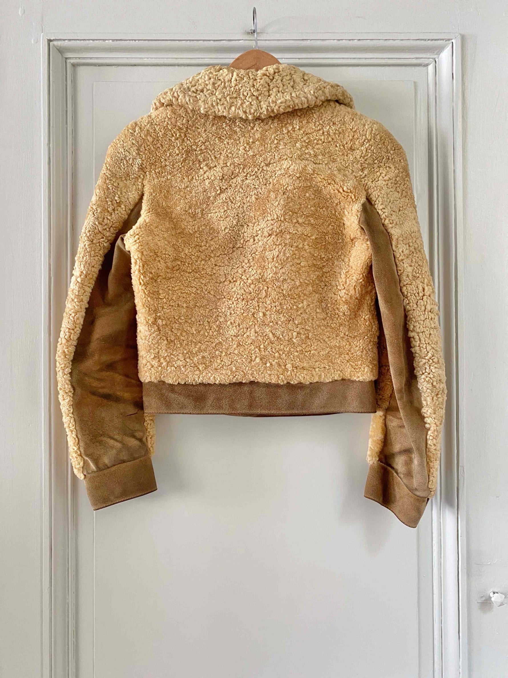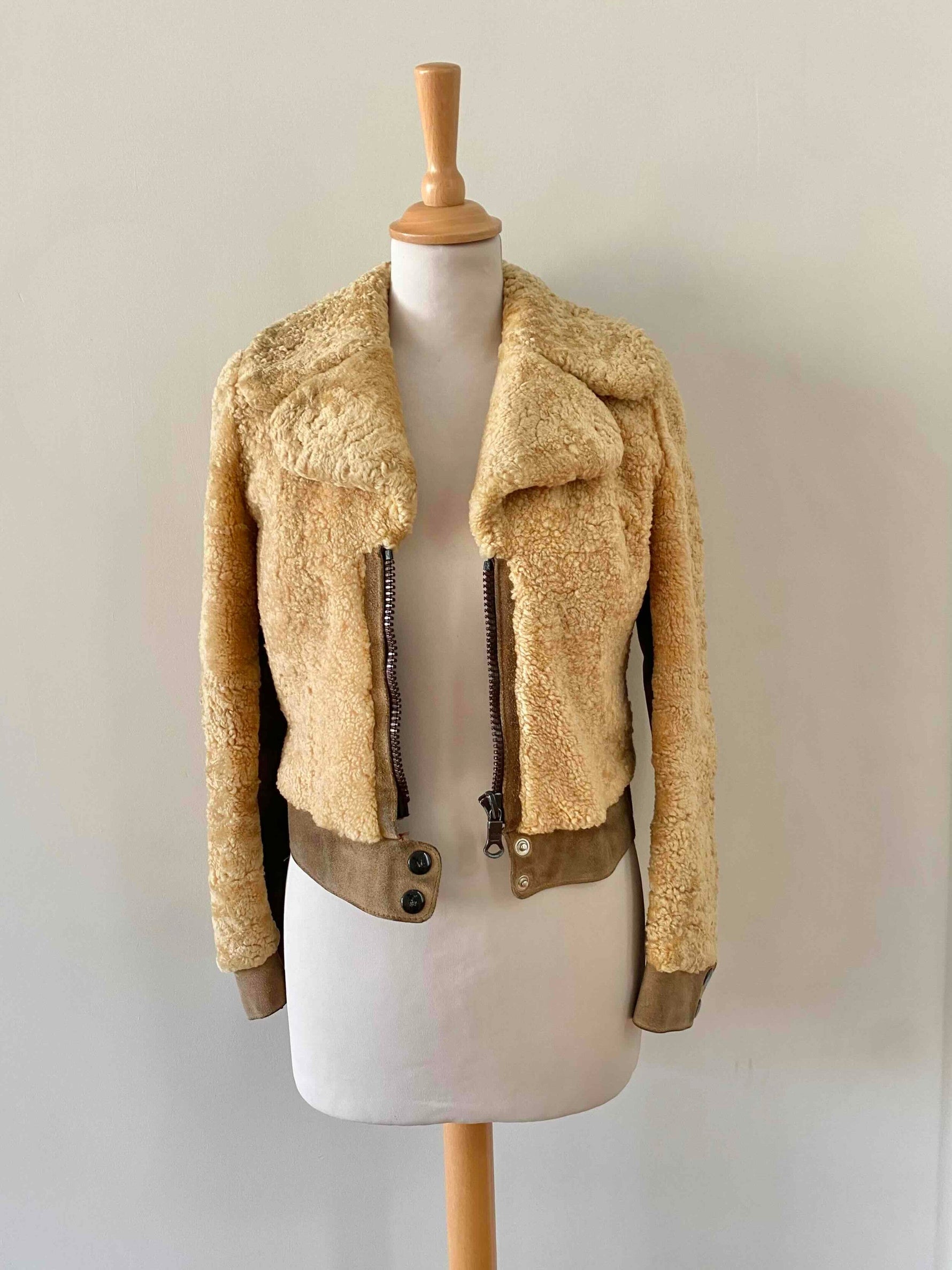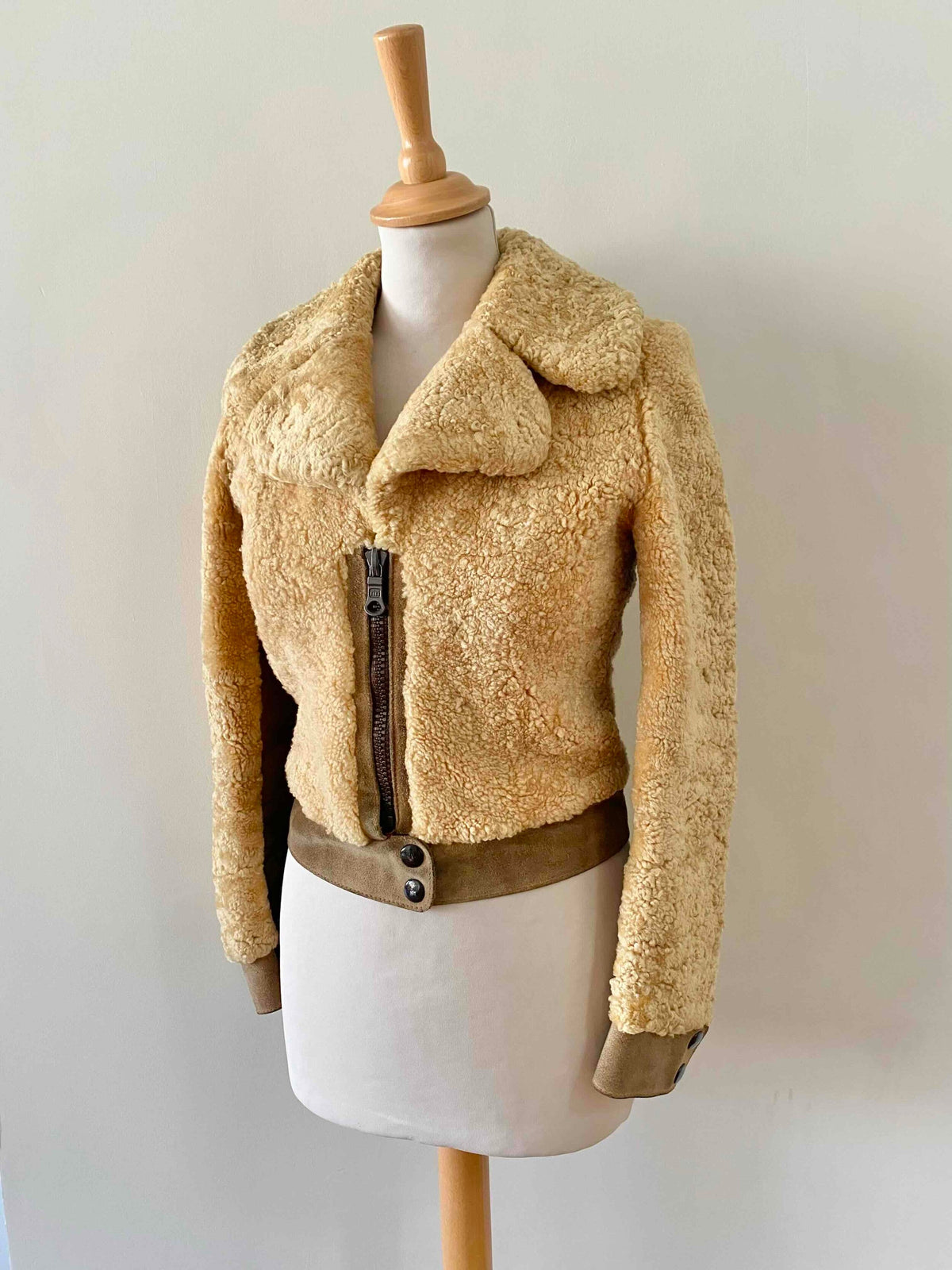 Prix unitaire parBlouson peau lainée, en mouton retourné extérieur daim camel et laine de mouton écru, forme courte, fabriqué en Italie, années 70’s, taille 34 porté ici sur un mannequin T36.