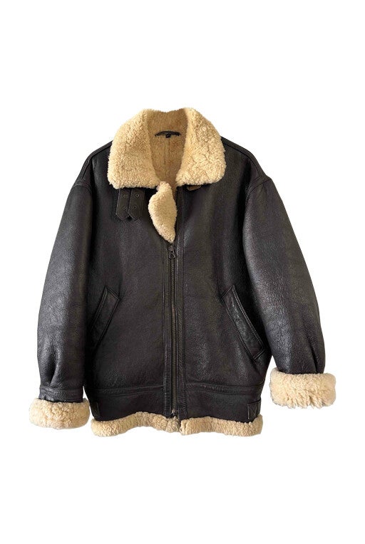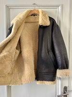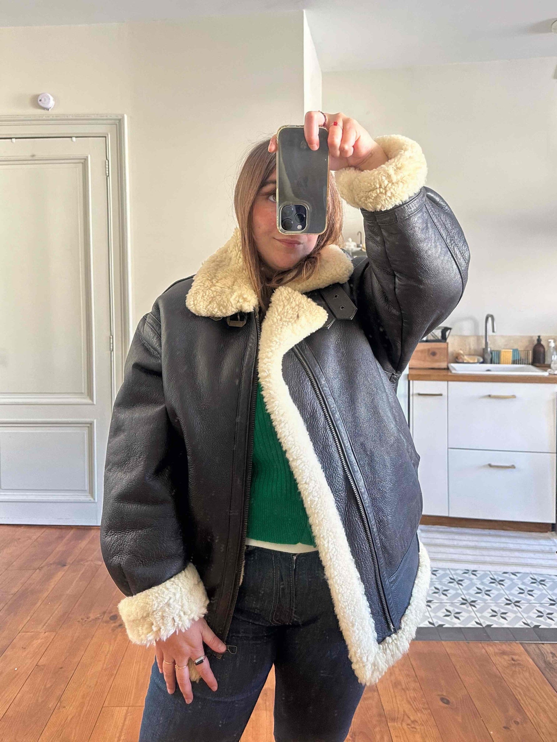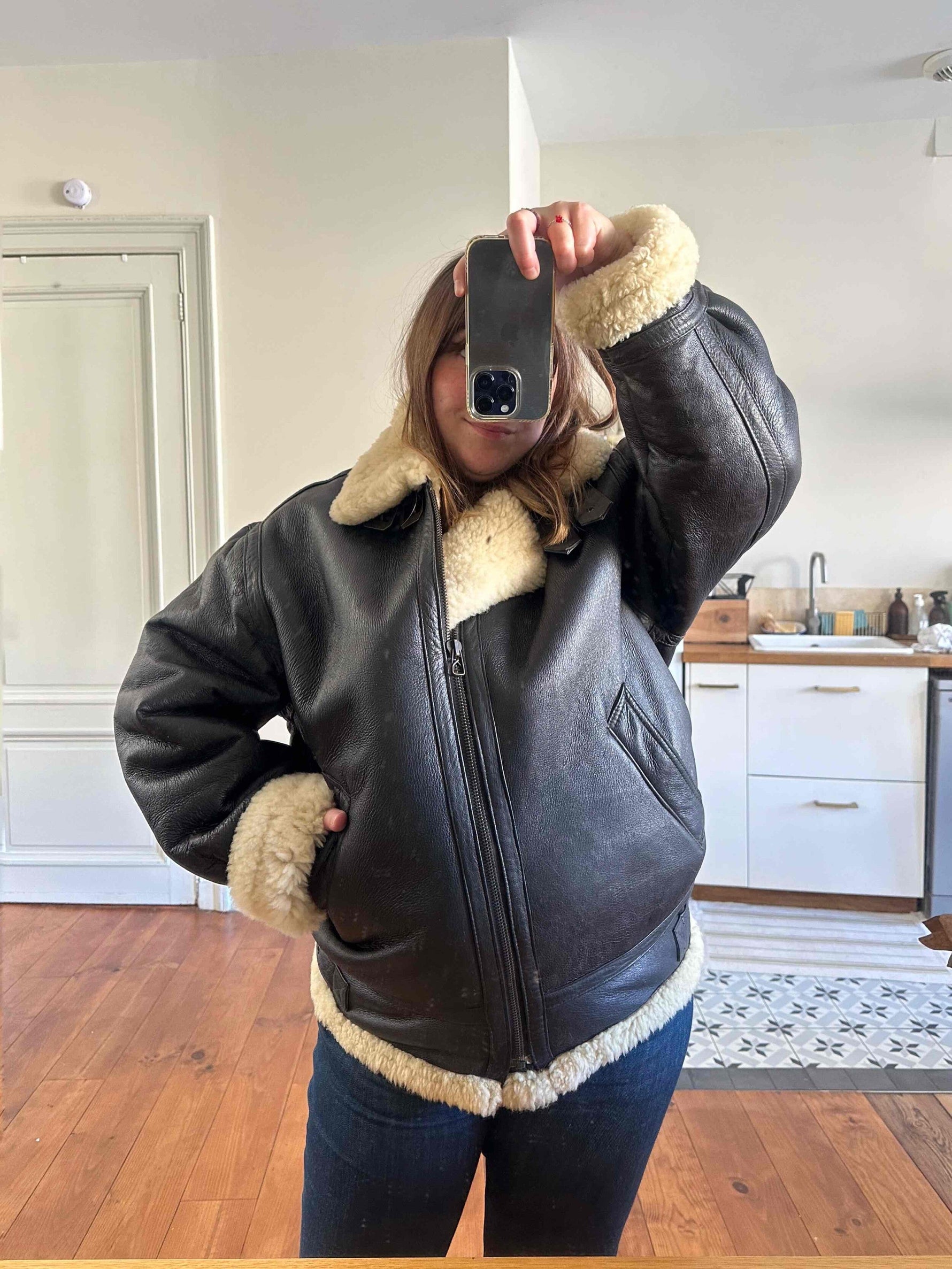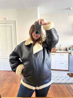 Prix unitaire parBombardier en peau lainée en mouton retourné extérieur cuir chocolat noir, intérieur mouton écru naturel, type B3, fabriqué en France, convient aux tailles 38 et 40 porté ici sur une personne T40.