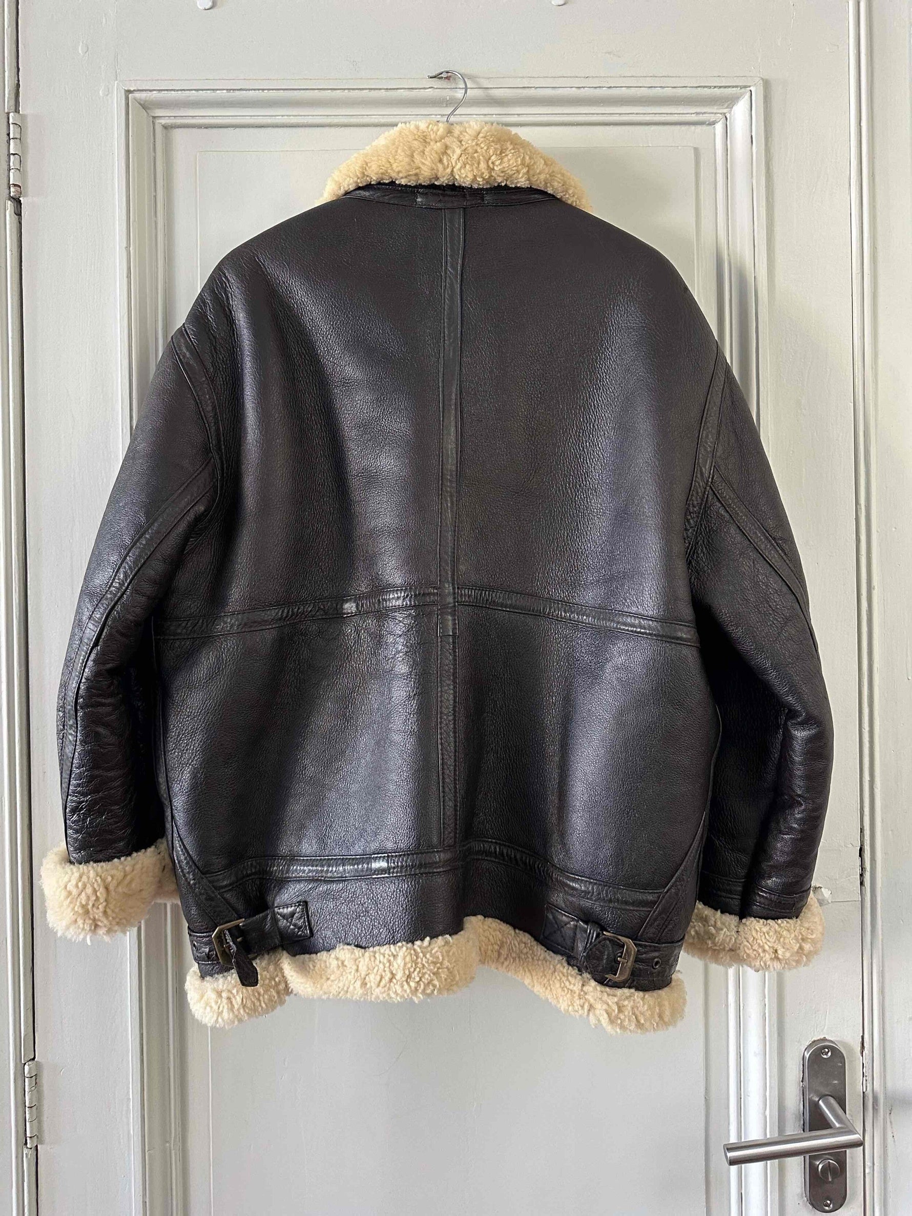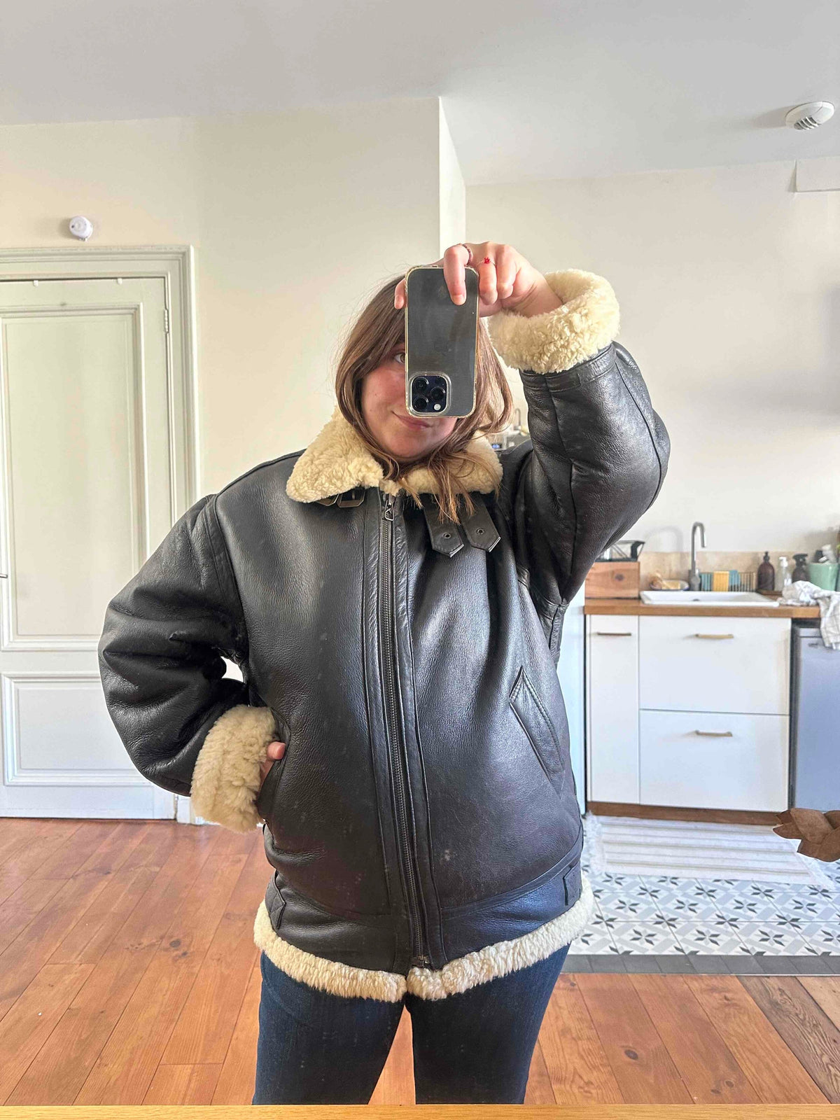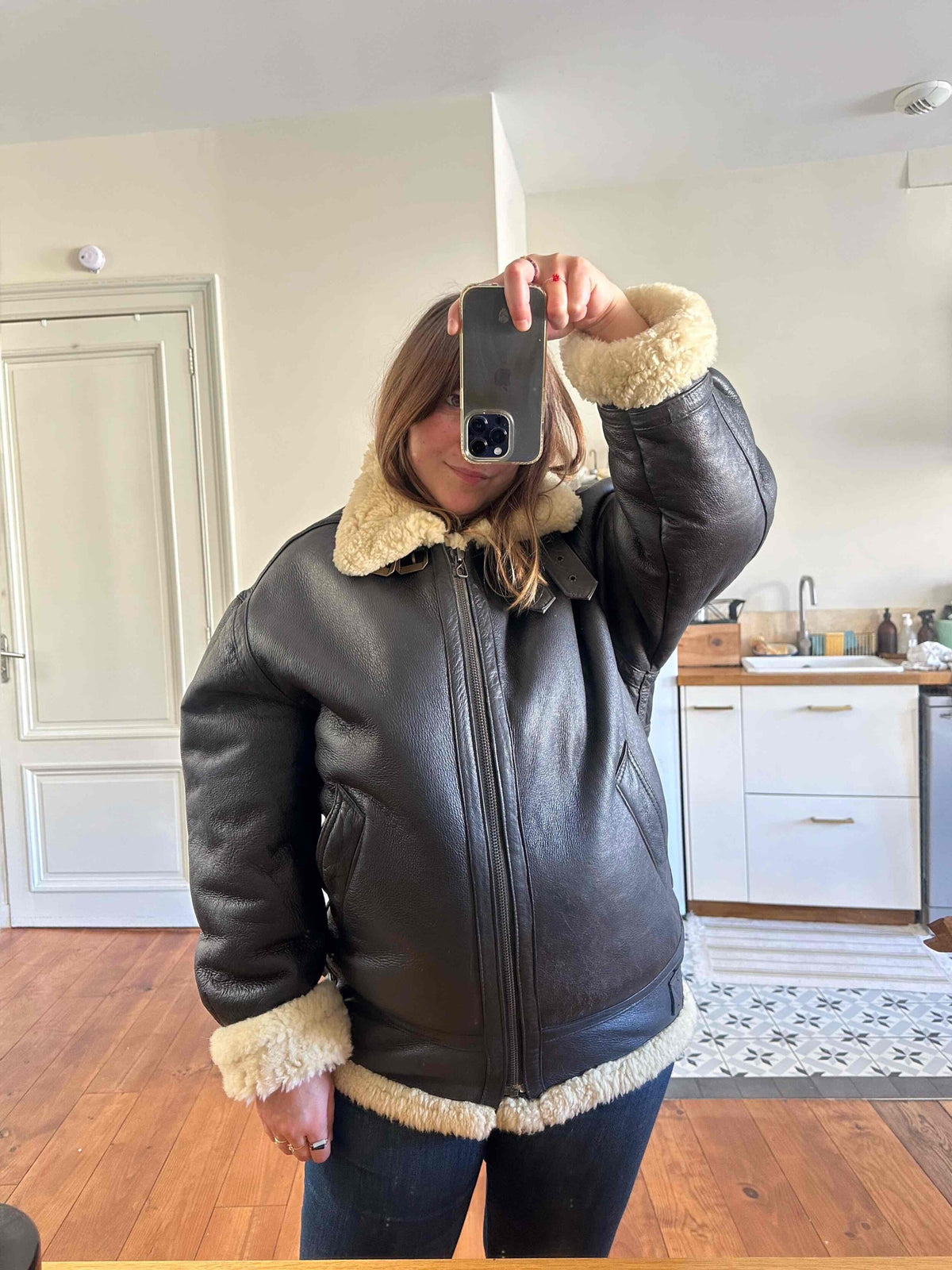 Prix unitaire parBombardier en peau lainée en mouton retourné extérieur cuir chocolat noir, intérieur mouton écru naturel, type B3, fabriqué en France, convient aux tailles 38 et 40 porté ici sur une personne T40.