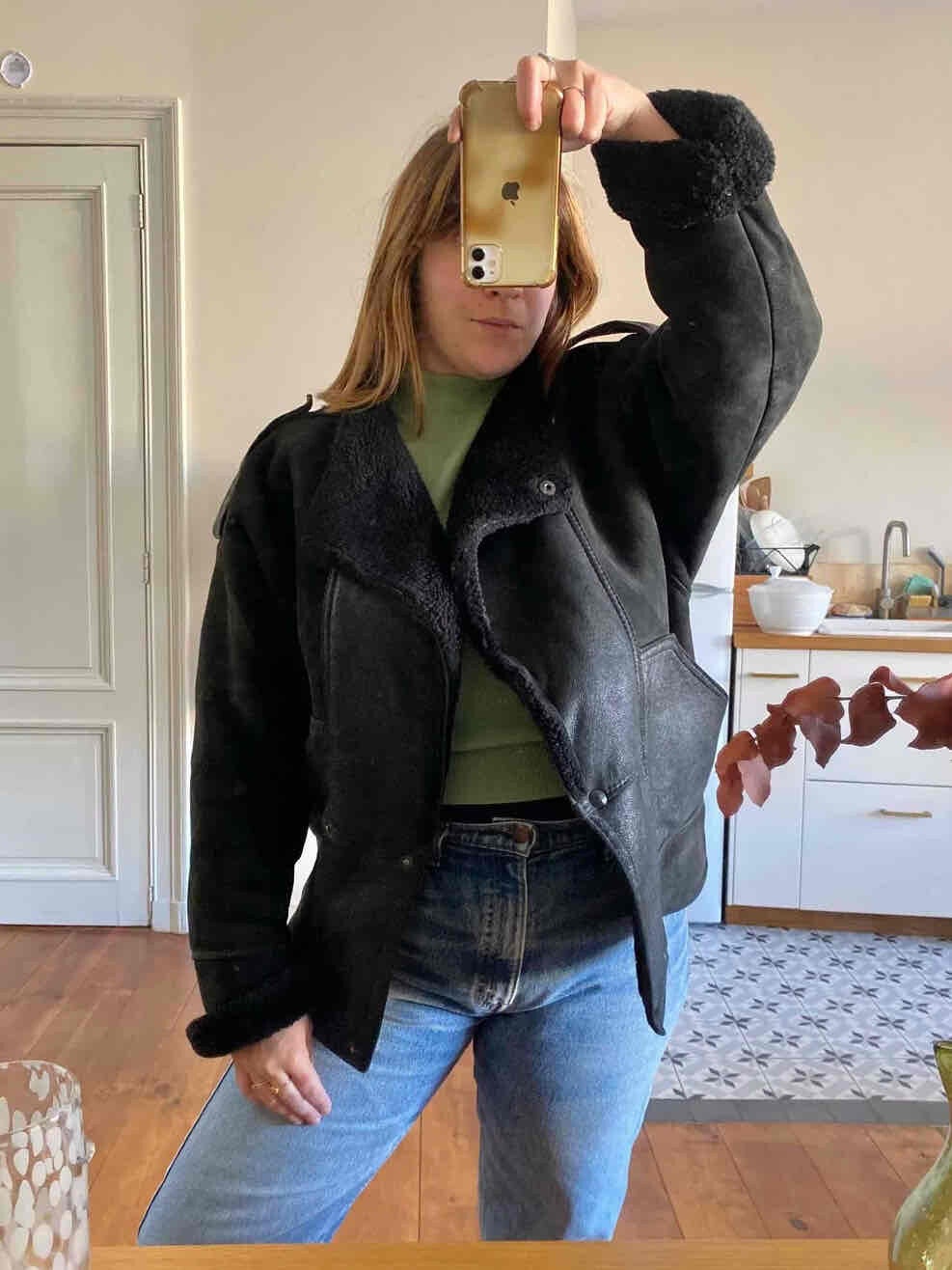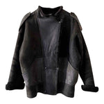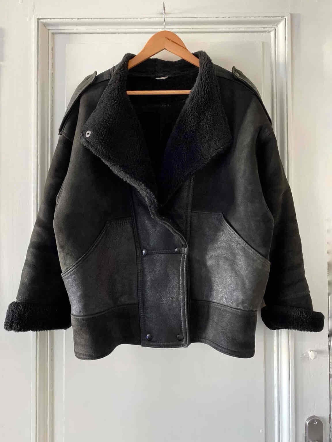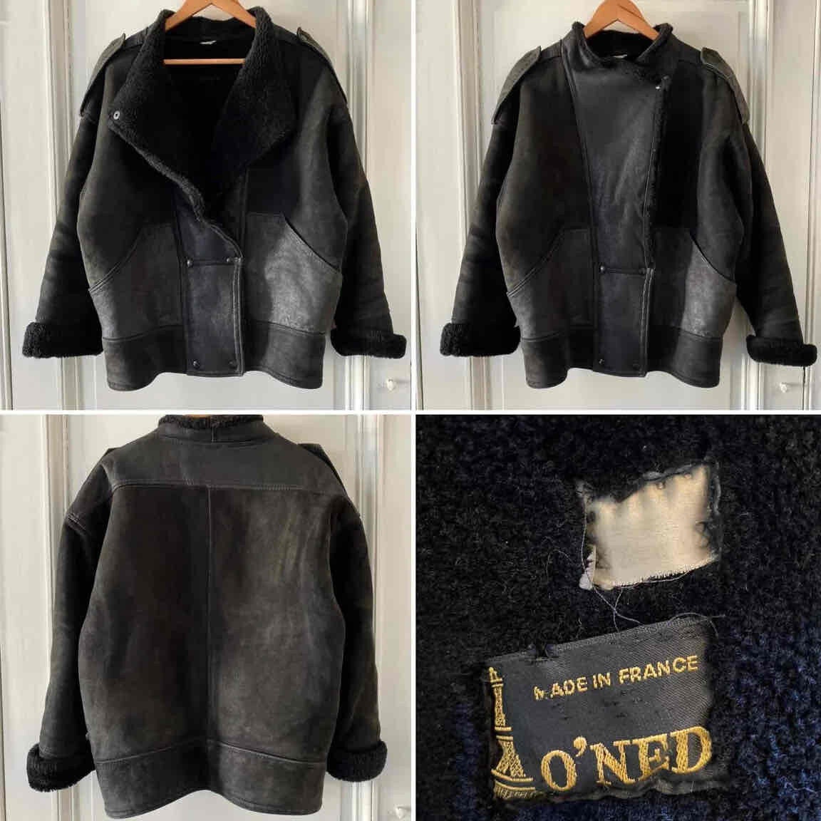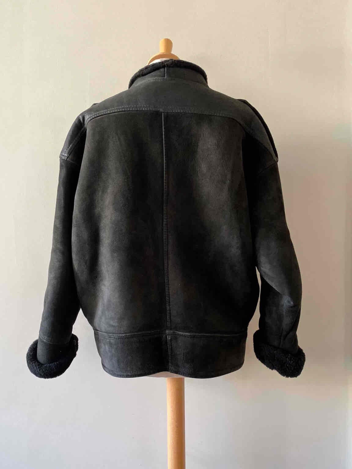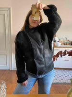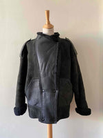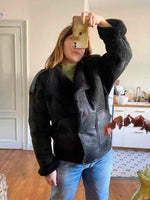 Prix unitaire parBombardier en peau lainée, mouton retourné extérieur cuir lisse et cuir velours noir, interieure fourrure mouton noire, fermeture croisée par bouton pressions, fabriqué en France, taille 36 et 38 porté ici sur un mannequin T36 et serrée sur une personne T40, hanches 48cm.