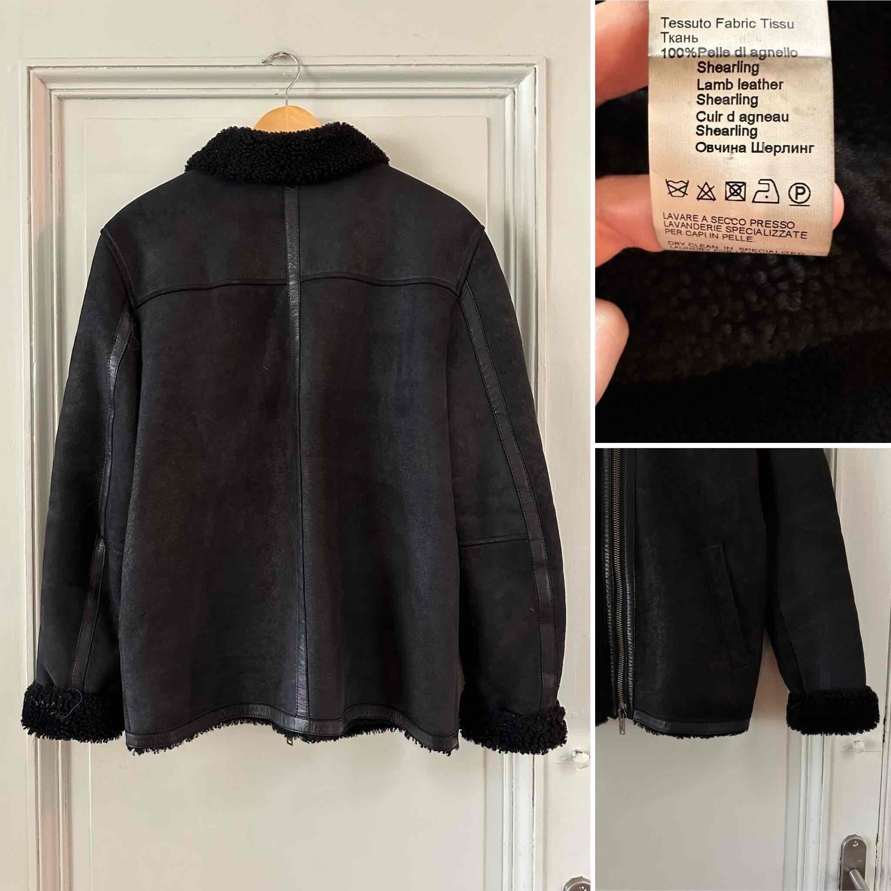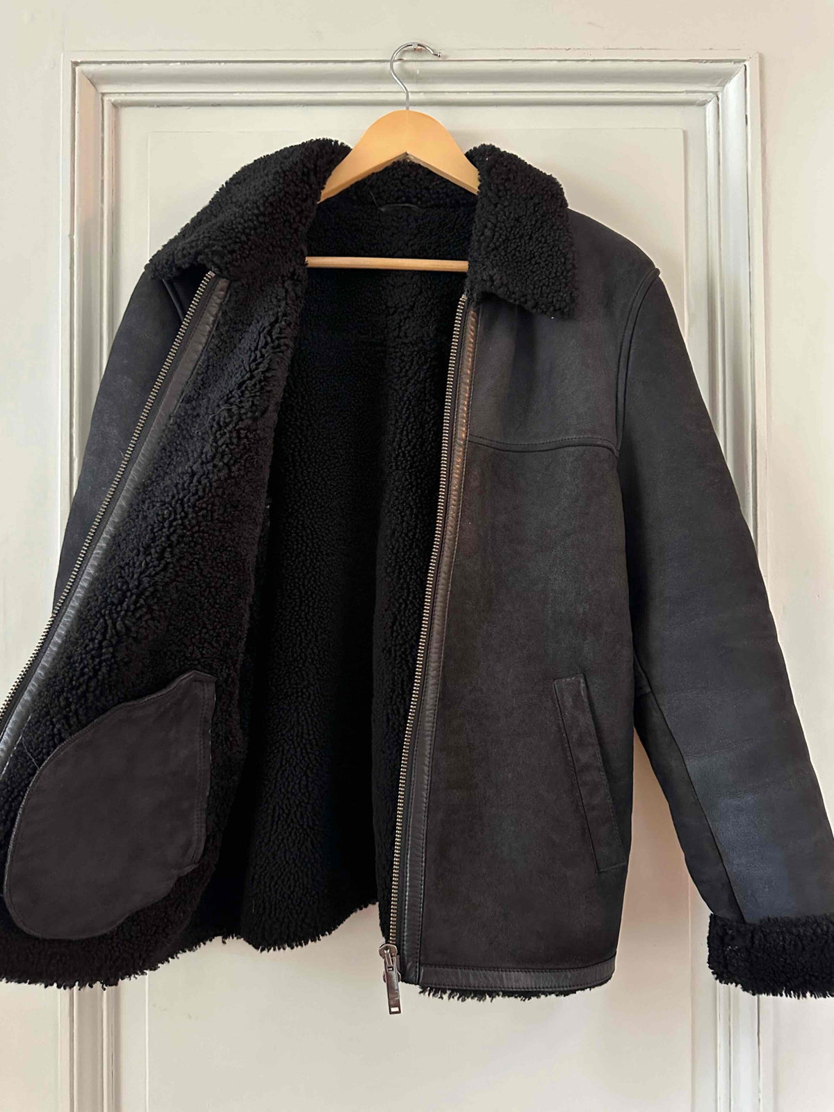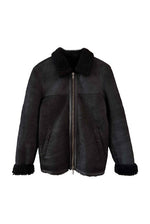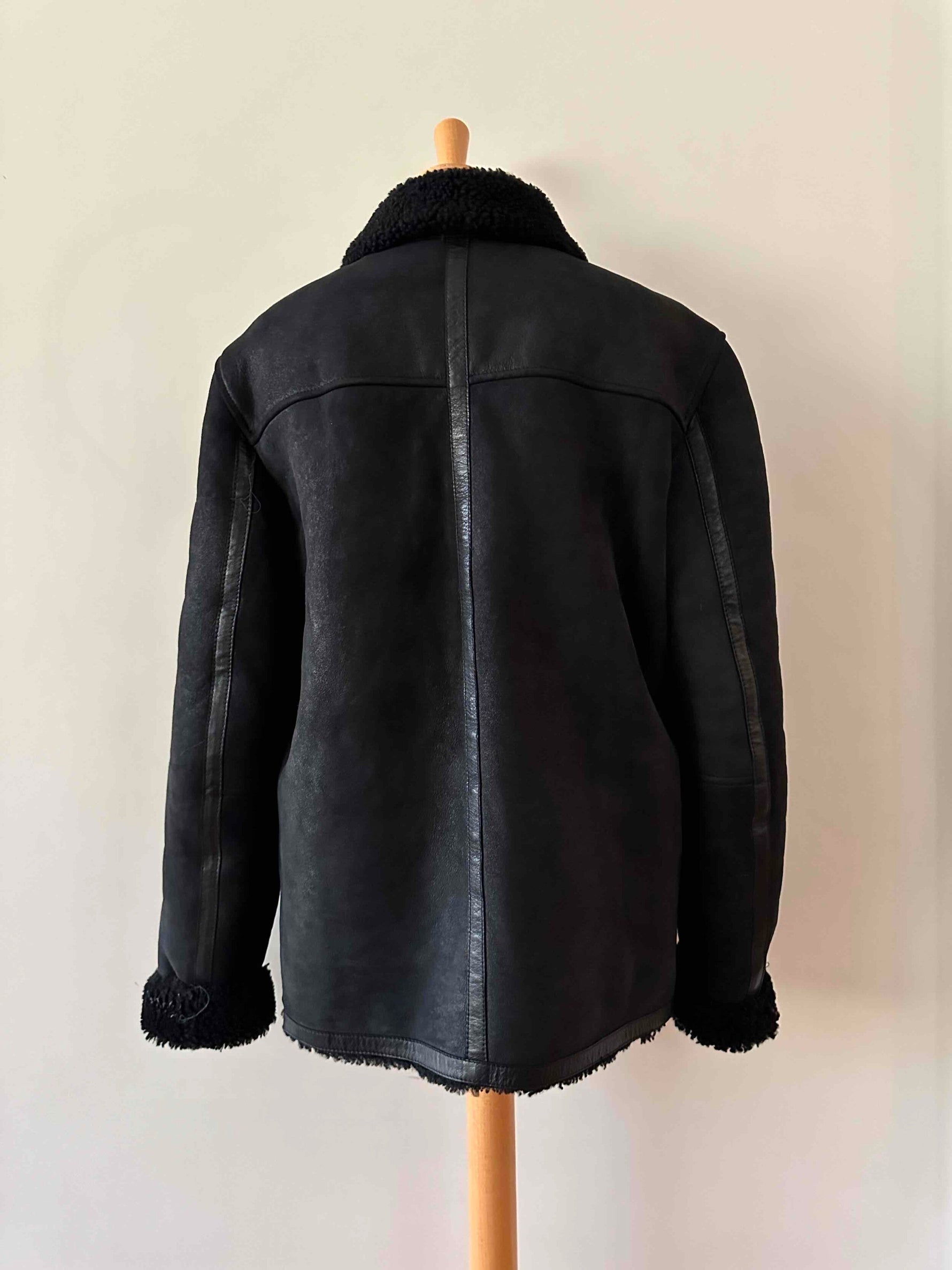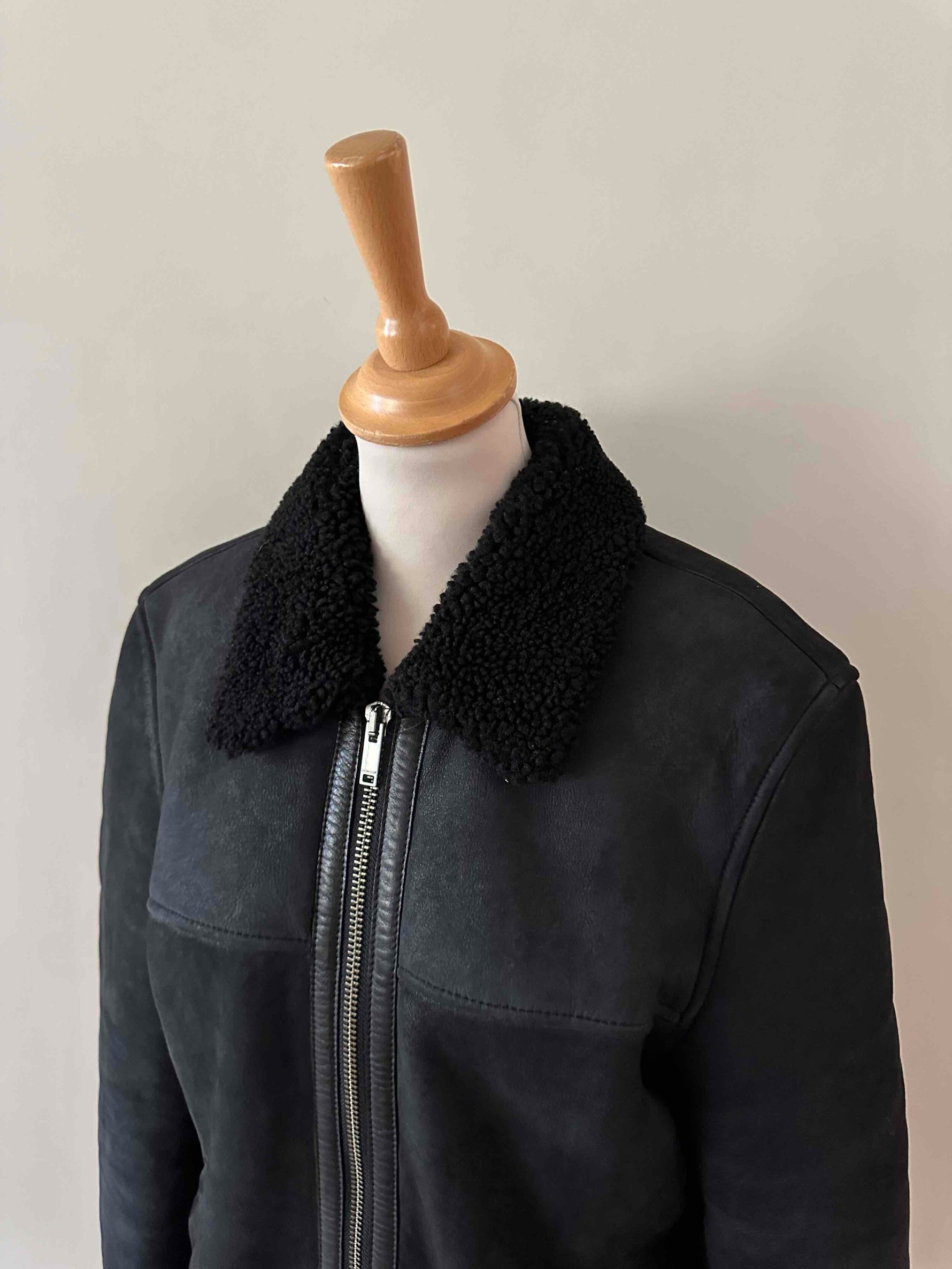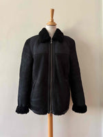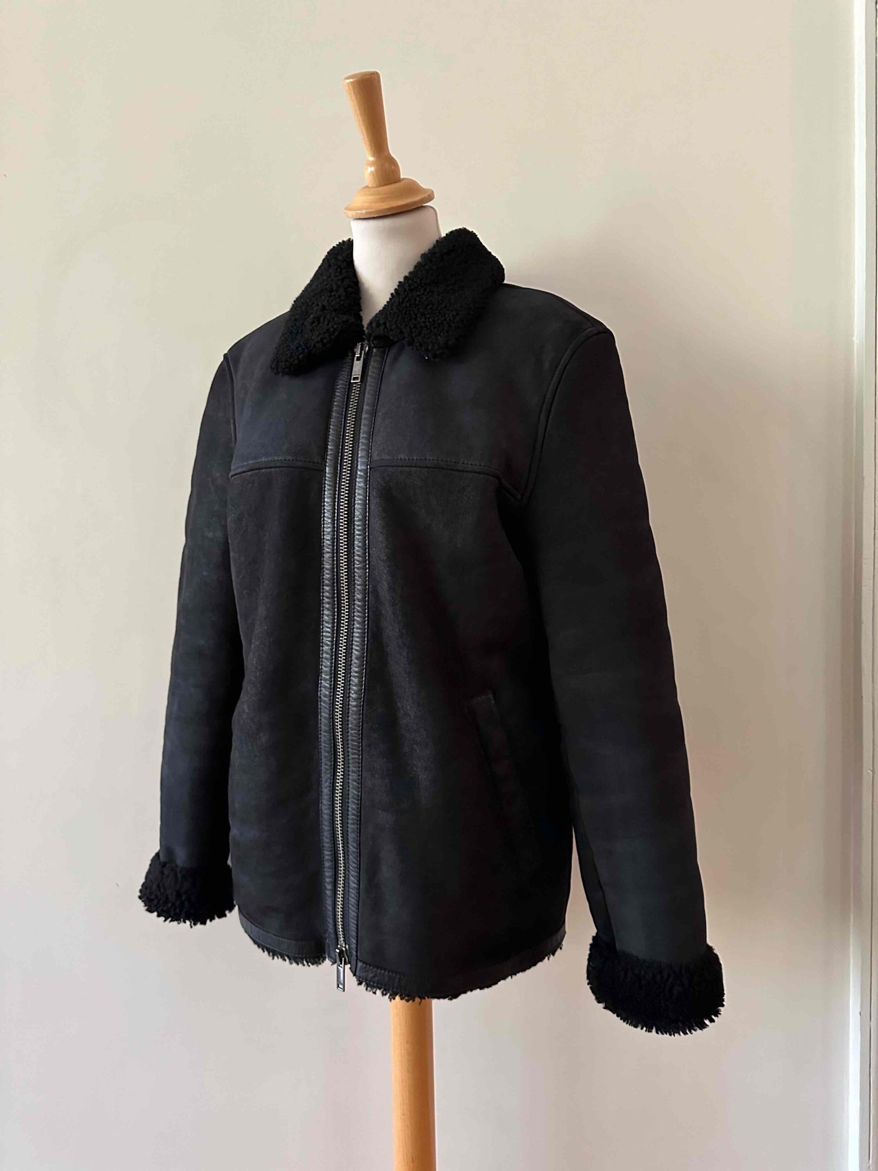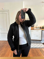 Prix unitaire parBombardier en peau lainée, mouton retourné extérieur daim velours noir gansé de cuir lisse noir, intérieur laine de mouton noire, fermeture éclair, forme droite, fabriqué en Turquie, taille 36 porté ici sur un mannequin T36 et ouvert sur une personne T40.