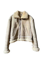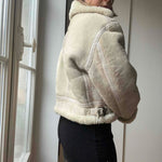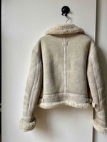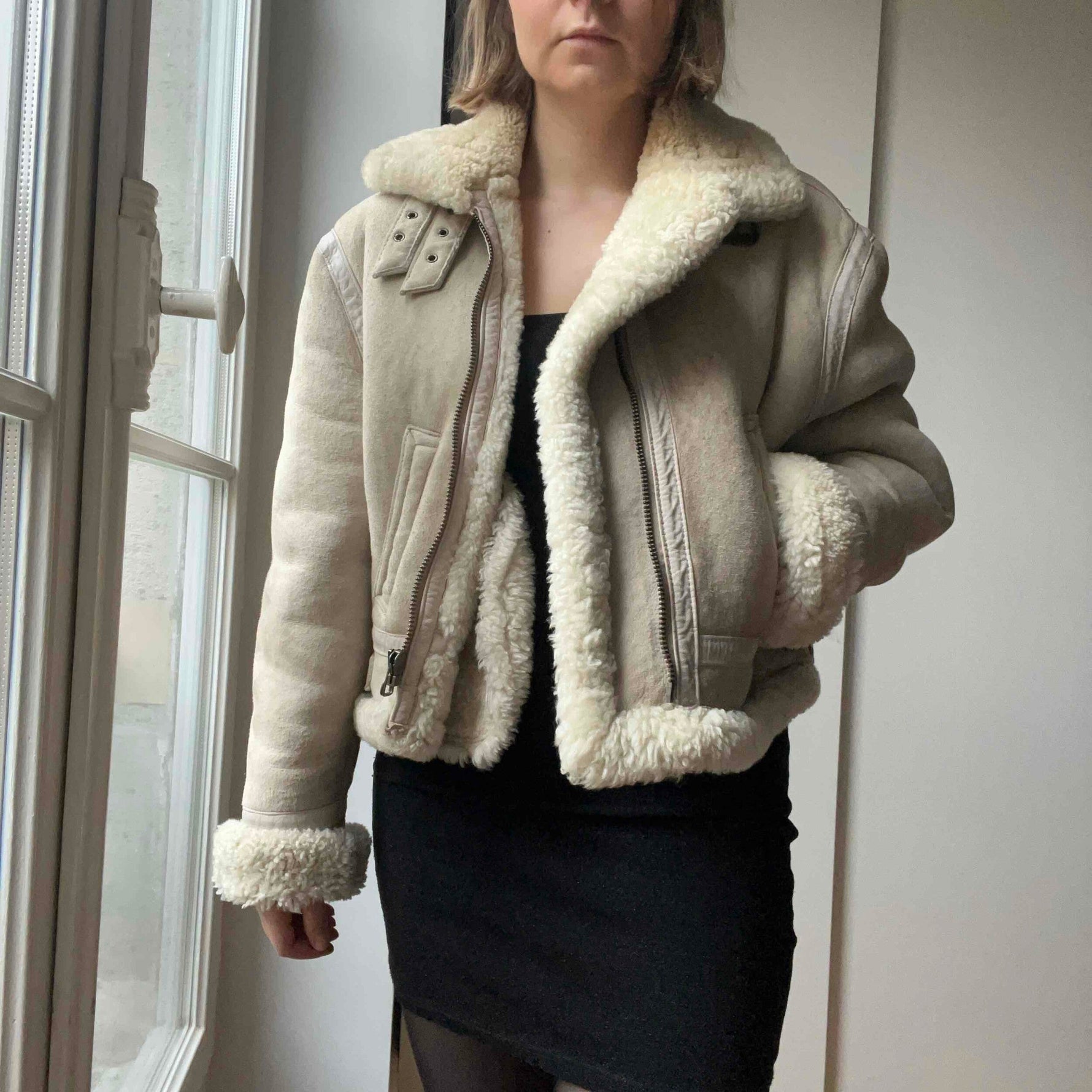 Prix unitaire parBombardier court en peau lainée / shealing blanc cassé / beige très clair. Avec deux boucles au col. Années 80s. Pièce rare collector. Taille 36. Marque : Itinérance.