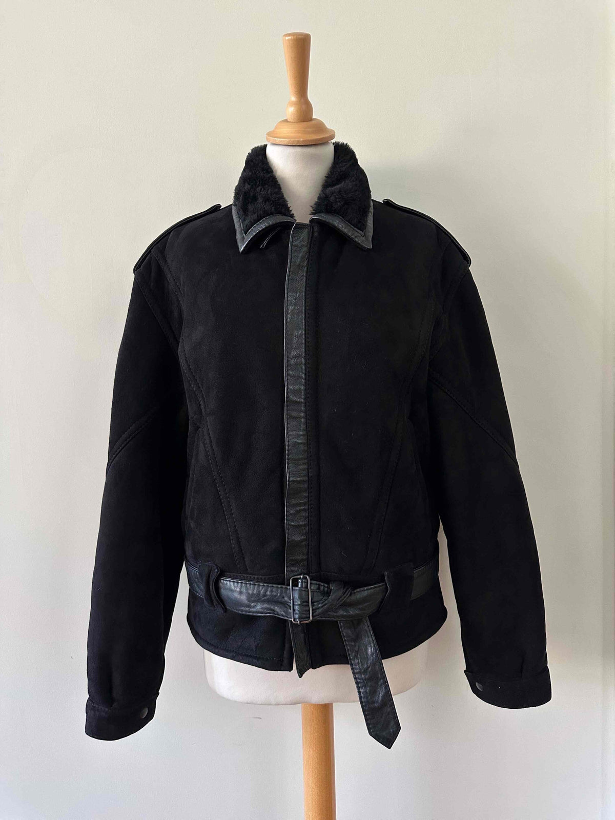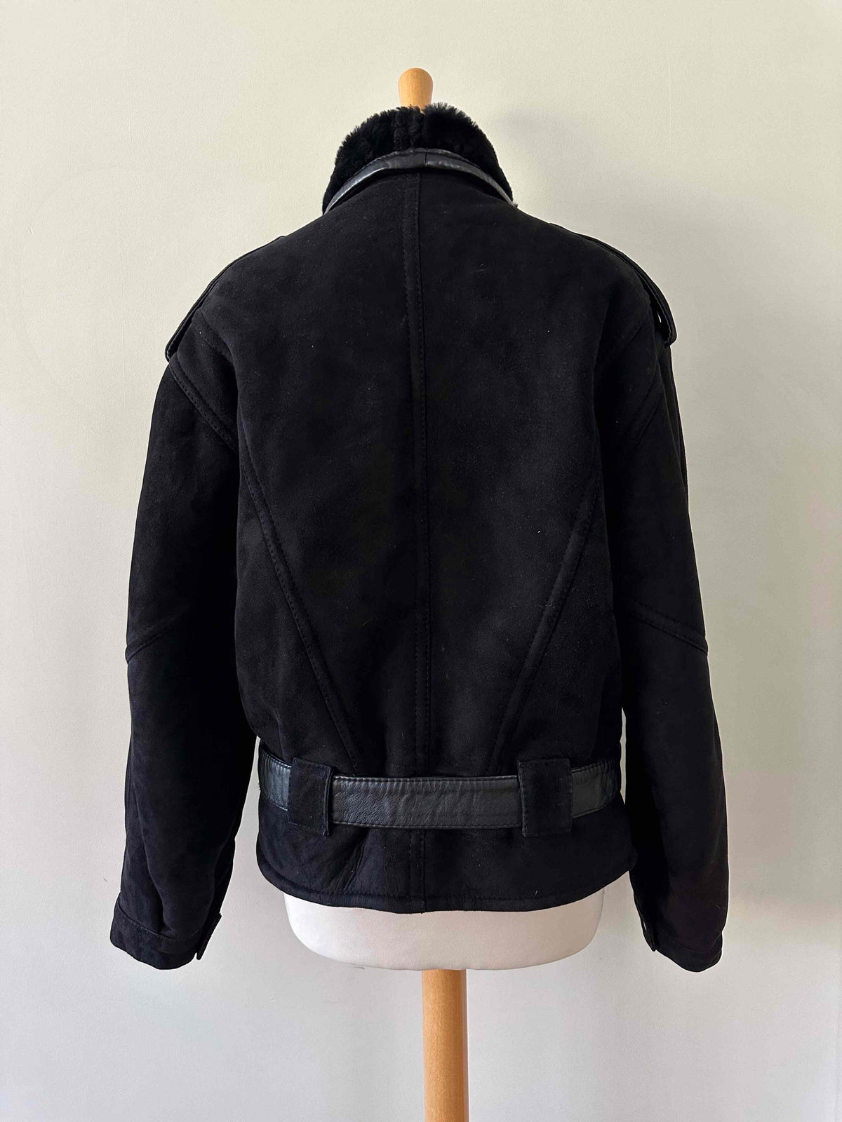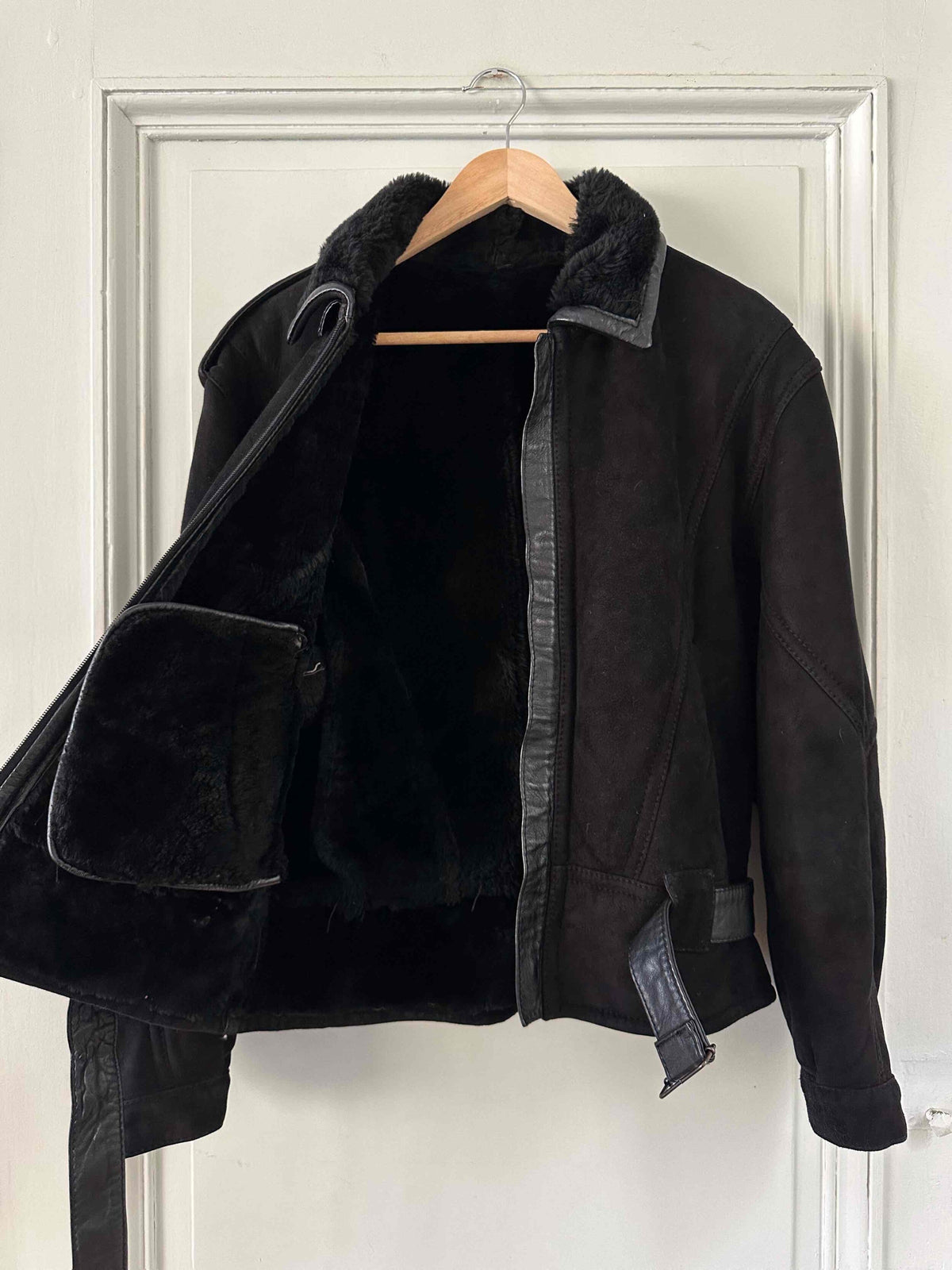 Prix unitaire parBombardier peau lainee en mouton retourné exterieur daim noir et ganses en cuir noir, fermeture éclair, ceinture taille à boucle coulissante, manches forme blouson avec poignets à boutons pressions, fabriqué en Italie, convient aux tailles 34 et 36 porté ici sur un mannequin T36.