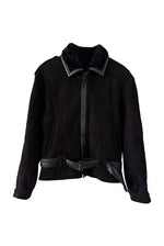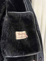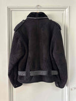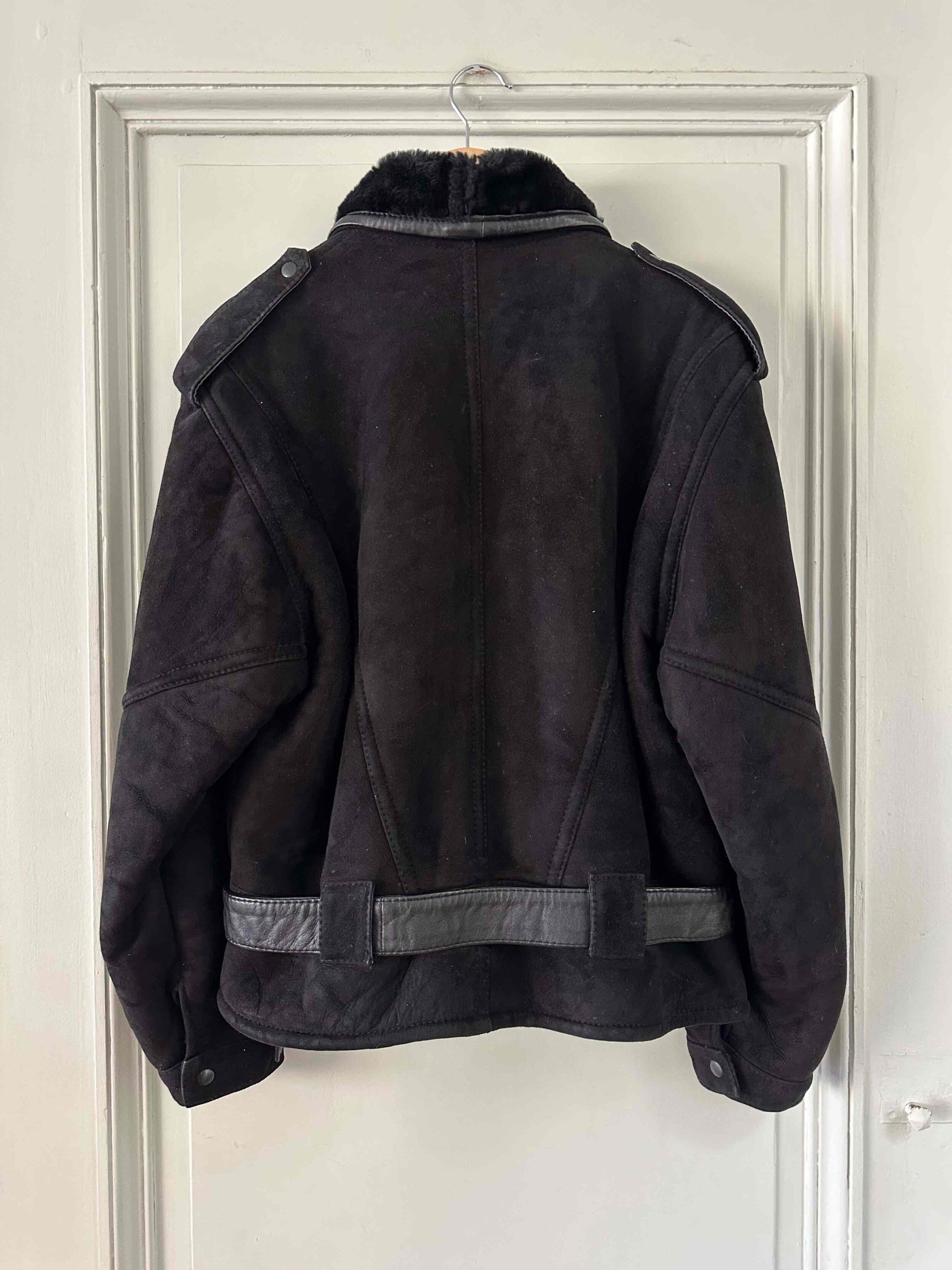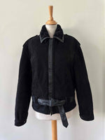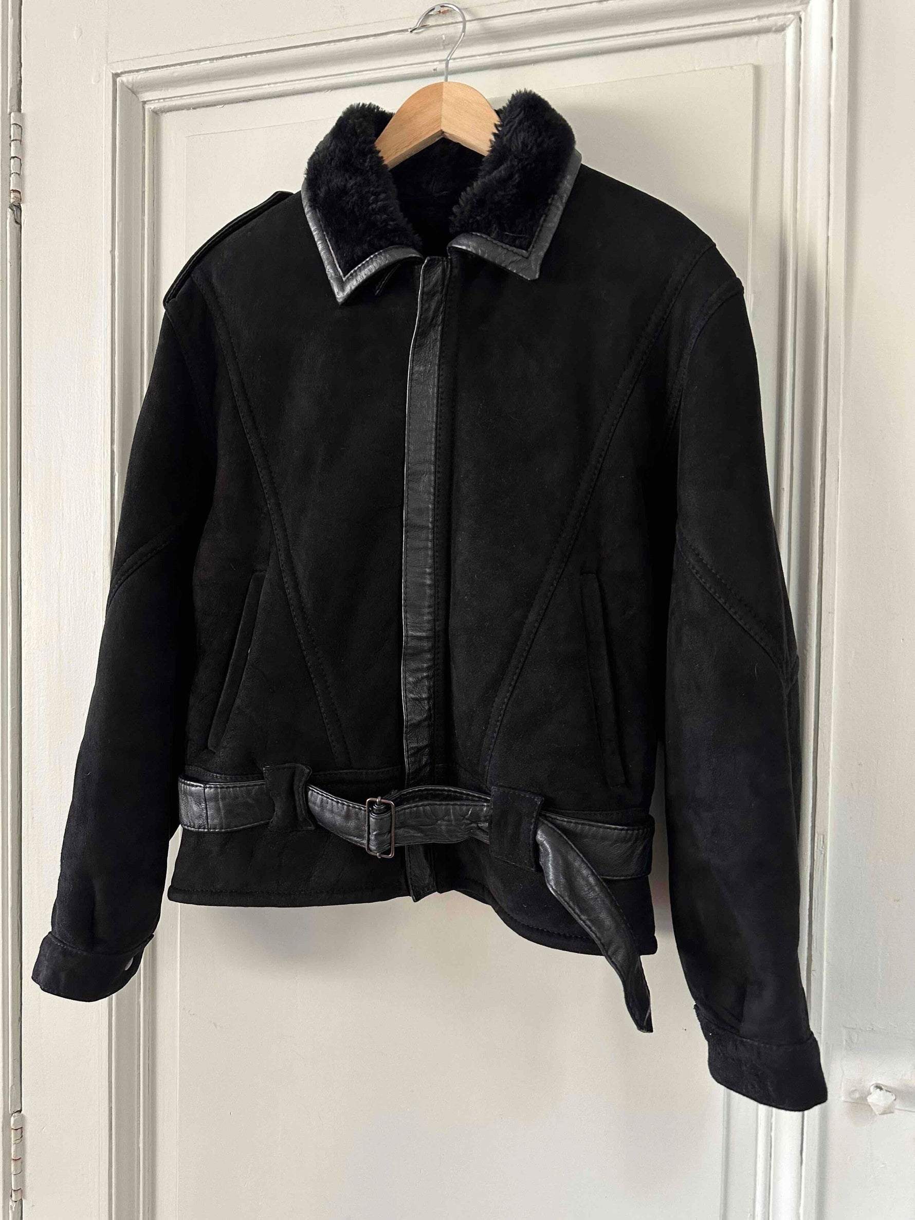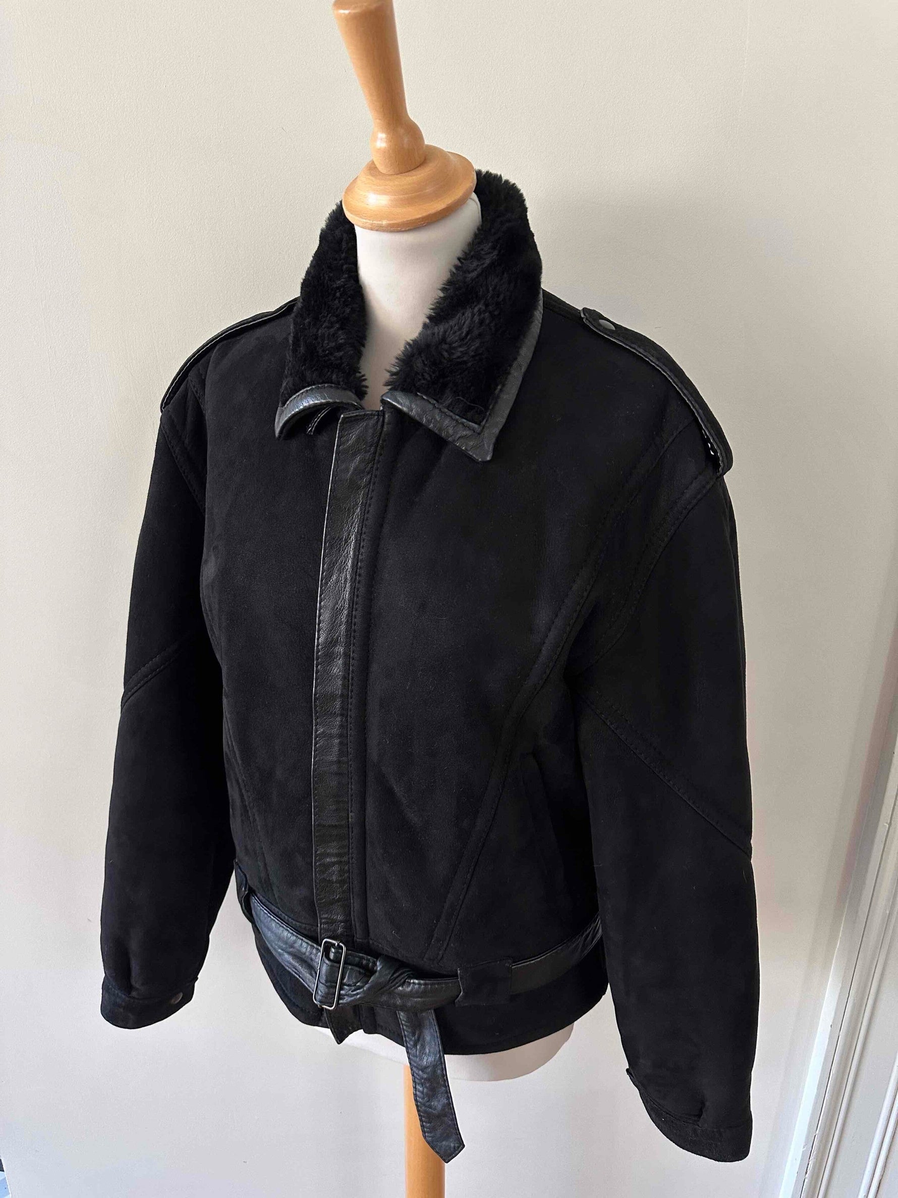 Prix unitaire parBombardier peau lainee en mouton retourné exterieur daim noir et ganses en cuir noir, fermeture éclair, ceinture taille à boucle coulissante, manches forme blouson avec poignets à boutons pressions, fabriqué en Italie, convient aux tailles 34 et 36 porté ici sur un mannequin T36.