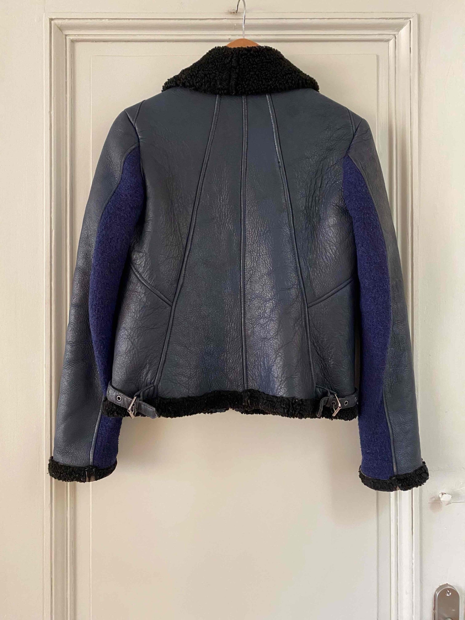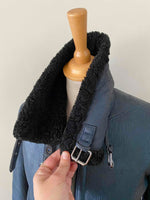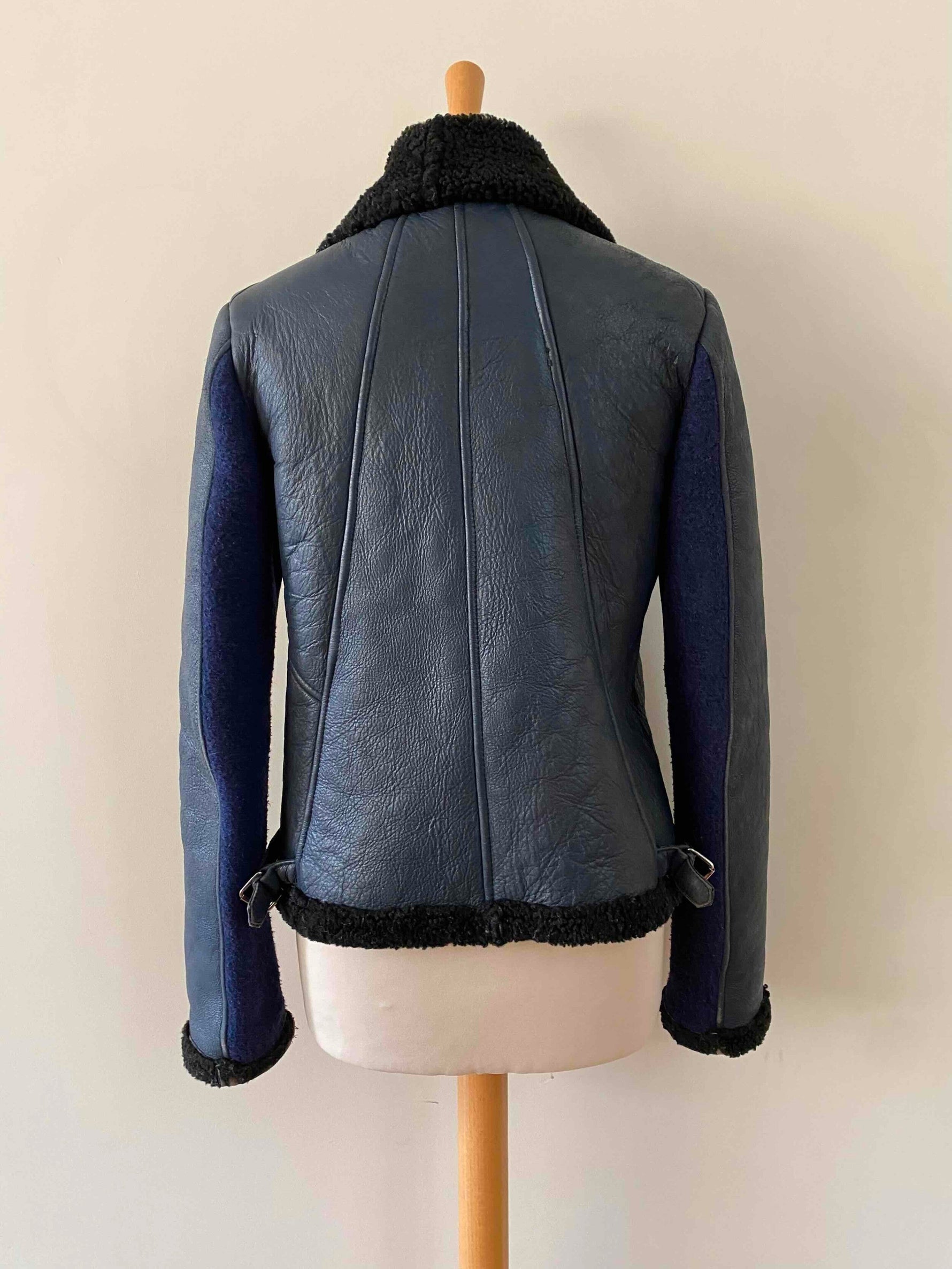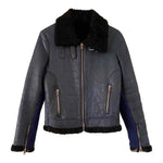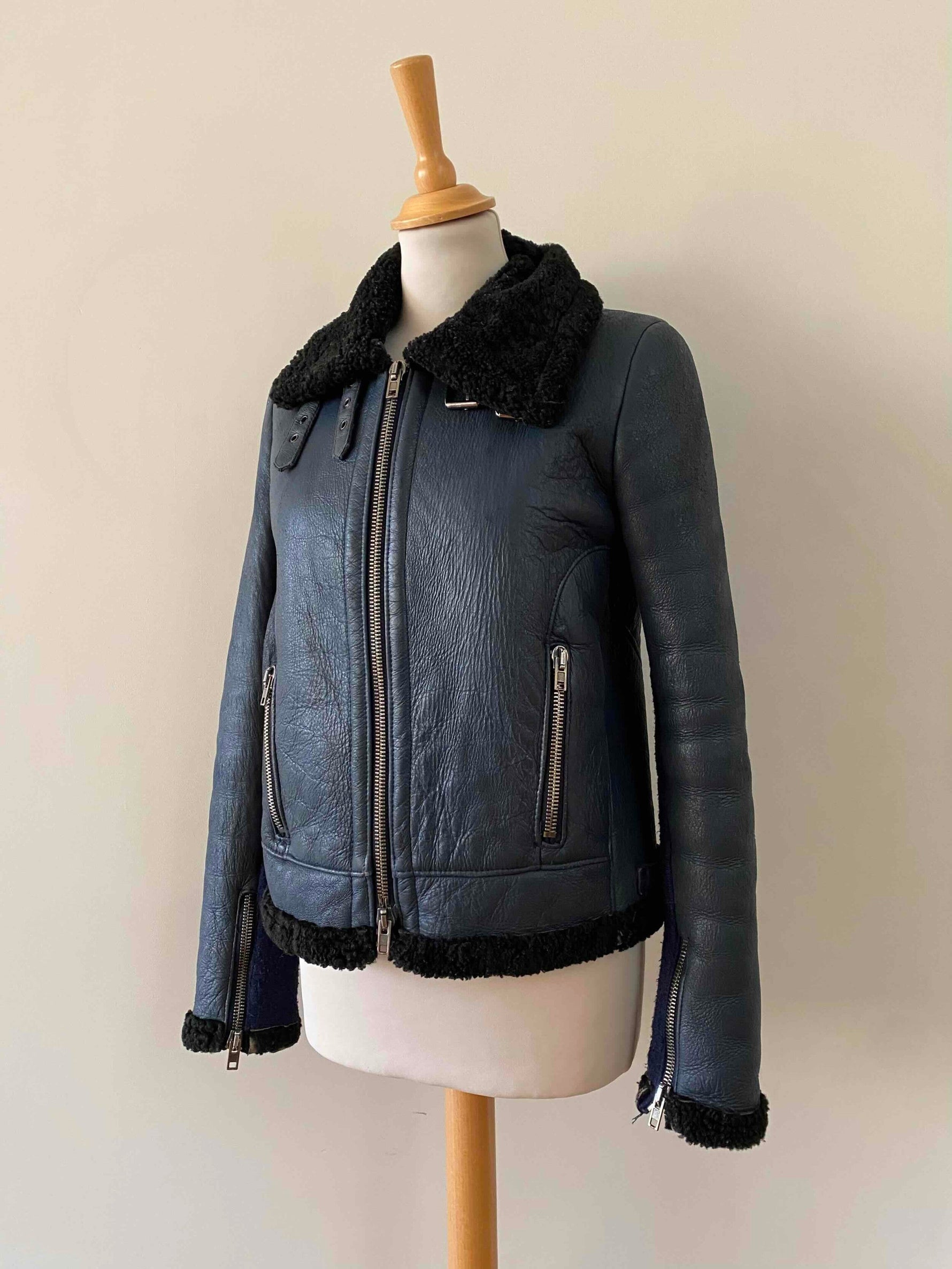 Prix unitaire parBombardier en peau lainée, en mouton retourné extérieur cuir bleu nuit, intérieur mouton noir, dessous des manches en laine peignée bleue nuit, détails de zip argentés, fabriqué en Italie, taille 36 porté ici sur un mannequin T36.