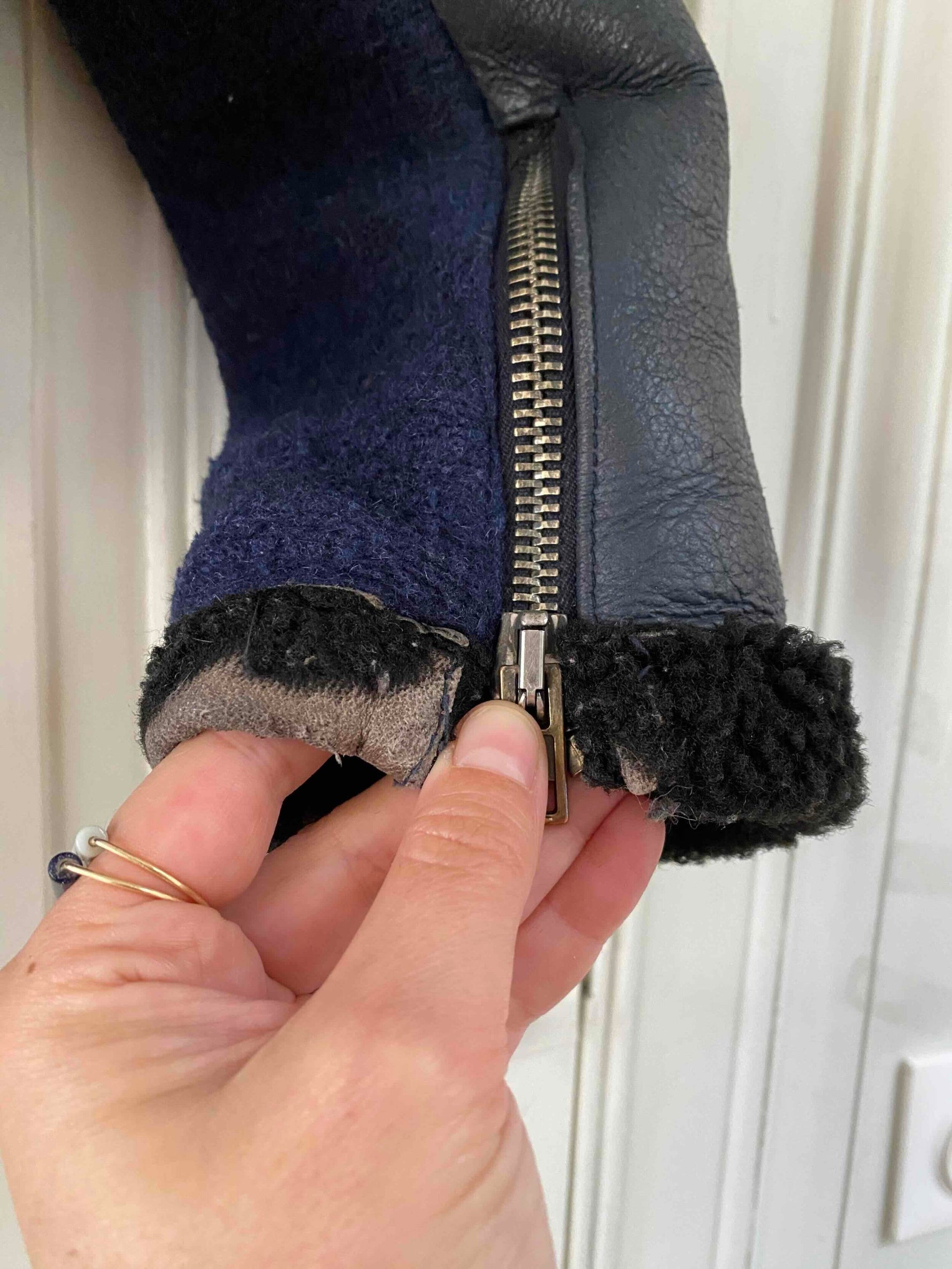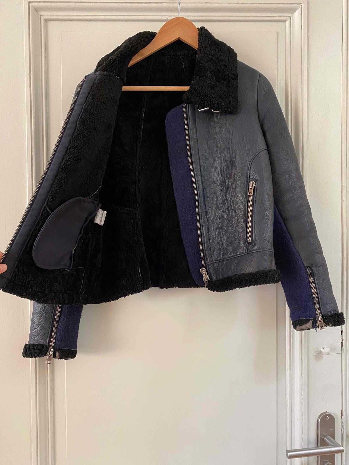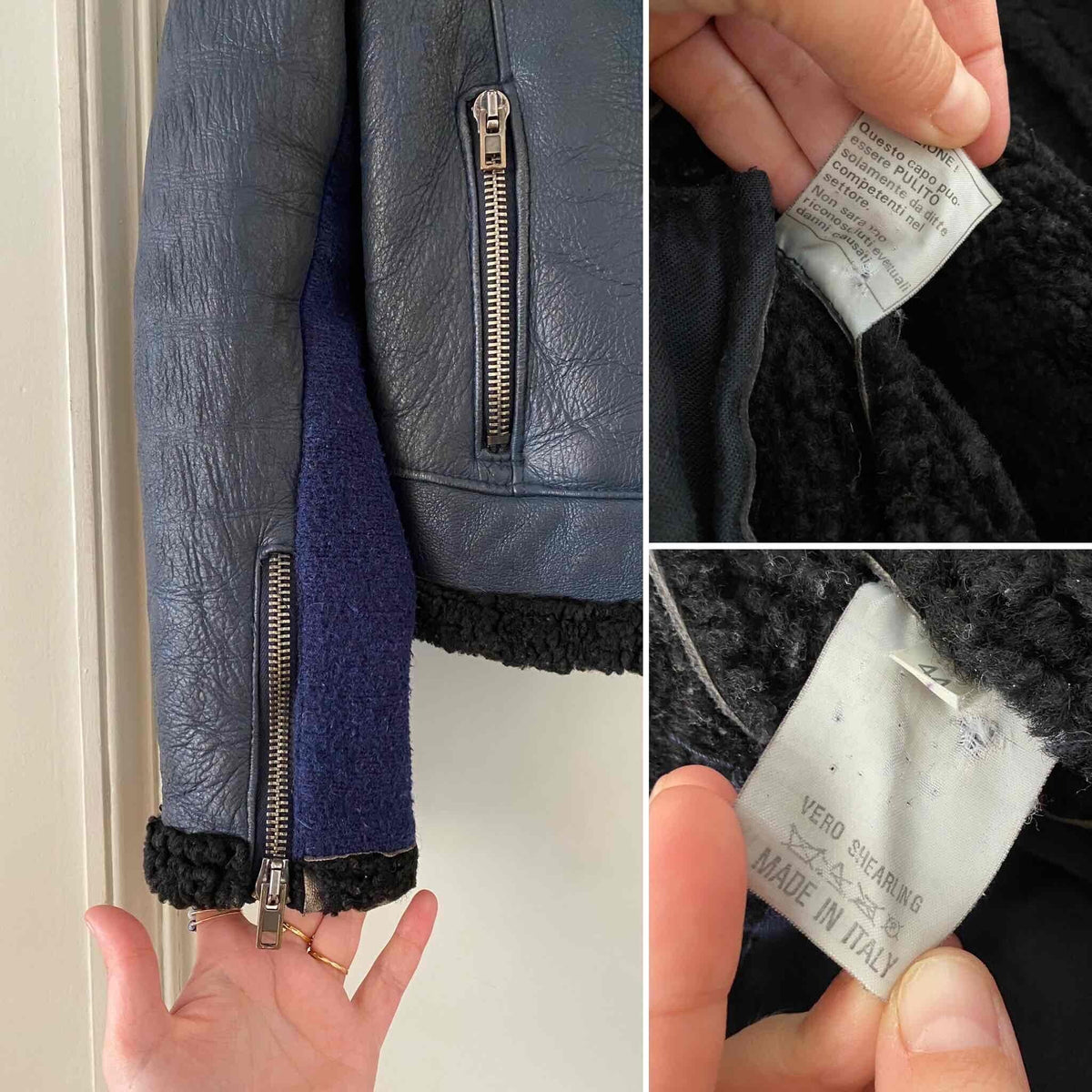 Prix unitaire parBombardier en peau lainée, en mouton retourné extérieur cuir bleu nuit, intérieur mouton noir, dessous des manches en laine peignée bleue nuit, détails de zip argentés, fabriqué en Italie, taille 36 porté ici sur un mannequin T36.