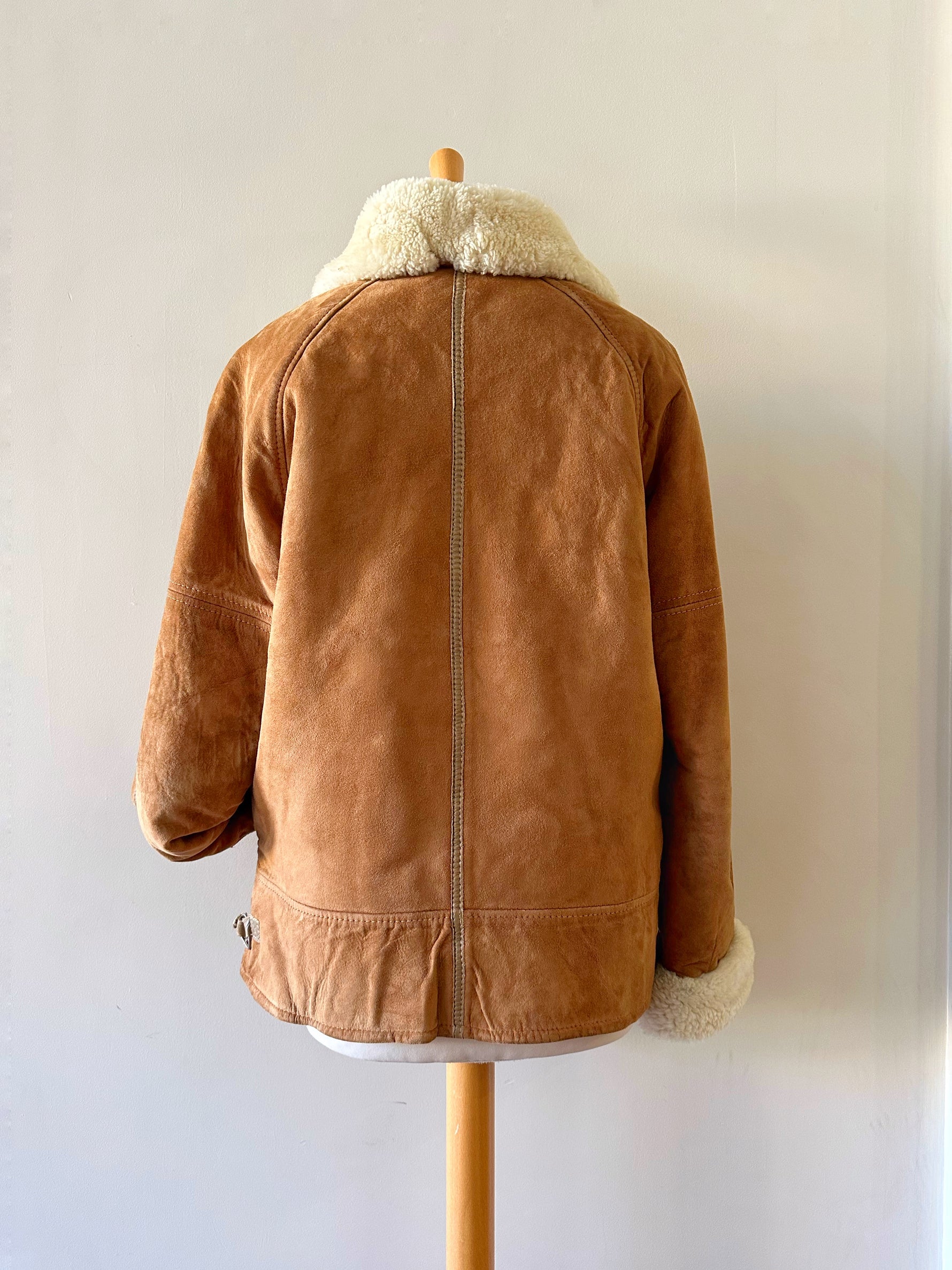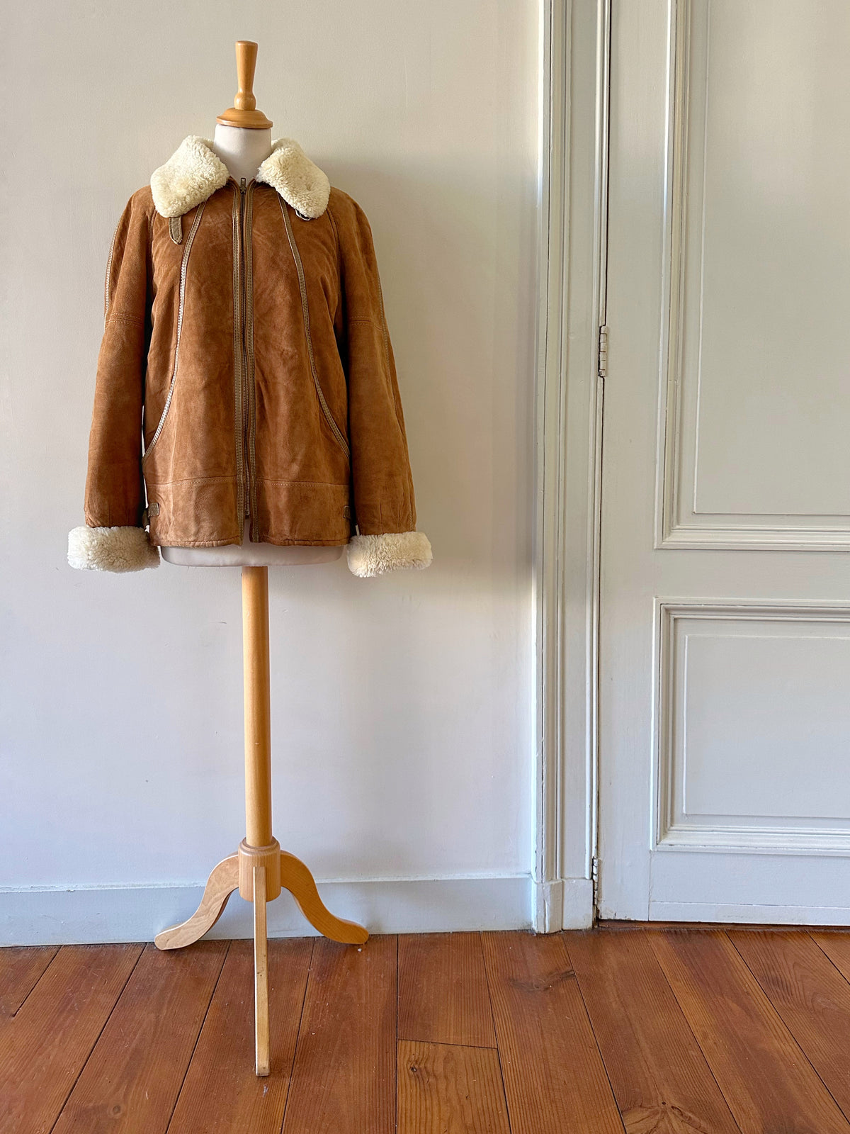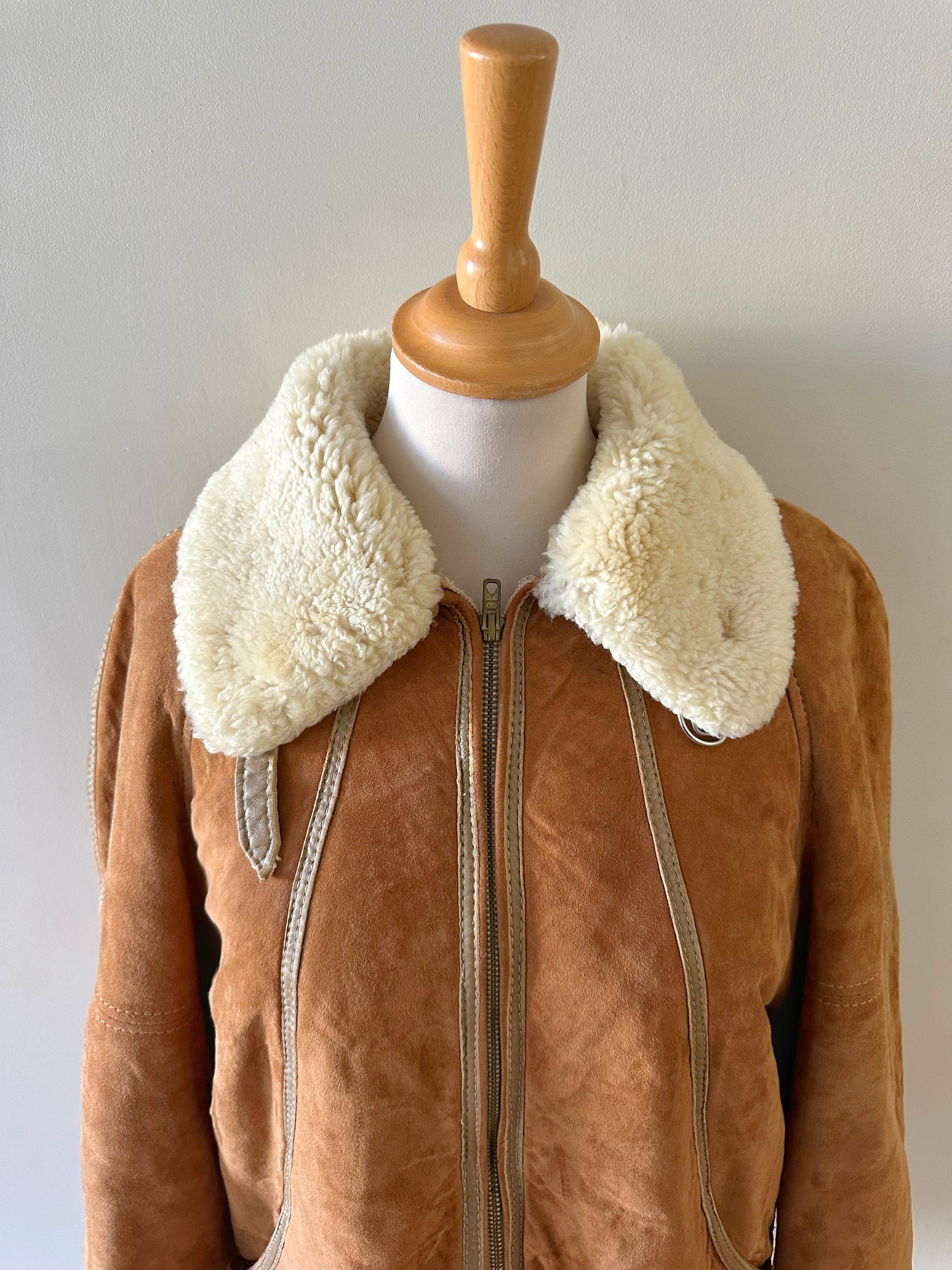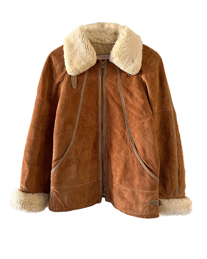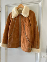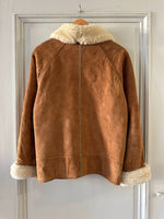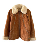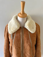 Bombardier Peau lainée en daim caramel ganses en cuir lisse camel, interieur fourré beige, col et poignets en laine de mouton, fermeture éclair, Galerie Lafayette fabriqué en France dans les années 80s. Taille 36 porté ici sur un mannequin T36 et ouvert sur une personne T40. Aisselles 48cm Longueur 62cm.