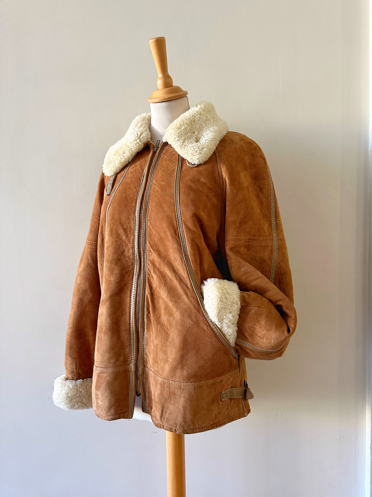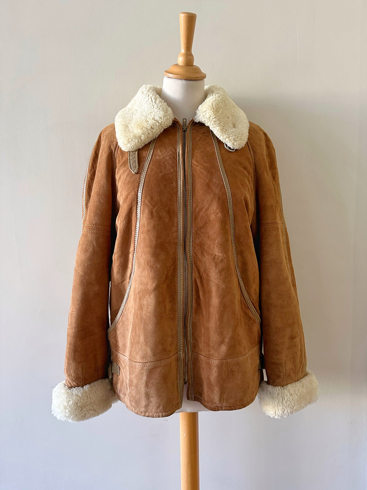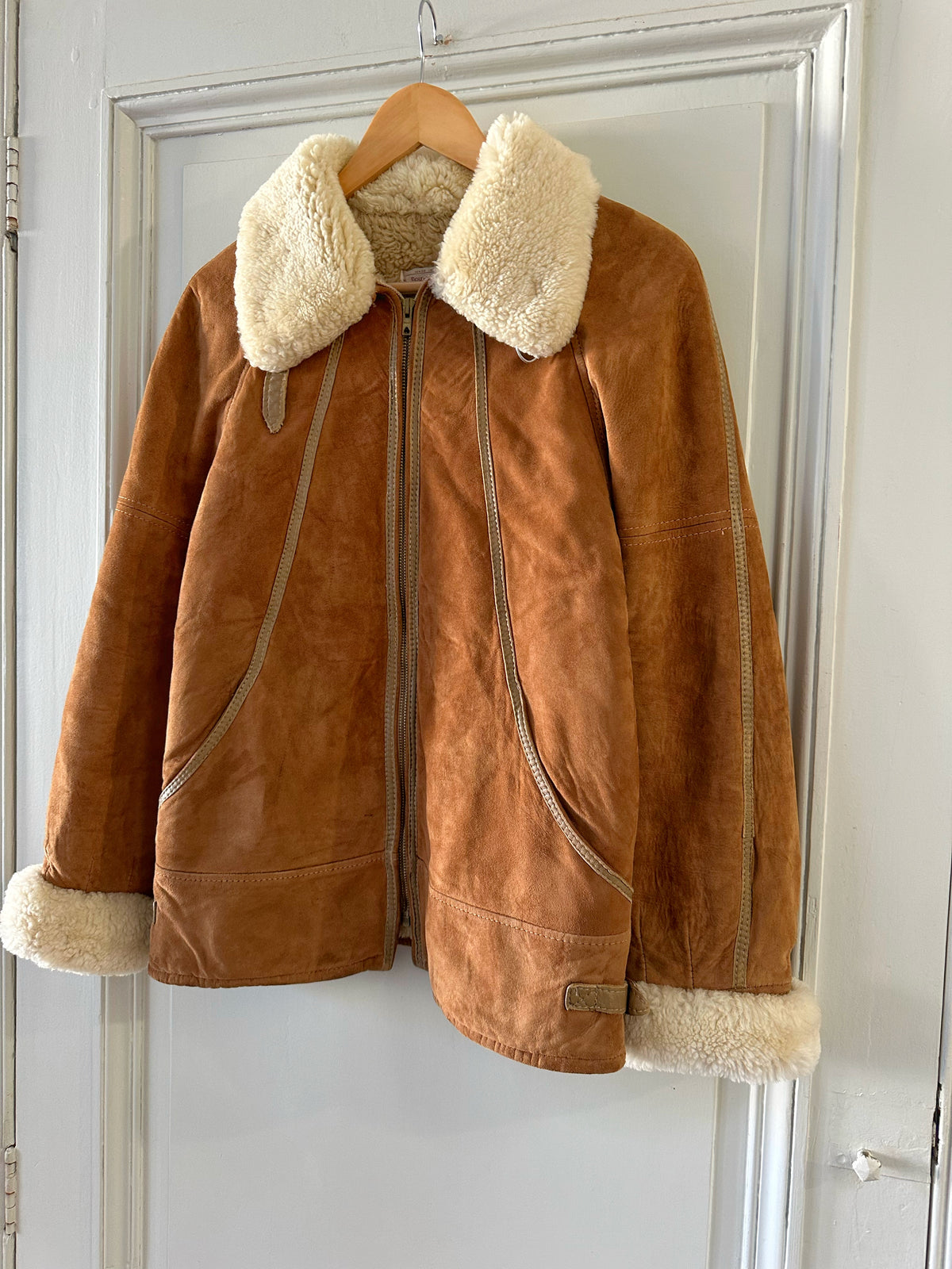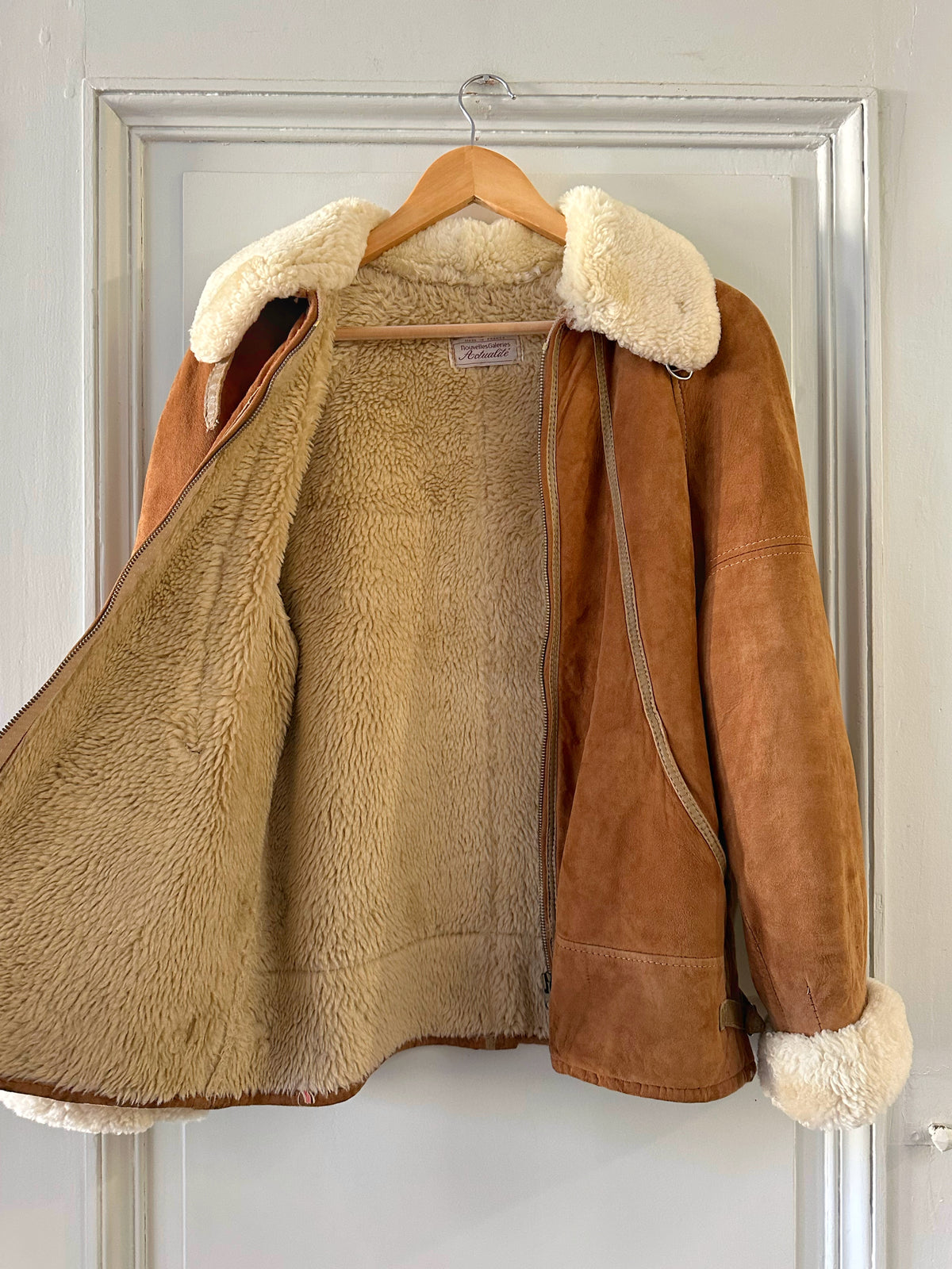Bombardier Peau lainée en daim caramel ganses en cuir lisse camel, interieur fourré beige, col et poignets en laine de mouton, fermeture éclair, Galerie Lafayette fabriqué en France dans les années 80s. Taille 36 porté ici sur un mannequin T36 et ouvert sur une personne T40. Aisselles 48cm Longueur 62cm.