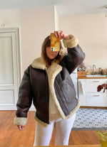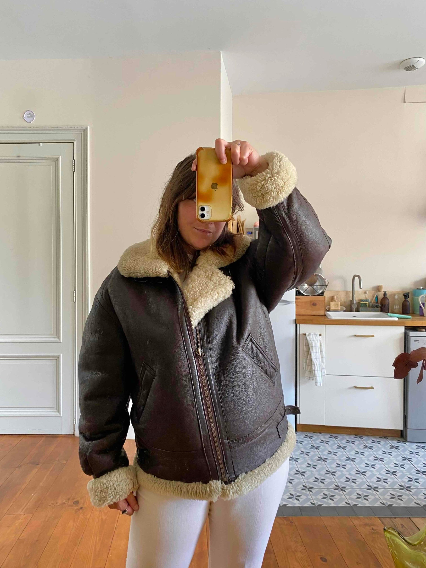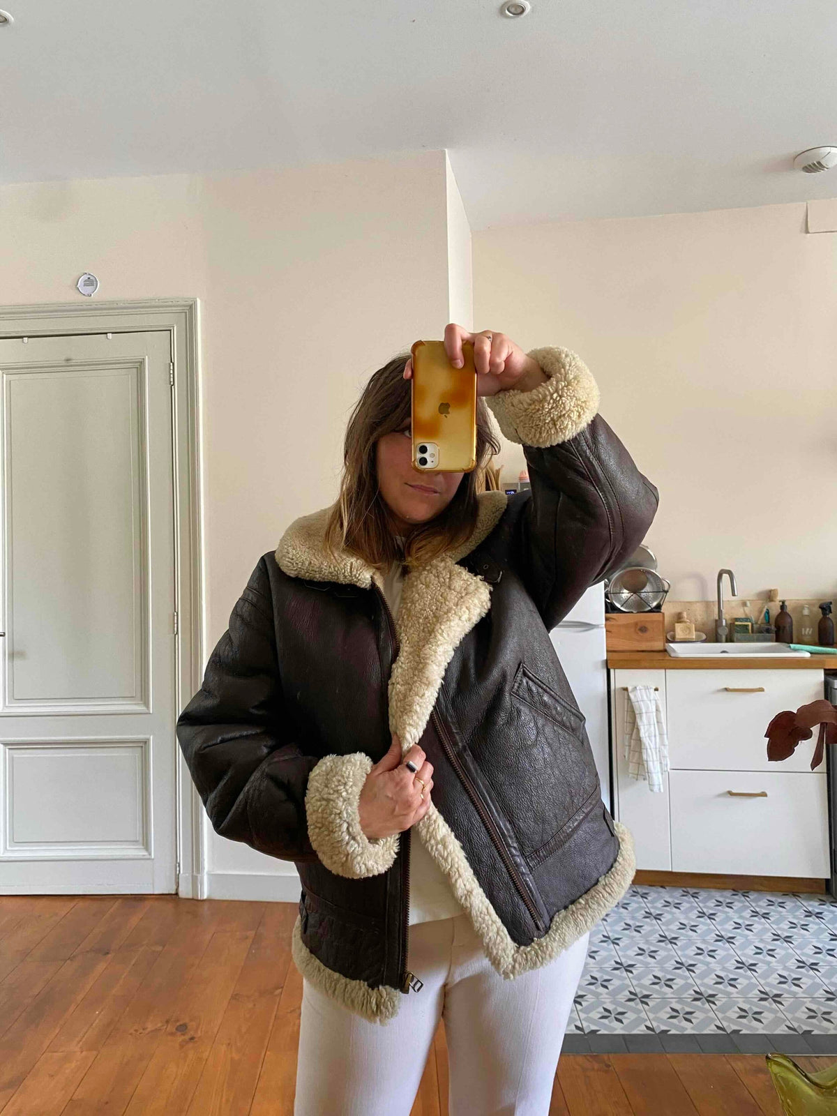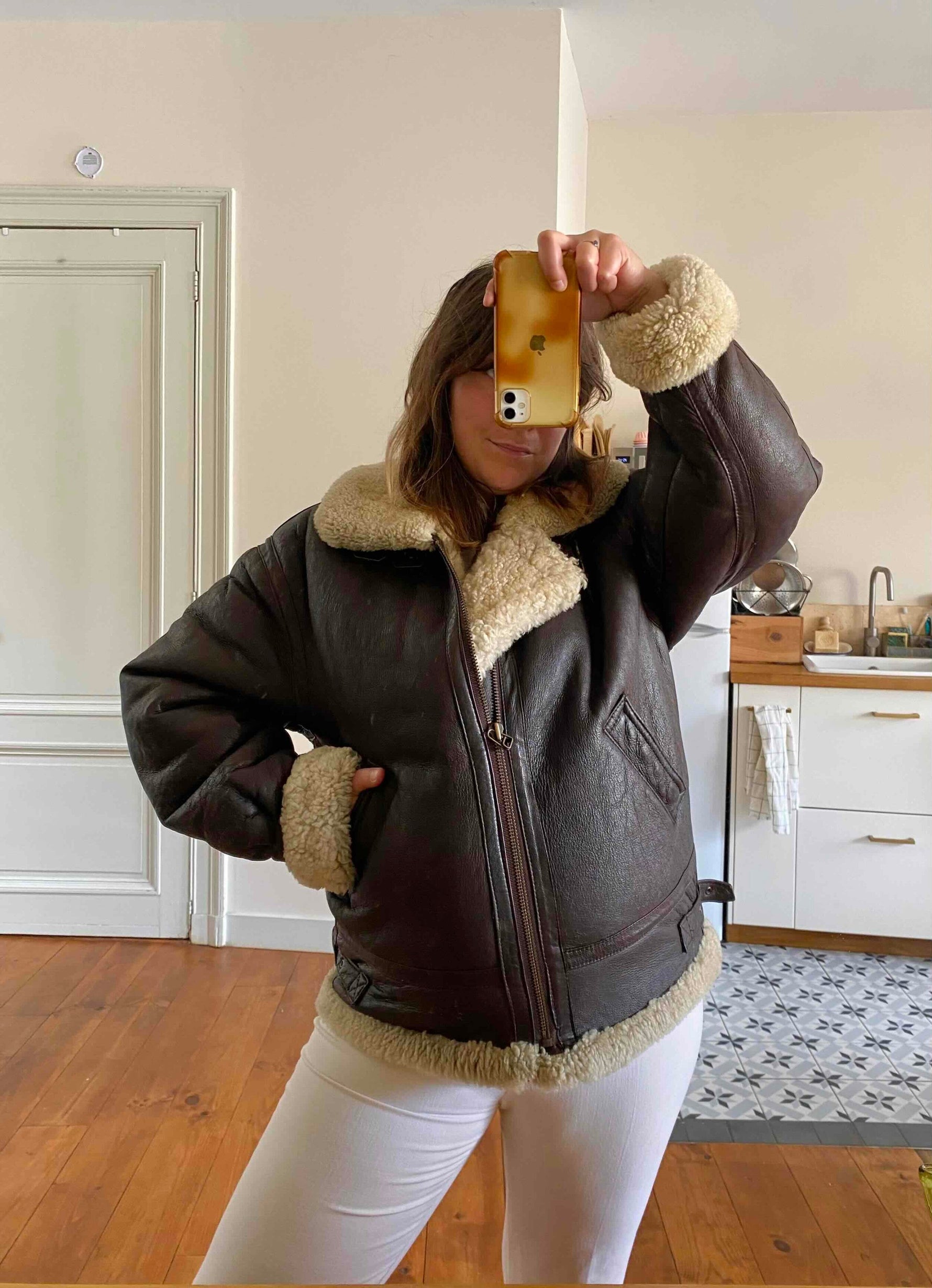 Prix unitaire parBombardier peau lainée en mouton retourné extérieur cuir chocolat, intérieur mouton écru, sangles de serrages à boucles, type B3, taille 40 porté ici sur une personne T40.