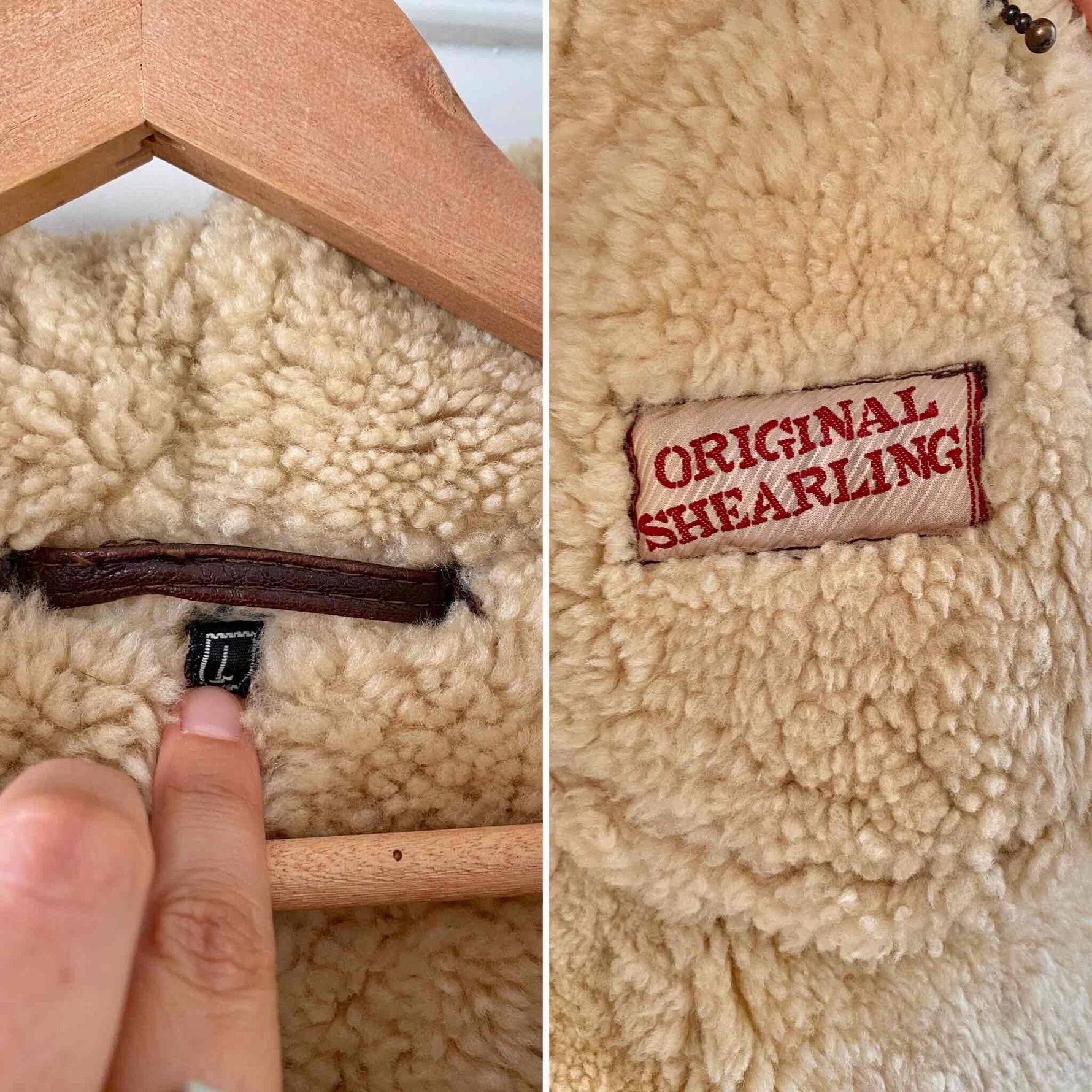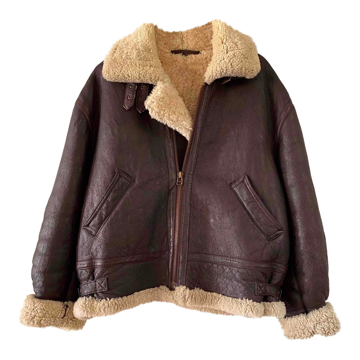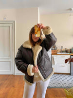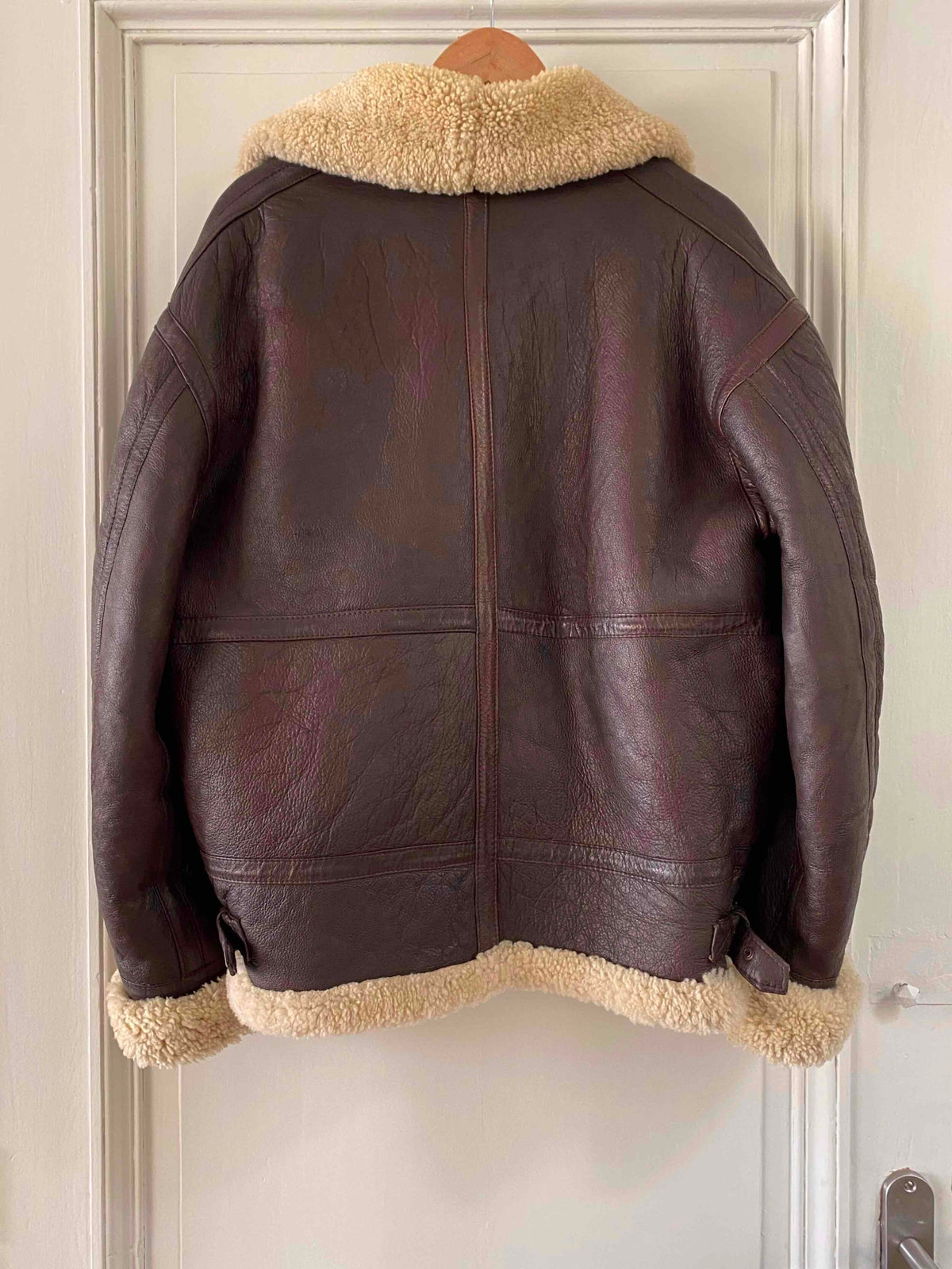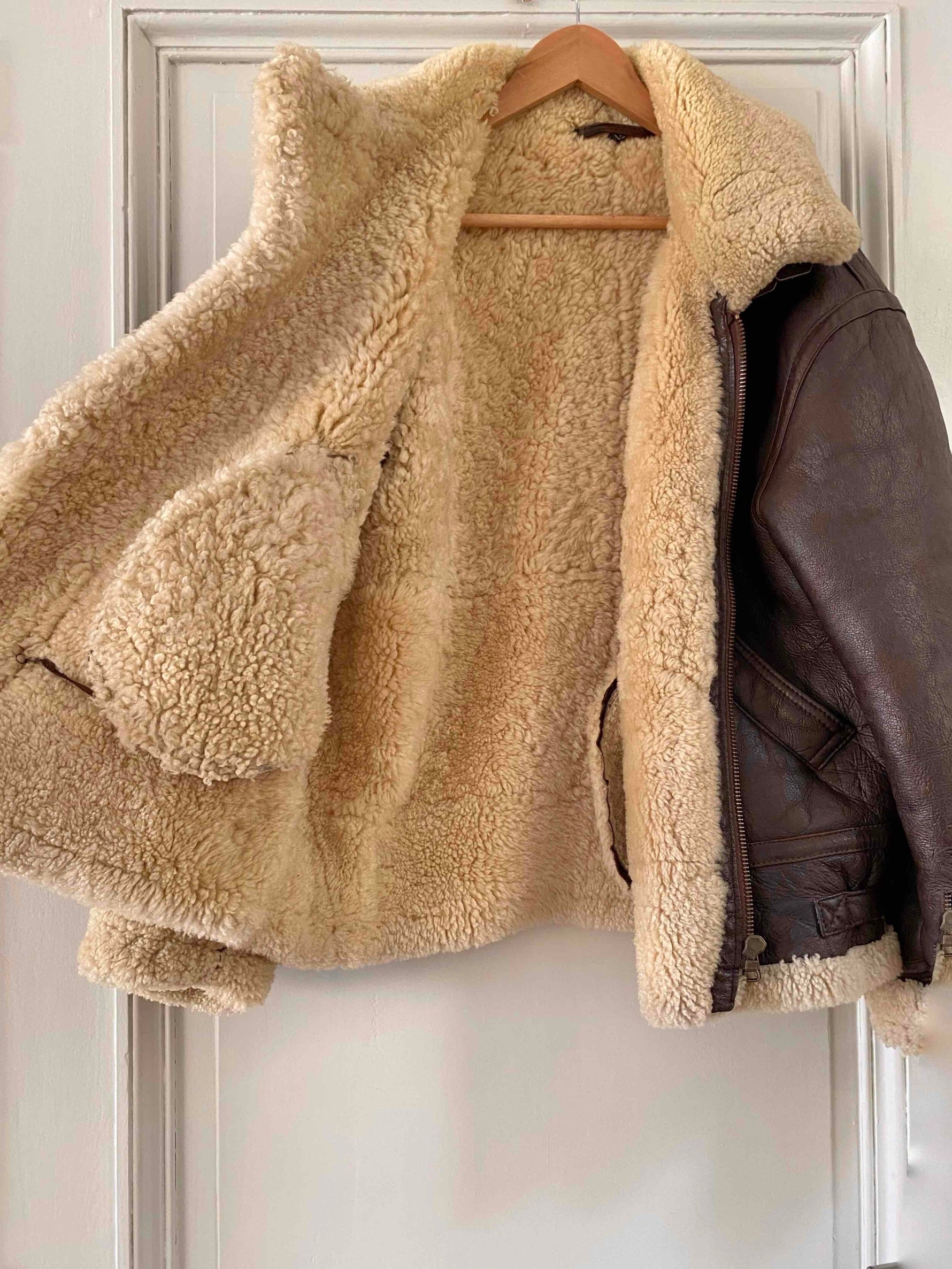 Prix unitaire parBombardier peau lainée en mouton retourné extérieur cuir chocolat, intérieur mouton écru, sangles de serrages à boucles, type B3, taille 40 porté ici sur une personne T40.