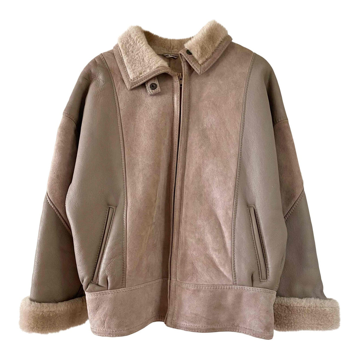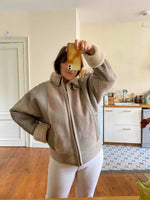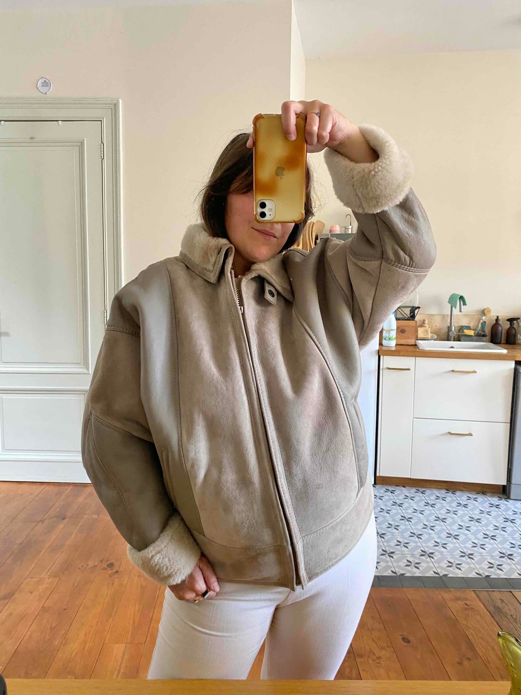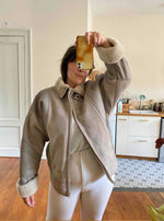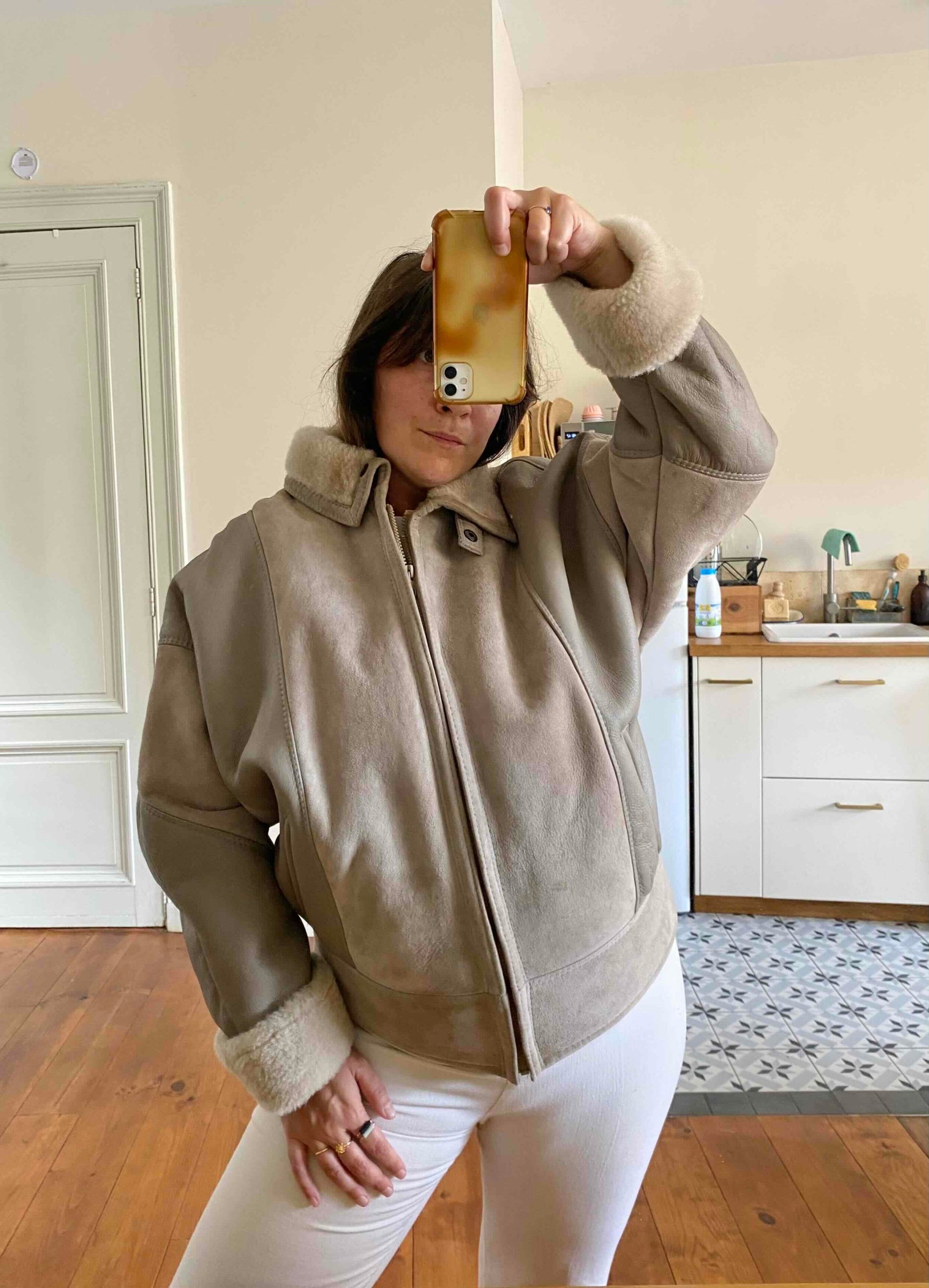 Prix unitaire parBombardier peau lainée en mouton retourné extérieur cuir et daim en patch beige grisé taupe, intérieur mouton beige, forme blouson, manches chauve-souris, fermeture éclaire, fabriqué en France, taille 38 porté ici serré sur une personne T40.