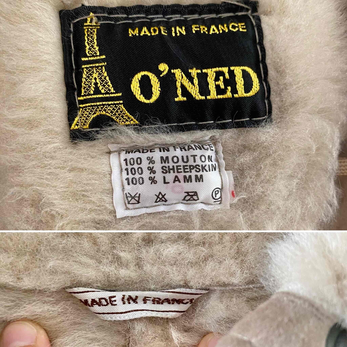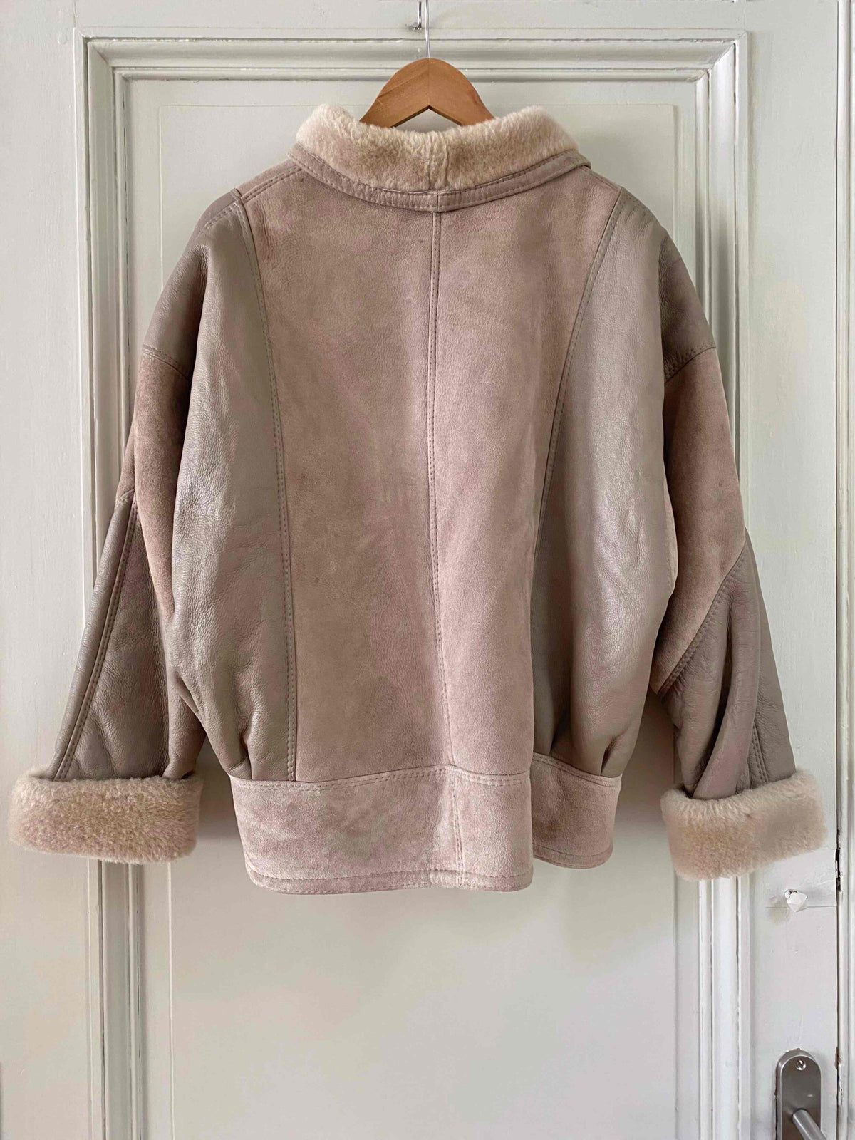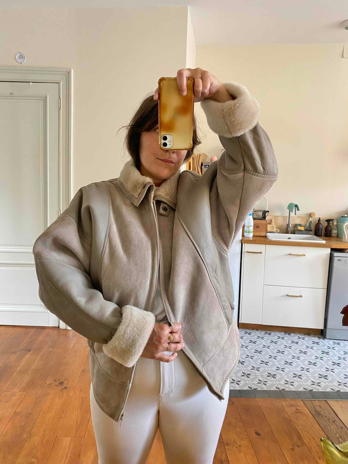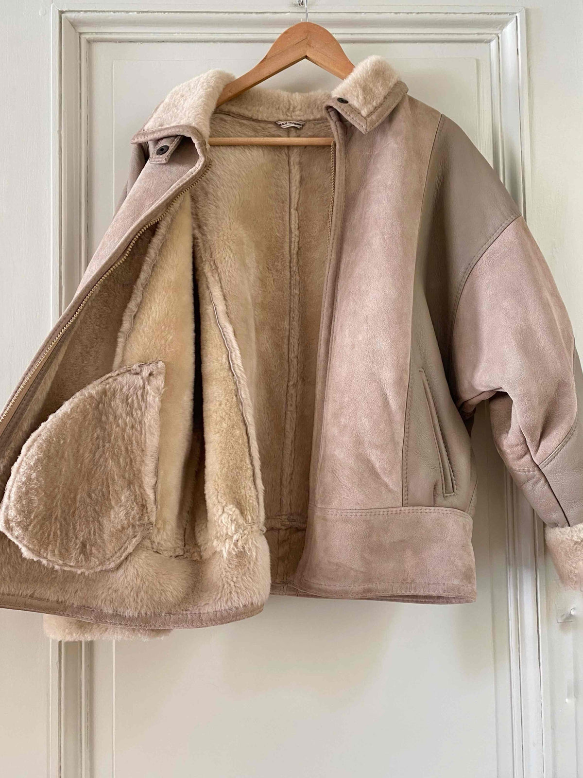 Prix unitaire parBombardier peau lainée en mouton retourné extérieur cuir et daim en patch beige grisé taupe, intérieur mouton beige, forme blouson, manches chauve-souris, fermeture éclaire, fabriqué en France, taille 38 porté ici serré sur une personne T40.