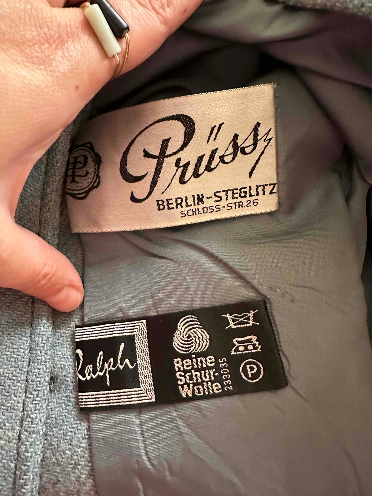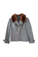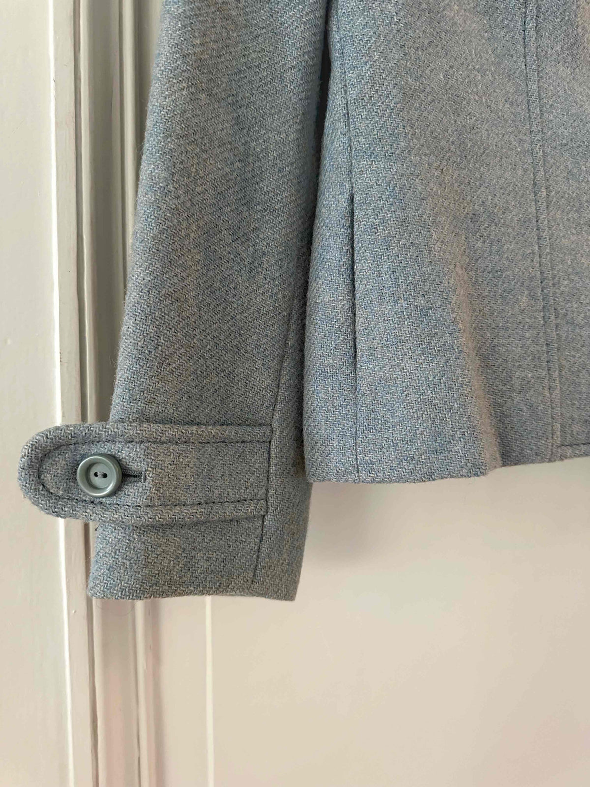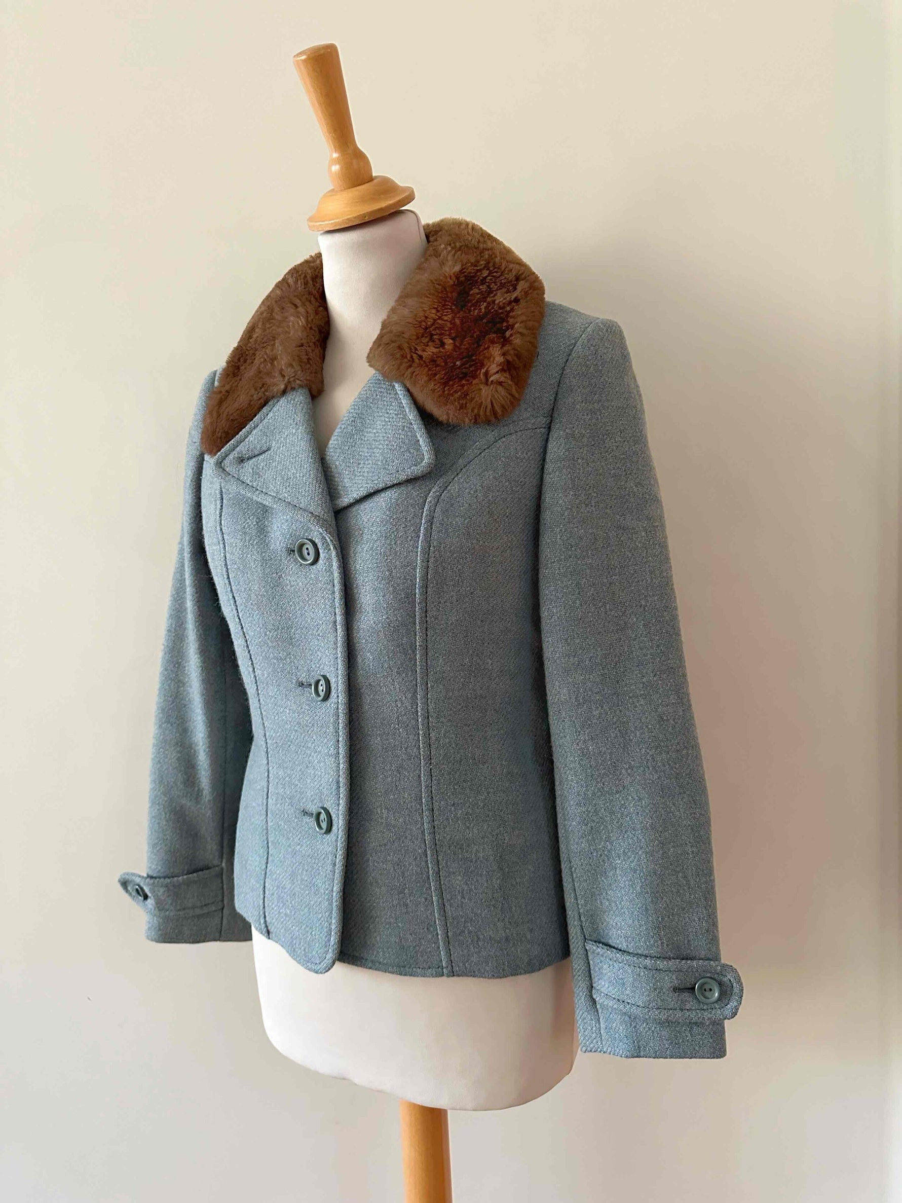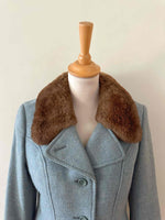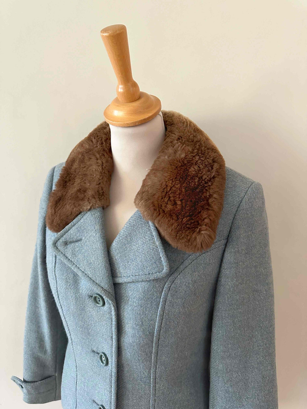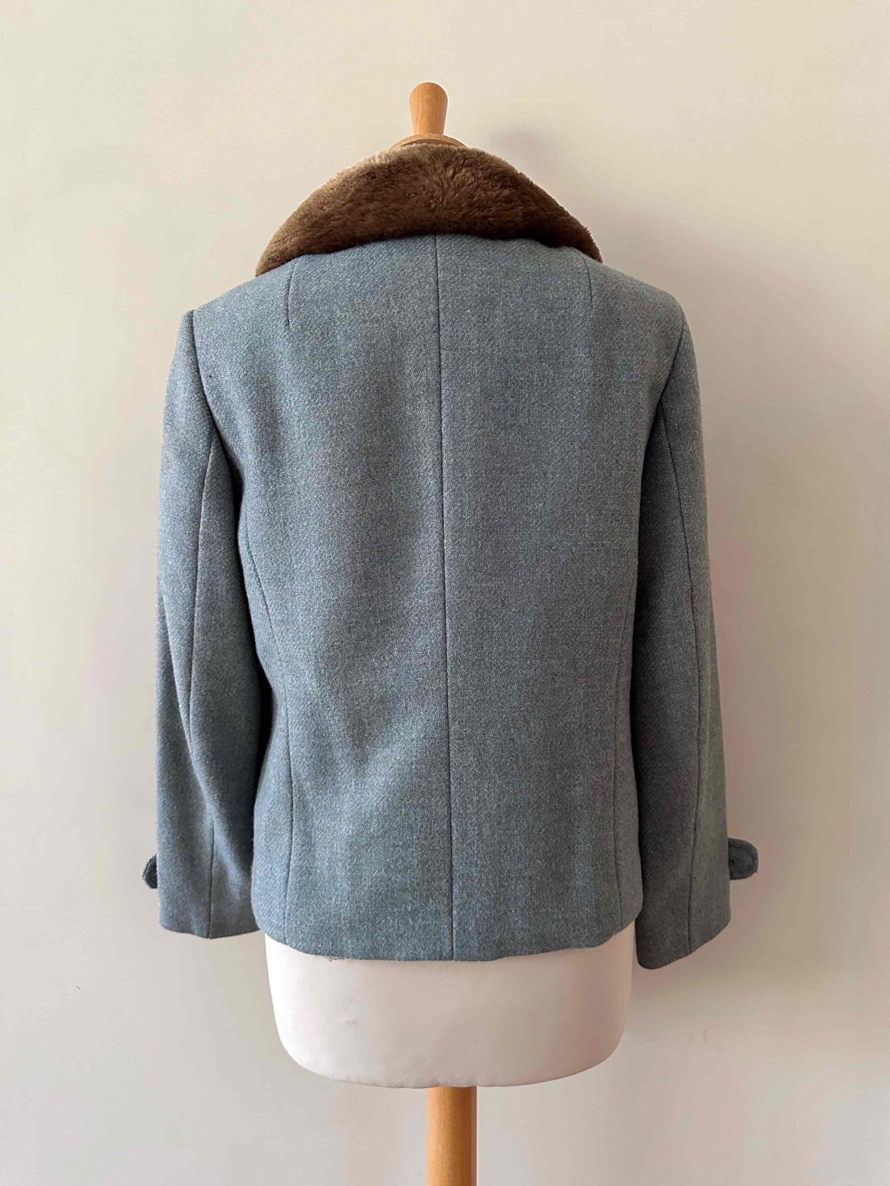 Prix unitaire parCaban en laine bleu ciel chinée, col en fourrure caramel, courte façon spencer, fabriquée en Allemagne, années 70s, convient aux tailles 34 et 36 porté ici sur un mannequin T36.