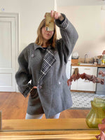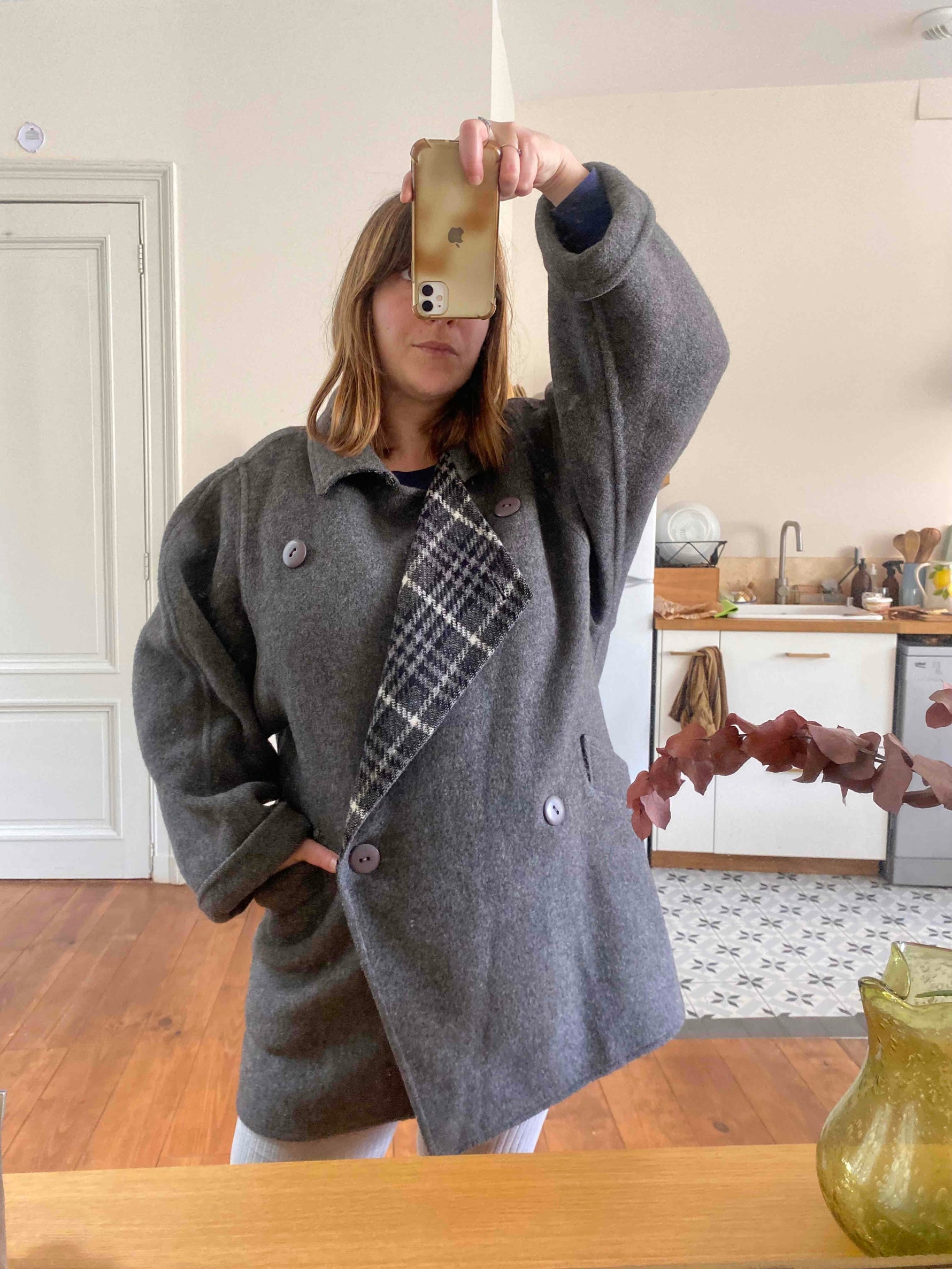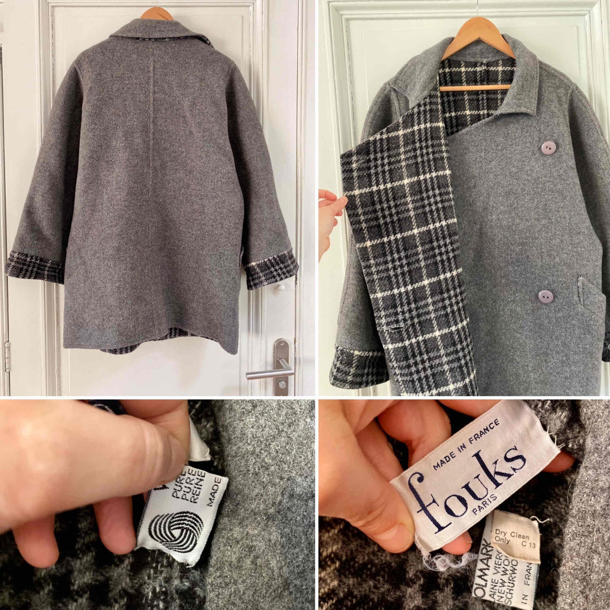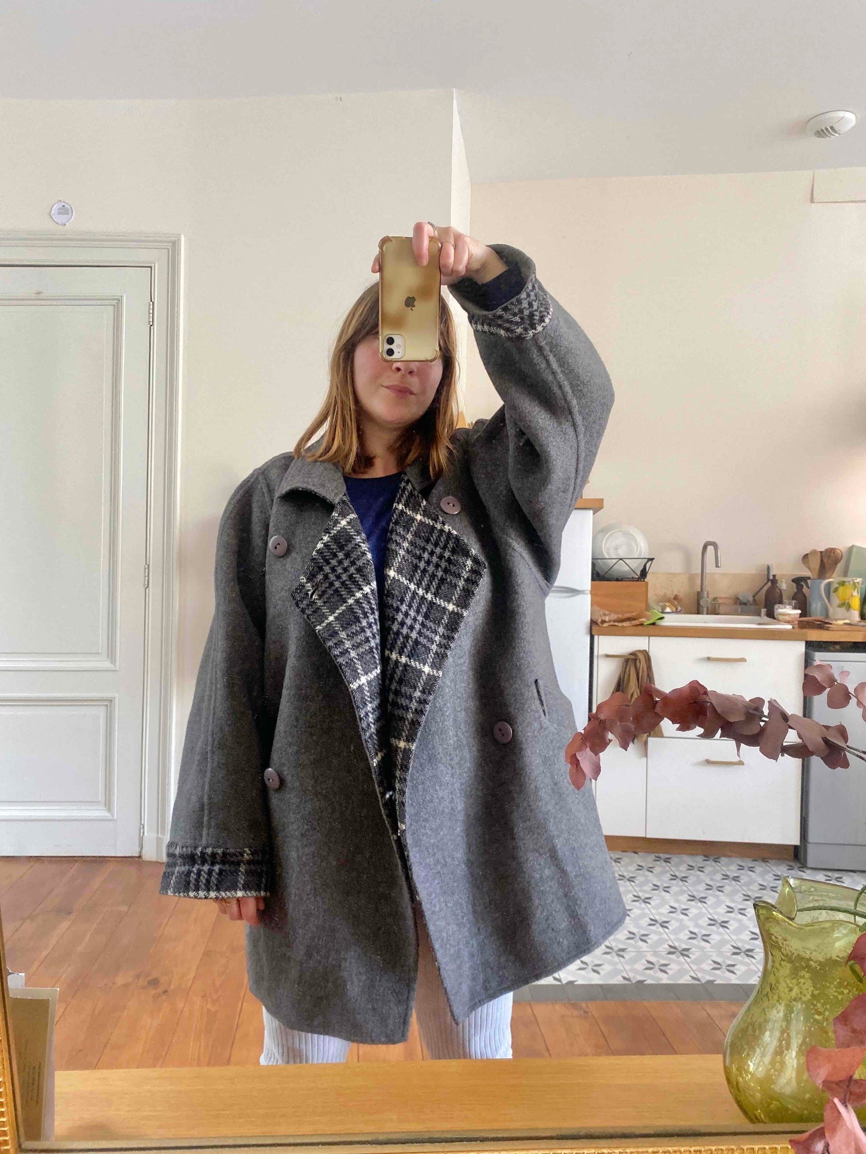 Prix unitaire parCaban en laine gris chiné anthracite et doublure à carreaux Prince de Galles, boutonnage croisé, forme ovoïde, Fouks Paris, fabriqué en France, taille 40/42 porté ici sur une personne T40.
