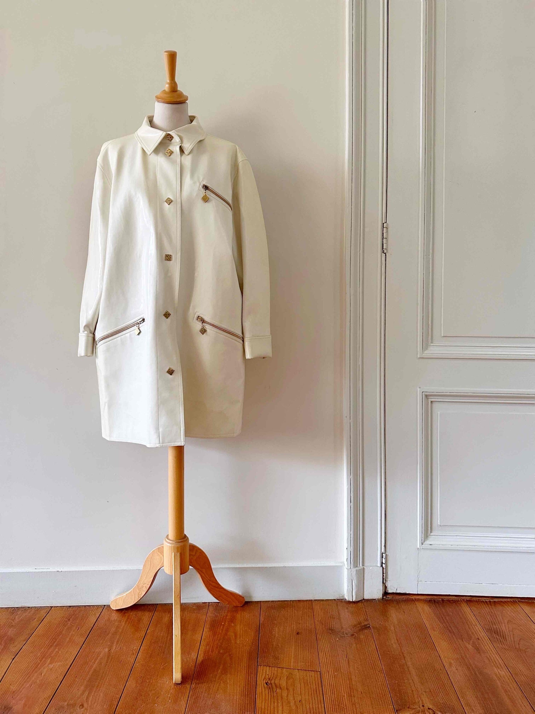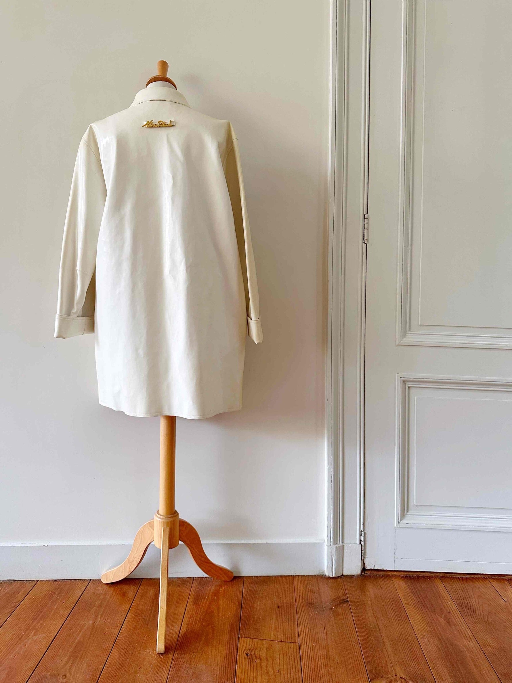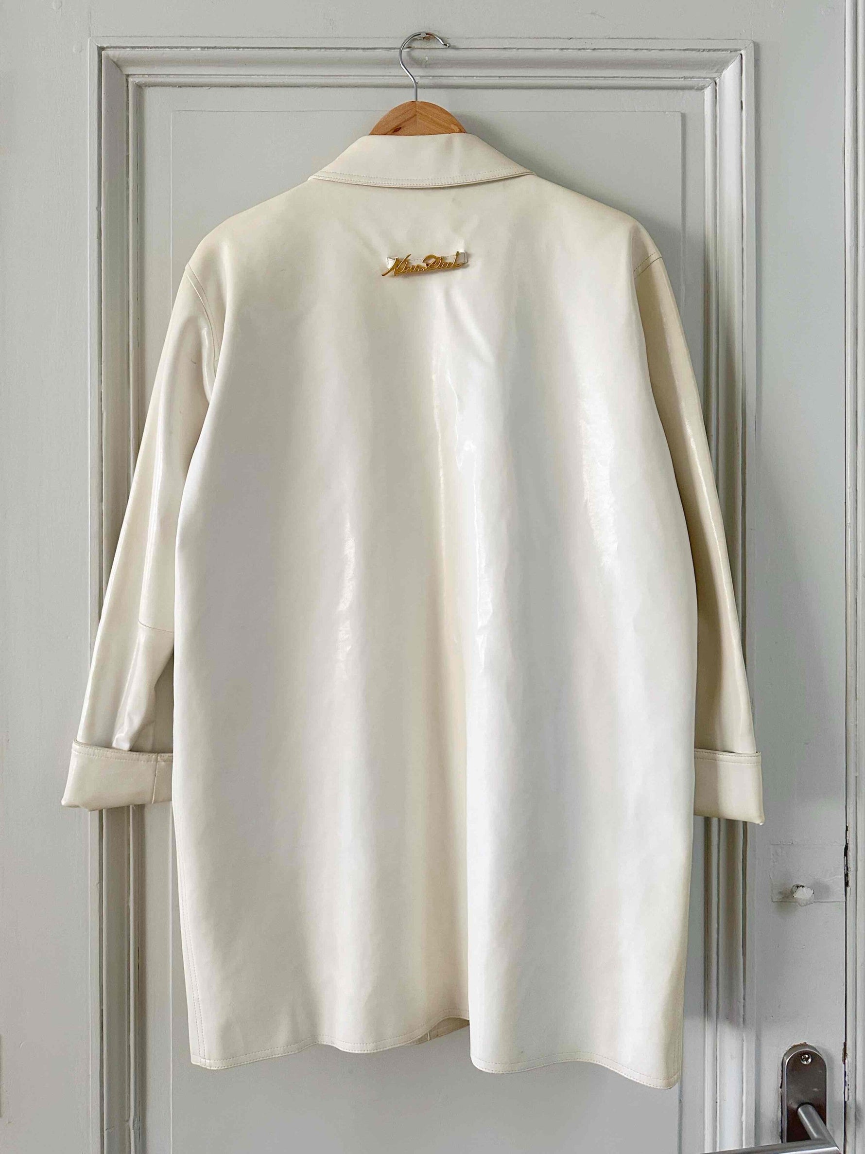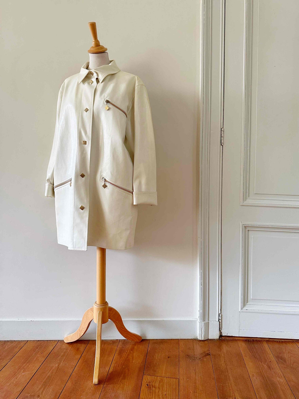 Prix unitaire parCiré Nina Ricci, en toile ciré blanc crème, boutons pressions dorés gravés et monogrammés, forme droite, doublure monogramme, fabriqué en France, convient aux tailles 36 et 38 porté ici sur un mannequin T36 et ouvert sur une personne T40.