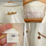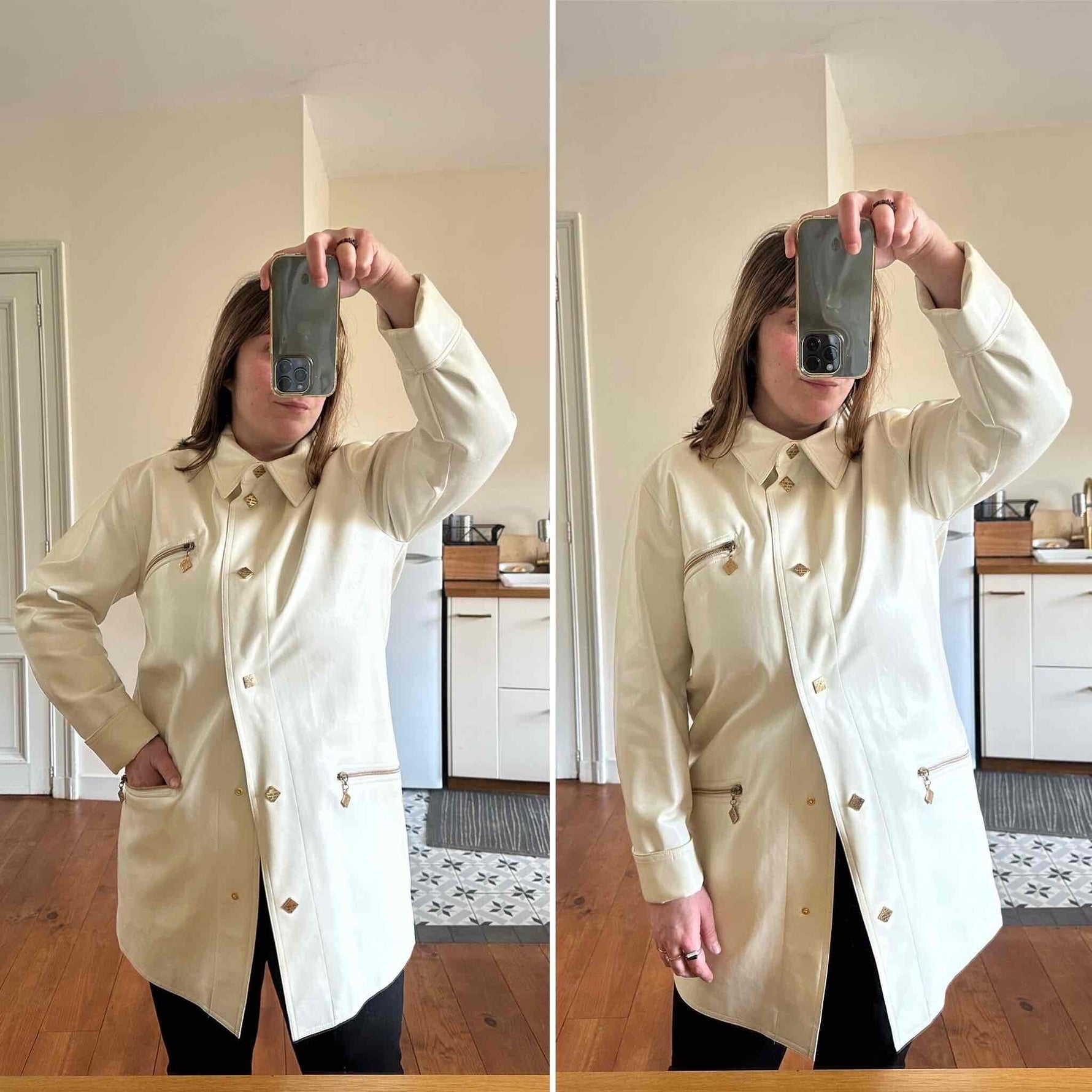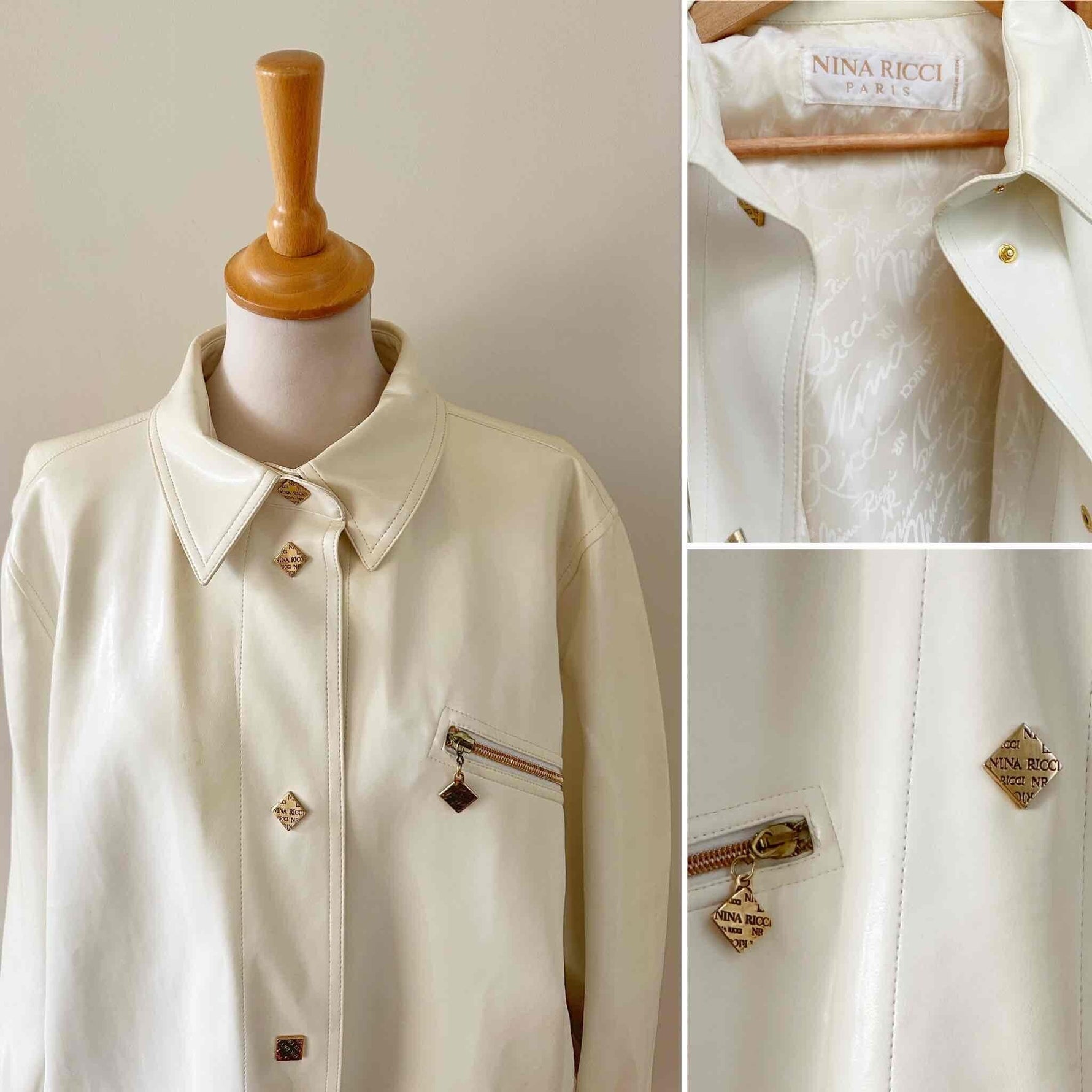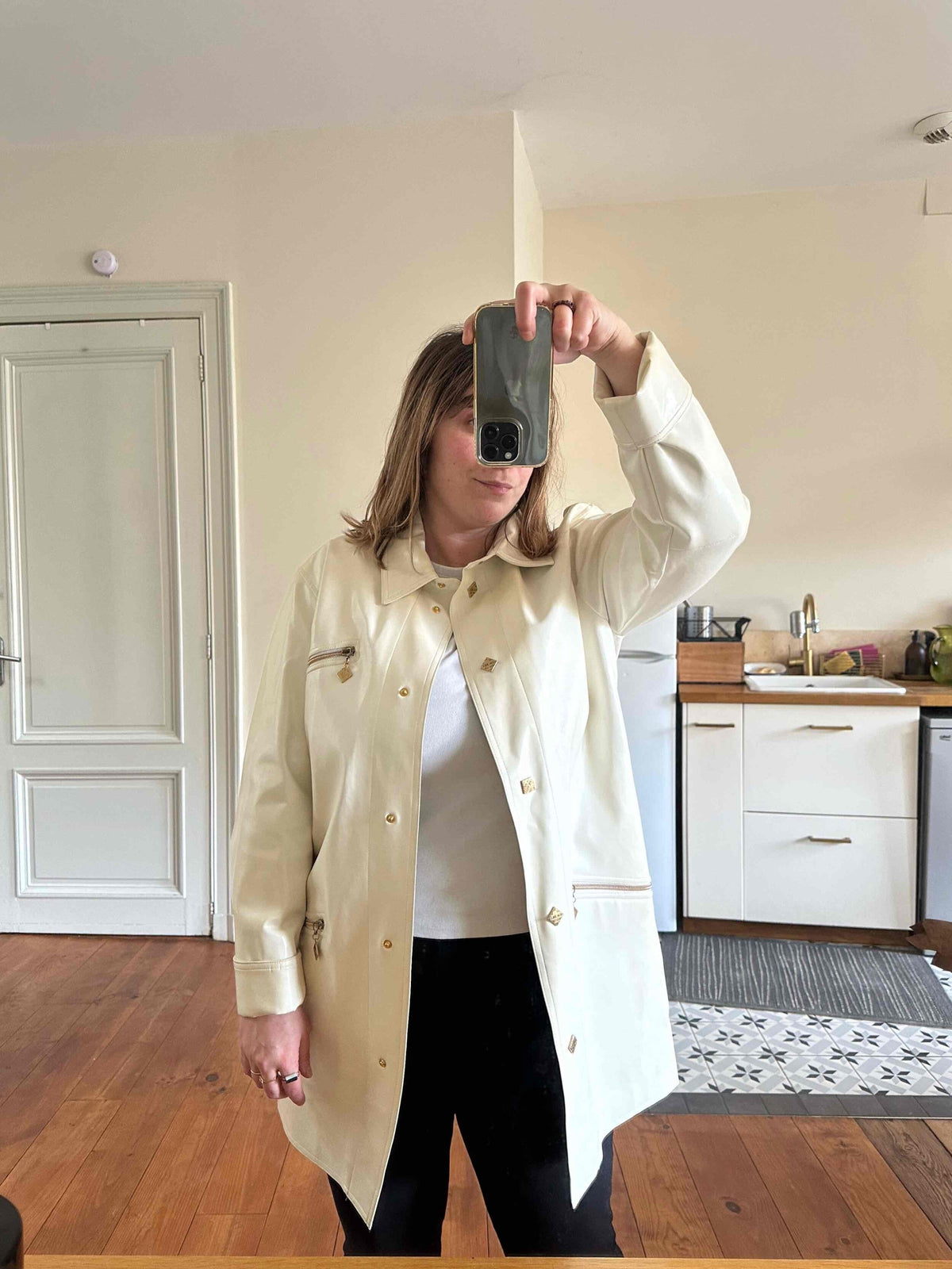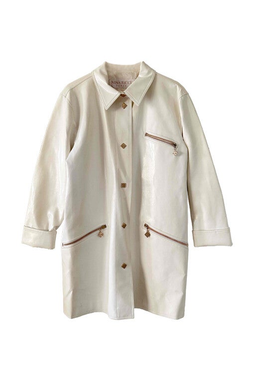 Prix unitaire parCiré Nina Ricci, en toile ciré blanc crème, boutons pressions dorés gravés et monogrammés, forme droite, doublure monogramme, fabriqué en France, convient aux tailles 36 et 38 porté ici sur un mannequin T36 et ouvert sur une personne T40.
