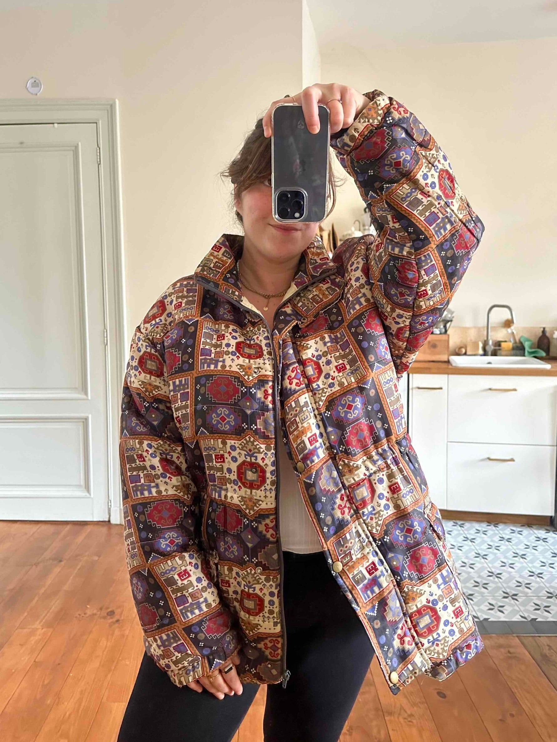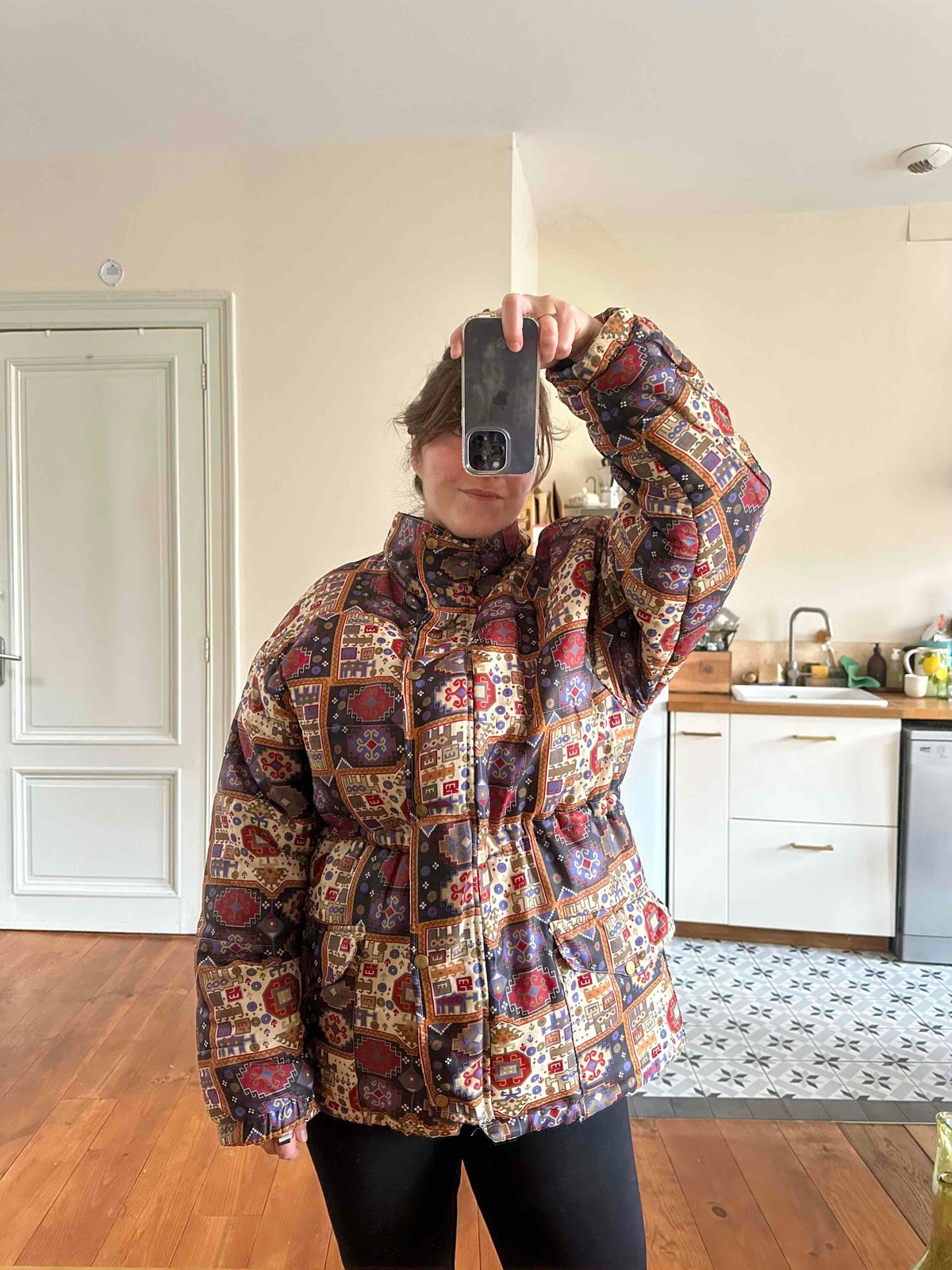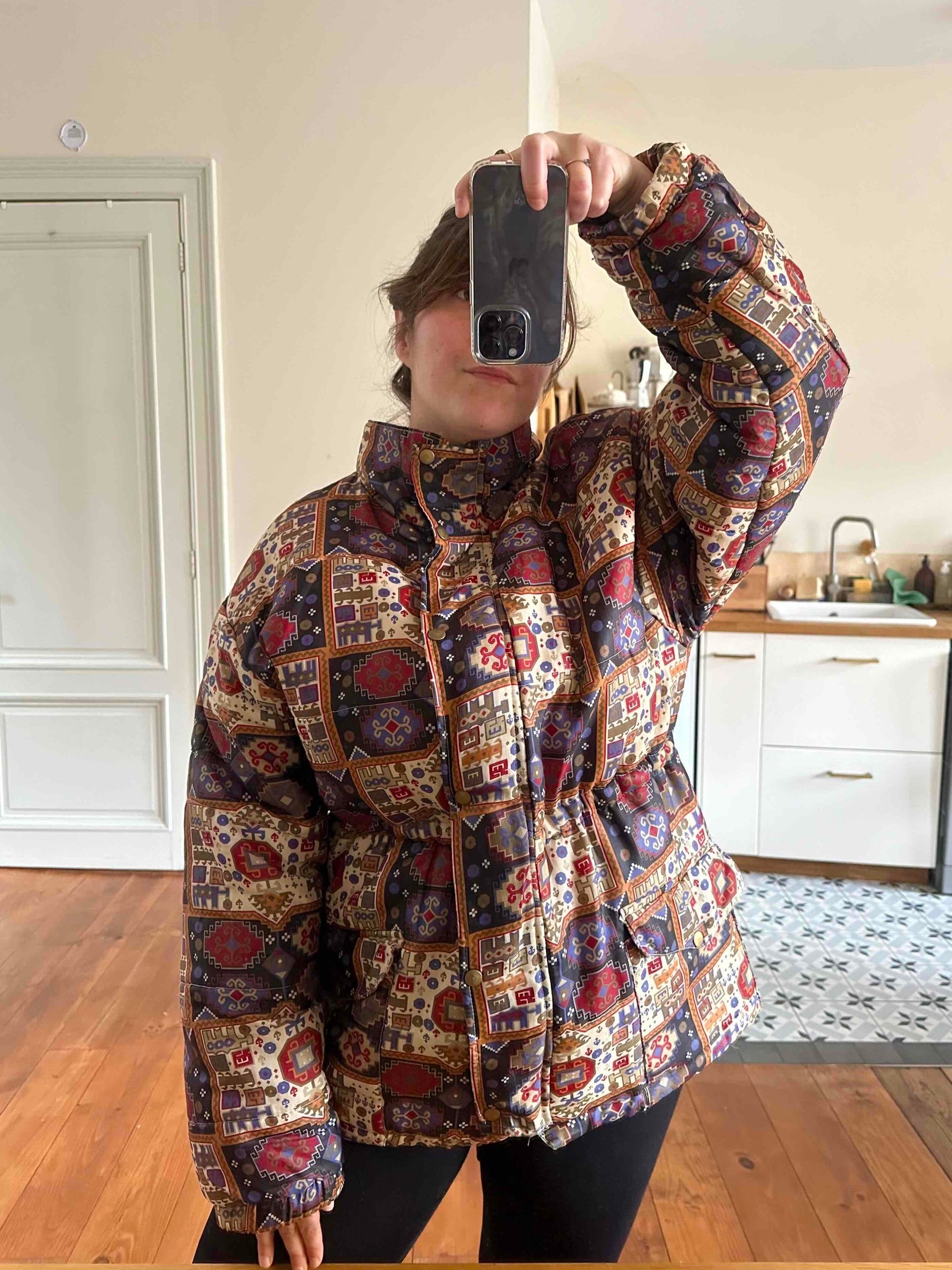 Prix unitaire parDoudoune à motifs patchworks, taille à froncer interieure, capuche intégrée à rentrer dans une pochette interieure, fabriquée en France, taille 38 et 40 portée ici sur une personne T40.