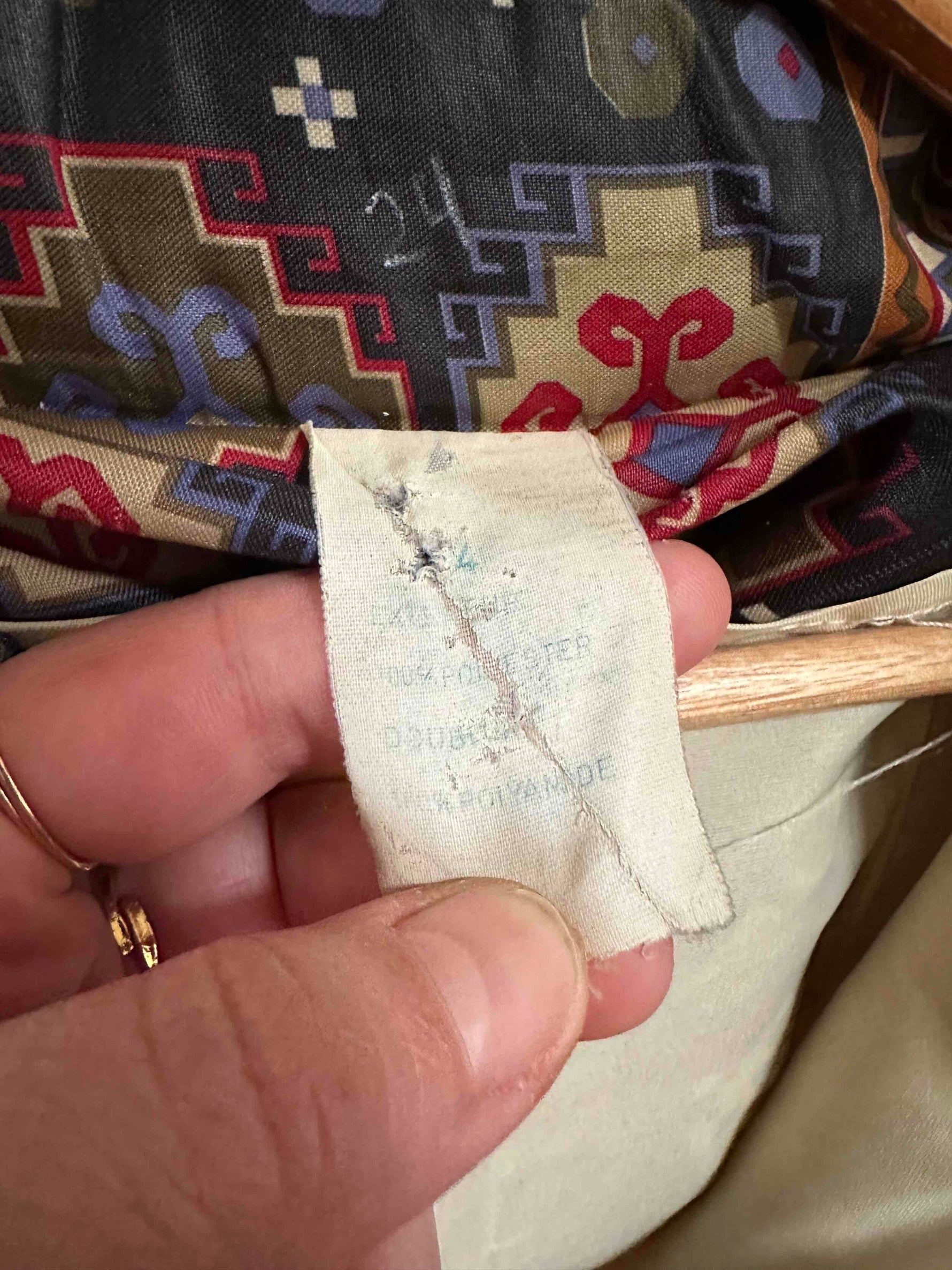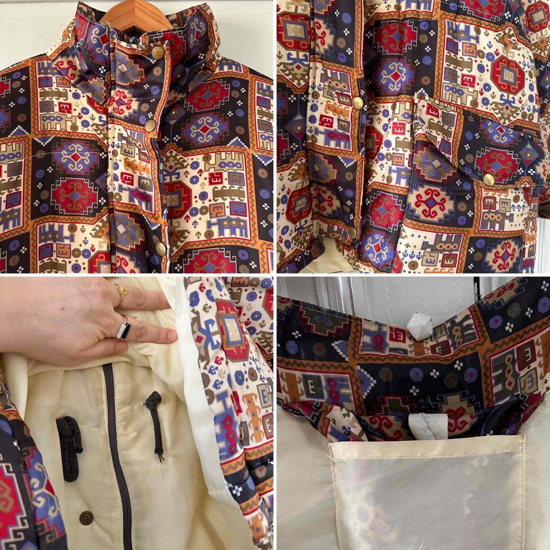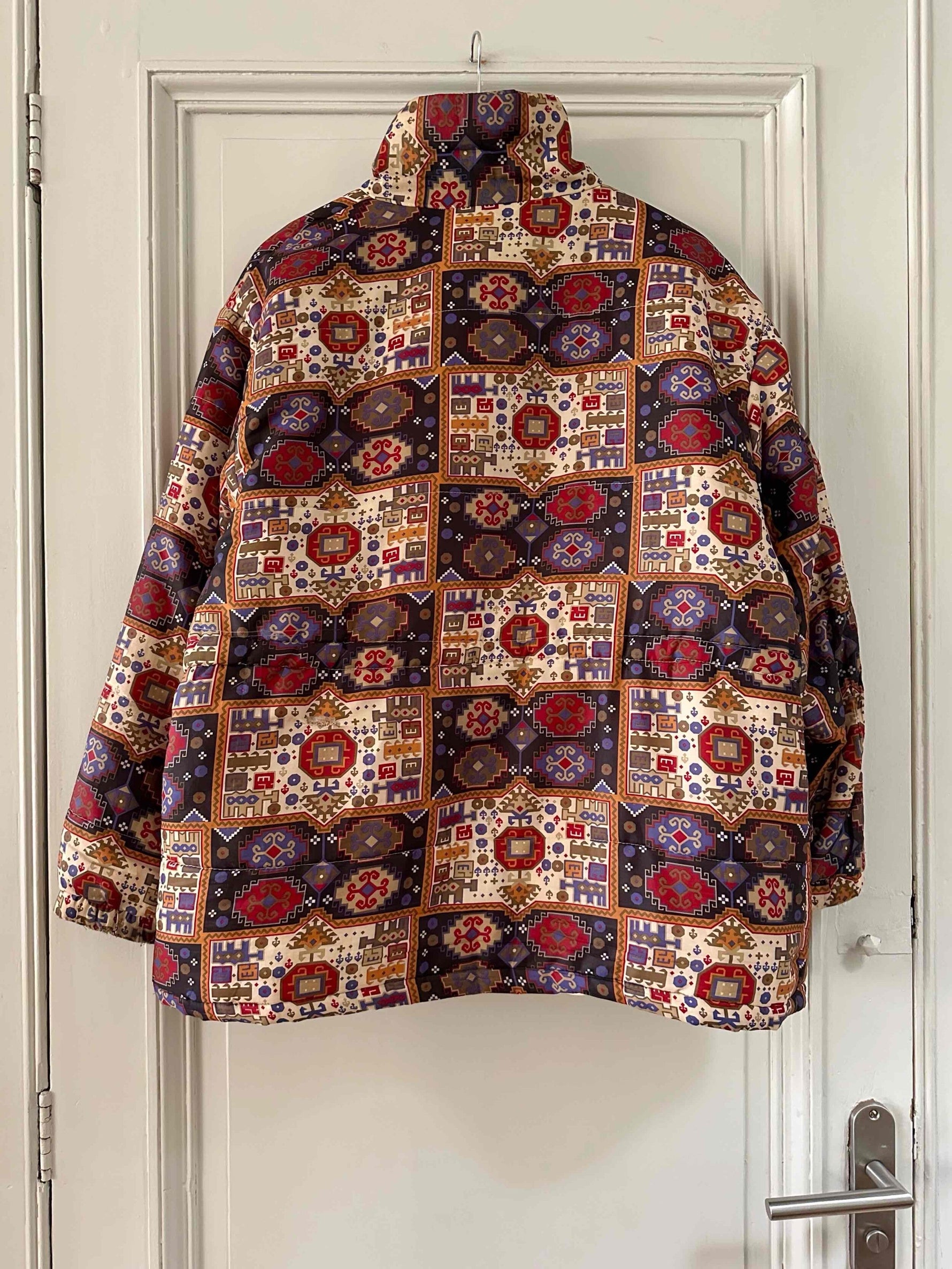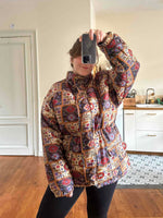 Prix unitaire parDoudoune à motifs patchworks, taille à froncer interieure, capuche intégrée à rentrer dans une pochette interieure, fabriquée en France, taille 38 et 40 portée ici sur une personne T40.