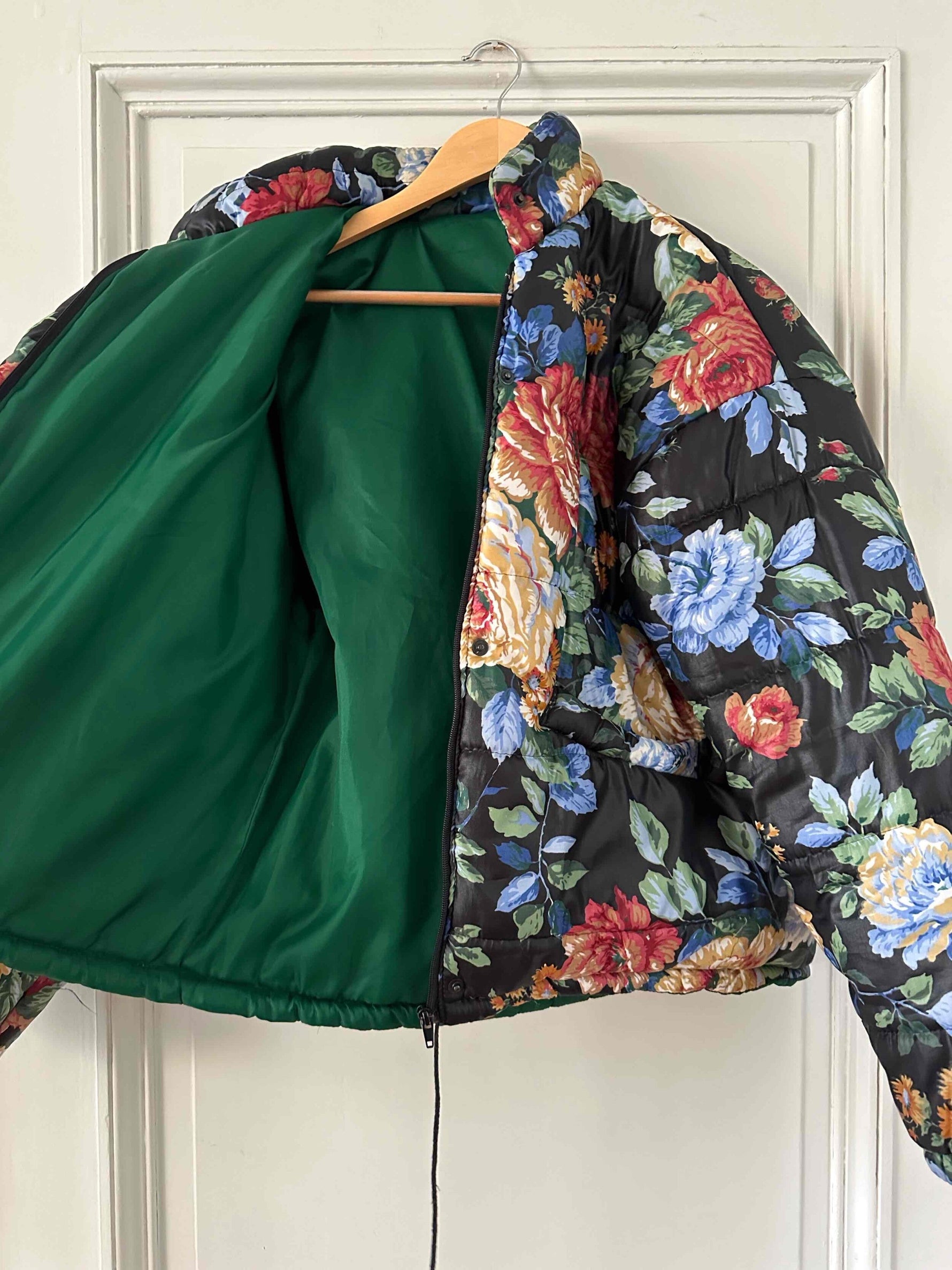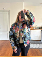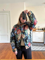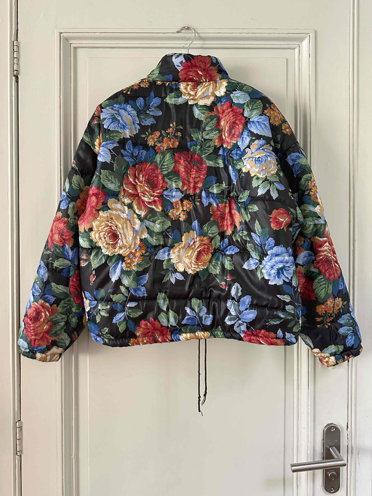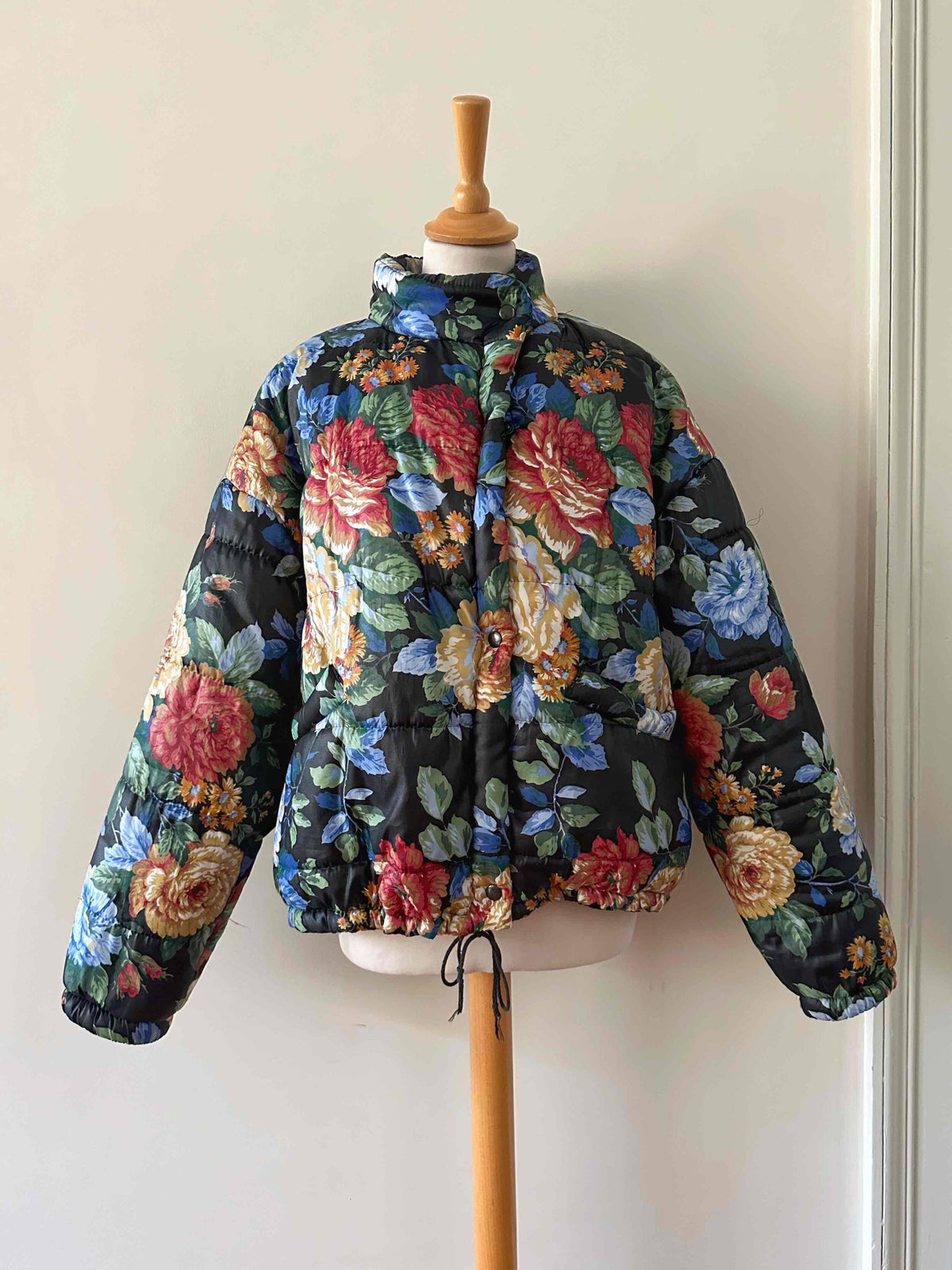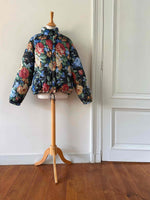 Prix unitaire parDoudoune à fleurs, noire imprimée fleurs tapissière multicolores rouges bordeaux, bleues, ocre et vertes, fermeture éclaire et boutons pressions, bas à resserrer, fabriquée en France, taille 36 portée ici sur un mannequin T36, et ouverte sur une personne T40.