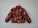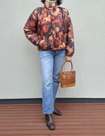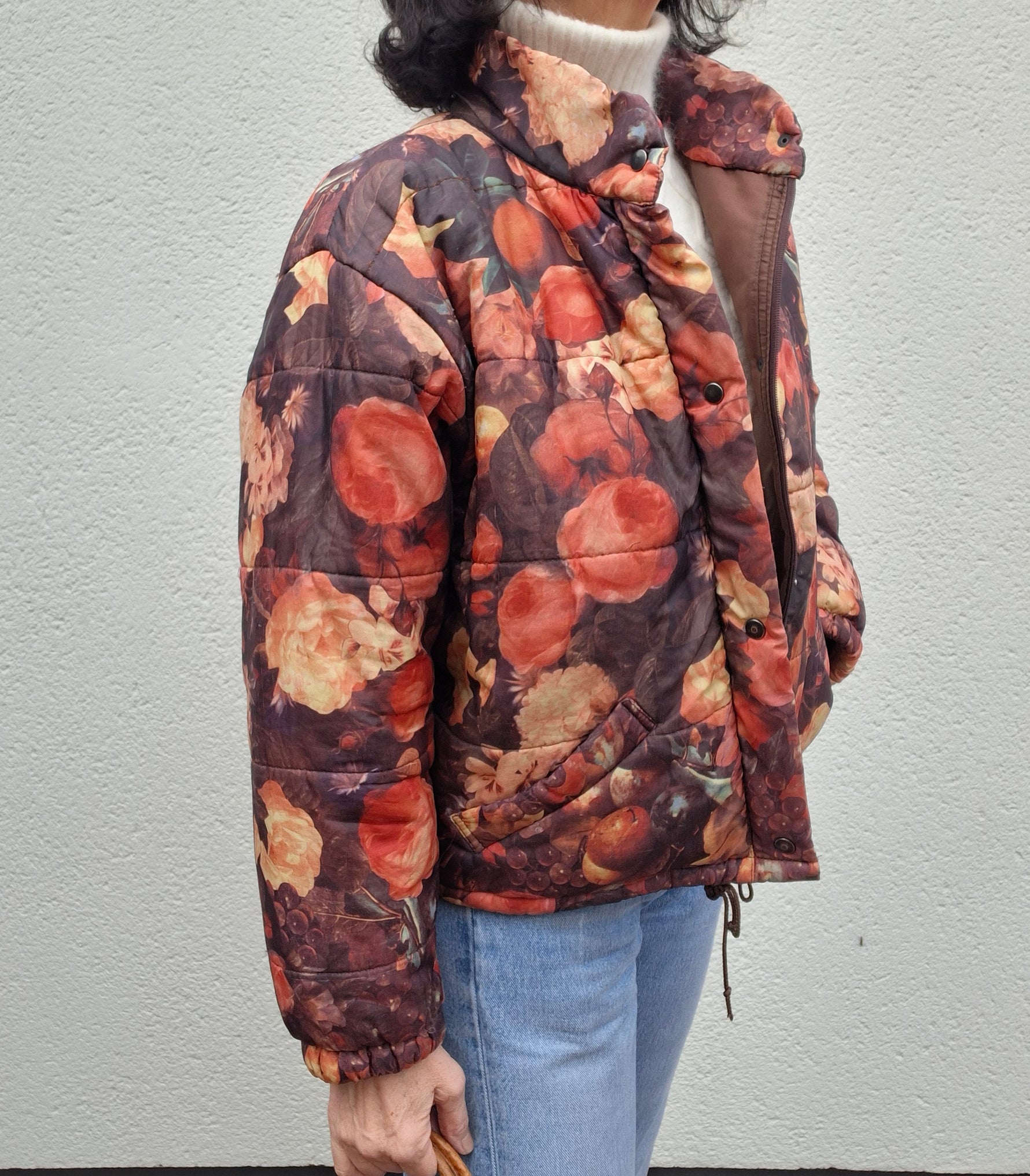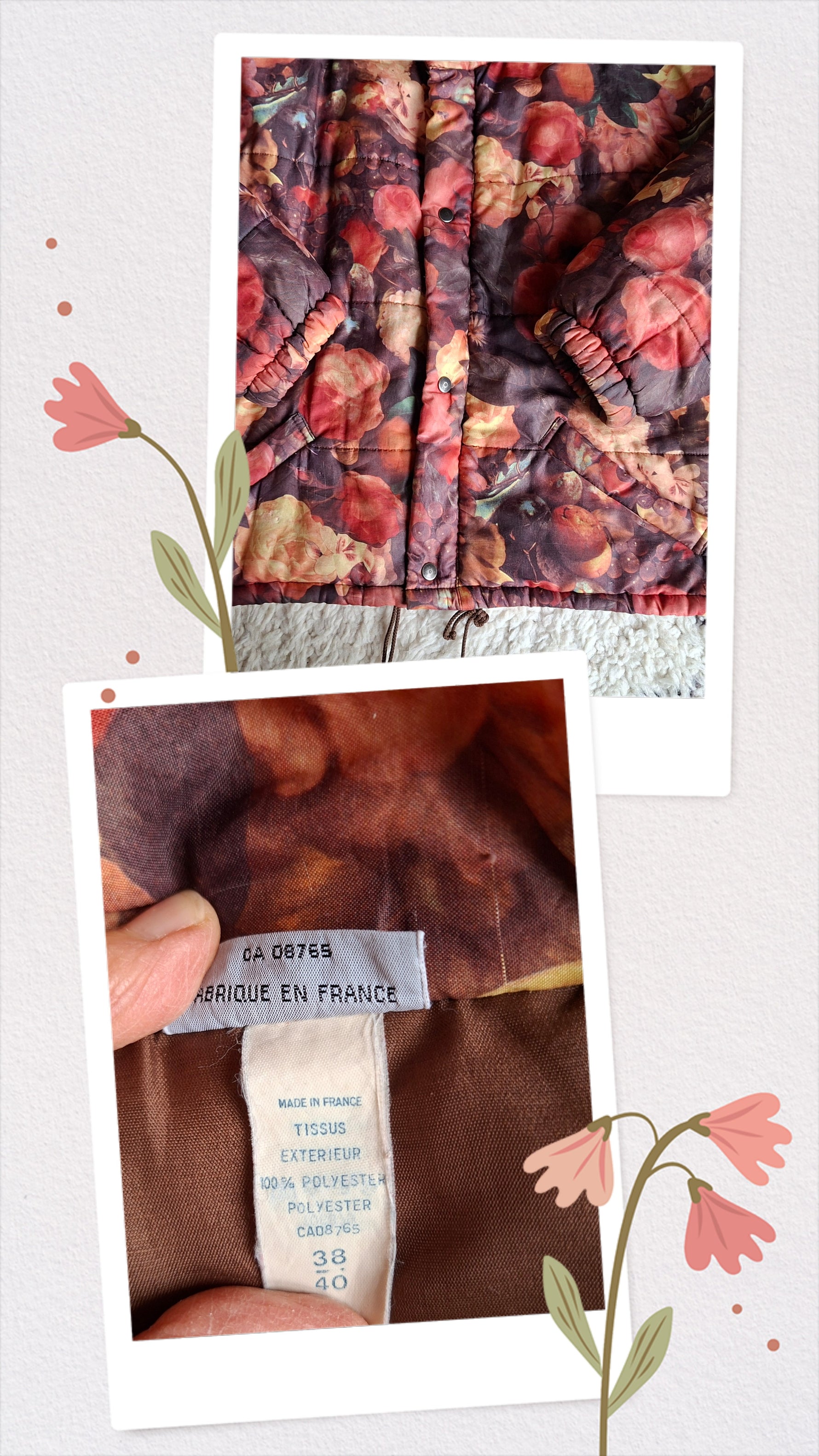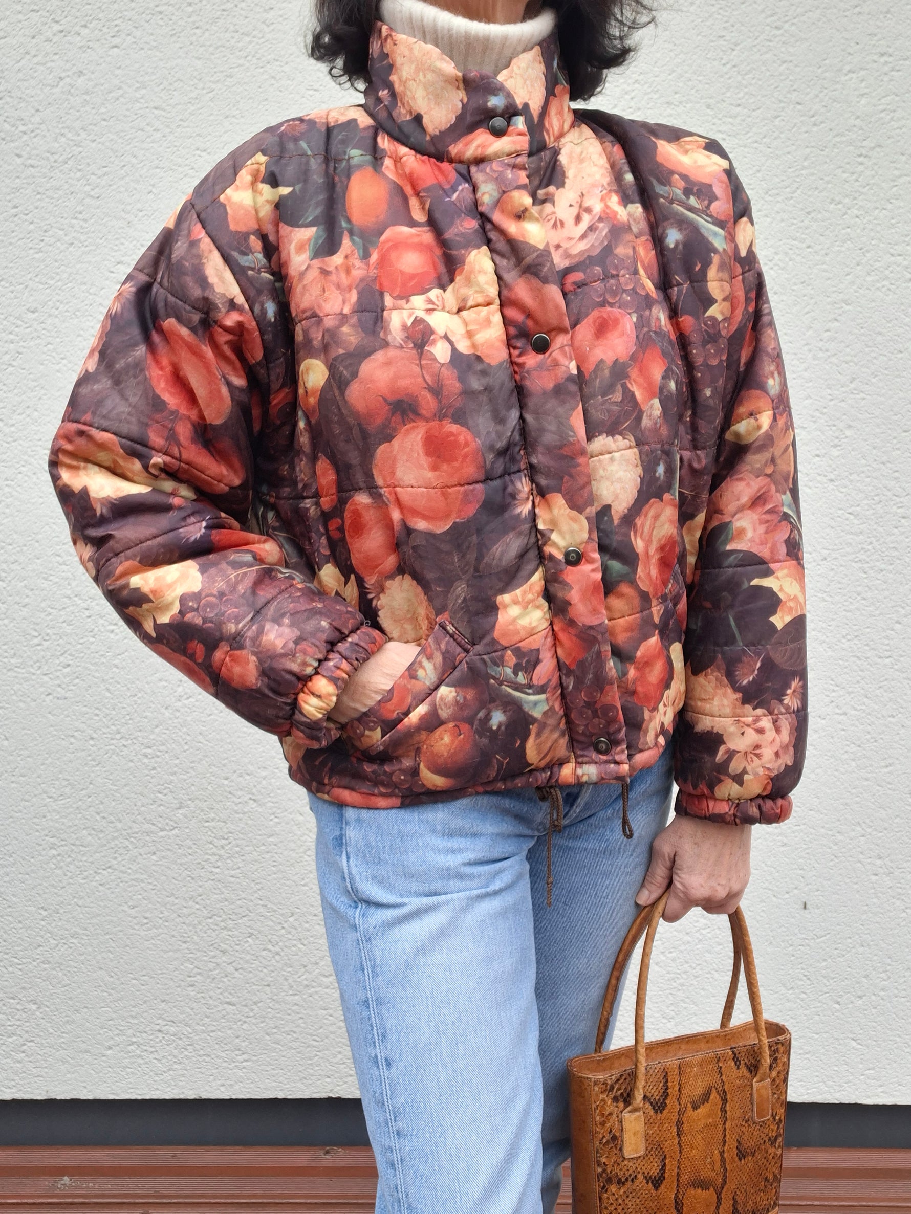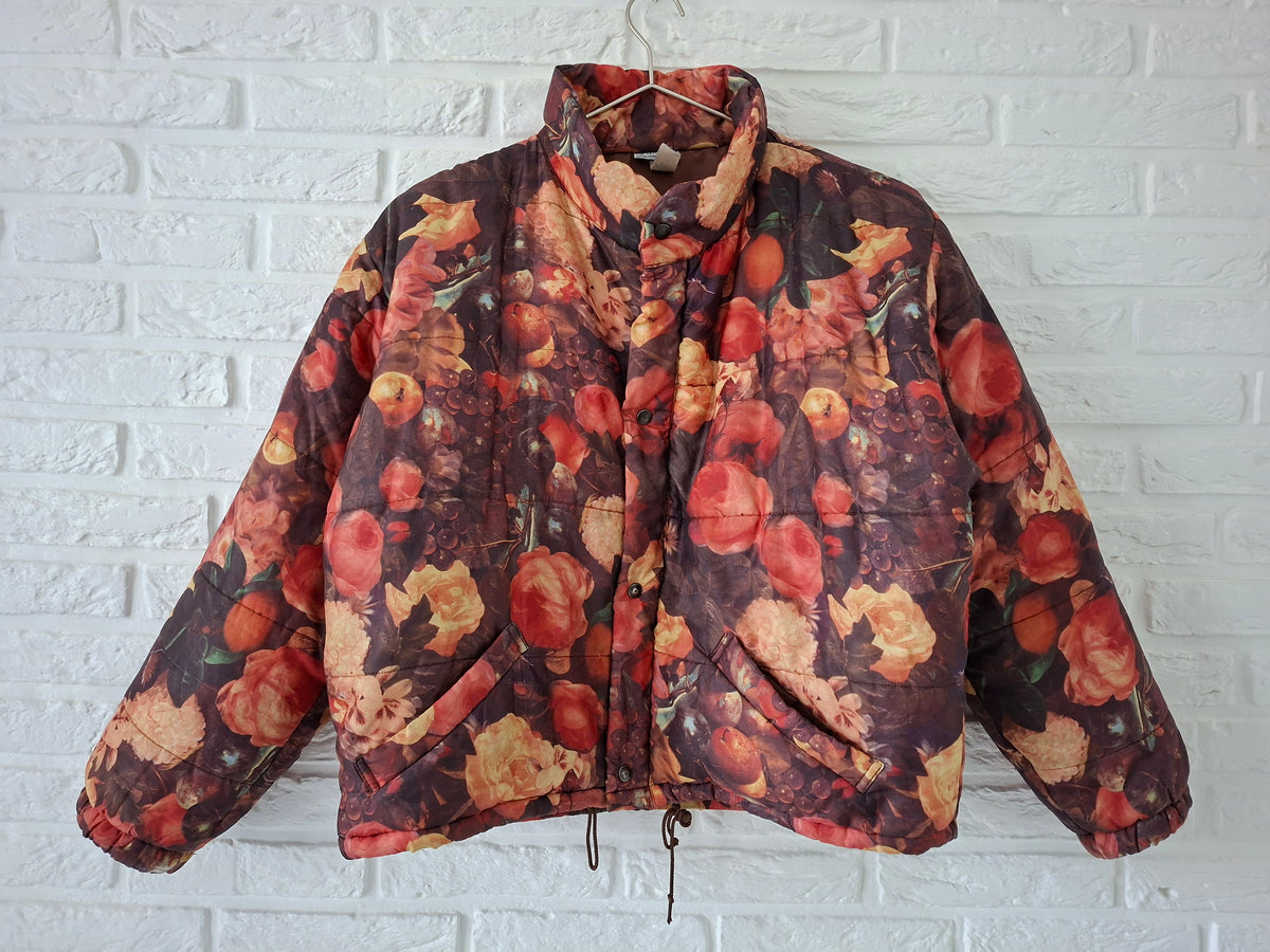 Doudoune à fleurs vintage 80's Made in France Coupe ample et courte 2 poches Col montant. Fermeture zippée jusqu’au col. Portée par Patricia qui fait une taille 40.Epaules 50cm Aisselles 62cm.Longueur 56cm.Taille 38/40