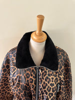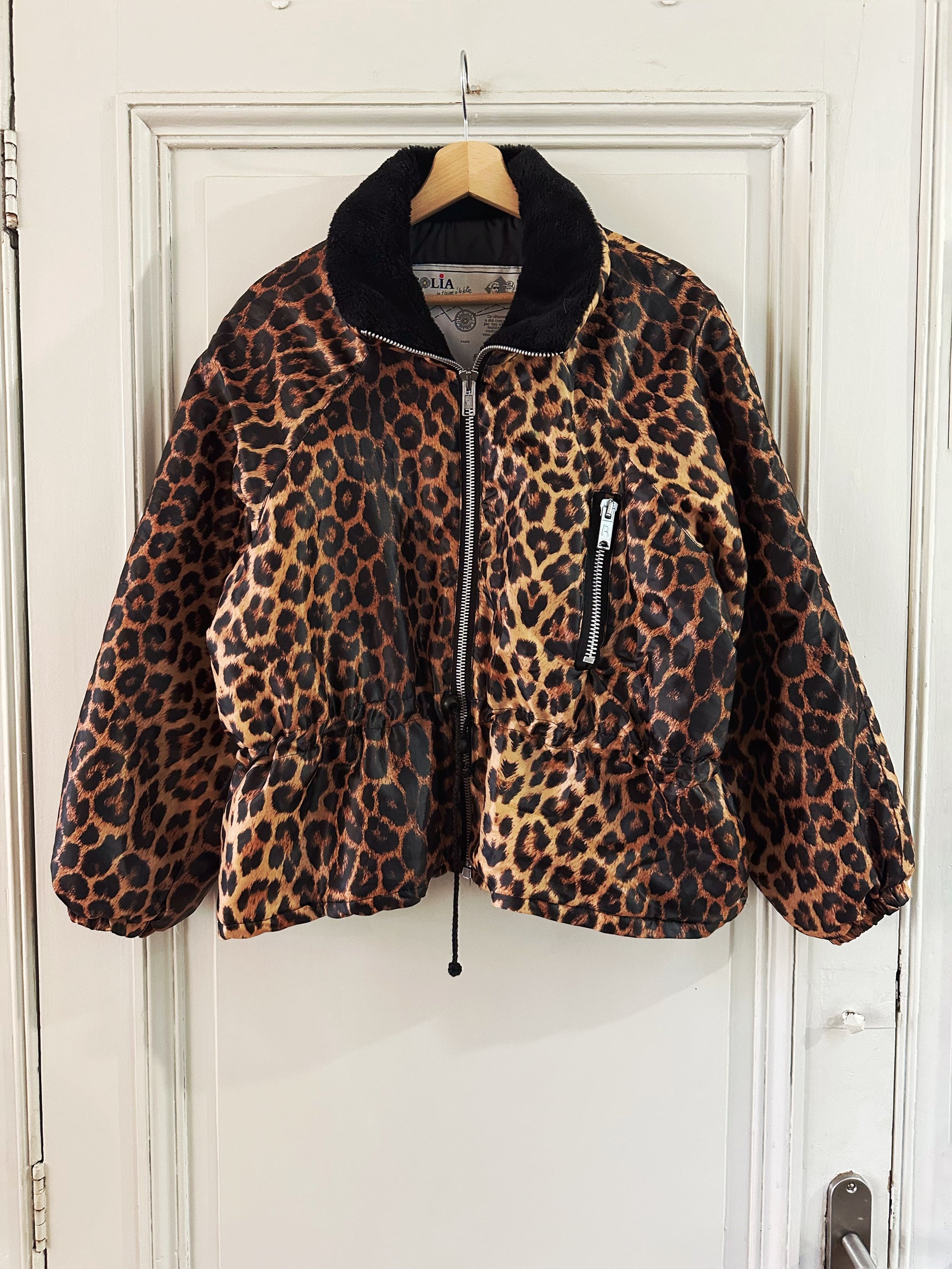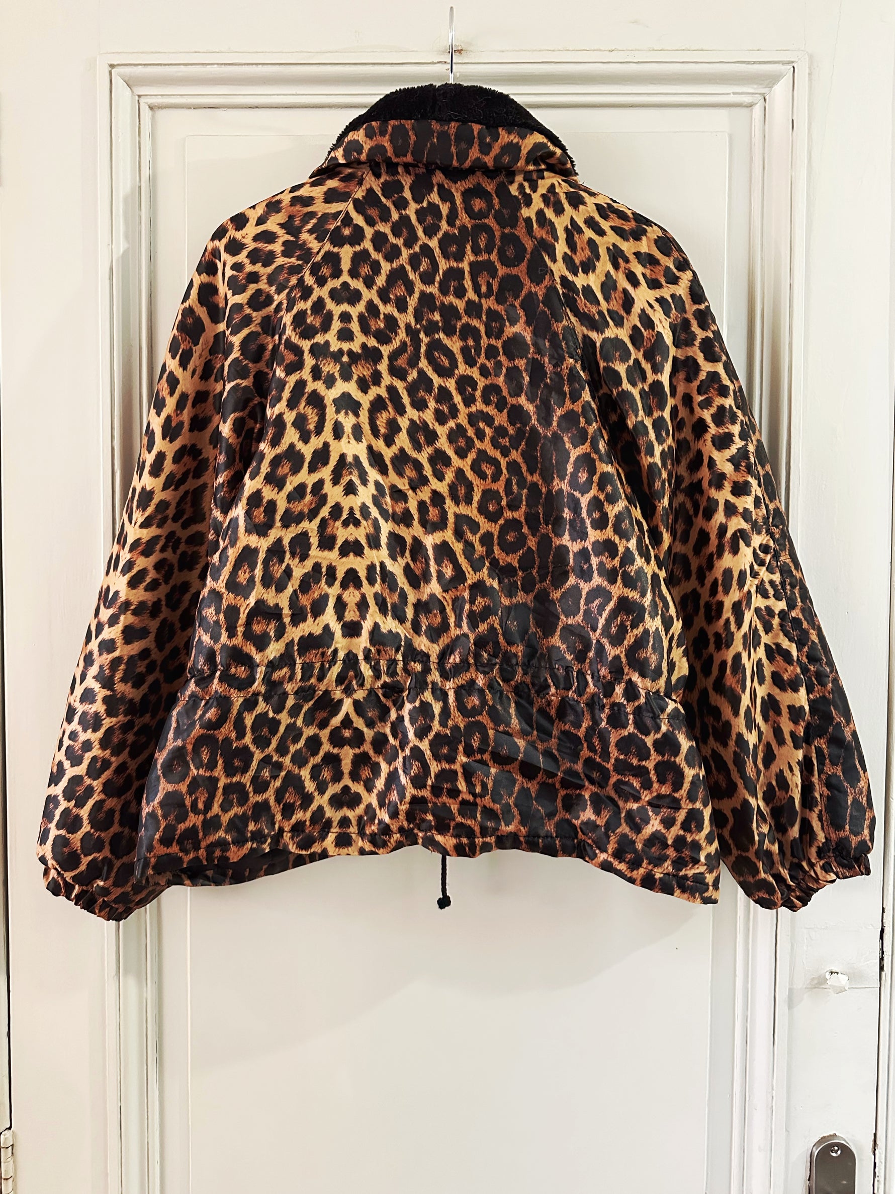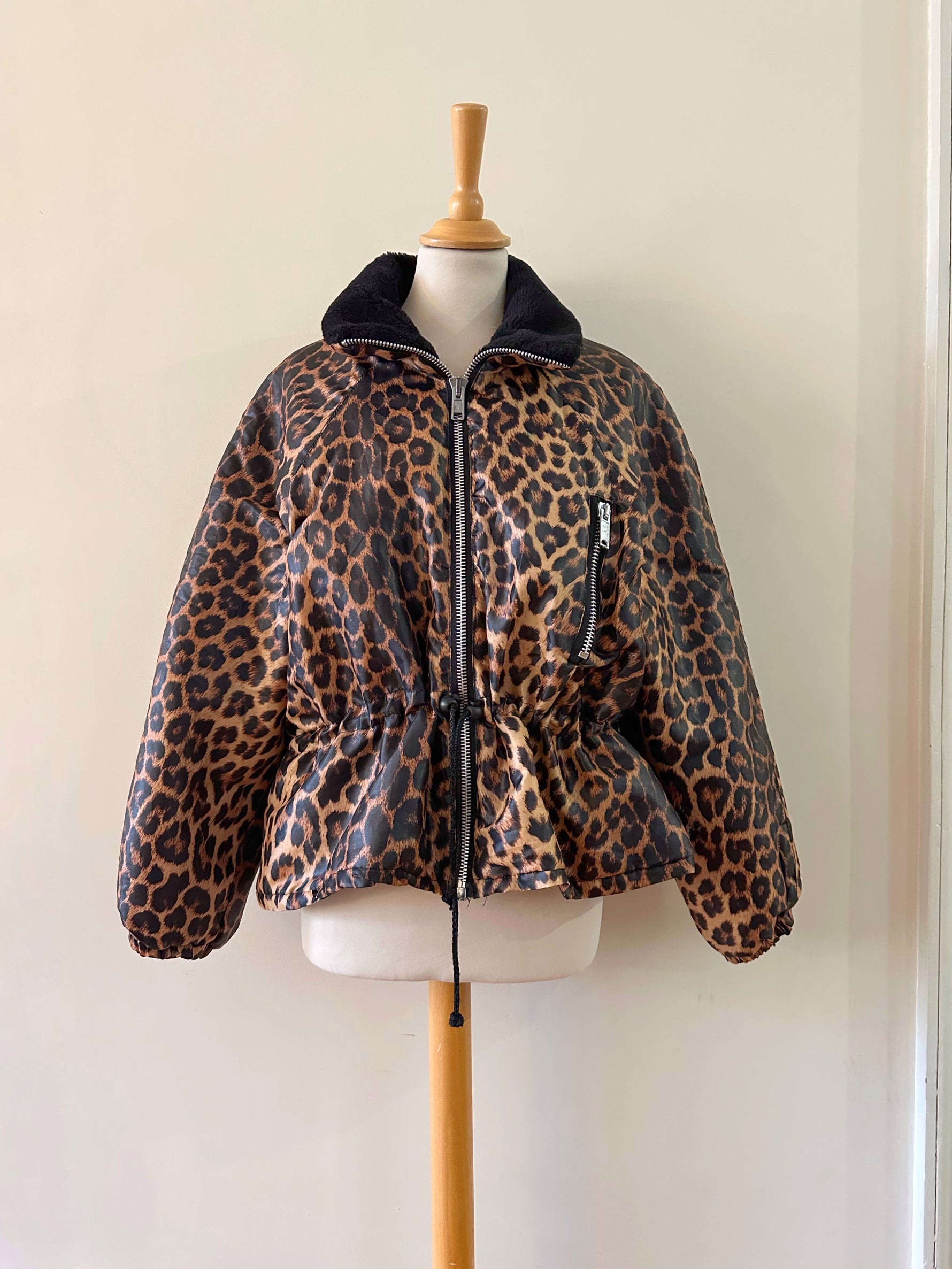 Doudoune léopard avec col en fausse fourrure noire. Fermeture éclair et taille à cintrer par deux cordons de serrage, Fabriquée en France, années 90s. Convient aux tailles 36 et 38 porté ici sur un mannequin T36 et serrée sur une personne T40. Aisselles 48cm Longueur 62cm.