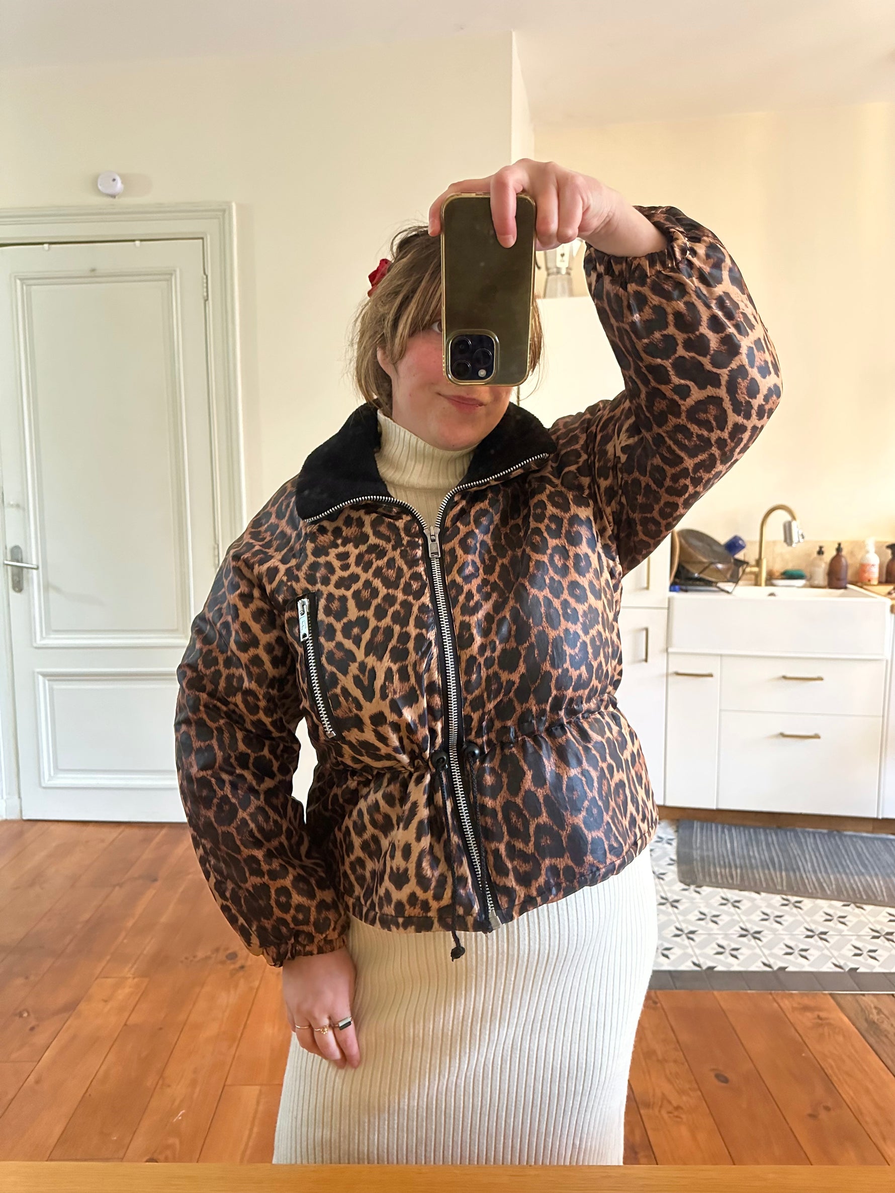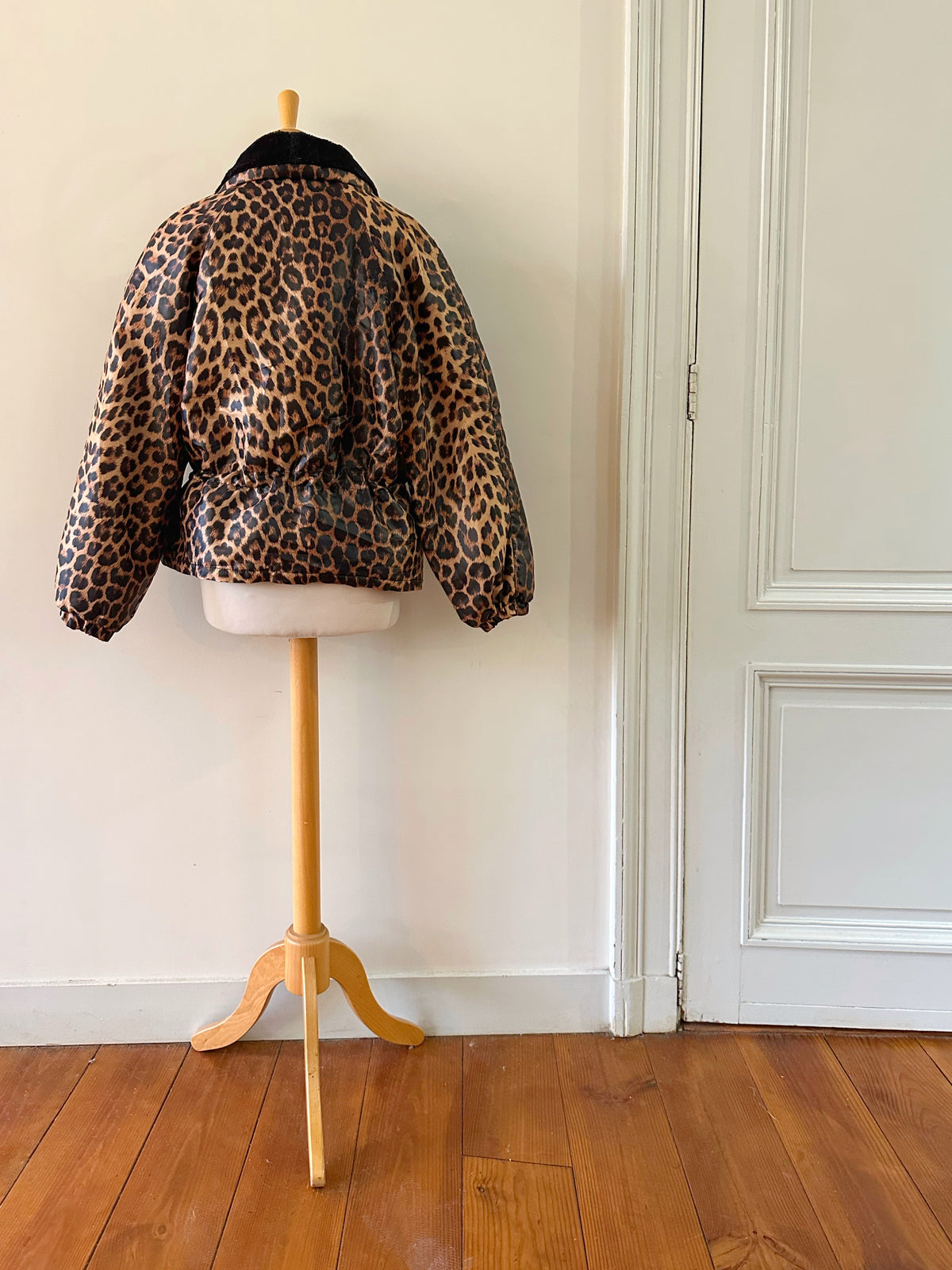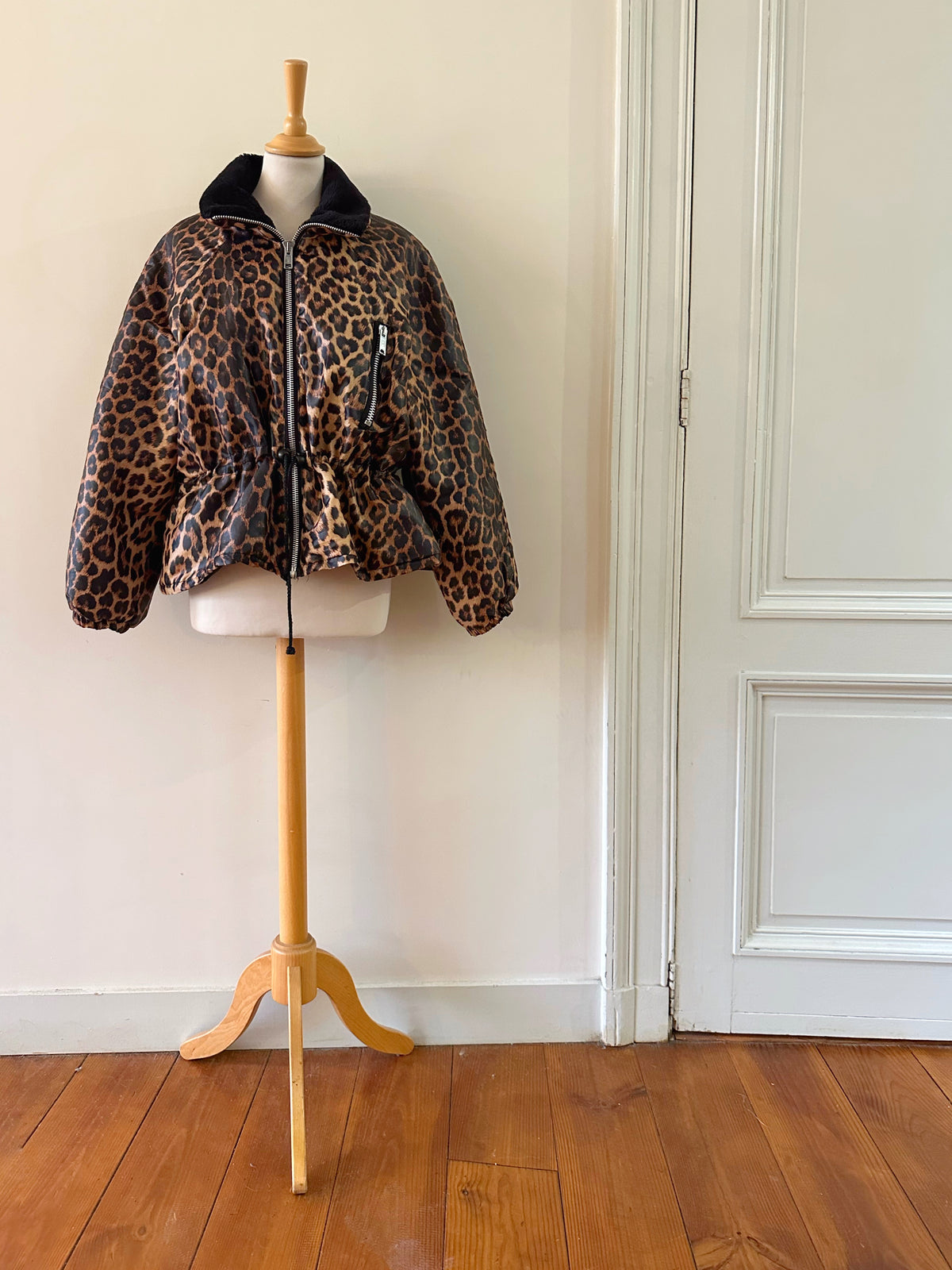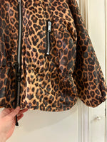 Doudoune léopard avec col en fausse fourrure noire. Fermeture éclair et taille à cintrer par deux cordons de serrage, Fabriquée en France, années 90s. Convient aux tailles 36 et 38 porté ici sur un mannequin T36 et serrée sur une personne T40. Aisselles 48cm Longueur 62cm.