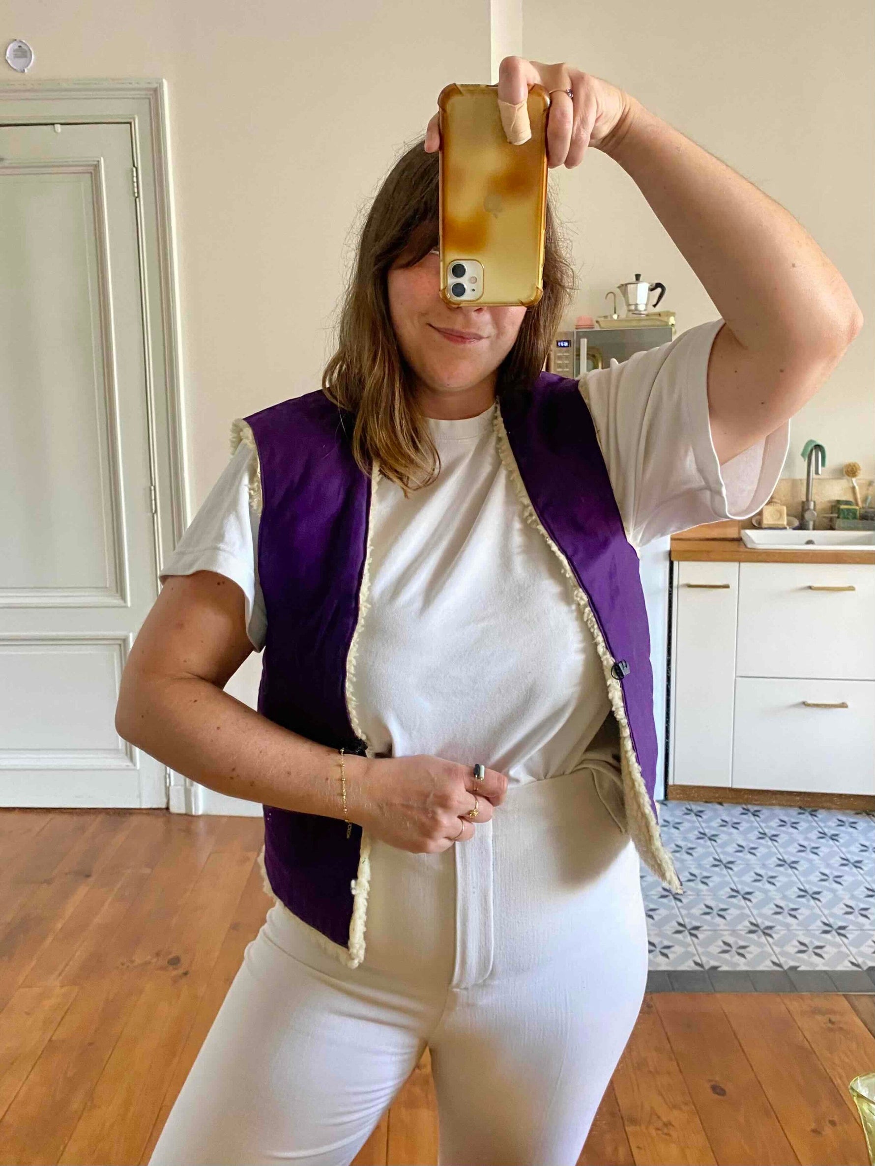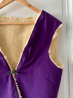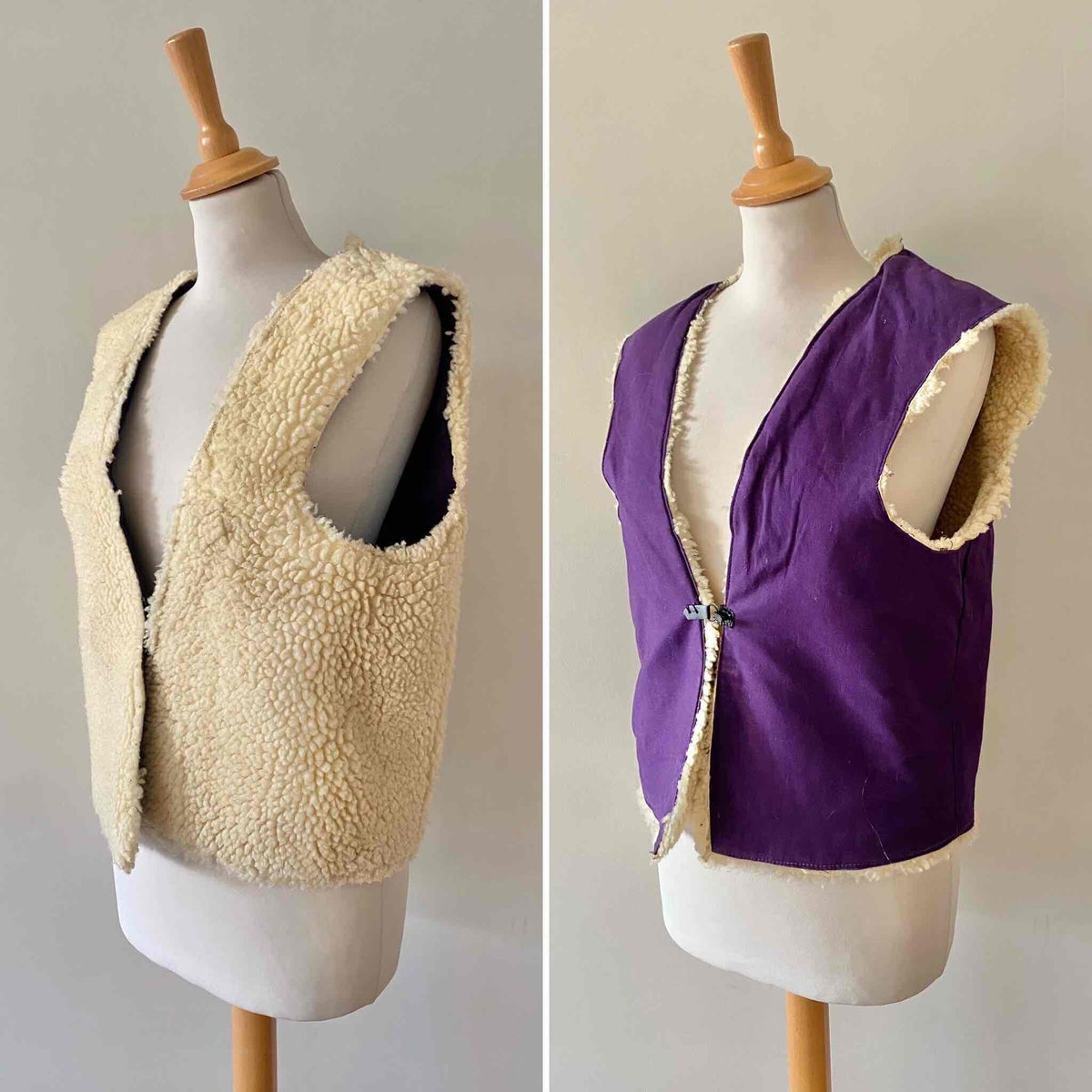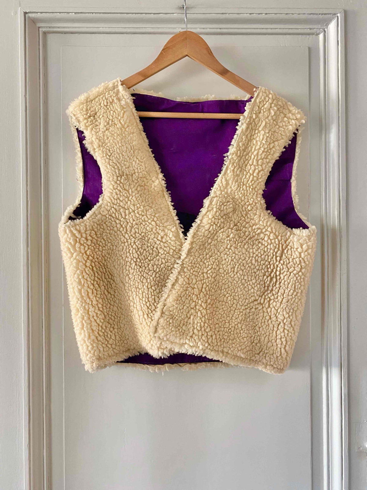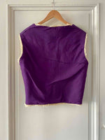 Gilet en mouton réversible, peau de mouton retourné écru, doublé en coton violet, réversible, bouton crochet noir, fait mains en France, taille 36 et 38 porté ici sur un mannequin T36 et ouvert sur une personne T40.