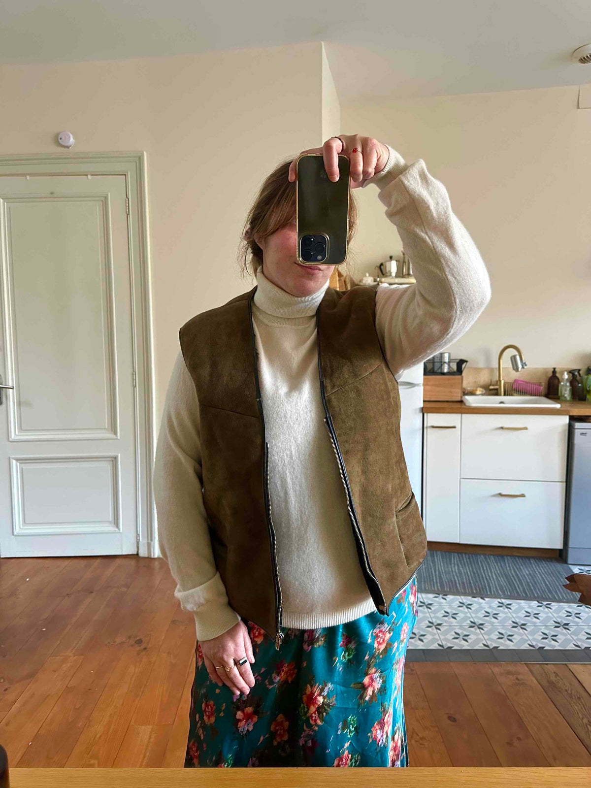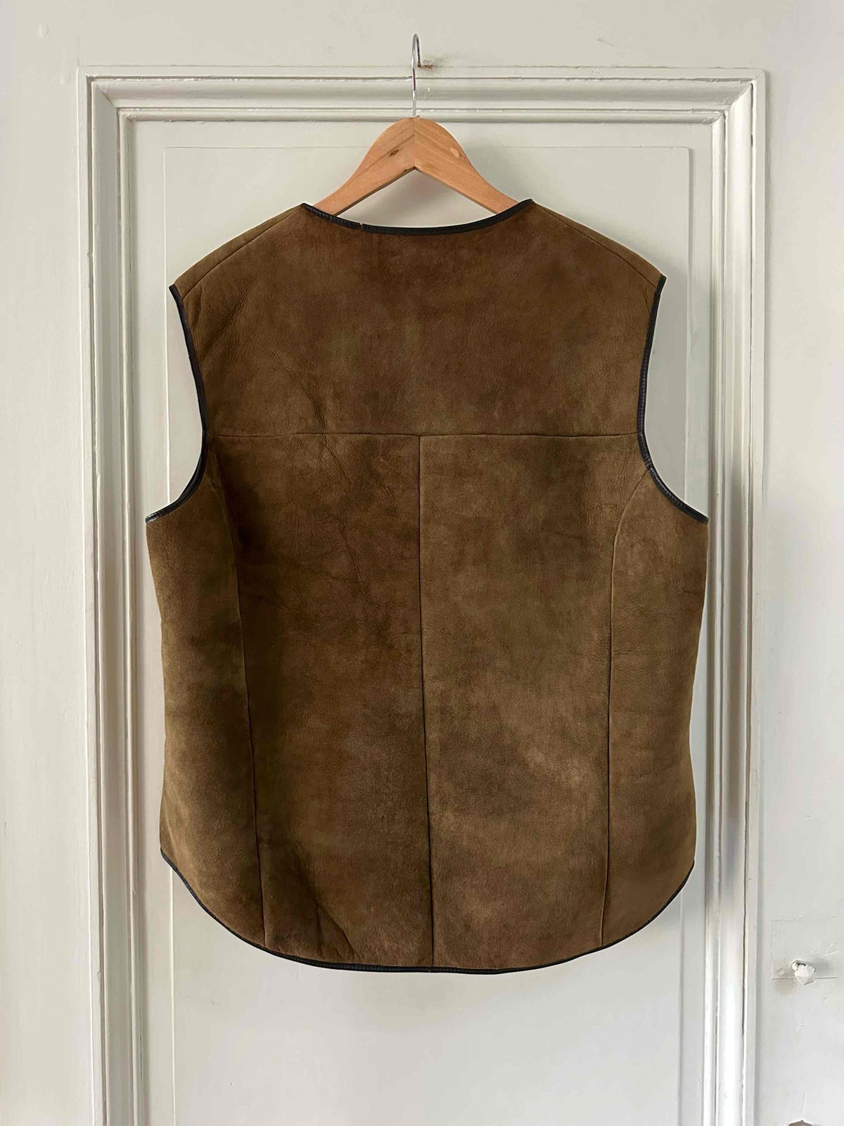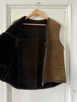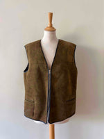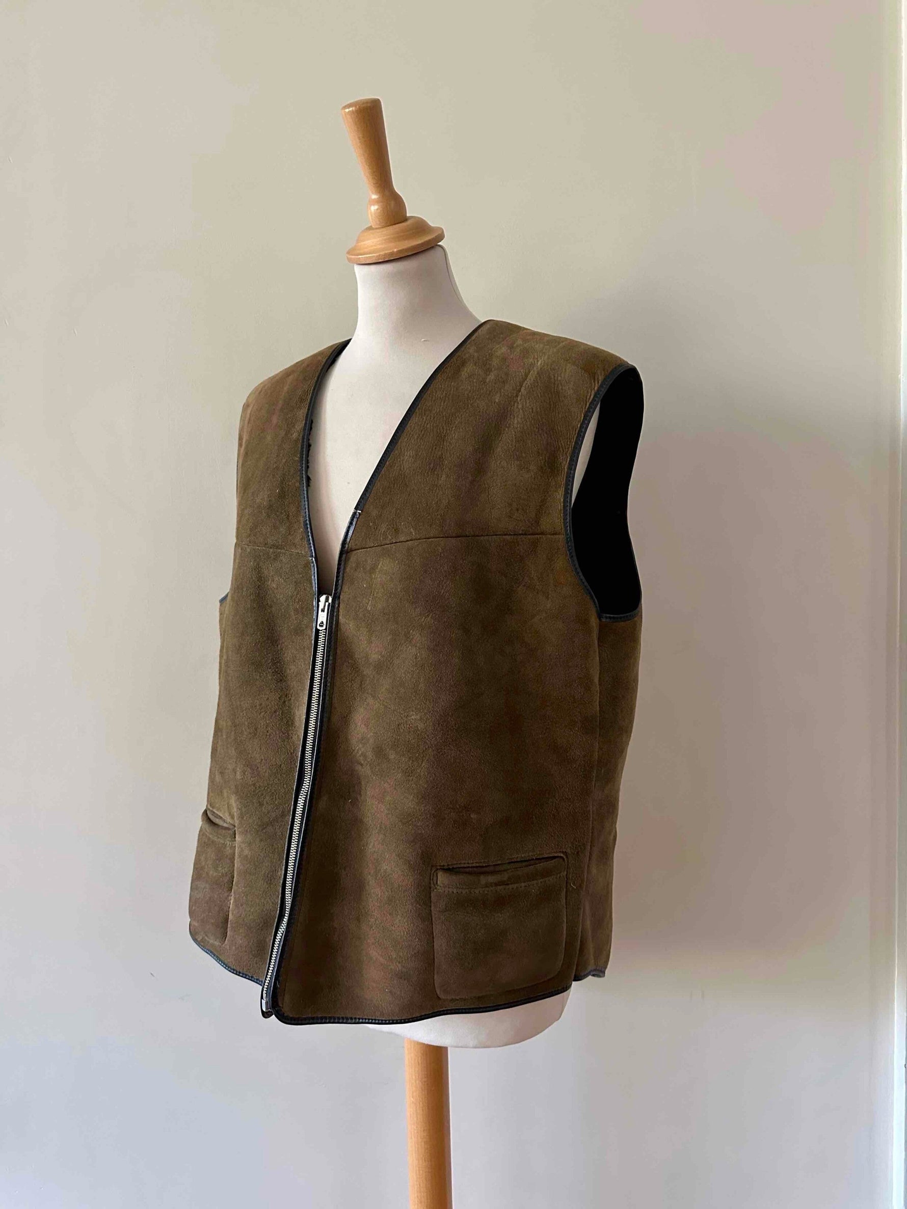 Gilet en peau lainee, mouton retourné exterieur daim brun vert olive, gansé de cuir noir, interieur laine de mouton noire, fermeture eclair, fabriqué en France, convient aux tailles 38 et 40 porté ici sur une personne T40 et sur un mannequin T36.