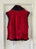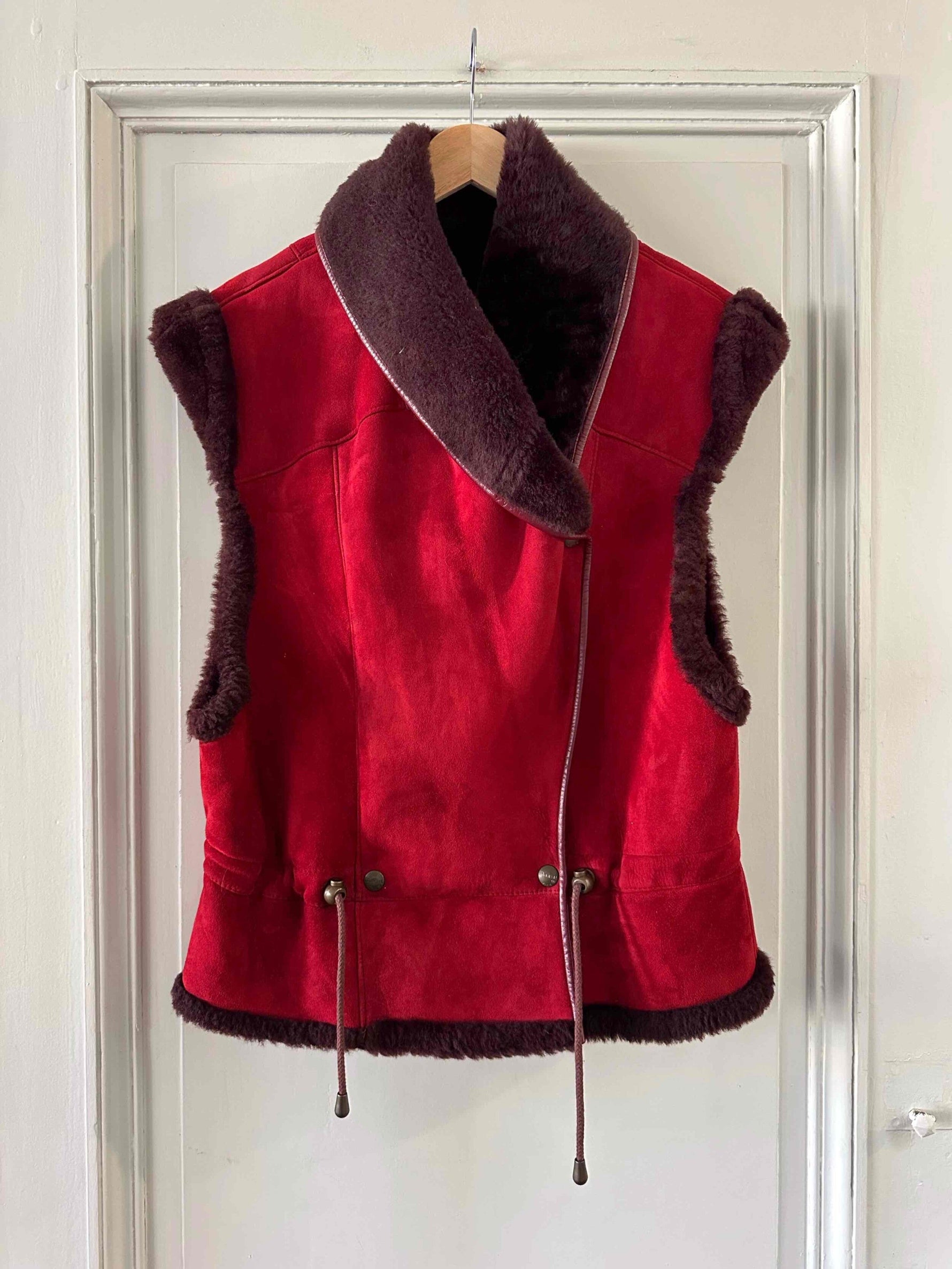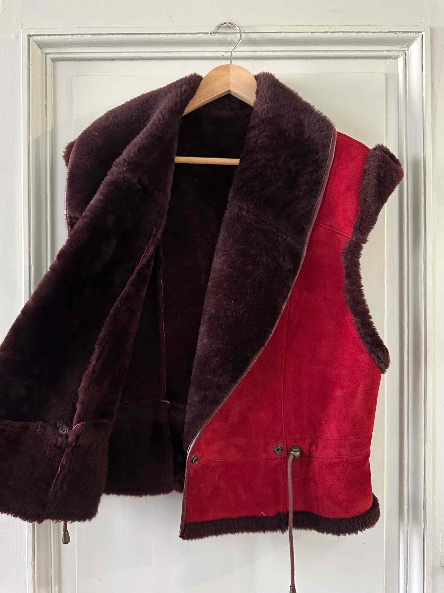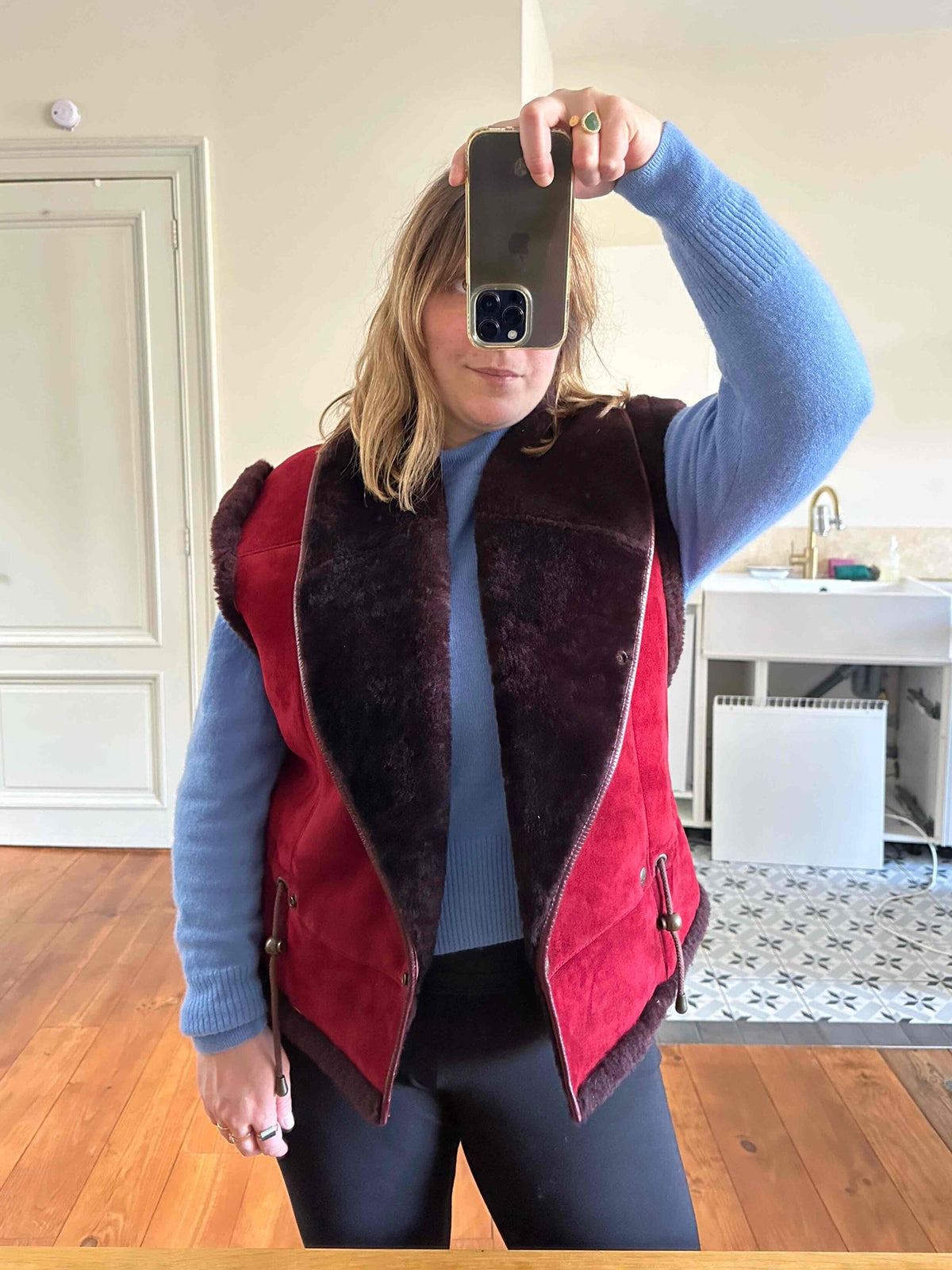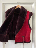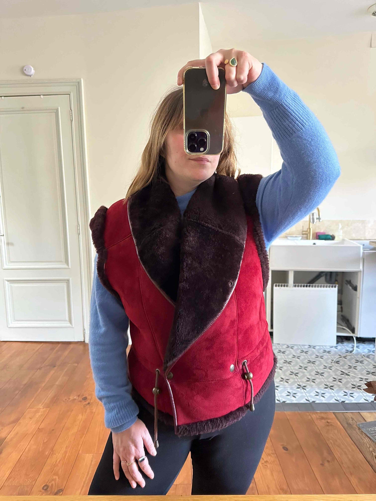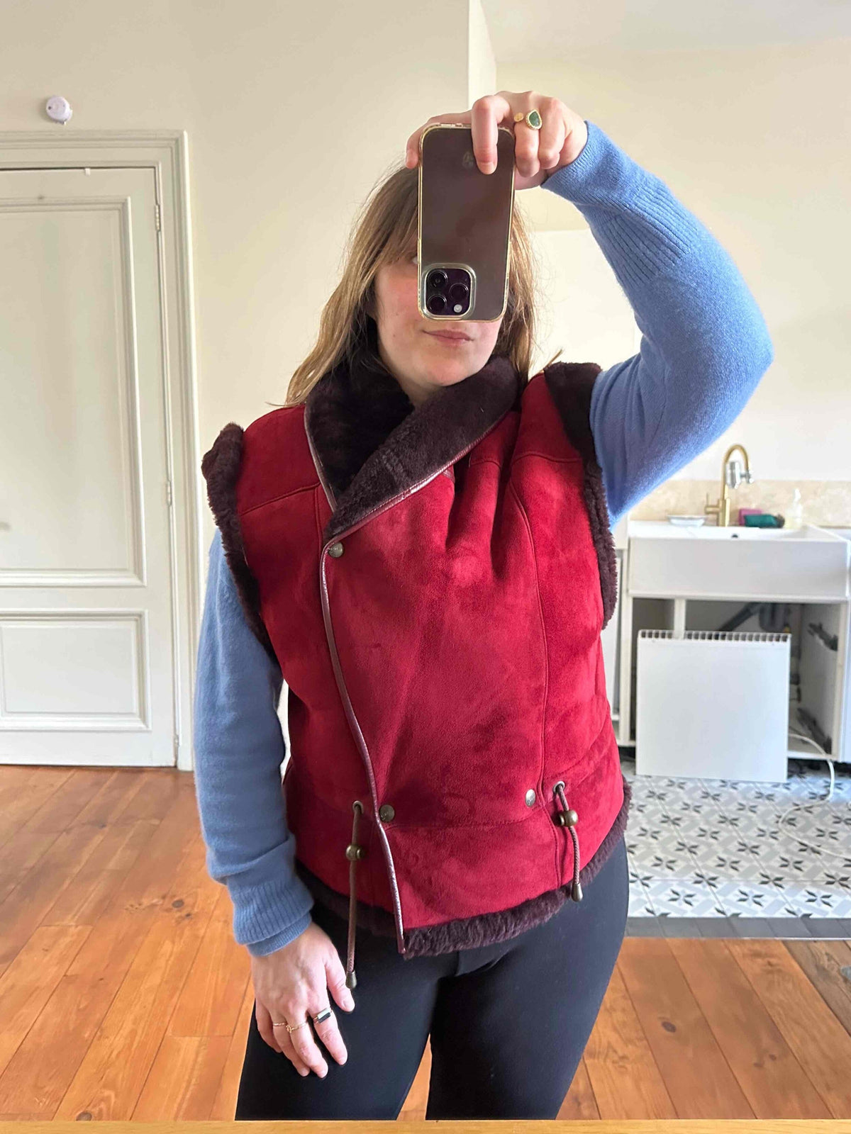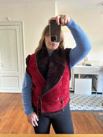 Prix unitaire parGilet peau lainée, en mouton retourné exterieur daim rouge cerise, ganses en cuir bordeaux, interieur en laine de mouton bordeaux, boutonnage croisé par pressions, grand col châle croisé, taille à resserrer, fabriqué en France. Convient aux tailles 38 et 40 porté ici sur un mannequin T36 et une personne T40.