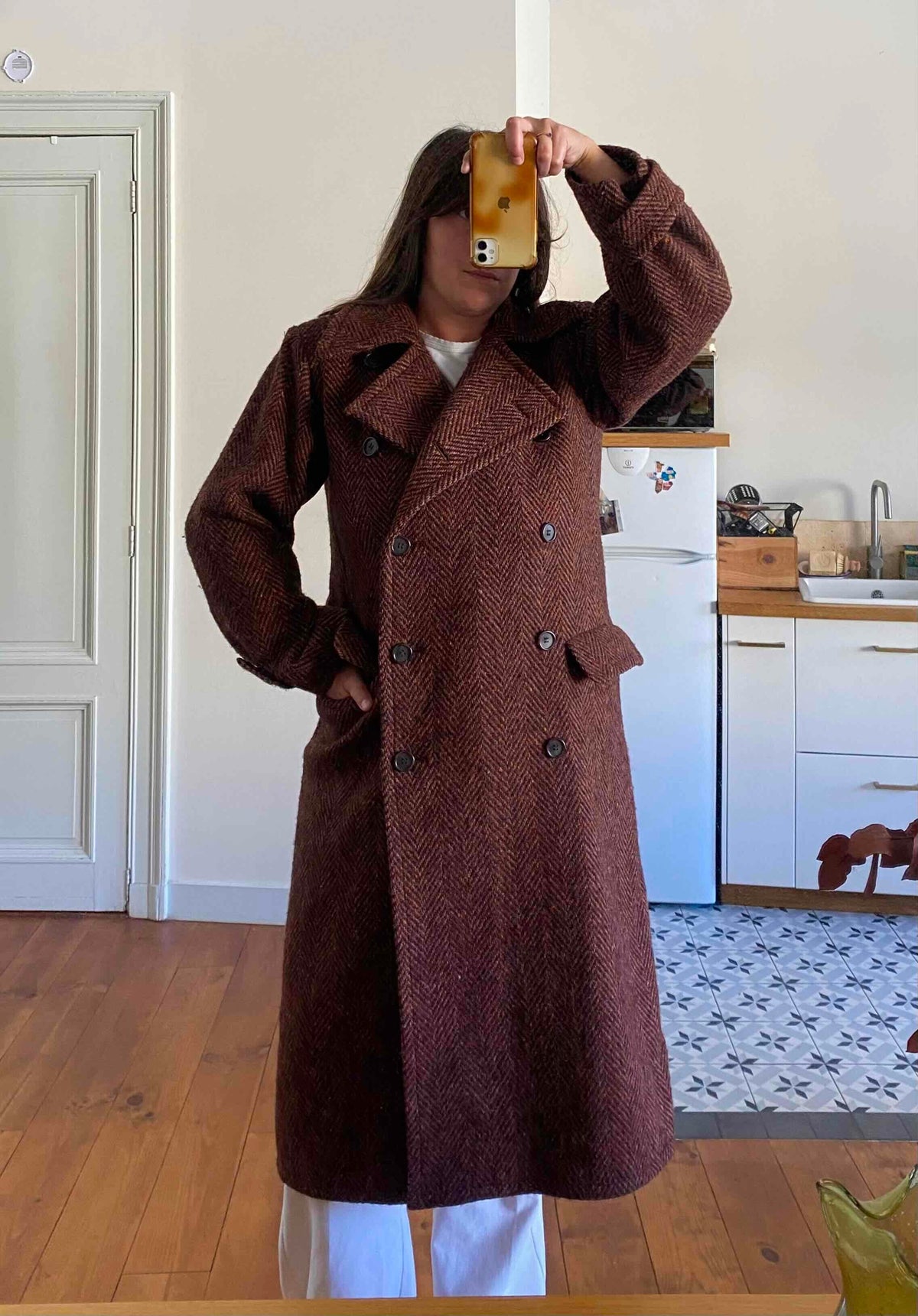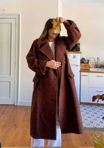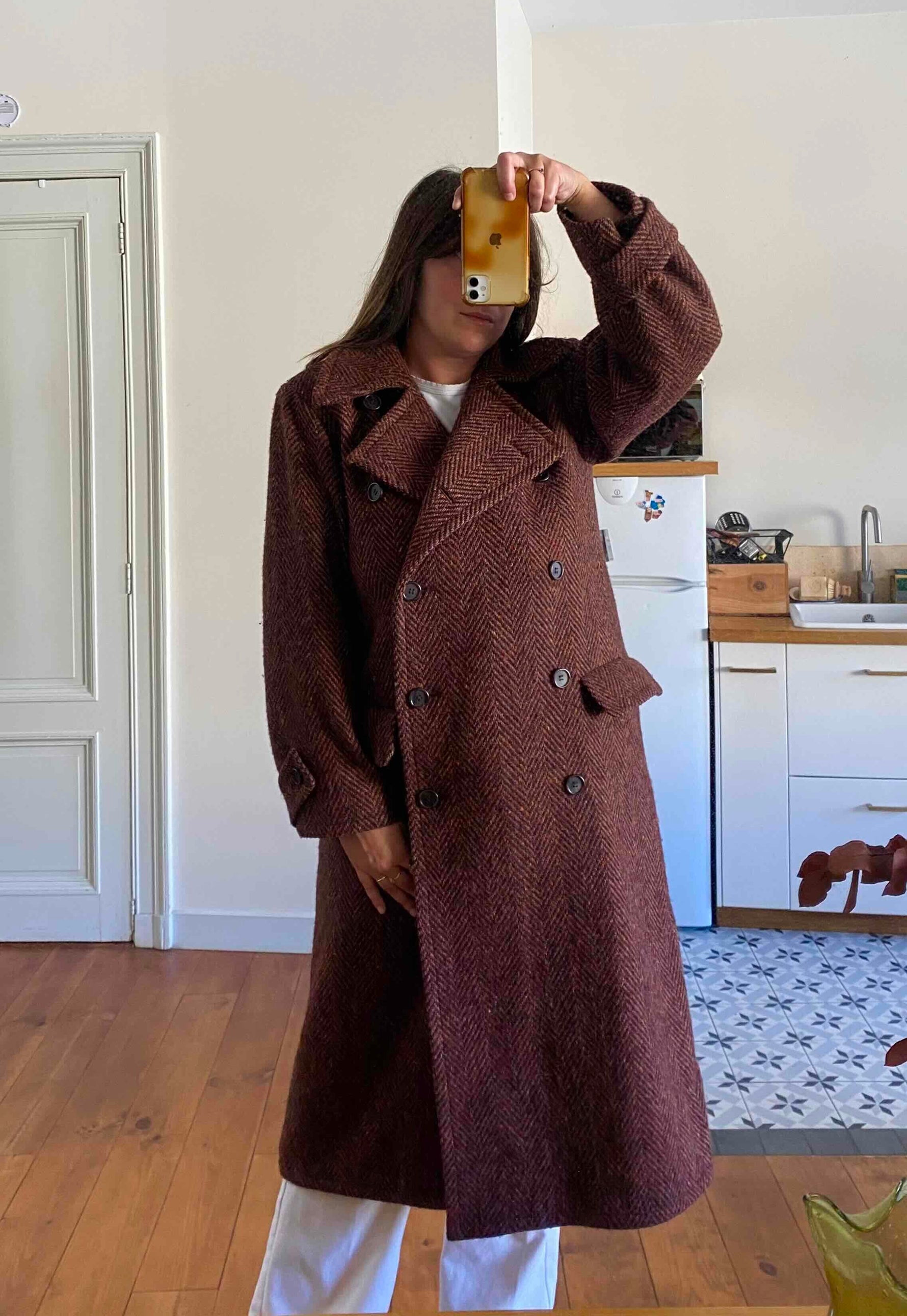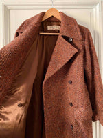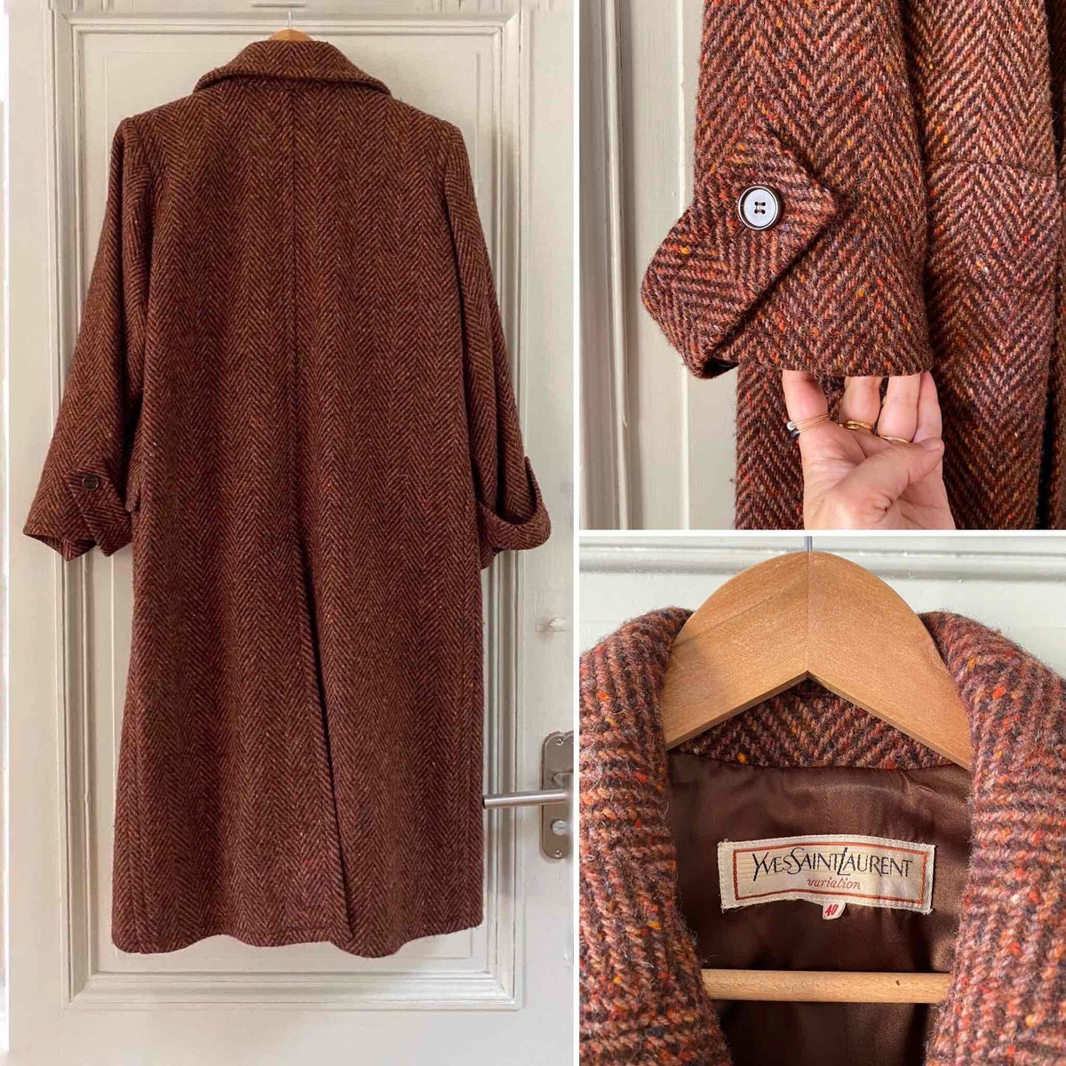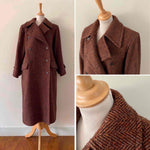 Prix unitaire parManteau chevrons Yves Saint Laurent, en pure laine chevrons, couleur chocolat, bordeaux, terre de sienne chiné multicolores avec des touches de jaunes, oranges, violets, boutonnage croisé, forme longue et droite, ligne Variations, Fabriqué en France, années 80’s, taille 38 oversize et 40 porté ici sur une personne T40.
