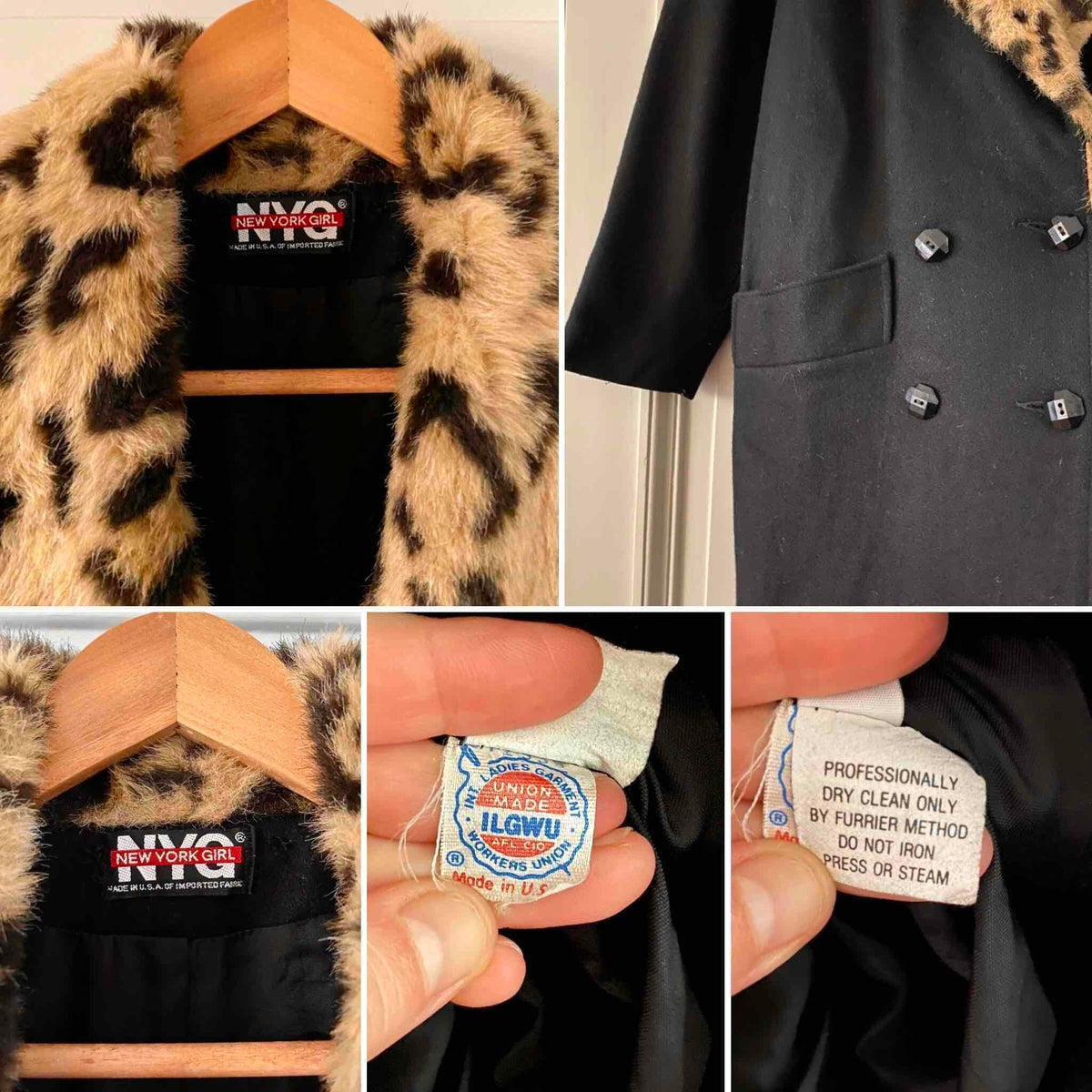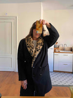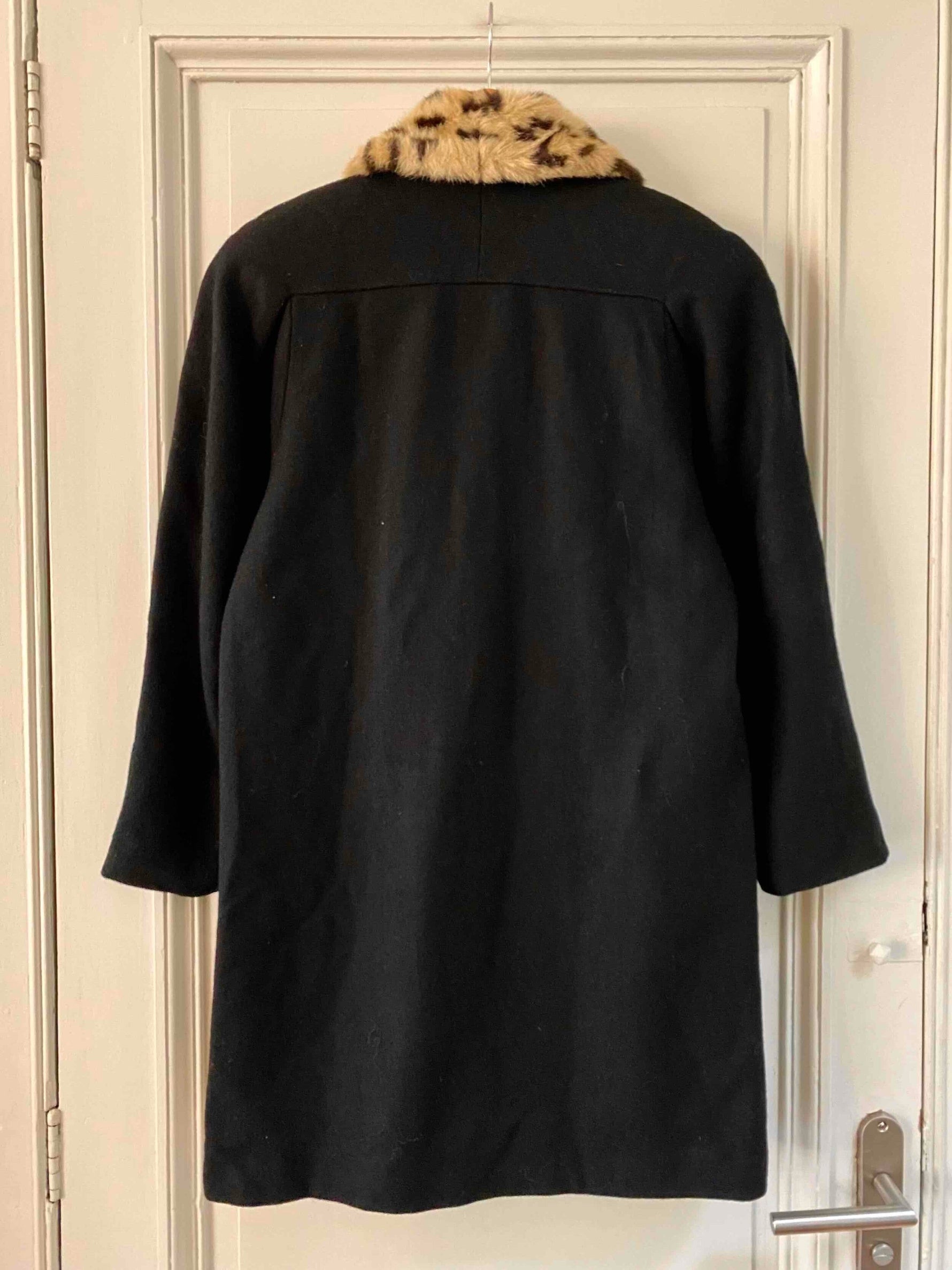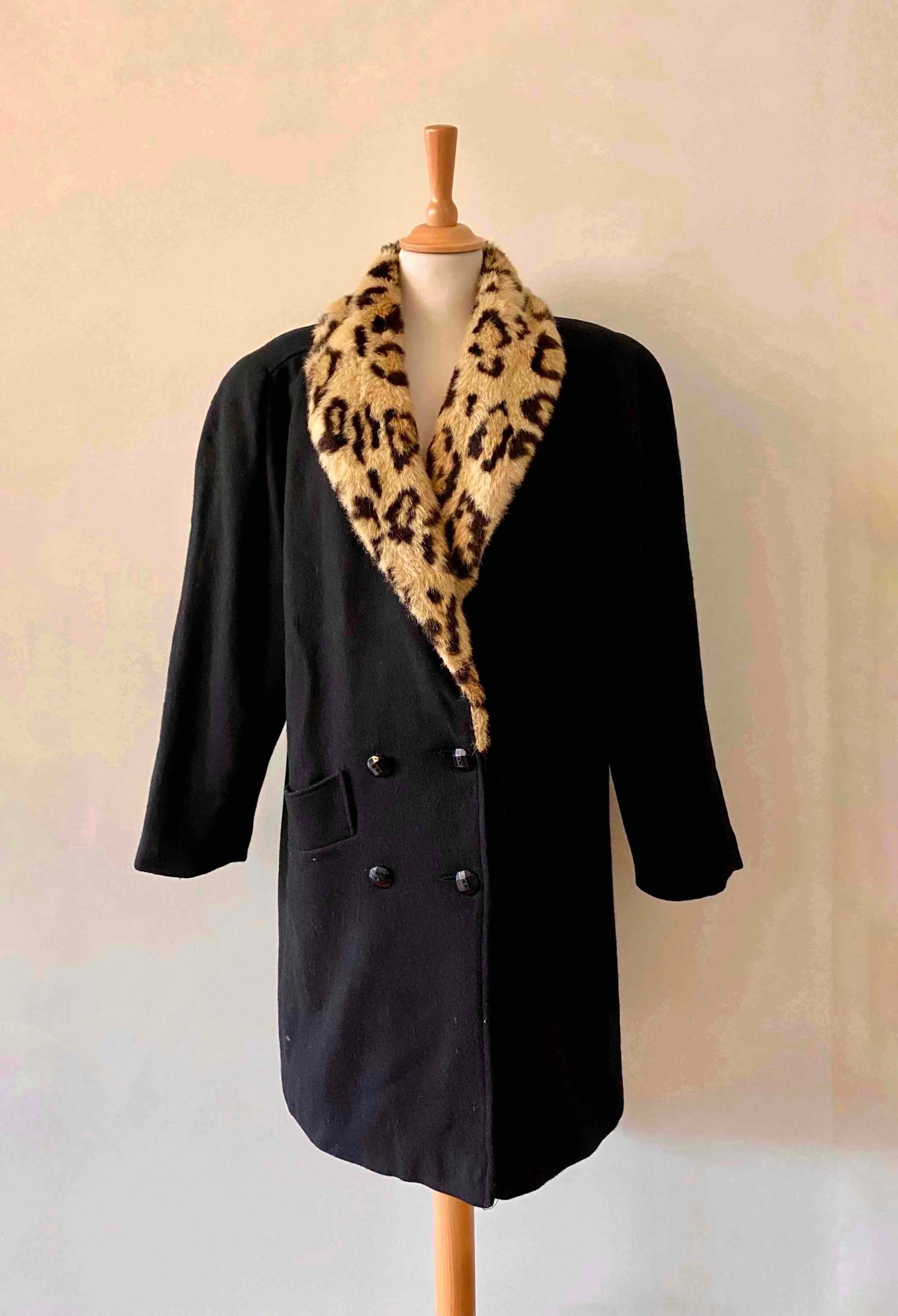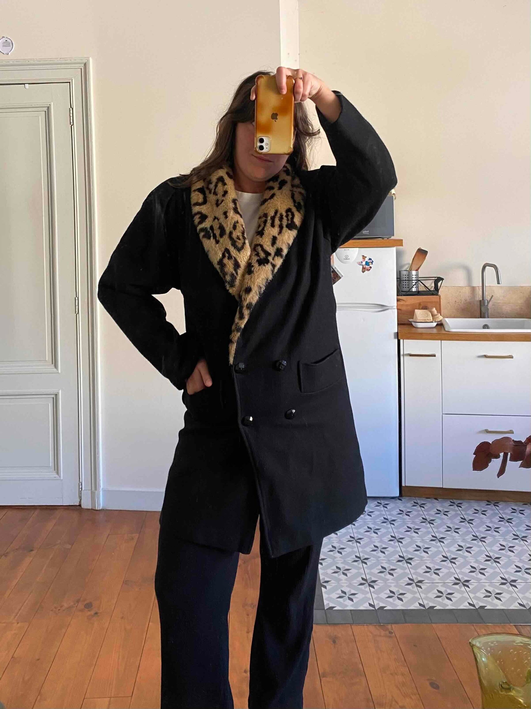 Prix unitaire parManteau col léopard, en laine noire, col fausse fourrure imprimée léopard, forme droite à épaulettes, boutonnage croisé par boutons bijoux noirs en jaie, fabriqué aux USA, taille 38 porté ici serré sur une personne T40 et sur un mannequin T36.