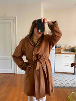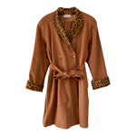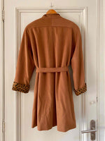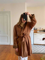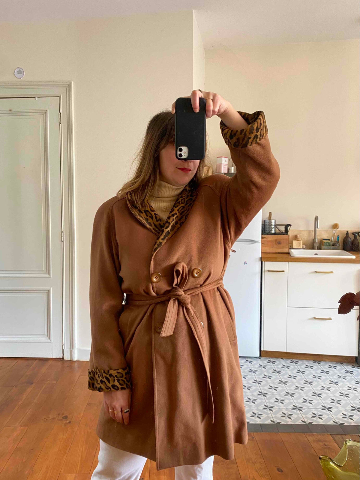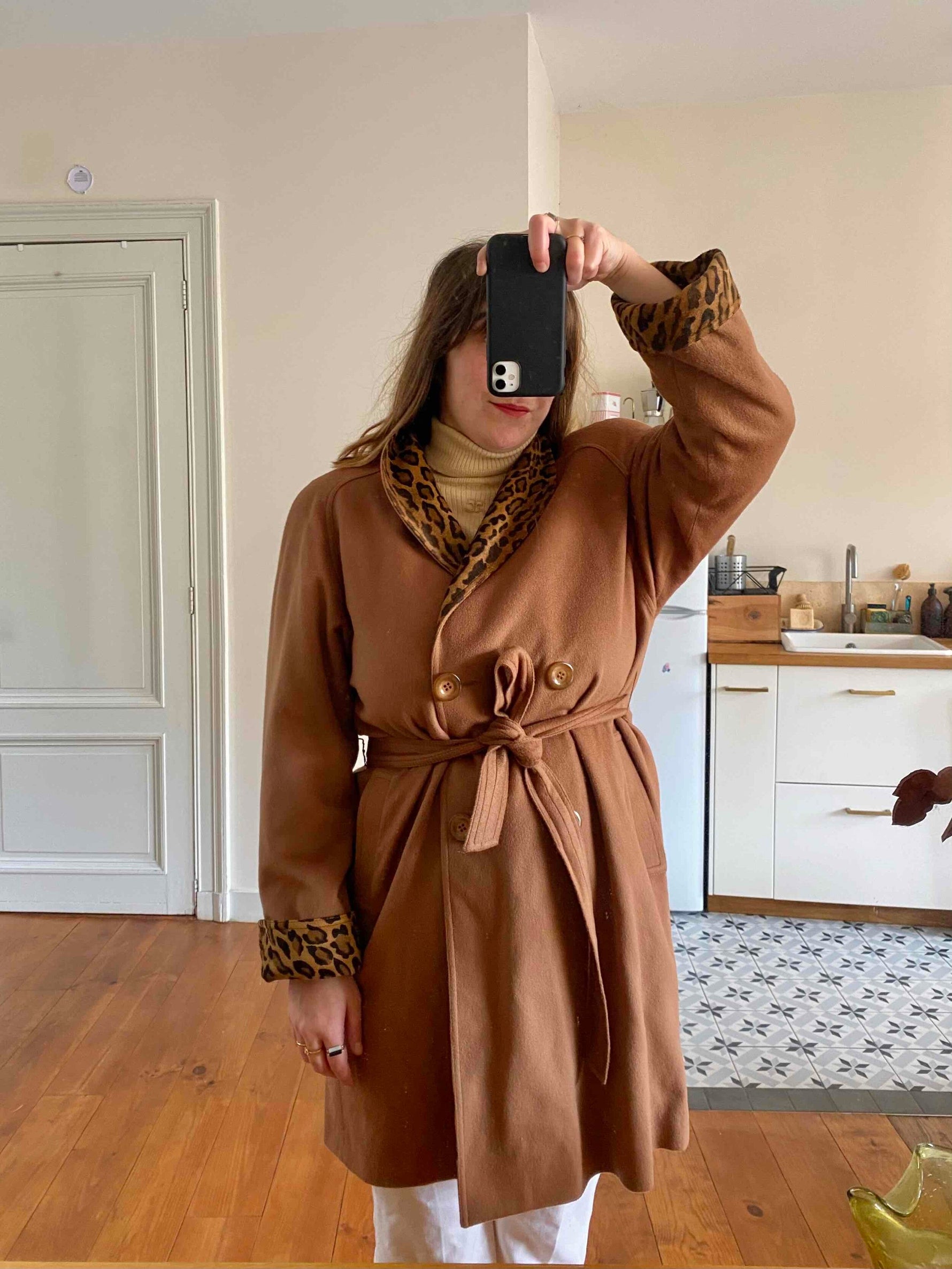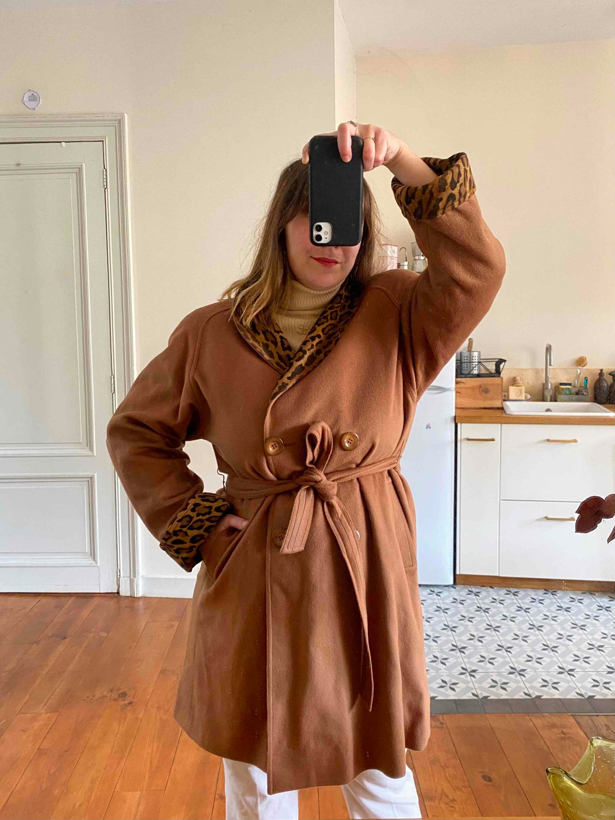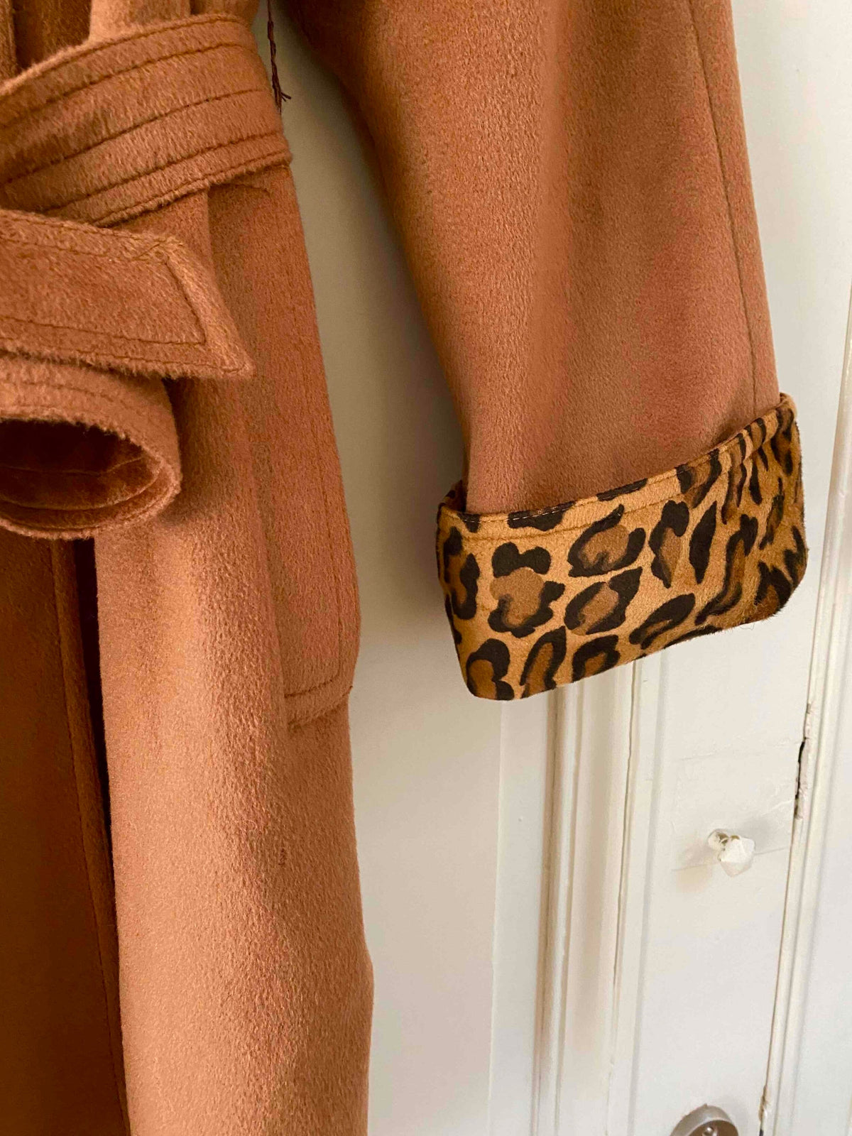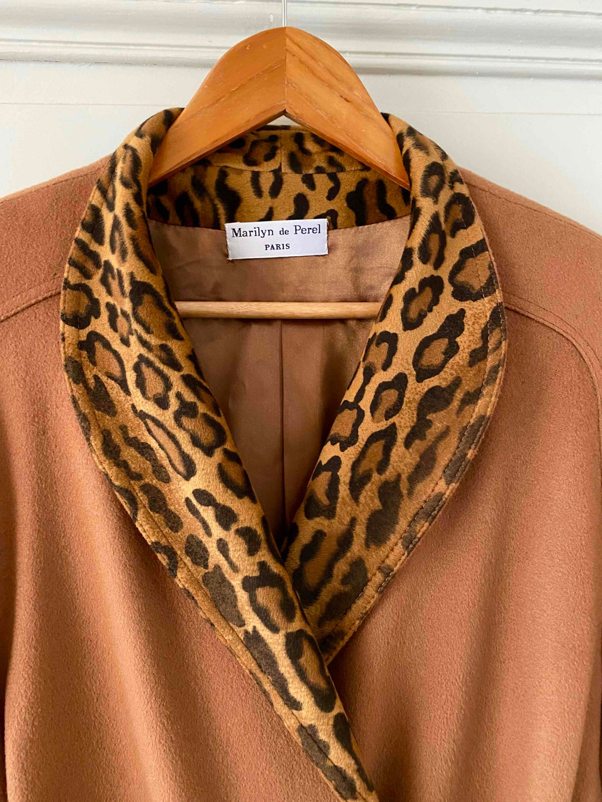 Prix unitaire parManteau léopard en cachemire, 100% cachemire doux caramel, col châle et revers de manches impression léopard, boutonnage croisé et ceinture taille à nouer, fabriqué en France, taille 38 et 40 porté ici sur une personne T40.