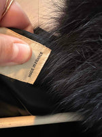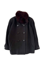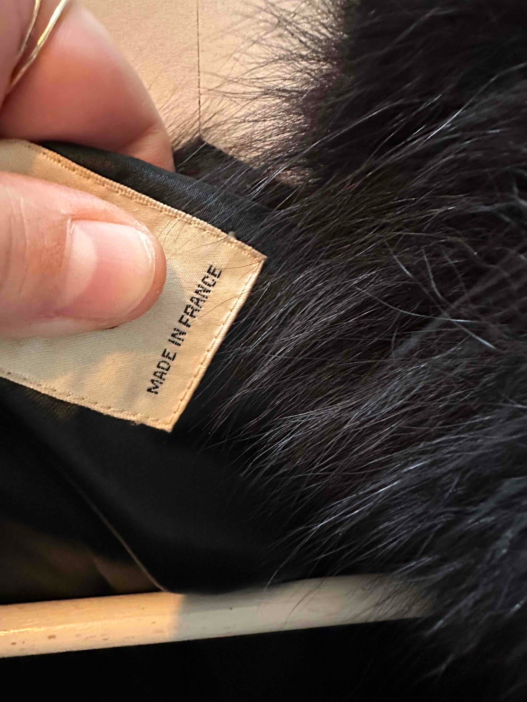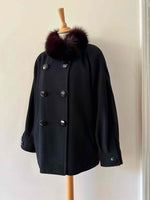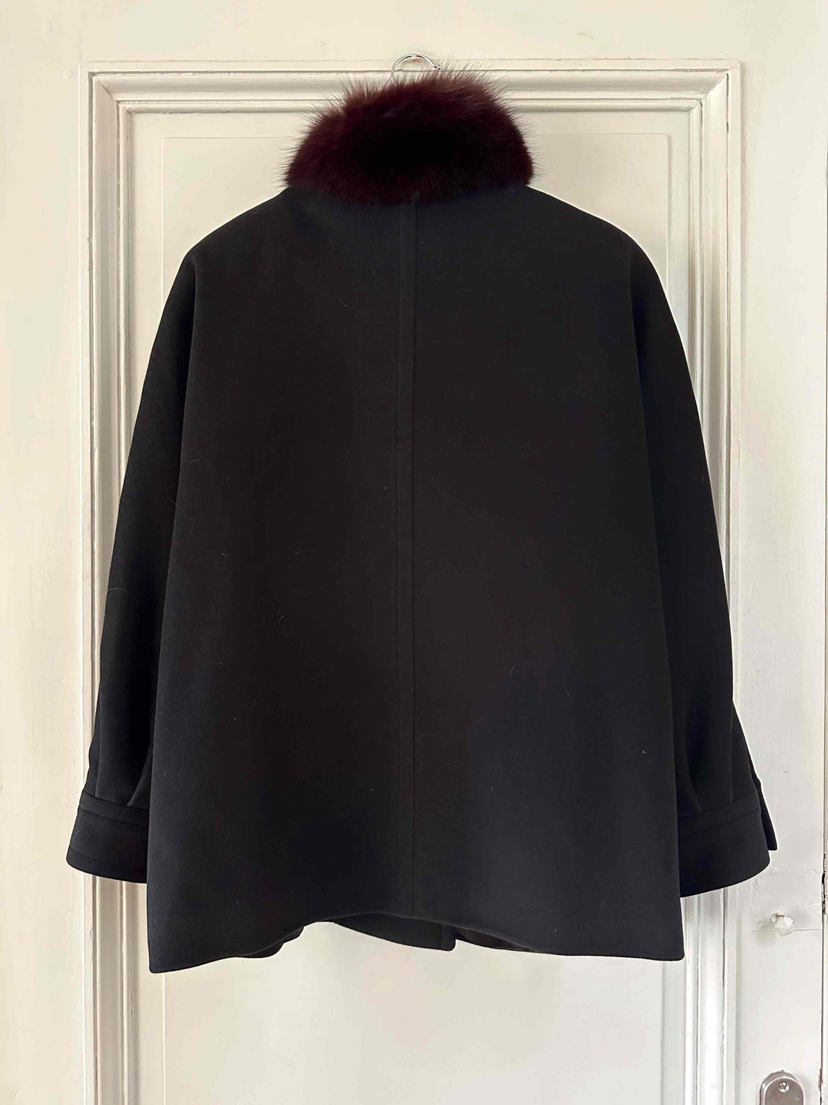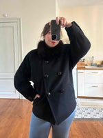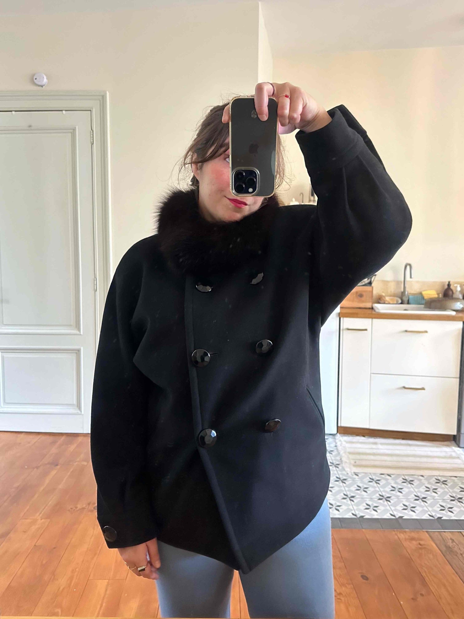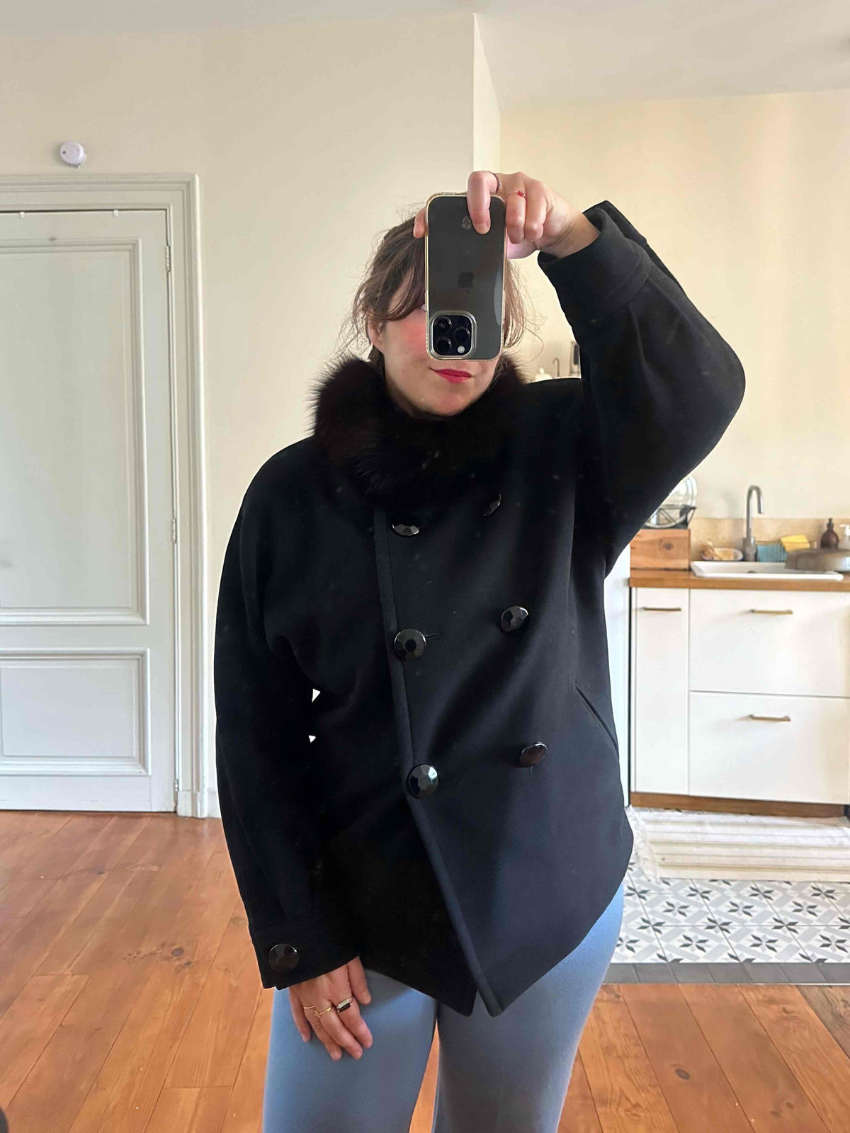 Manteau en cachemire et fourrure, en cachemire et maine noir, col fourrure chocolat, boutonnage croisé par boutons bijoux jaie noir, manches ballons, fabriqué en France, convient aux tailles 36 et 38 porté ici sur un mannequin T36 et serré sur une personne T40.