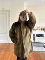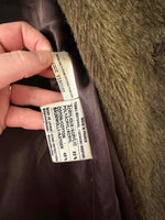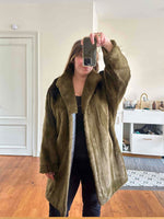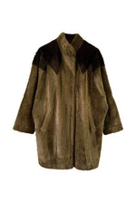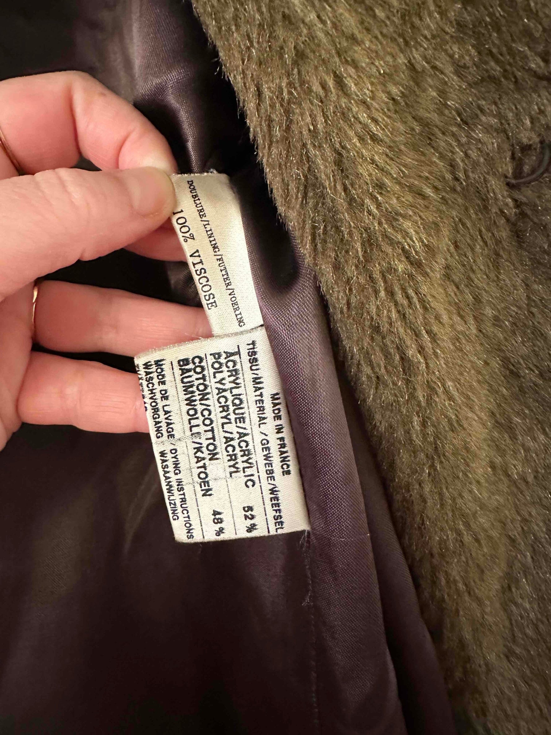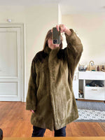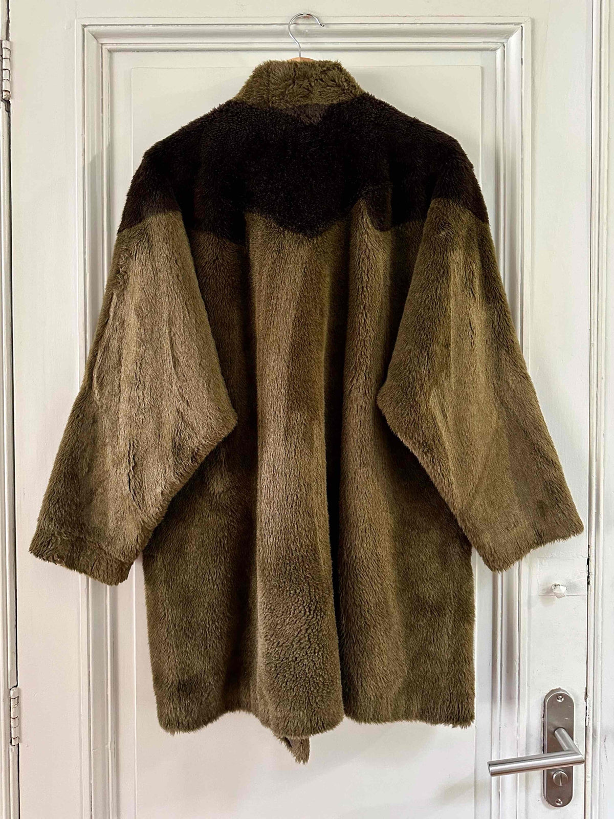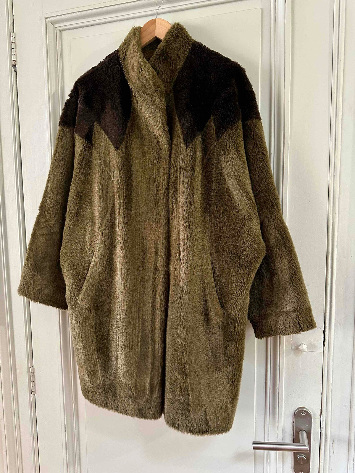 Prix unitaire parManteau en fausse fourrure, fausse fourrure vert olive et empiecement chevrons chocolat, manches chauve-souris, fermoir à crochets, fabriquée en France, convient aux tailles 38 et 40 portée ici sur une personne T40.