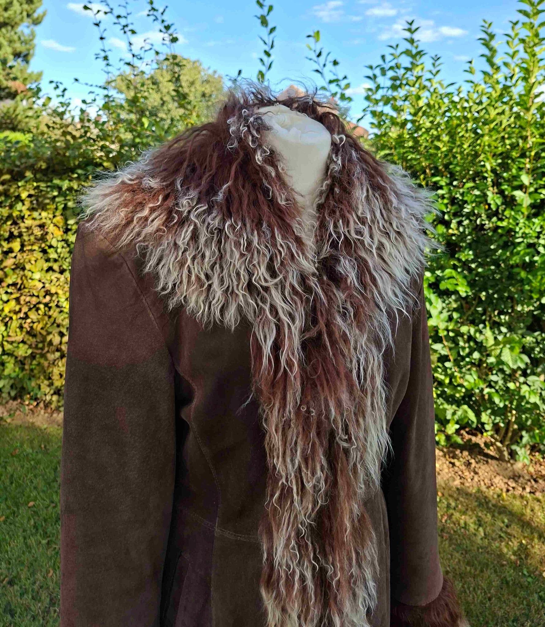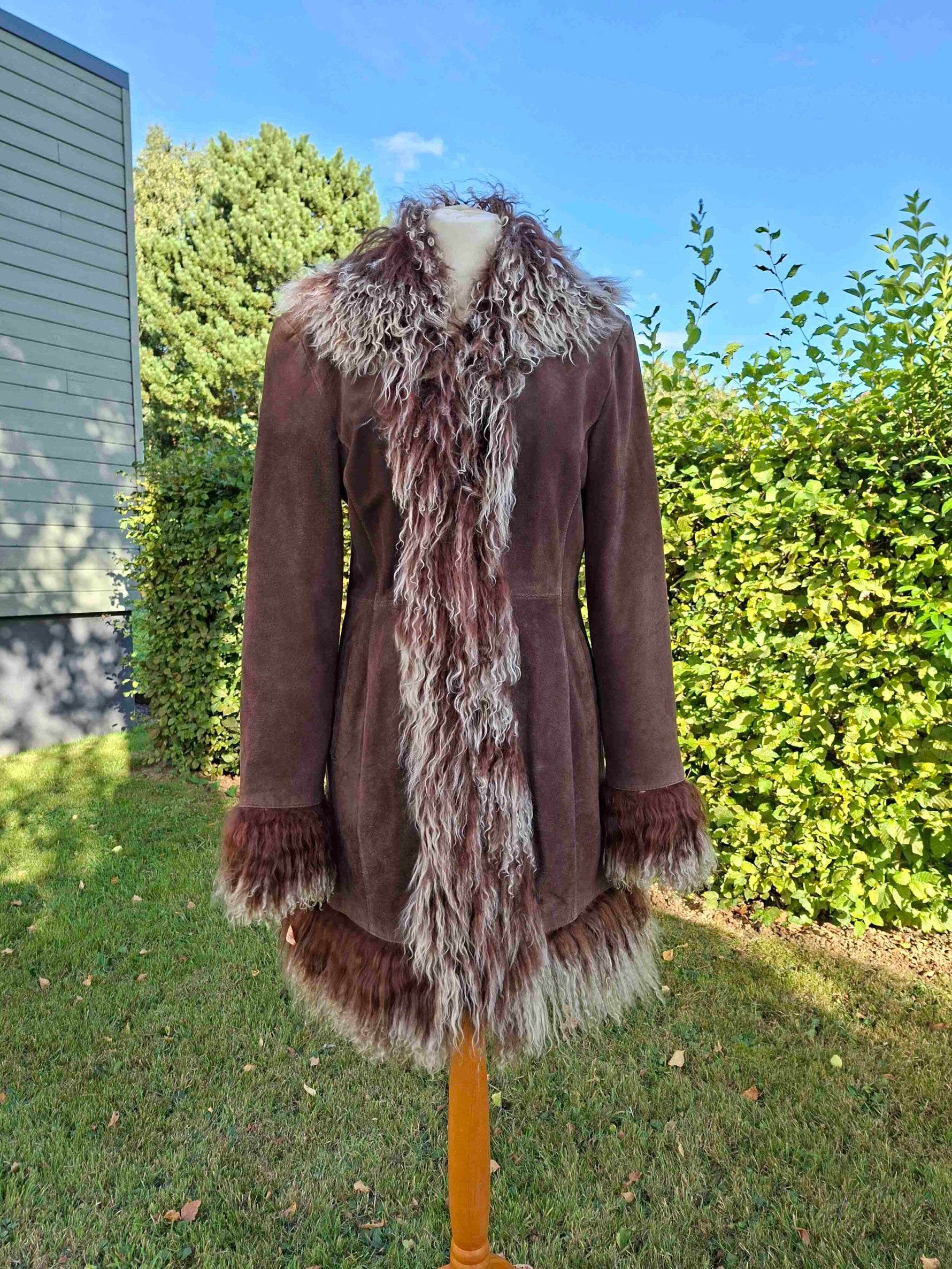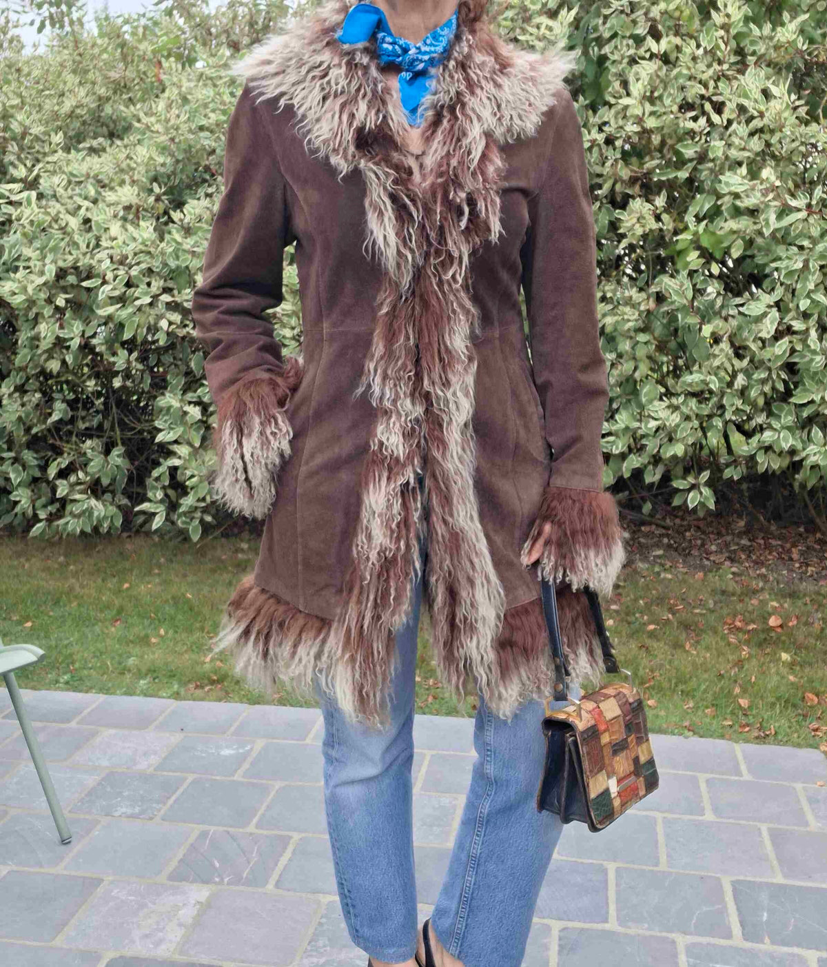 Prix unitaire parManteau style afghan vintage 70’s penny lane avec fourrure de mouton marron/écru sur le col,les poignets et le long de l’ouverture