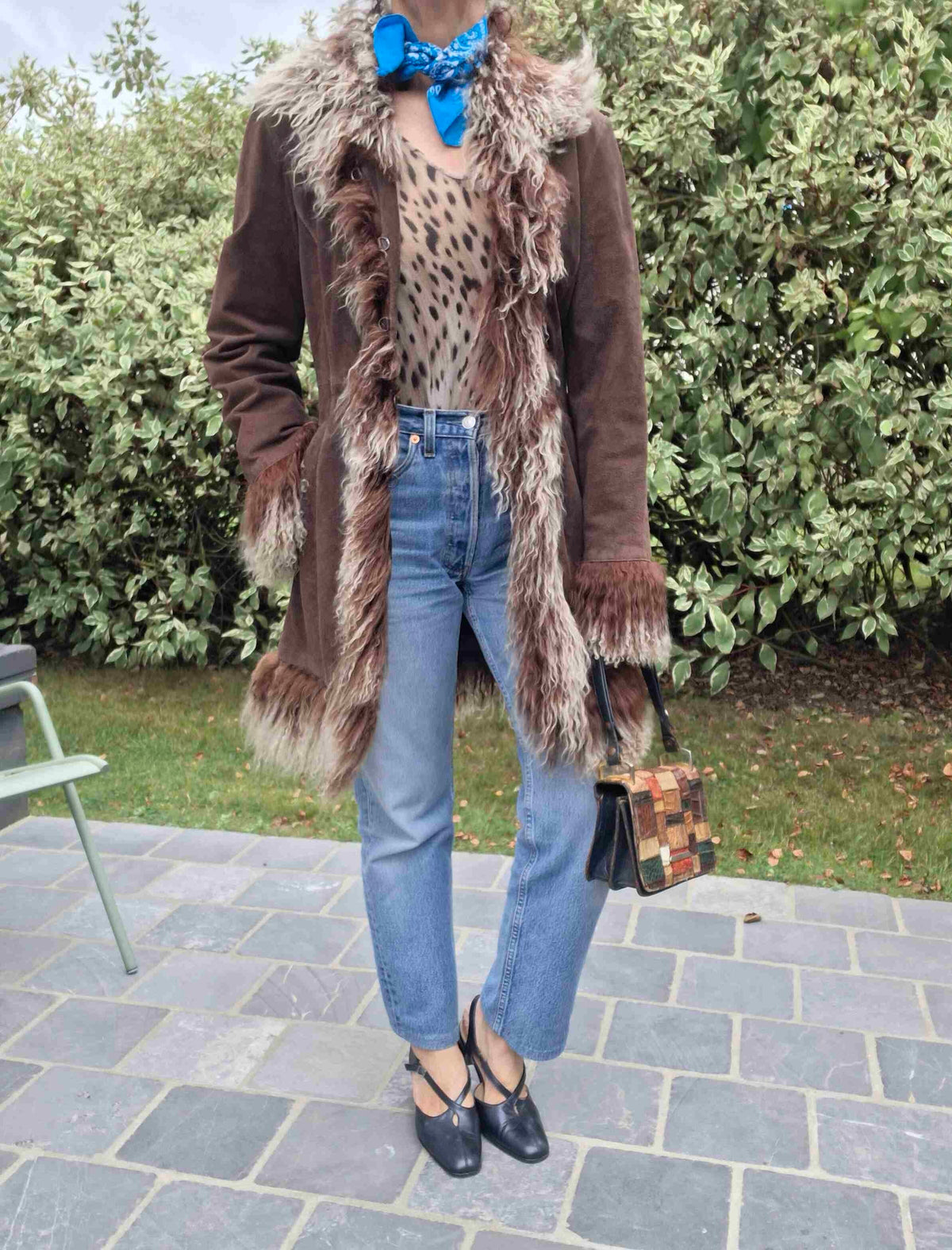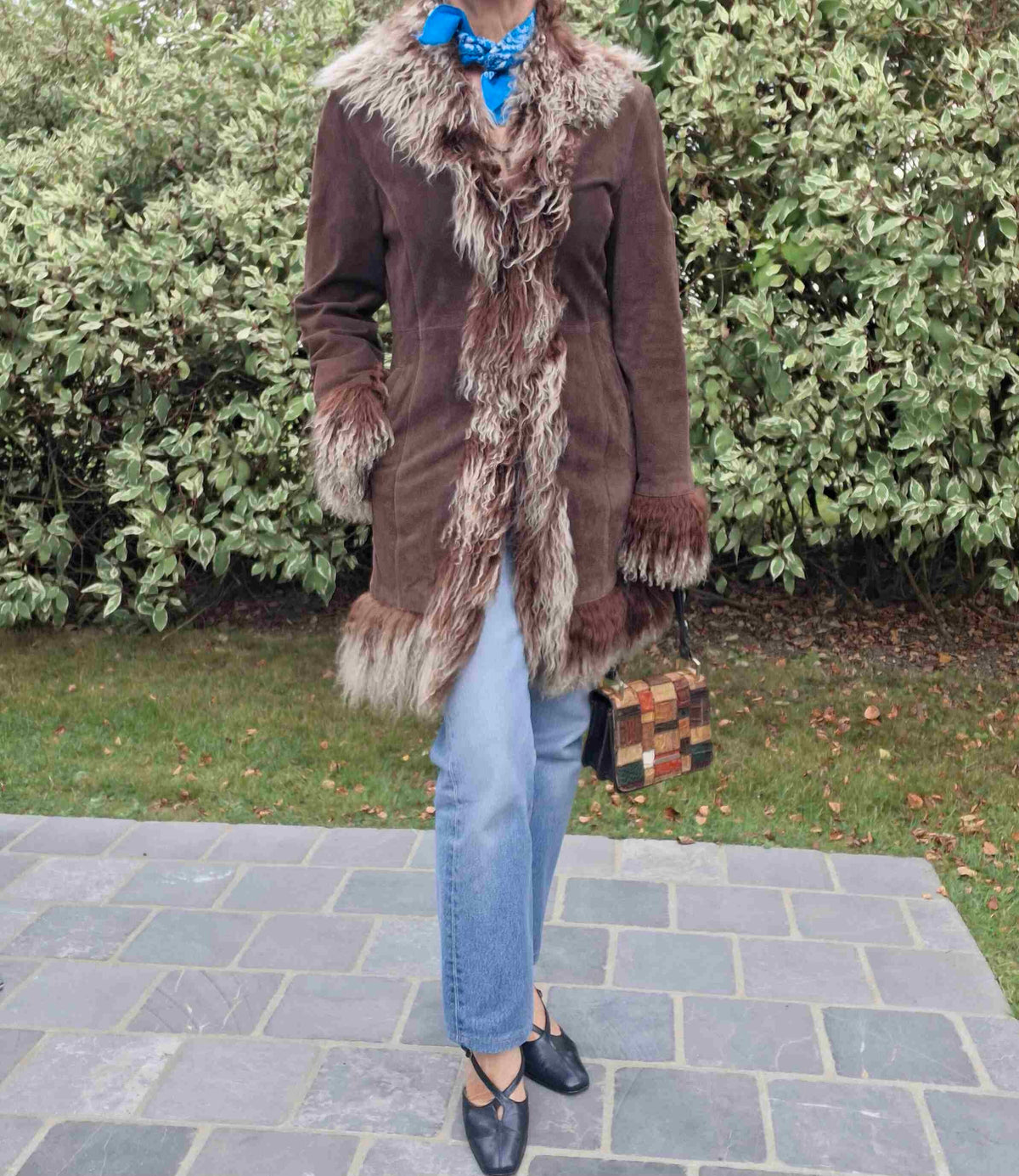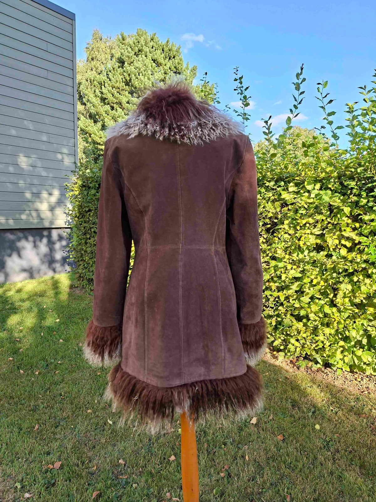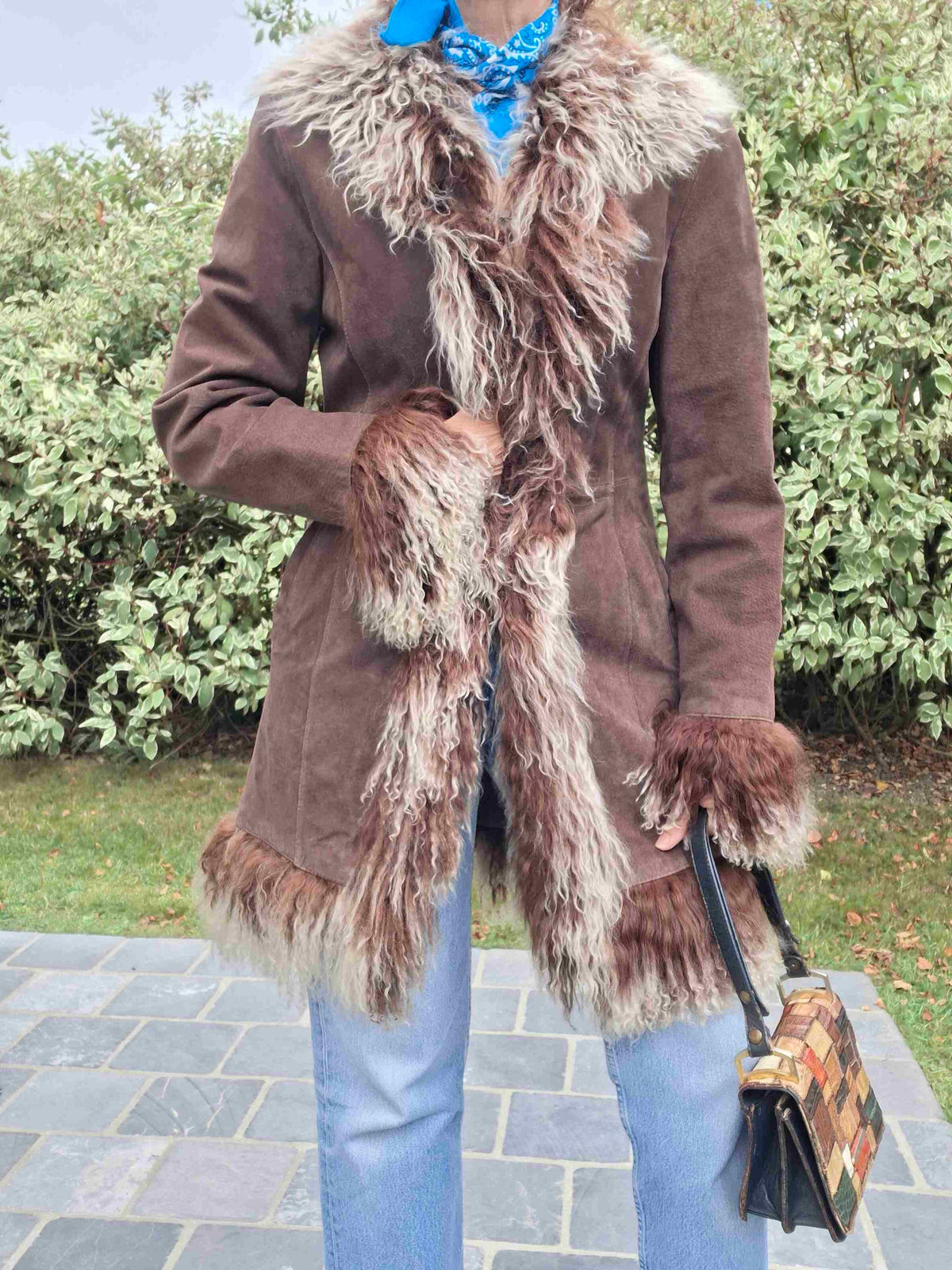 Prix unitaire parManteau style afghan vintage 70’s penny lane avec fourrure de mouton marron/écru sur le col,les poignets et le long de l’ouverture