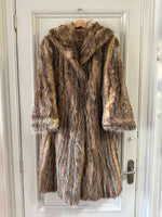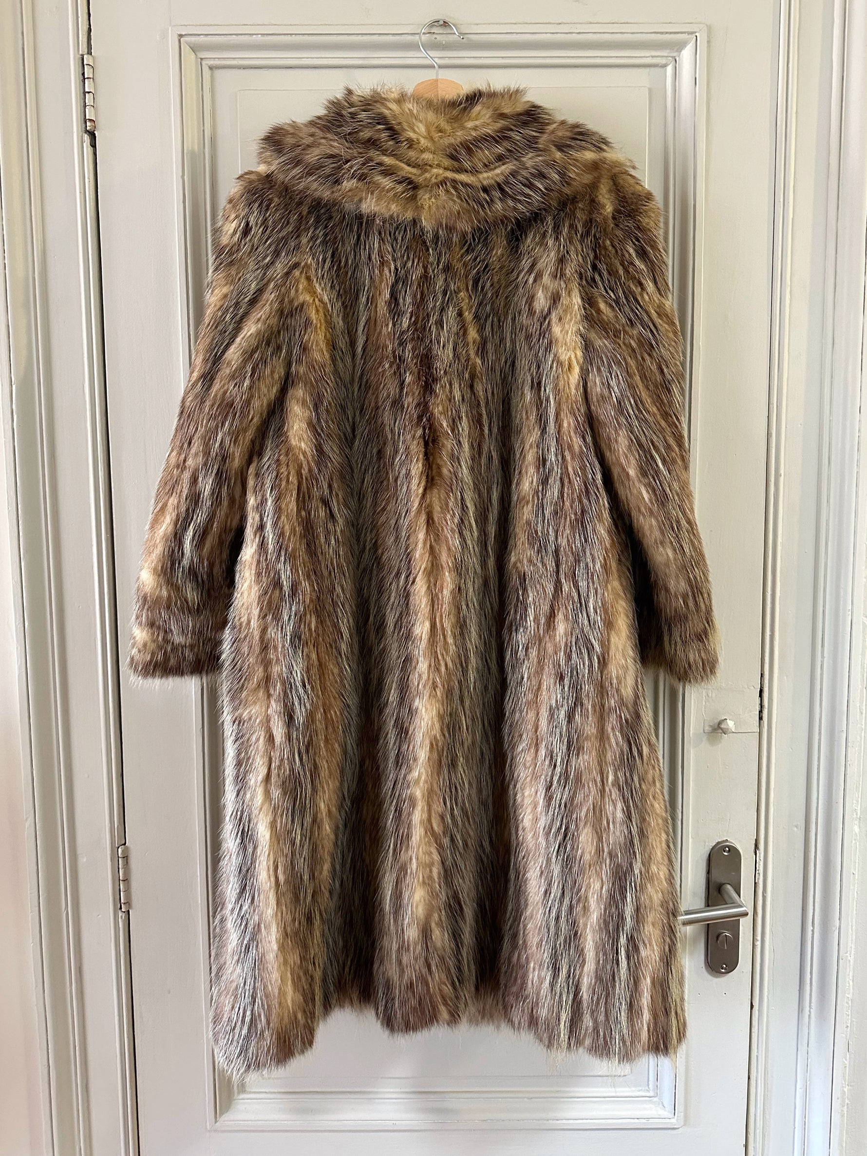 Fourrure de renard argenté, couleur chiné fauuve, argenté et écru, fermeture par crochets, fabriquée en France, convient aux tailles 38 et 40 porté ici sur une personne T40 et sur un mannequin T36. Aisselles 50cm, longueur 118cm.