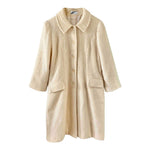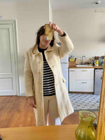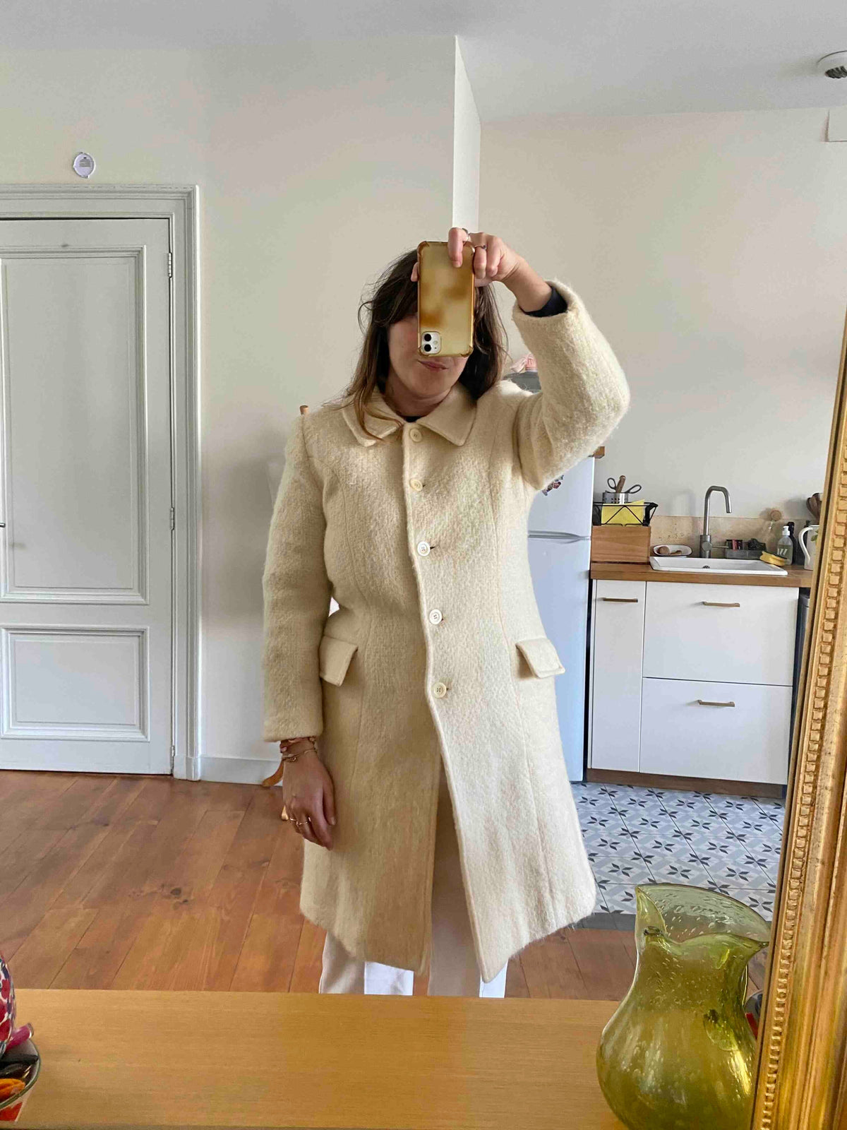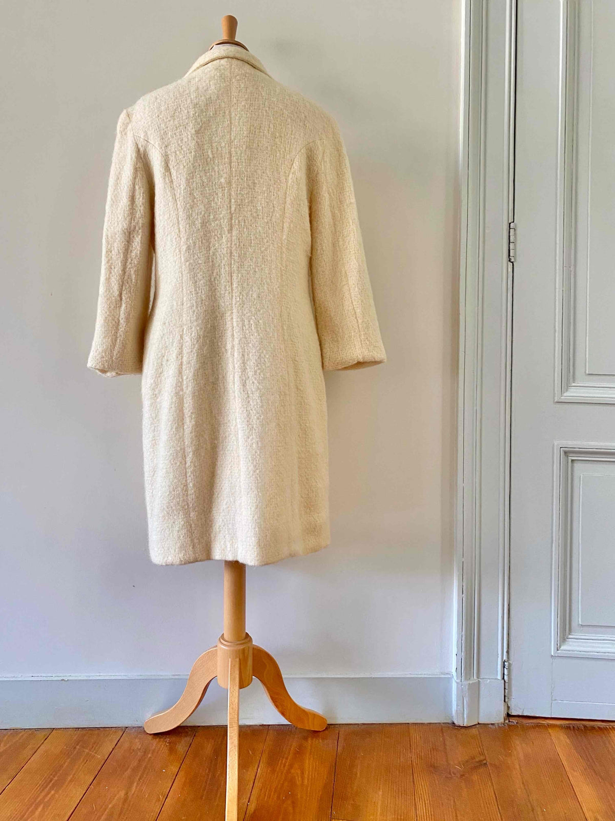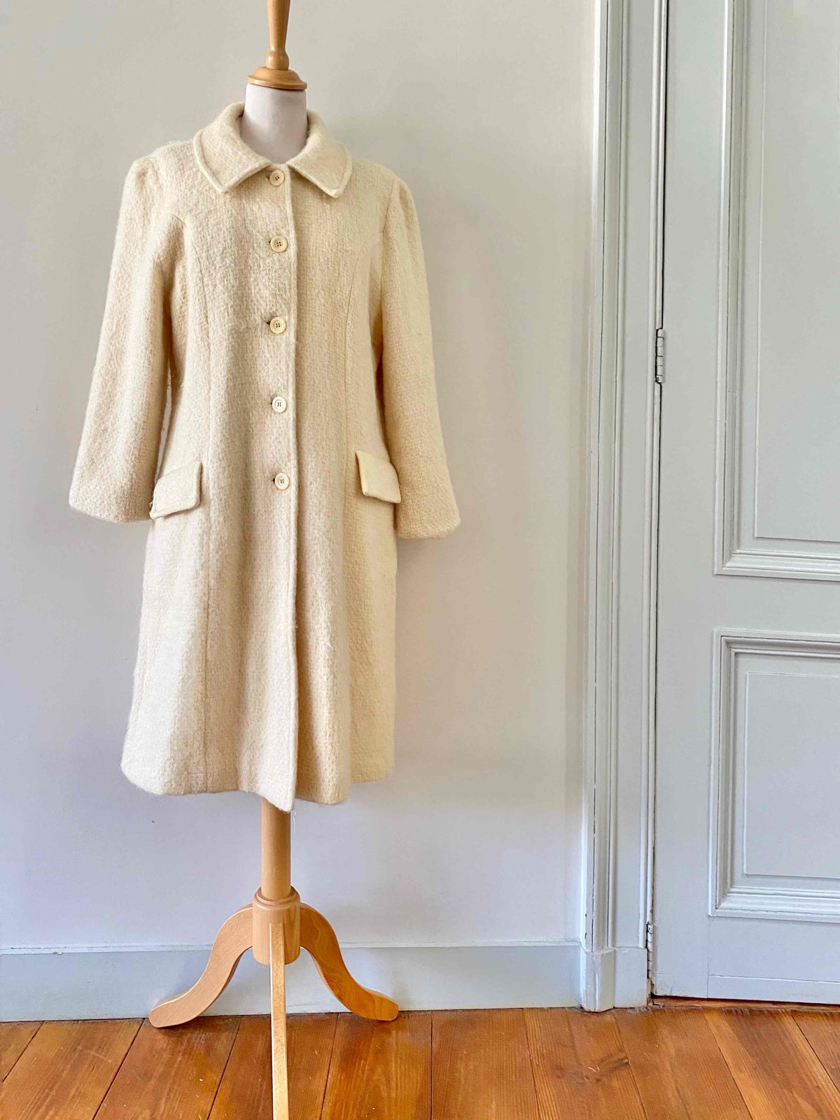 Prix unitaire parManteau en laine 70’s et mohair écru, col claudine, tweed fluffly, fabriqué en Espagne, taille 38 porté ici sur un mannequin T36 et une personne T40.