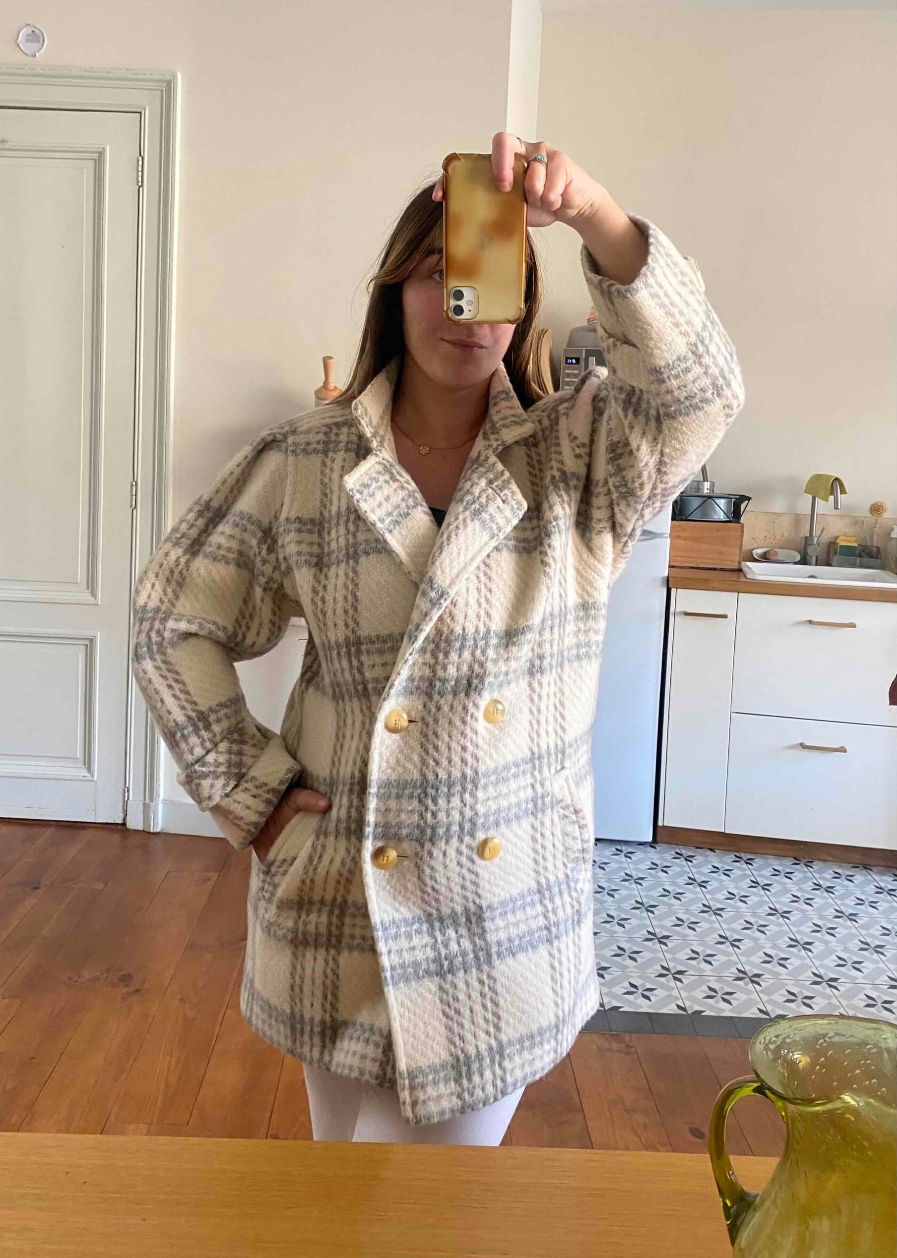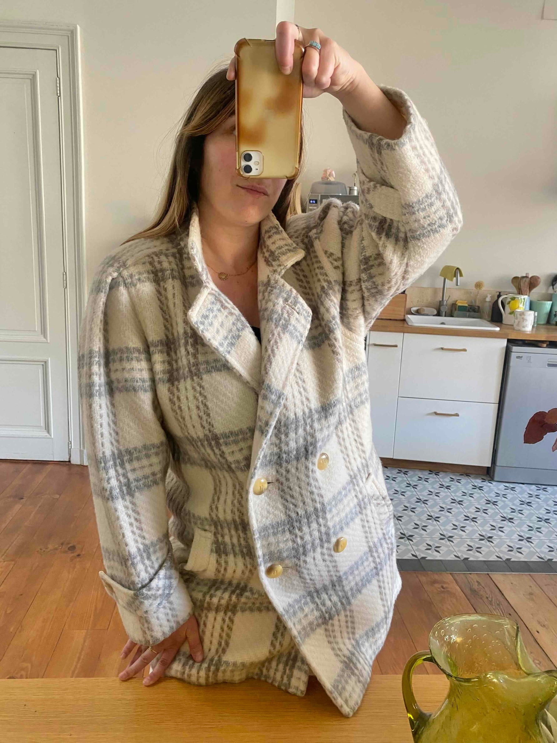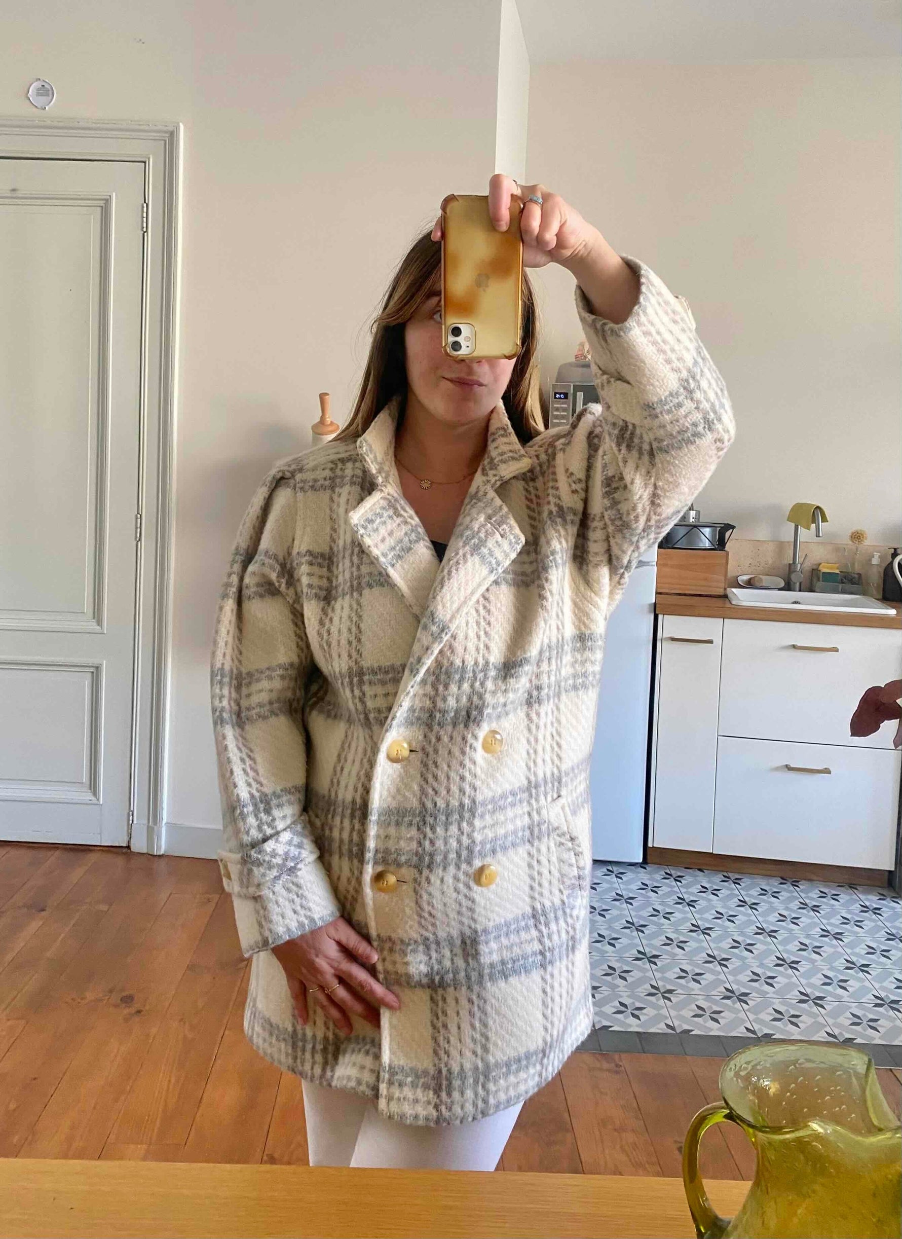 Prix unitaire parManteau en laine à carreaux Prince-de-Galles écru, beige et gris, boutonnage croisé avec col à ouvrir ou fermer, forme mi-longue, manches ballons, taille 38 et 40 porté ici sur une personne T40.