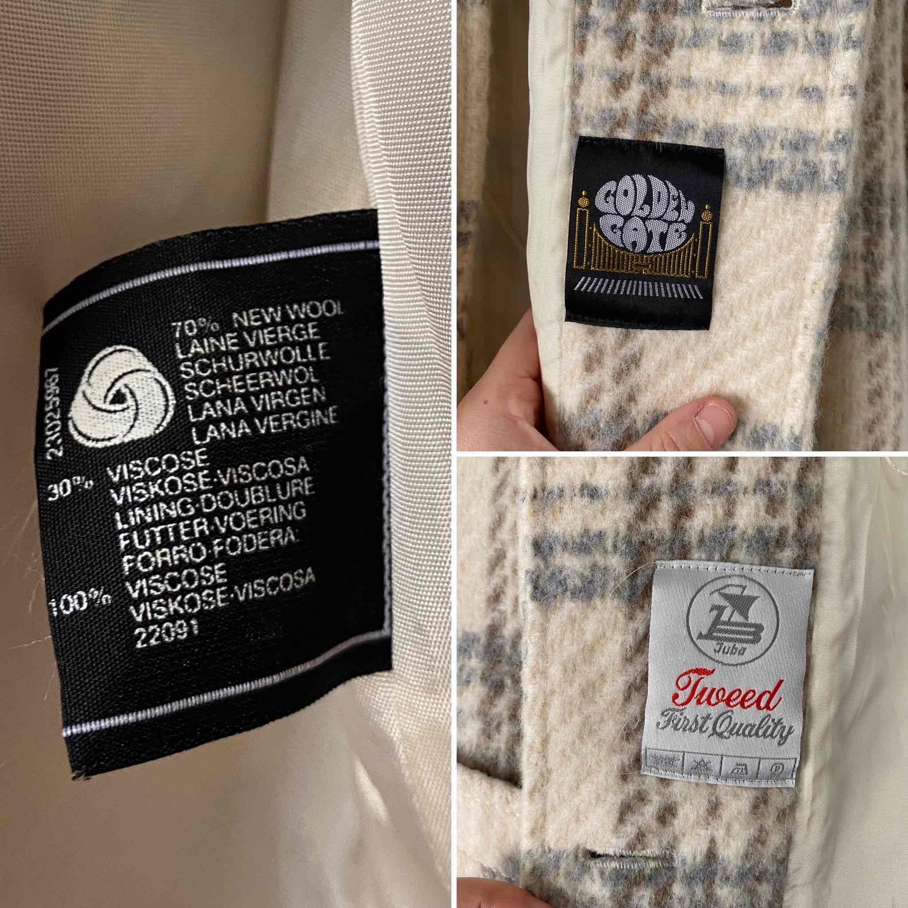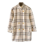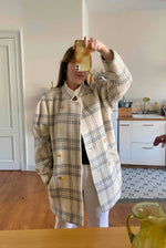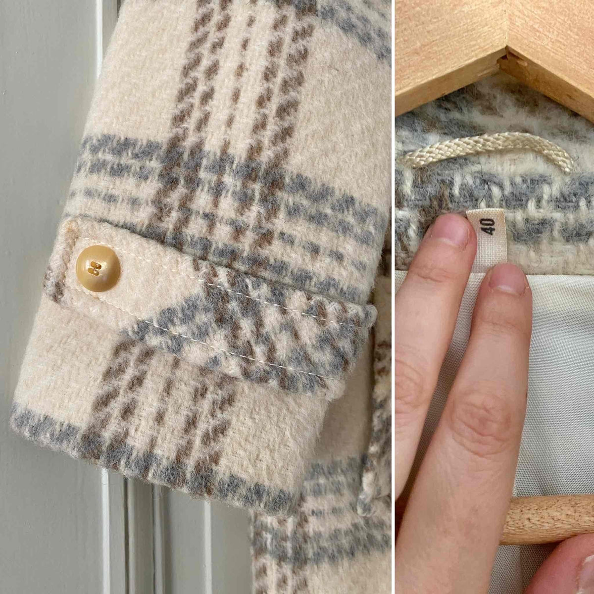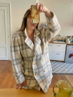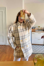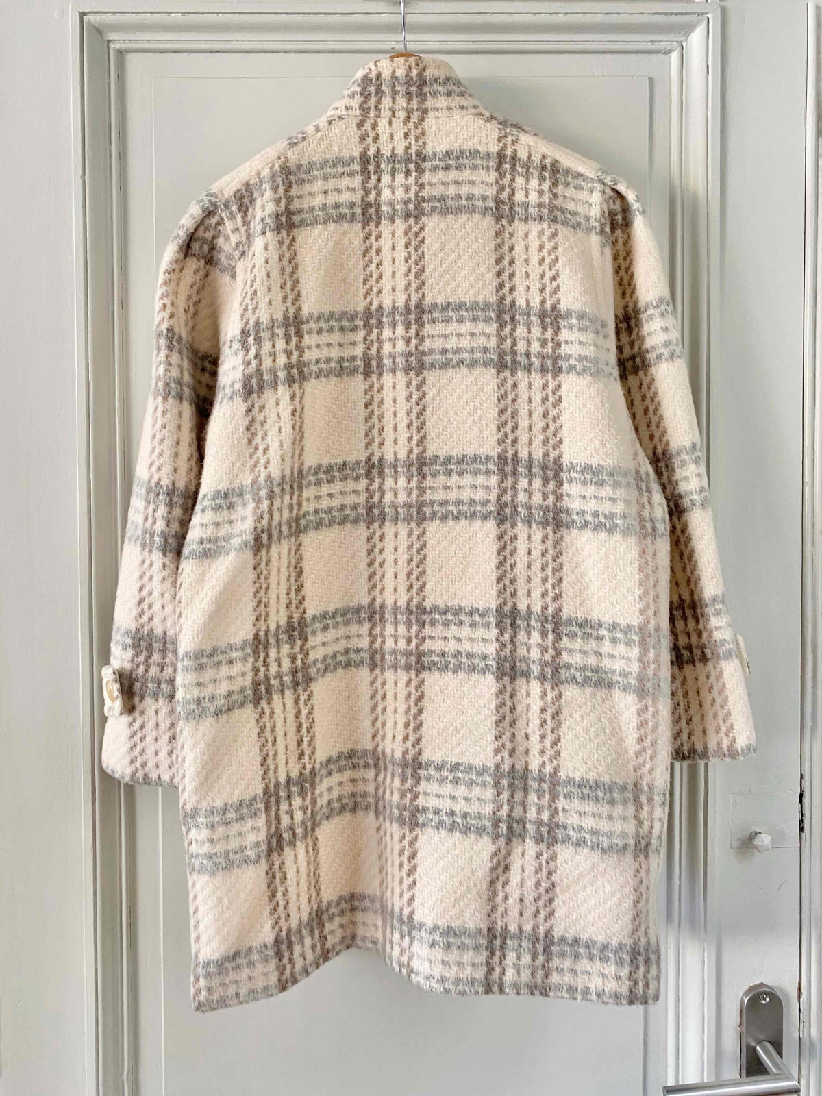 Prix unitaire parManteau en laine à carreaux Prince-de-Galles écru, beige et gris, boutonnage croisé avec col à ouvrir ou fermer, forme mi-longue, manches ballons, taille 38 et 40 porté ici sur une personne T40.