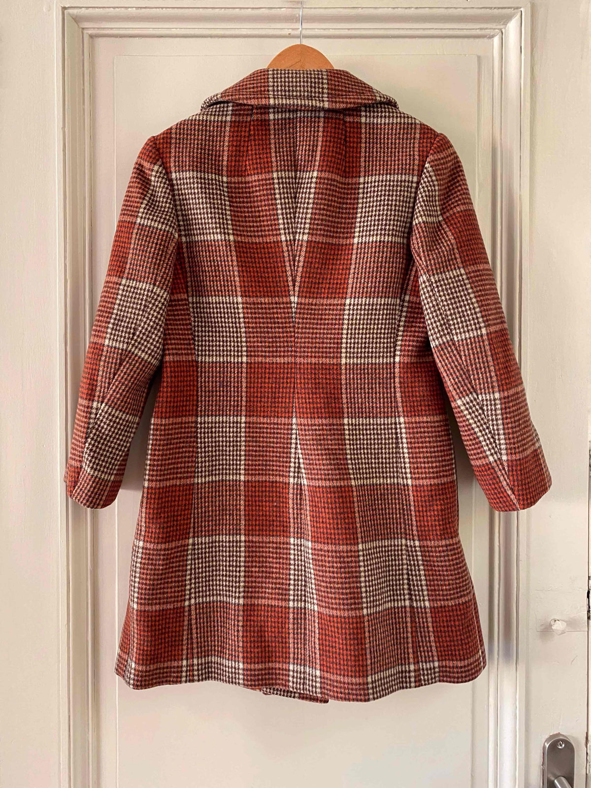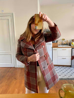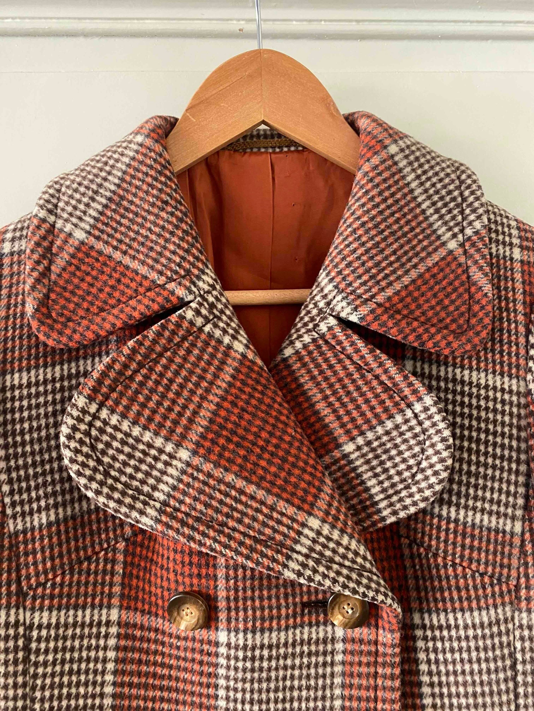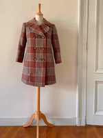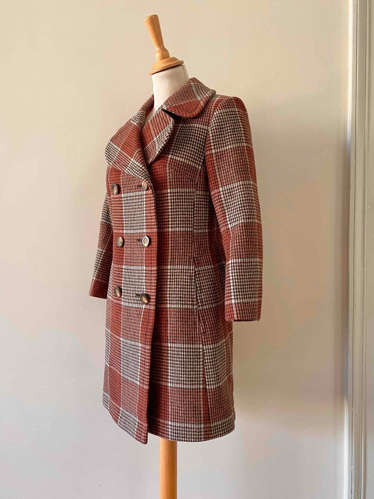 Prix unitaire parManteau en laine, 70’s, à carreaux, prince-de-Galles, terracotta. Chocolat et écrus, boutonnages croisé et grand col rond.