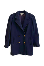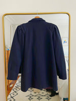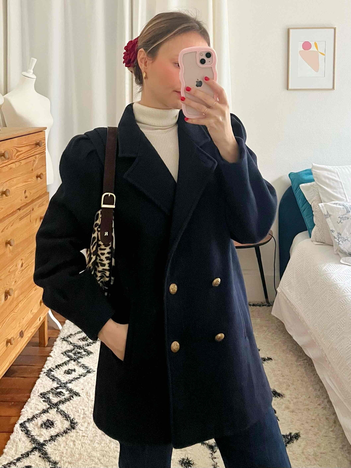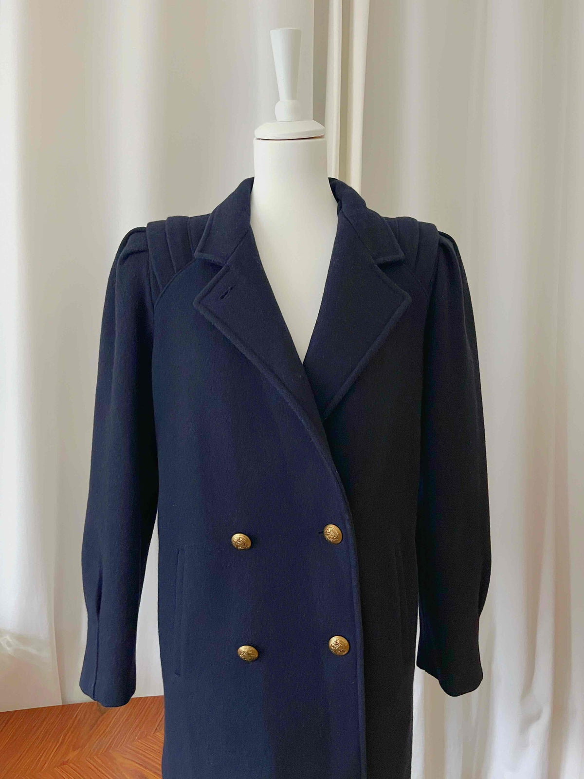 Prix unitaire parManteau en laine, bleu marine, bouton dorés, épaules structurées, encolure en V, portée ici sur une T36 pour 1m64