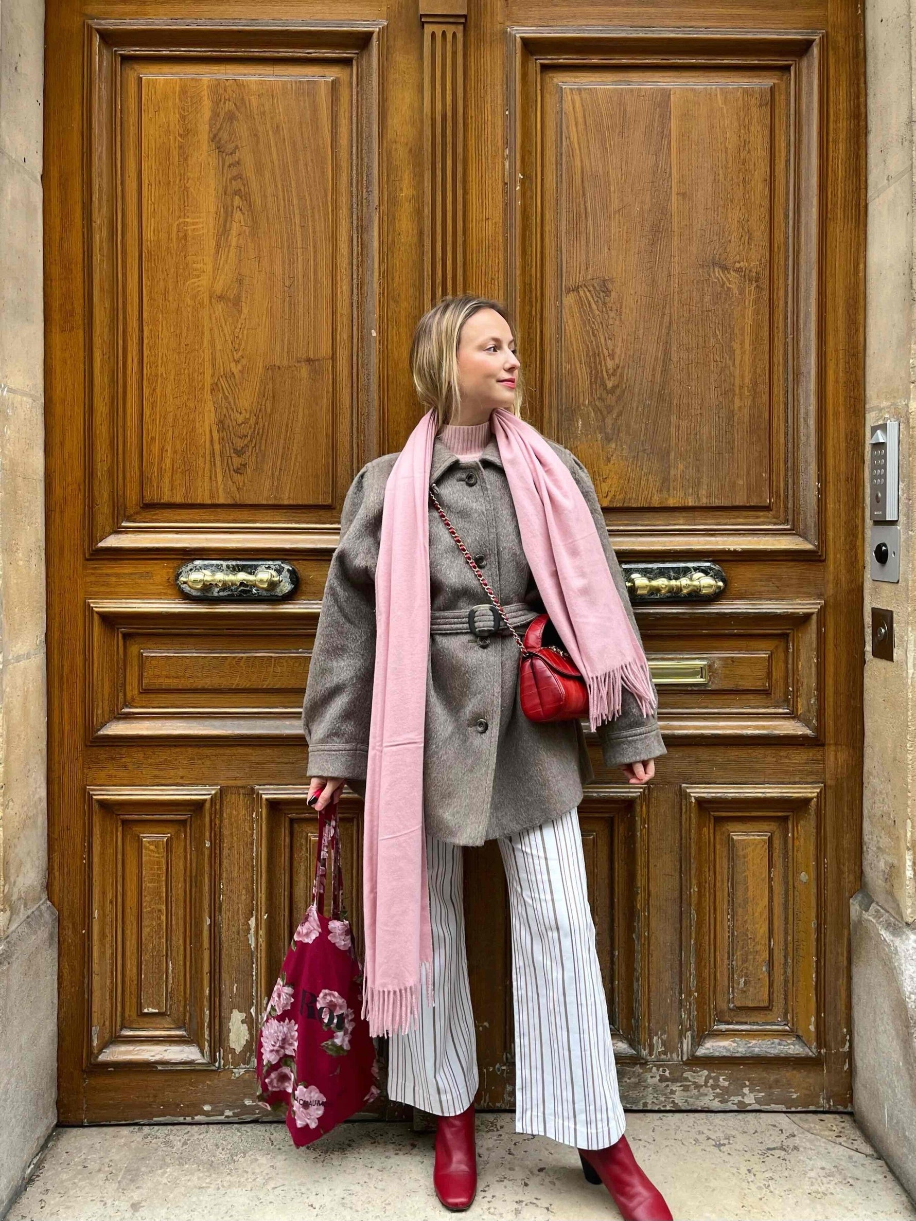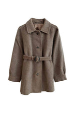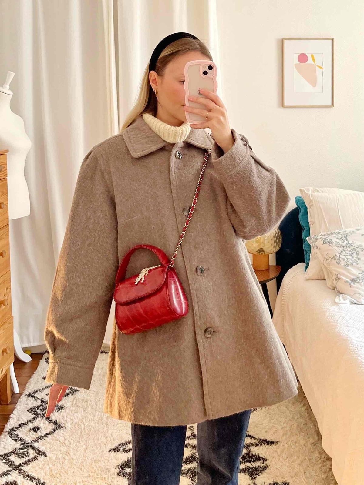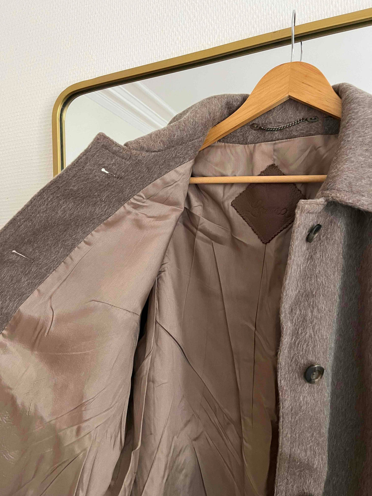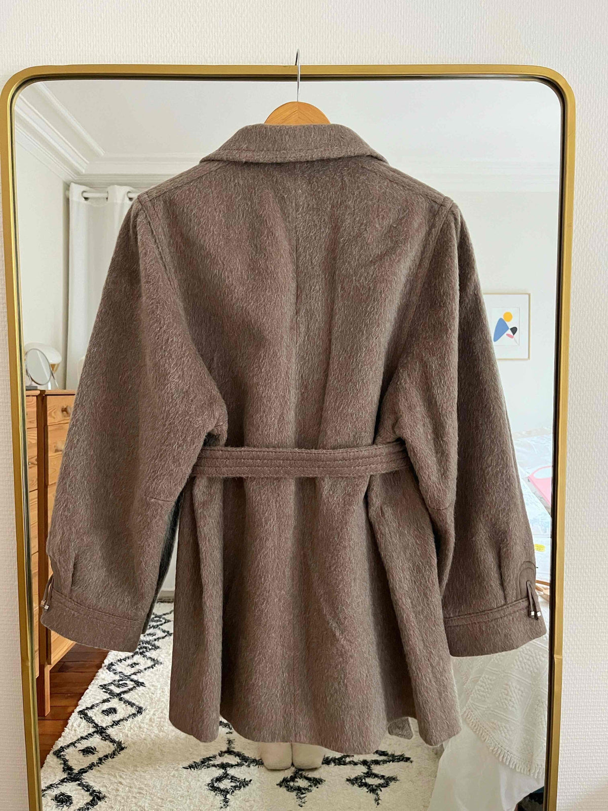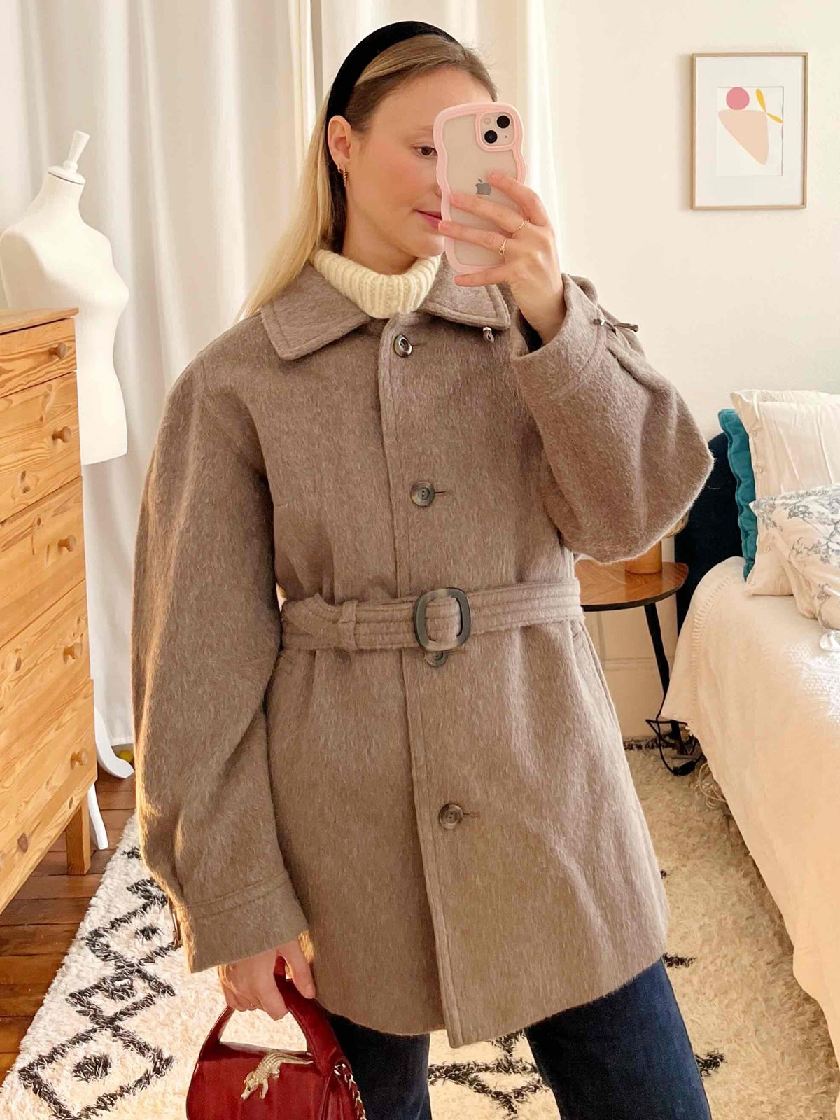 Prix unitaire parManteau en laine, gris, boutonné sur le devant, ceinturé à la taille, deux poches, laine de Lama, porté ici sur une T36 pour 1m64 de façon oversize