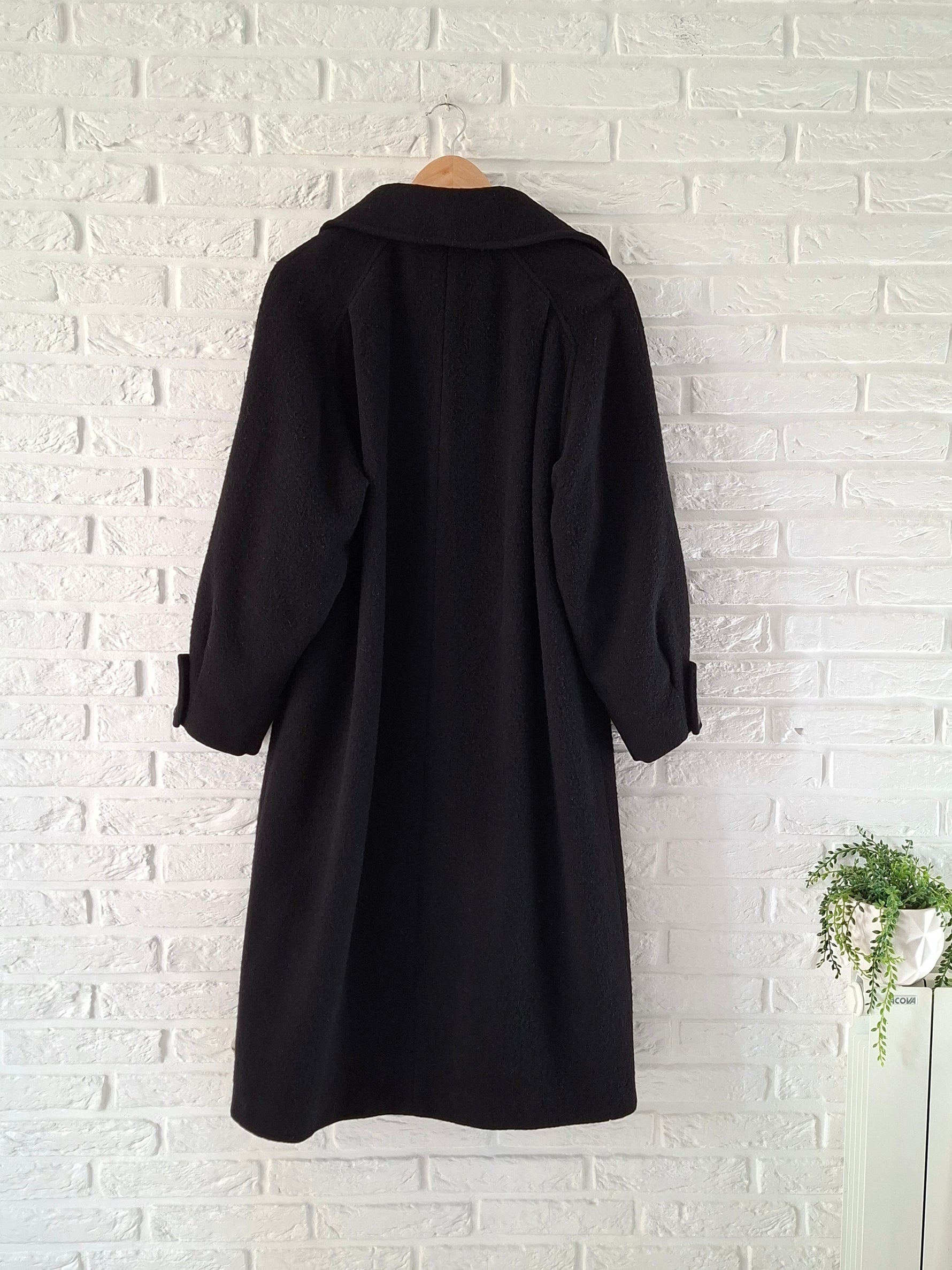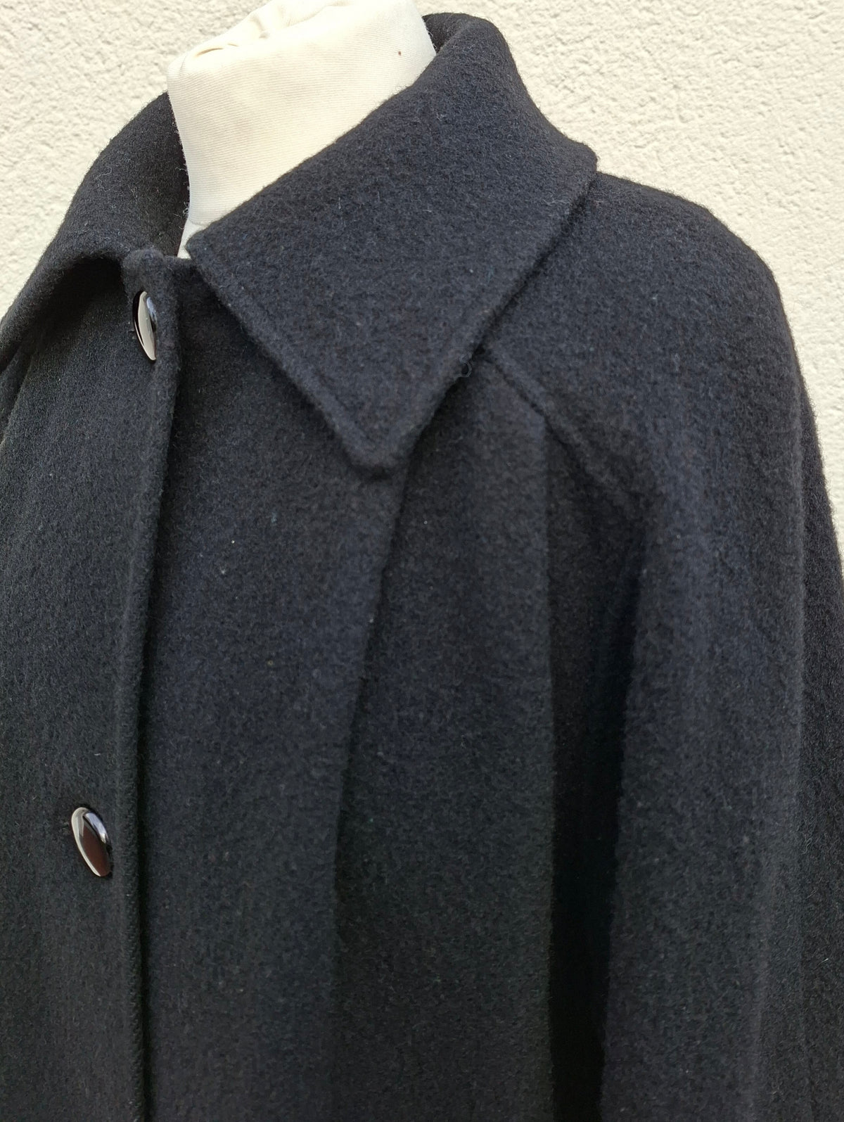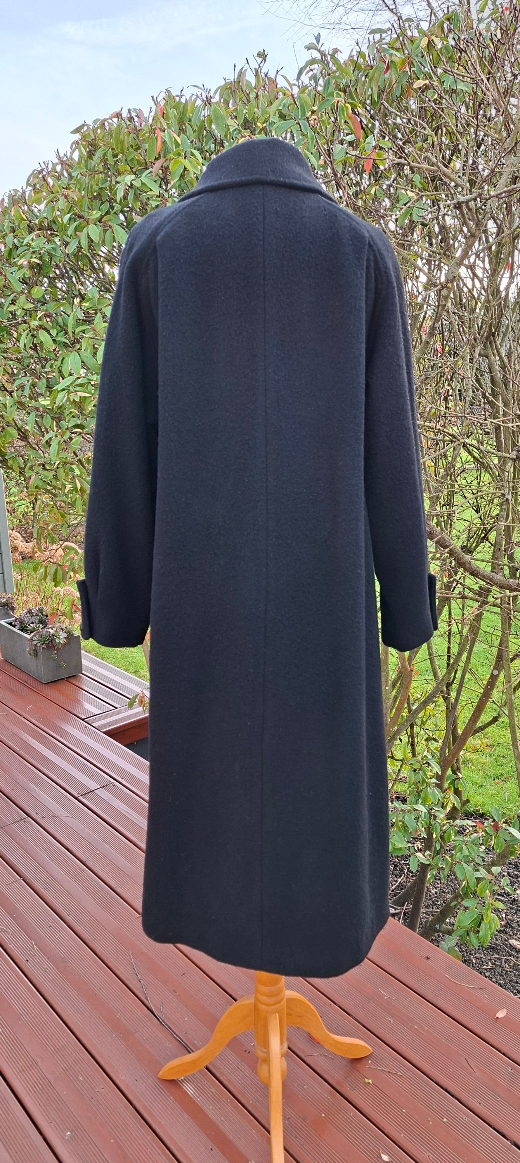 Prix unitaire parManteau en laine noir woolmark Made in England. Manches ballons avec détail couture sur les poignets. Doublé. 2 poches. Emmanchures raglan. Fronces sur le haut du manteau. Porté par Patricia qui fait une taille 40. Aisselles 56cm Longueur 110cm.