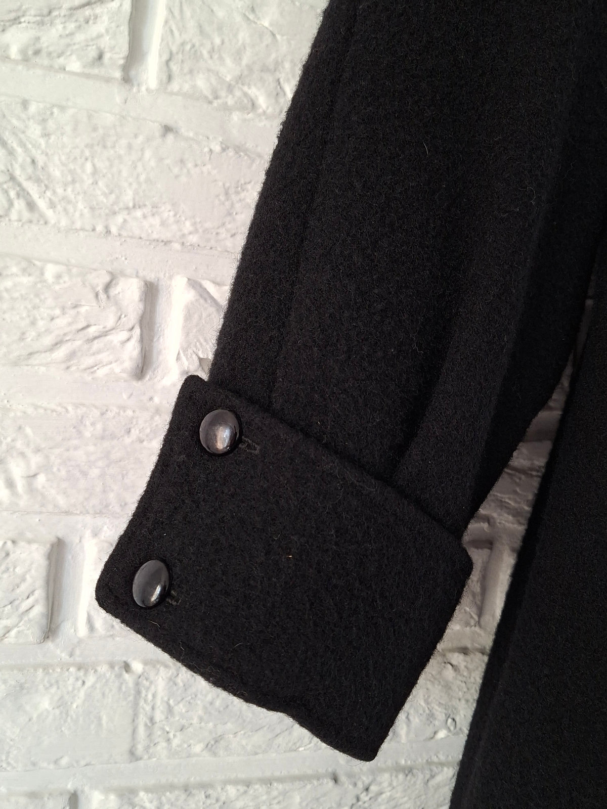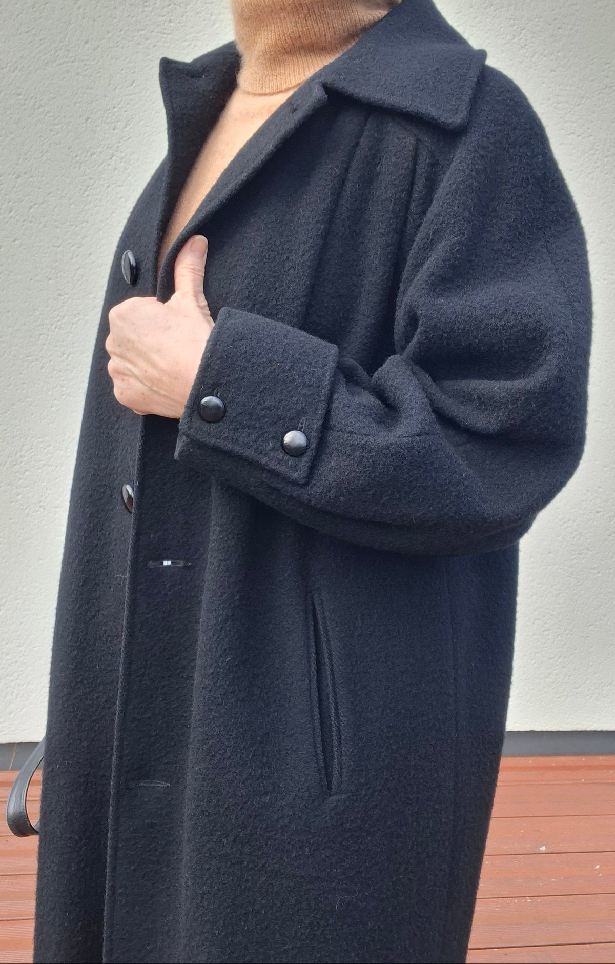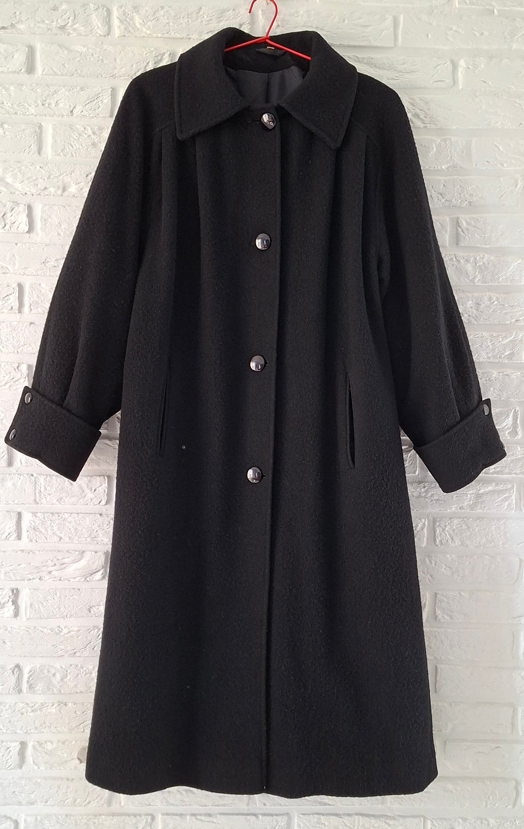 Prix unitaire parManteau en laine noir woolmark Made in England. Manches ballons avec détail couture sur les poignets. Doublé. 2 poches. Emmanchures raglan. Fronces sur le haut du manteau. Porté par Patricia qui fait une taille 40. Aisselles 56cm Longueur 110cm.
