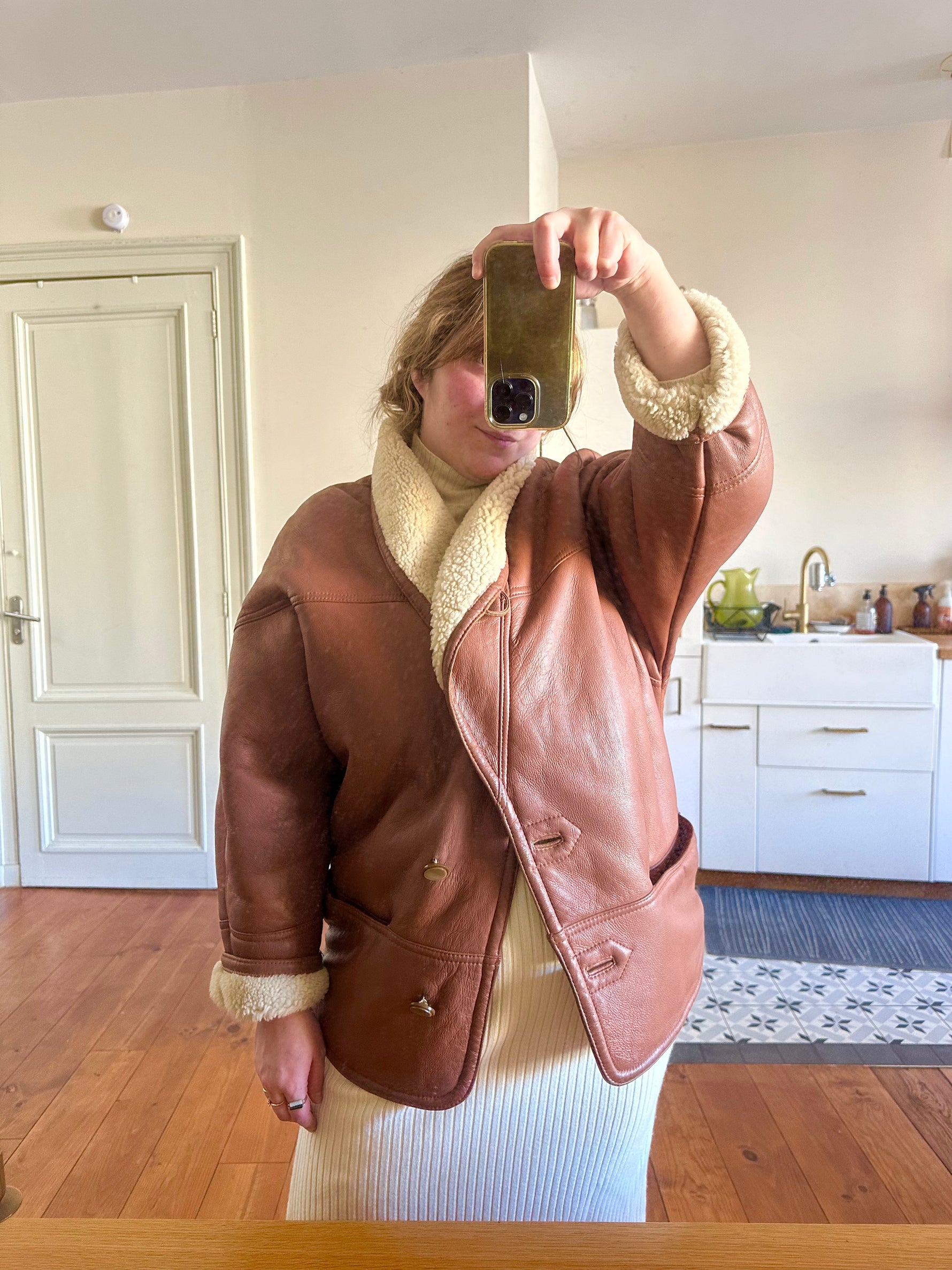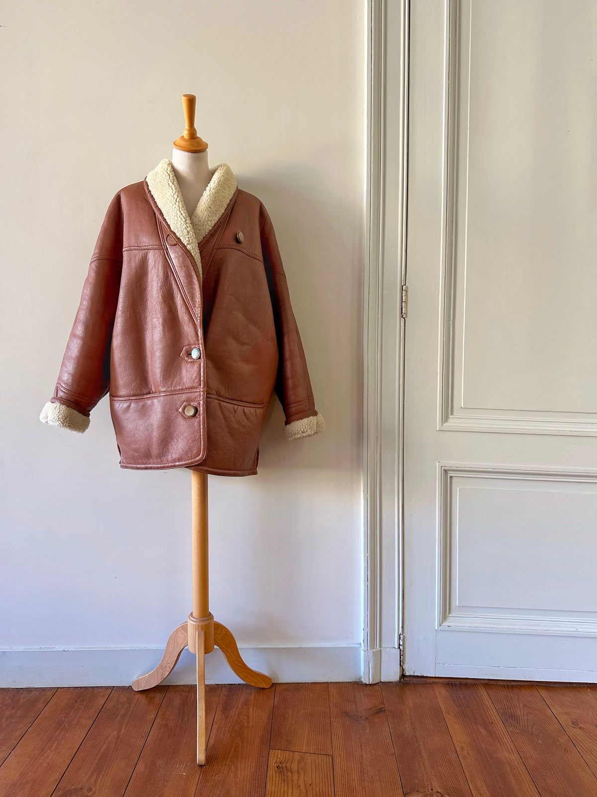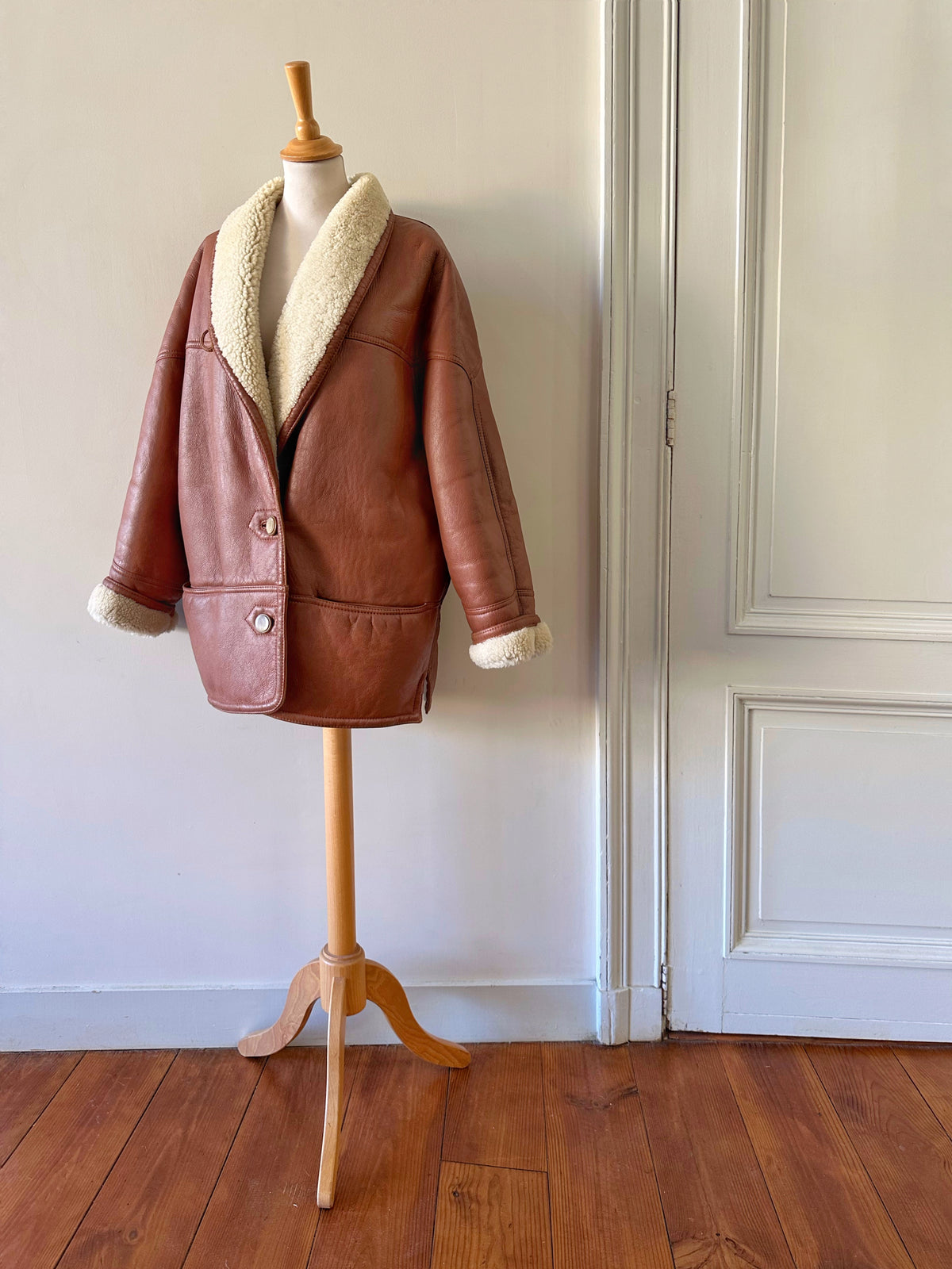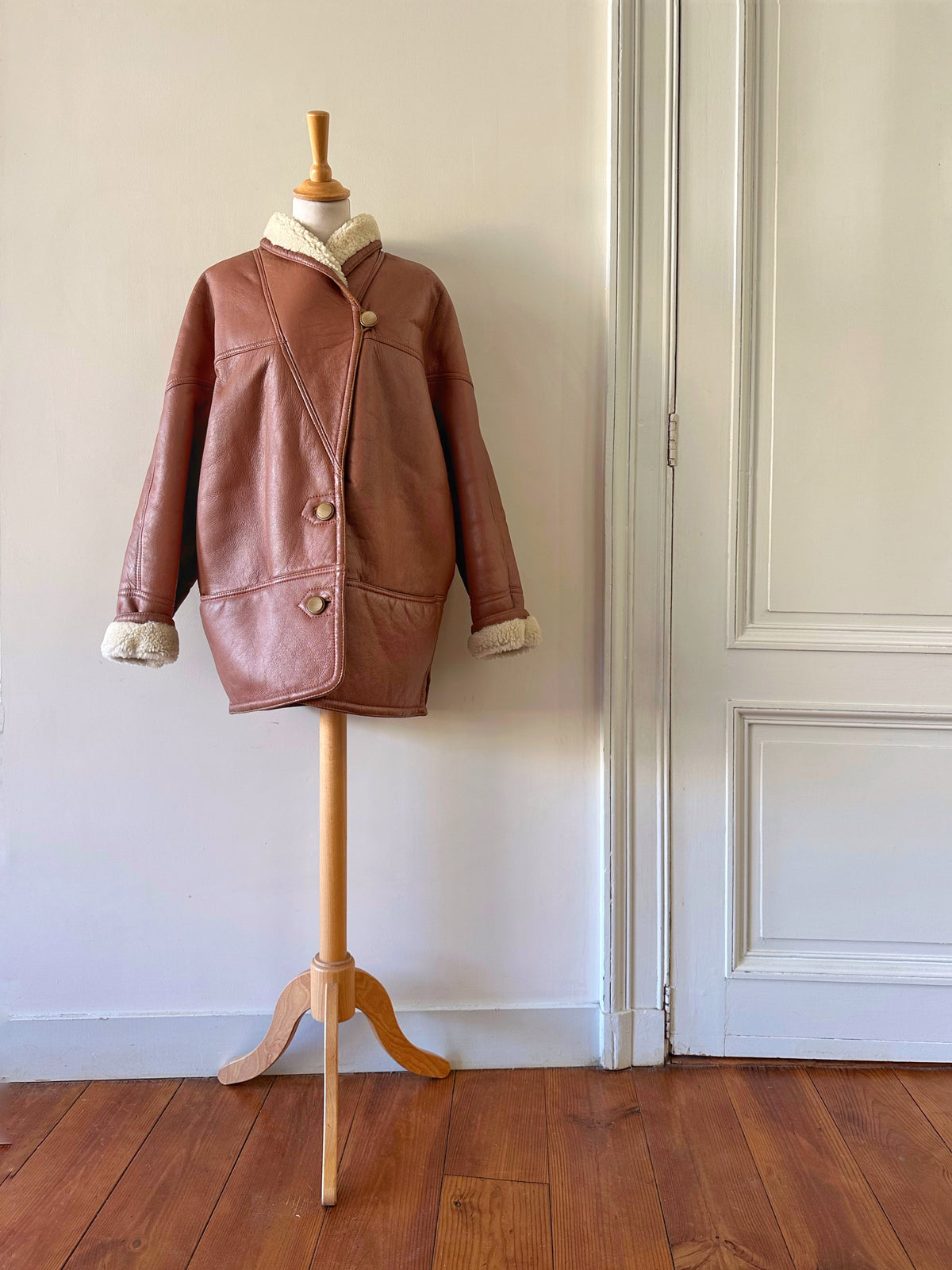 Peau lainee en mouton retourné, exterieur en cuir caramel brun, interieur laine de mouton ecrue, grand col châle en mouton à boutonner. Fabriquée en Italie, convient aux tailles 36 et 38 portée ici ouvert sur une personne T40 et sur un mannequin T36. Longueur 75cm.