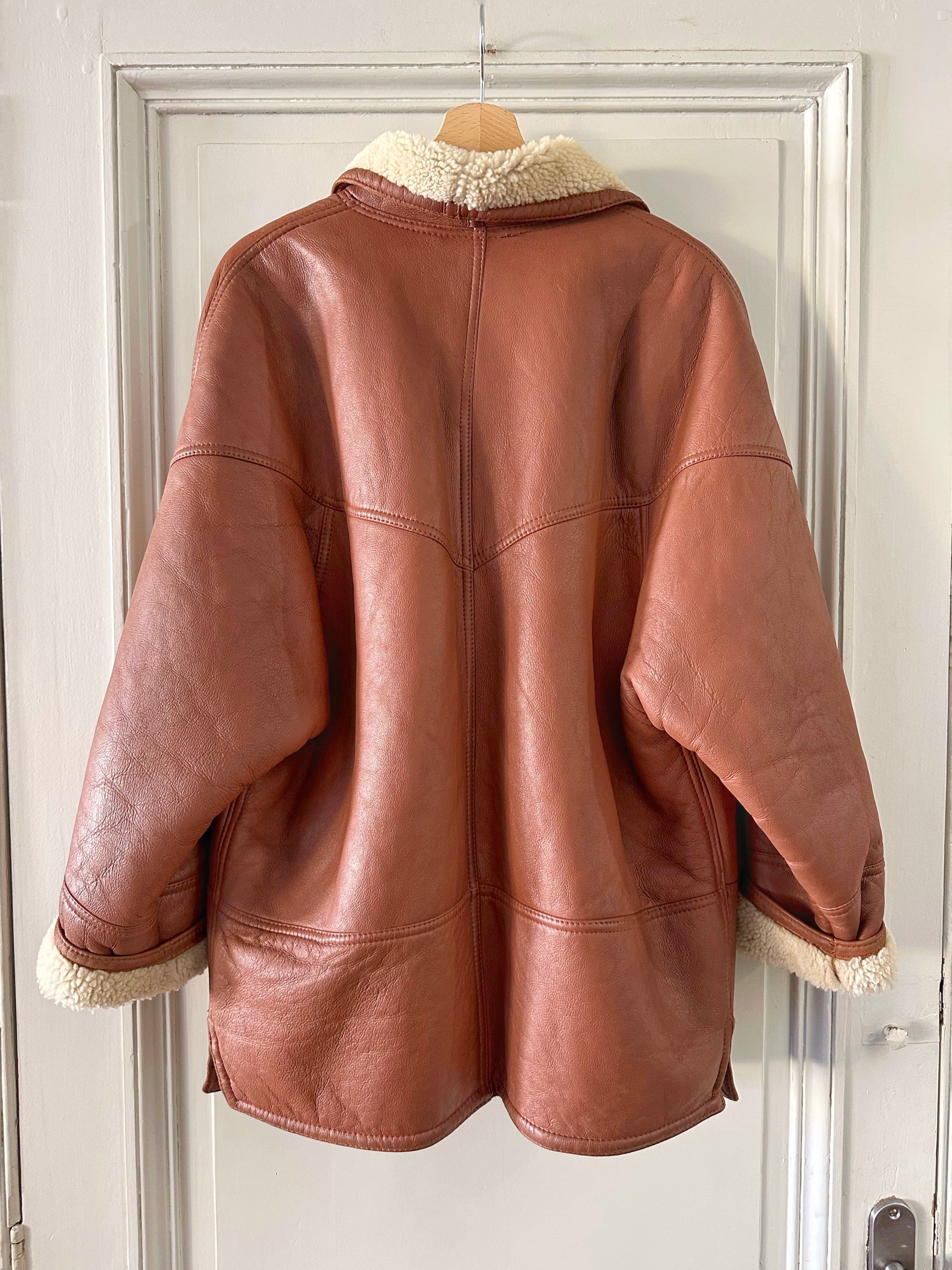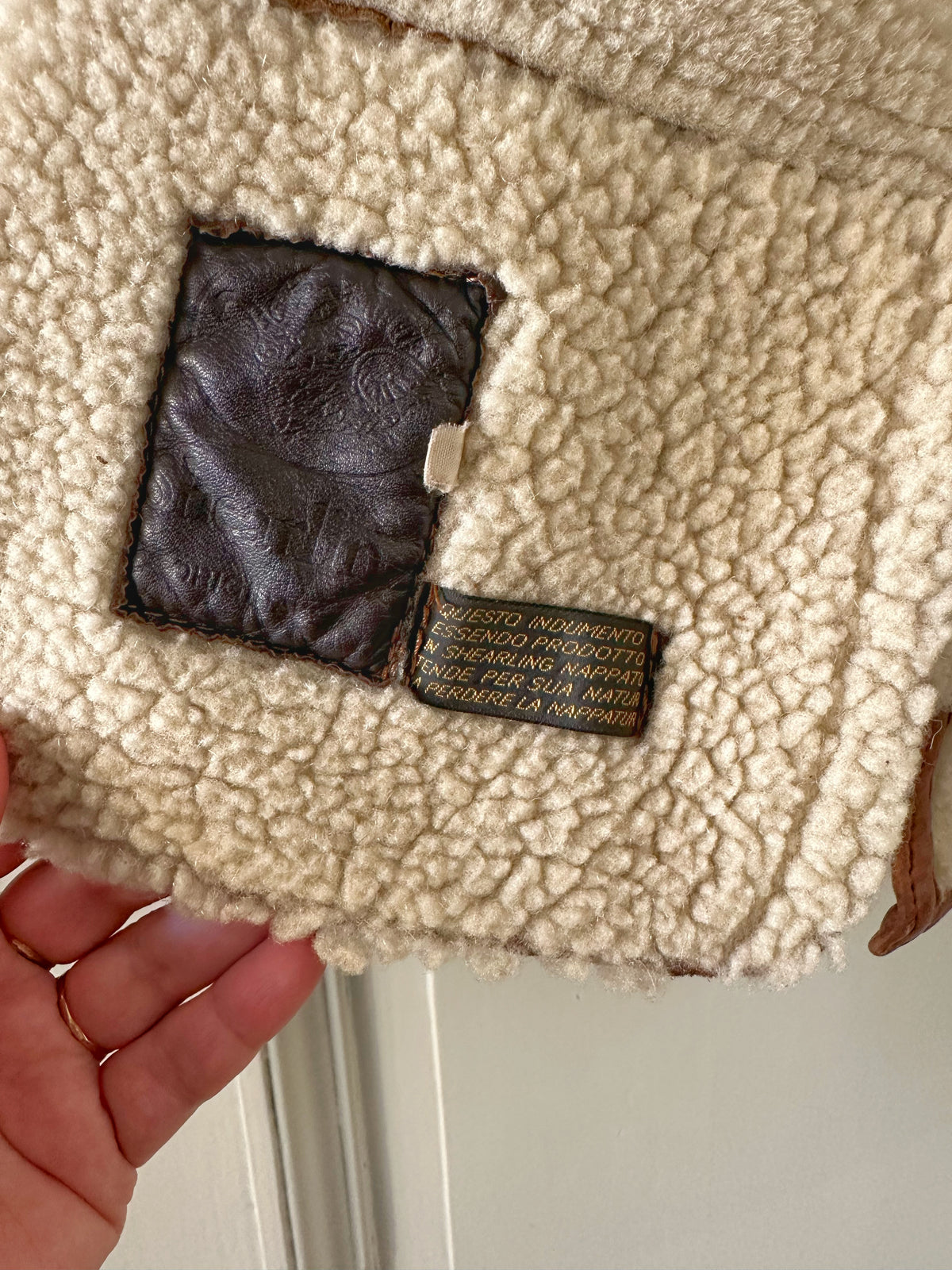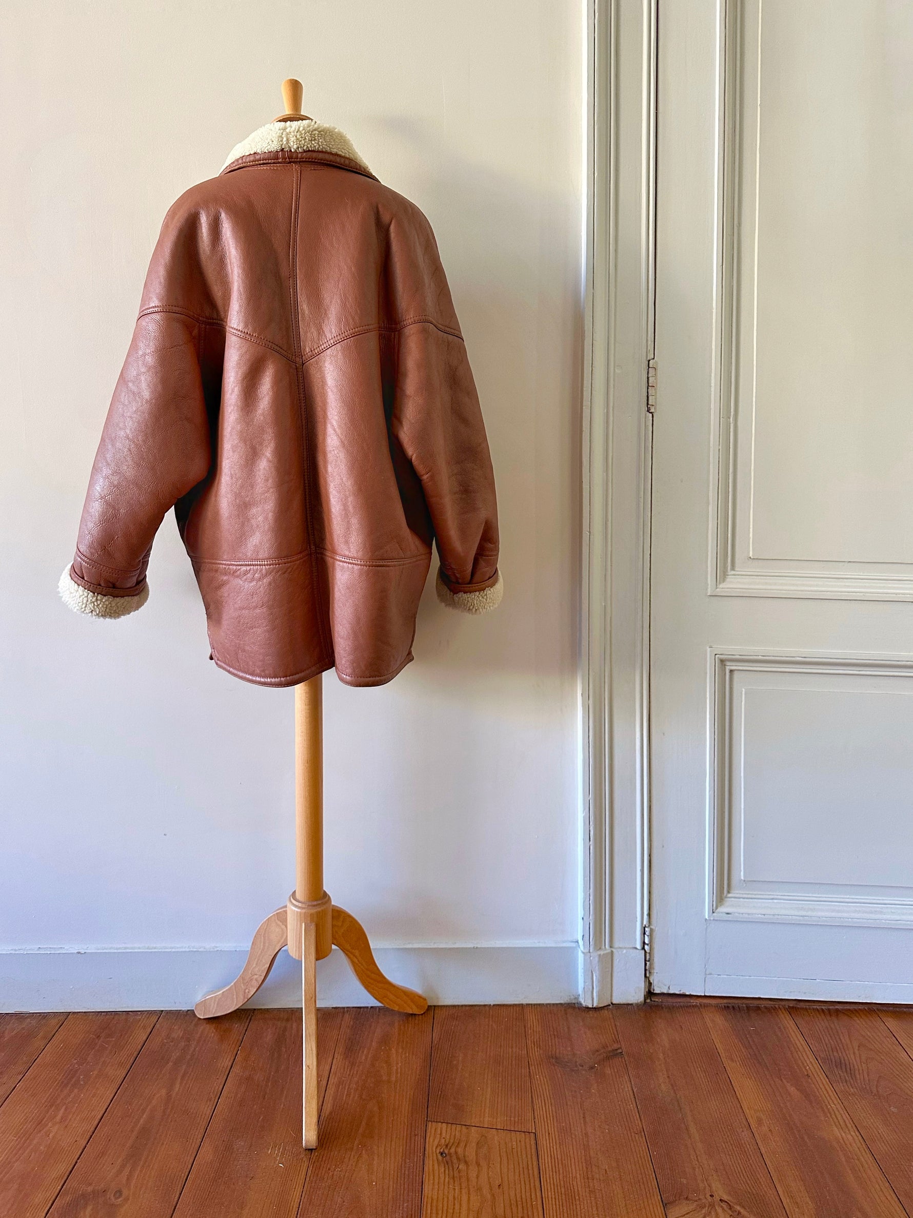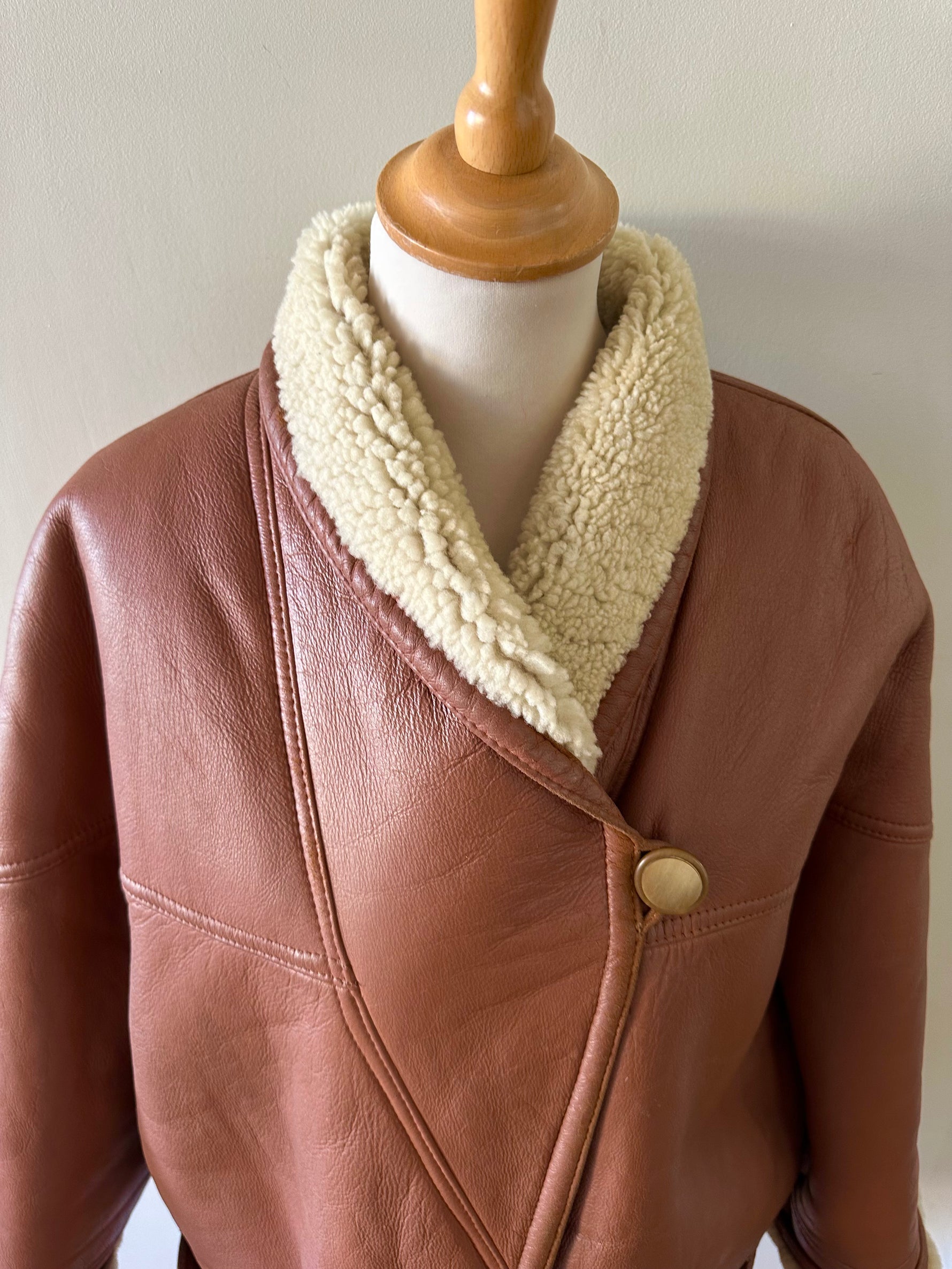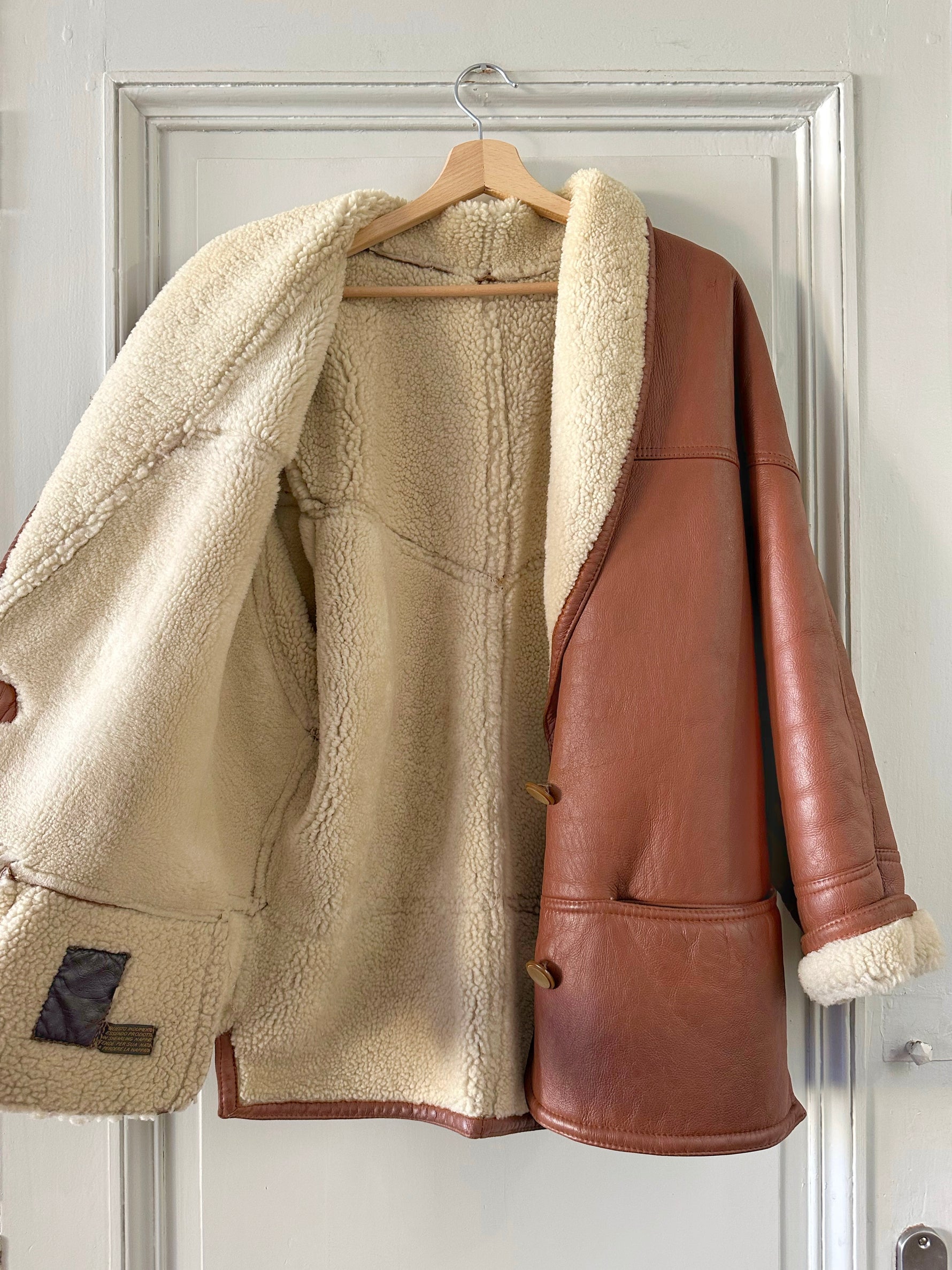 Peau lainee en mouton retourné, exterieur en cuir caramel brun, interieur laine de mouton ecrue, grand col châle en mouton à boutonner. Fabriquée en Italie, convient aux tailles 36 et 38 portée ici ouvert sur une personne T40 et sur un mannequin T36. Longueur 75cm.